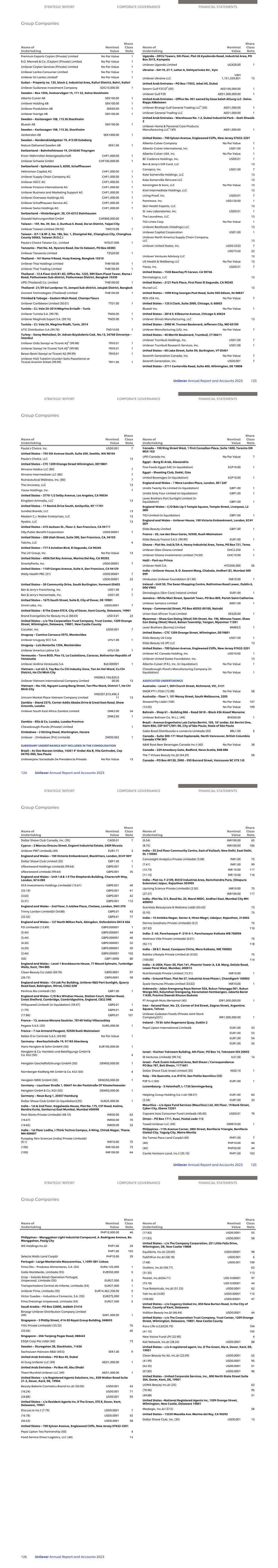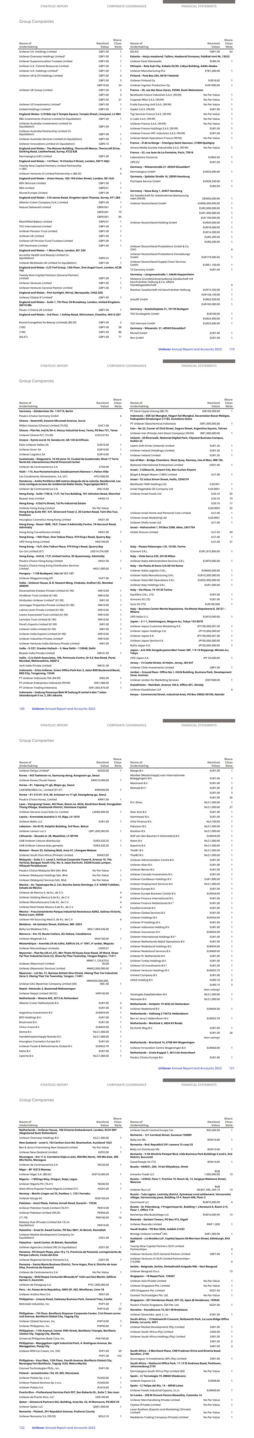 Unilever S.K. Holdings Limited GBP1.00 1 Unilever Overseas Holdings Limited° GBP1.00 1 Unilever Superannuation Trustees Limited GBP1.00 1 Unilever U.K. Central Resources Limited GBP1.00 1 Unilever U.K. Holdings Limited° GBP1.00 1 Unilever UK & CN Holdings Limited GBP1.00 2 GBP1.00 3 GBP10.00 24 Unilever UK Group Limited GBP1.00 2 GBP1.00 3 GBP1.00 21 Unilever US Investments Limited° GBP1.00 1 United Holdings Limited° GBP1.00 1 England-Wales- C/O Bdo Llp 5 Temple Square, Temple Street, Liverpool, L2 5RH BBG Investments (France) Limited (in liquidation) GBP1.00 1 Unilever Australia Investments Limited (in liquidation) GBP1.00 1 Unilever Australia Partnership Limited (in liquidation) GBP1.00 1 Unilever Australia Services Limited (in liquidation) GBP1.00 1 Unilever Innovations Limited (in liquidation) GBP0.10 1 England and Wales – The Manser Building, Thorncroft Manor, Thorncroft Drive, Dorking Road, Leatherhead, Surrey, KT22 8JB Dermalogica (UK) Limited GBP1.00 1 England and Wales – 1st Floor, 16 Charles II Street, London, SW1Y 4QU Twenty Nine Capital Partners Limited Partnership ∞ (80) 4 Unilever Ventures III Limited Partnership ∞ (86.25) 4 England and Wales – Union House, 182-194 Union Street, London, SE1 0LH REN Skincare Limited GBP1.00 1 REN Limited GBP0.01 1 Murad Europe Limited GBP1.00 1 England and Wales – 3 St James Road, Kingston Upon Thames, Surrey, KT1 2BA Alberto-Culver Company (U.K.) Limited GBP1.00 1 Nature Delivered Limited GBP0.001 1 GBP0.001 79 GBP0.001 84 Marshfield Bakery Limited GBP0.01 1 TIGI International Limited GBP1.00 1 Unilever Pension Trust Limited GBP1.00 1 Unilever UK Limited GBP1.00 1 Unilever UK Pension Fund Trustees Limited GBP1.00 1 USF Nominees Limited GBP1.00 1 England and Wales – 1 More Place, London, SE1 2AF Accantia Health and Beauty Limited (in liquidation) GBP0.25 1 Unilever Bestfoods UK Limited (in liquidation) GBP1.00 1 England and Wales –C/O Tmf Group, 13th Floor, One Angel Court, London, EC2R 7HJ Twenty Nine Capital Partners (General Partner) Limited GBP1.00 1 Unilever Ventures Limited GBP1.00 1 Unilever Ventures General Partner Limited GBP1.00 1 England and Wales – Port Sunlight, Wirral, Merseyside, CH62 4ZD Unilever Global IP Limited° GBP1.00 1 England and Wales – Suite 1, 7th Floor 50 Broadway, London, United Kingdom, SW1H 0BL Paula`s Choice UK Limited GBP1.00 1 England and Wales – 3rd Floor, 1 Ashley Road, Altrincham, Cheshire, WA14 2DT Brand Evangelists for Beauty Limited∆ (80.30) GBP1.00 2 (100) GBP1.00 58 (100) GBP1.00 86 (66.47) GBP1.00 71 Name of Undertaking Nominal Value Share Class Note (82.92) GBP1.00 63 Estonia – Harju maakond, Tallinn, Haabersti linnaosa, Paldiski mnt 96, 13522 Unilever Eesti Aktsiaselts EUR6.30 1 Ethiopia – Bole Sub City, Kebele 03/05, Lidiya Building, Addis Ababa Unilever Manufacturing PLC ETB1,000.00 1 Finland – Post Box 254, 00101 Helsinki Unilever Finland Oy EUR16.82 1 Unilever Ingman Production Oy EUR1000.00 1 France – 20, rue des Deux Gares, 92500, Rueil-Malmaison Bestfoods France Industries S.A.S. (99.99) No Par Value 1 Cogesal-Miko S.A.S. (99.99) No Par Value 1 Fralib Sourcing Unit S.A.S. (99.99) No Par Value 1 Saphir S.A.S. (99.99) EUR1.00 1 Tigi Services France S.A.S. (99.99) No Par Value 1 U-Labs S.A.S. (99.99) No Par Value 1 Unilever France S.A.S. (99.99) No Par Value 1 Unilever France Holdings S.A.S. (99.99) EUR1.00 1 Unilever France HPC Industries S.A.S. (99.99) EUR1.00 1 Unilever Retail Operations France (99.99) No Par Value 1 France – ZI de la Norge – Chevigny Saint-Sauveur, 21800 Quetigny Amora Maille Societe Industrielle S.A.S. (99.99) No Par Value 1 France – 42, rue Jean de La Fontaine, Paris, 75016 Laboratoire Garancia EUR62.50 1 UPD EU EUR1.00 1 Germany – Wiesenstraße 21. 40549 Düsseldorf Dermalogica GmbH EUR25,000.00 1 Germany – Spitaler Straße 16, 20095 Hamburg ProCepta Service GmbH EUR28,340.00 1 EUR2.00 1 Germany – Neue Burg 1, 20457 Hamburg DU Gesellschaft für Arbeitnehmerüberlassung mbH (99.99) DEM50,000.00 1 Unilever Deutschland GmbH EUR90,000,000.00 1 EUR2,000,000.00 1 EUR1,000,000.00 1 EUR 100.000,00 1 Unilever Deutschland Holding GmbH EUR39,000.00 1 EUR18,000.00 1 EUR14,300.00 1 EUR5,200.00 1 EUR6,500.00 1 Unilever Deutschland Produktions GmbH & Co. OHG 4 Unilever Deutschland Produktions Verwaltungs GmbH EUR179,000.00 1 Unilever Deutschland Supply Chain Services GmbH EUR51,150.00 1 T2 Germany GmbH EUR1.00 1 Germany – Langnesestraße 1, 64646 Heppenheim Maizena Grundstücksverwaltung Gesellschaft mit beschränkter Haftung & Co. offene Handelsgesellschaft 4 Rizofoor Gesellschaft mit beschränkter Haftung EUR15,350.00 1 EUR138,150.00 1 Schafft GmbH EUR63,920.00 1 EUR100,000.00 1 Germany – Rotebühlplatz 21, 70178 Stuttgart TIGI Eurologistic GmbH EUR100.00 1 EUR24,900.00 1 TIGI Haircare GmbH EUR25,600.00 1 Germany – Wiesenstr. 21, 40549 Düsseldorf Murad GmbH EUR1.00 1 Ren GmbH EUR1.00 1 Name of Undertaking Nominal Value Share Class Note STRATEGIC REPORT CORPORATE GOVERNANCE FINANCIAL STATEMENTS Group Companies Unilever Annual Report and Accounts 2023 119 Germany – Zehdenicker Str. 110119, Berlin Paula’s Choice Germany GmbH  4 Ghana – Swanmill, Kwame Nkrumah Avenue, Accra Millers Swanzy (Ghana) Limited (74.50) GHC1.00 1 Ghana – Plot No. Ind/A/3A-4, Heavy Industrial Area, Tema, PO Box 721, Tema Unilever Ghana PLC (74.50) GHC0.0192 1 Greece – Kymis ave & 10, Seneka str. GR-145 64 Kifissia Elais Unilever Hellas SA EUR10.00 1 Unilever Knorr SA EUR10.00 1 Unilever Logistics SA EUR10.00 1 Guatemala – Diagonal 6. 10-50 zona 10, Ciudad de Guatemala. Nivel 17 Torre Norte Ed. Interamericas World Financial Center Unilever de Centroamerica S.A. GT60.00 1 Haiti – 115, Rue Panamericaine, Estabissement Número 1, Petion Ville Les Condiments Alimentaires, S.A. (61) HTG1000.00 1 Honduras – Anillo Periférico 600 metros después de la colonia, Residencial, Las Uvas contigua acceso de residencial Roble Oeste, Tegucigalpa M.D.C. Un