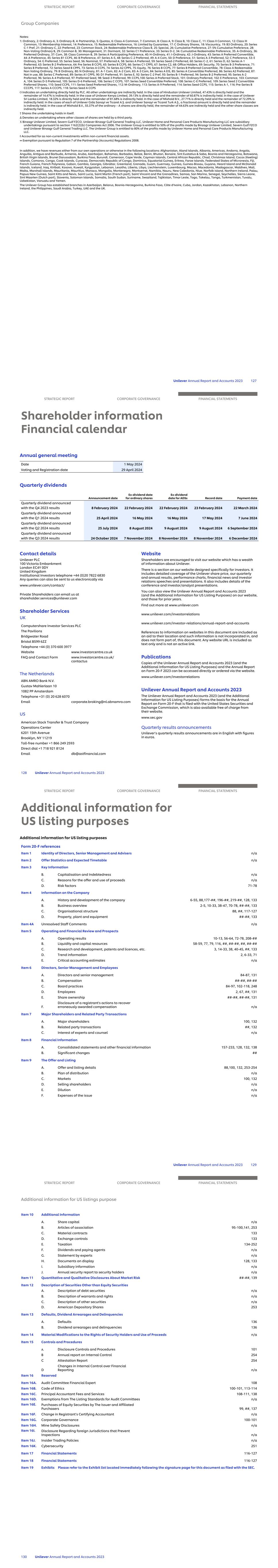 Notes: 1: Ordinary, 2: Ordinary-A, 3: Ordinary-B, 4: Partnership, 5: Quotas, 6: Class-A Common, 7: Common, 8: Class A, 9: Class B, 10: Class C, 11: Class II Common, 12: Class III Common, 13: Membership Interest, 14: Preference, 15: Redeemable Preference, 16: Limited by Guarantee, 17: C Ordinary Shares, 18: Viscountcy, 19: B3 Ordinary, 20: Series C-1 Pref, 21: Ordinary-C, 22: Preferred, 23: Common Stock, 24: Redeemable Preference Class B, 25: Special, 26: Cumulative Preference, 27: 5% Cumulative Preference, 28: Non-Voting Ordinary B, 29: Common B, 30: Management, 31: Dormant, 32: Series C1 Preference, 33: Series D-2, 34: Cumulative Redeemable Preference, 35: A-Ordinary, 36: Preferred Ordinary, 37: Com, 38: Class Common-B, 39: Series A Participating Preference, 40: H-Ordinary, 41: I-Ordinary, 42: J-Ordinary, 43: Series A Preferred Convertible, 44: A Preference, 45: Series B1 CCPS, 46: B Preference, 47: Series A-5, 48: Series C-2 Preferred, 49: A-4 Com, 50: D Preference, 51: Series A-3 Preferred, 52: C Preference, 53: E Ordinary, 54: G Preferred, 55: Series Seed, 56: Nominal, 57: Preferred A, 58: Series A Preferred, 59: Series Seed-2 Preferred, 60: Series C-2, 61: Series D, 62: Series A-1 Preferred, 63: Series B-2 Preference, 64: Pre Series B CCPS, 65: Series B CCPS, 66: Series C1 CPPS, 67: Series C2, 68: Office Holders, 69: Security, 70: Series B-3 Preference, 71: Series B Preferred, 72: Series Seed B CPPS, 73: Series A CCPS, 74: Series A2 CPPS, 75: Equity, 76: Series B CCPS, 77: Series B Preferred Convertible, 78: Class A Redeemable Non Voting Ordinary, 79: B Ordinary, 80: N Ordinary, 81: A-1 Com, 82: A-2 Com, 83: A-3 Com, 84: Series A EIS, 85: Series A Convertible Preferred, 86: Series A2 Preferred, 87: Not in use, 88: Series C Preferred, 89: Series A1 CPPS, 90: D1 Preferred, 91: Series E, 92: Series C-2 Pref, 93: Series B-1 Preferred, 94: Series B-2 Preferred, 95: Series A-2 Preferred, 96: Series A-4 Preferred, 97: Preferred Seed, 98: Seed-3 Preferred, 99: CCPS,100: Series A Preferred Stock, 101: Ordinary Preferred, 102: E Preference, 103: Common A, 104: Series D-5 Preferred, 105: Series D-6 Preferred, 106: Series C CCPS, 107: Series Seed Convertible Preferred, 108: Series C-E Preferred, 109: Series Seed 2 Convertible Preferred Shares, 110: Seed CCPS, 111: Series Seed Preferred Shares, 112: M-Ordinary, 113: Series A-9 Preferred, 114: Series Seed CCPS, 115: Series A-1, 116: Pre-Series B CCCPS, 117: Series A CCCPS, 118: Series Seed A CCPS O Indicates an undertaking directly held by PLC. All other undertakings are indirectly held. In the case of Hindustan Unilever Limited, 47.43% is directly held and the remainder of 14.47% is indirectly held. In the case of Unilever Kenya Limited, 39.13% is directly held and the remainder of 60.87% is indirectly held. In the case of Unilever Sri Lanka Limited, 18.32% is directly held and the remainder of 81.68% is indirectly held. In the case of Mixhold B.V., 27.71% is directly held and the remainder of 72.29% is indirectly held. In the cases of each of Unilever Gida Sanayi ve Ticaret A.Ş. and Unilever Sanayi ve Ticaret Turk A.Ş., a fractional amount is directly held and the remainder is indirectly held. In the case of Mixhold B.V., 55.37% of the ordinary – A shares are directly held, the remainder of 44.63% are indirectly held and the other share classes are indirectly held. † Shares the undertaking holds in itself. Δ Denotes an undertaking where other classes of shares are held by a third party. X Binzagr Unilever Limited, Severn Gulf FZCO, Unilever Binzagr Gulf General Trading LLC, Unilever Home and Personal Care Products Manufacturing LLC are subsidiary undertakings pursuant to section 1162(2)(b) Companies Act 2006. The Unilever Group is entitled to 50% of the profits made by Binzagr Unilever Limited, Severn Gulf FZCO and Unilever Binzagr Gulf General Trading LLC. The Unilever Group is entitled to 80% of the profits made by Unilever Home and Personal Care Products Manufacturing LLC. ◊ Accounted for as non-current investments within non-current financial assets. ∞ Exemption pursuant to Regulation 7 of the Partnership (Accounts) Regulations 2008. In addition, we have revenues either from our own operations or otherwise in the following locations: Afghanistan, Aland Islands, Albania, Americas, Andorra, Angola, Anguilla, Antigua and Barbuda, Armenia, Aruba, Azerbaijan, Bahamas, Barbados, Belize, Benin, Bhutan, Bonaire, Sint Eustatius & Saba, Bosnia and Herzegovina, Botswana, British Virgin Islands, Brunei Darussalam, Burkina Faso, Burundi, Cameroon, Cape Verde, Cayman Islands, Central African Republic, Chad, Christmas Island, Cocos (Keeling) Islands, Comoros, Congo, Cook Islands, Curacao, Democratic Republic of Congo, Dominica, Equatorial Guinea, Eritrea, Faroe Islands, Federated States of Micronesia, Fiji, French Guiana, French Polynesia, Gabon, Gambia, Georgia, Gibraltar, Greenland, Grenada, Guam, Guernsey, Guinea, Guinea-Bissau, Guyana, Heard Island and McDonald Islands, Iceland, Iraq, Kiribati, Kosovo, Kuwait, Kyrgyzstan, Lebanon, Lesotho, Liberia, Libya, Liechtenstein, Luxembourg, Macao, Macedonia, Madagascar, Maldives, Mali, Malta, Marshall Islands, Mauritania, Mauritius, Monaco, Mongolia, Montenegro, Montserrat, Namibia, Nauru, New Caledonia, Niue, Norfolk Island, Northern Ireland, Palau, Papua New Guinea, Saint Kitts and Nevis, Saint Lucia, Saint Martin (French part), Saint Vincent and the Grenadines, Samoa, San Marino, Senegal, Seychelles, Sierra Leone, Sint Maarten (Dutch part), Slovenia, Solomon Islands, Somalia, South Sudan, Suriname, Swaziland, Tajikistan, Timor Leste, Togo, Tokelau, Tonga, Turkmenistan, Tuvalu, Uzbekistan, Vanuatu and Yemen. The Unilever Group has established branches in Azerbaijan, Belarus, Bosnia-Herzegovina, Burkina Faso, Côte d'Ivoire, Cuba, Jordan, Kazakhstan, Lebanon, Northern Ireland, the Philippines, Saudi Arabia, Turkey, UAE and the UK. STRATEGIC REPORT CORPORATE GOVERNANCE FINANCIAL STATEMENTS G