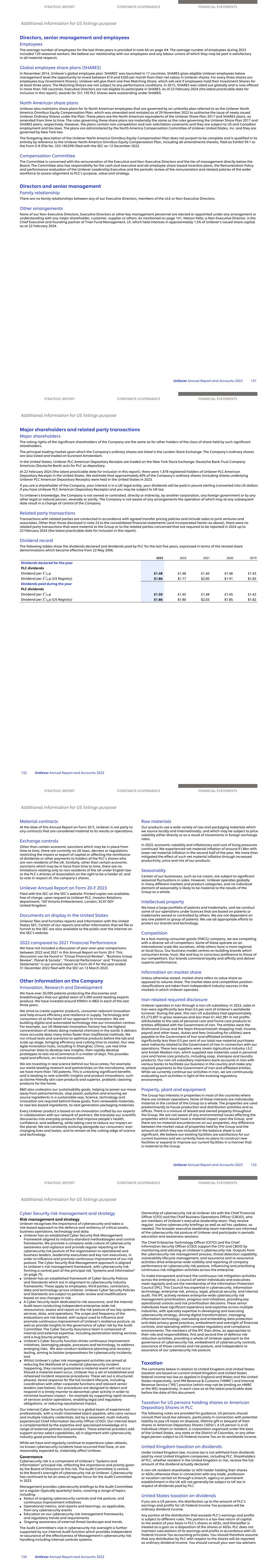 Directors, senior management and employees Employees The average number of employees for the last three years is provided in note 4A on page ##. The average number of employees during 2023 included 129 seasonal workers. We believe our relationship with our employees and any labour unions of which they may be part is satisfactory in all material respects. Global employee share plans (SHARES) In November 2014, Unilever’s global employee plan ‘SHARES’ was launched in 17 countries. SHARES gives eligible Unilever employees below management level the opportunity to invest between €10 and €200 per month from their net salary in Unilever shares. For every three shares our employees buy (Investment Shares), Unilever will give them one free Matching Share, which will vest if employees hold their Investment Shares for at least three years. The Matching Shares are not subject to any performance conditions. In 2015, SHARES was rolled out globally and is now offered in more than 100 countries. Executive Directors are not eligible to participate in SHARES. As of 22 February 2024 (the latest practicable date for inclusion in this report), awards for 331,195 PLC shares were outstanding under SHARES. North American share plans Unilever also maintains share plans for its North American employees that are governed by an umbrella plan referred to as the Unilever North America Omnibus Equity Compensation Plan, which was amended and restated as of 29 November 2022 to authorise the issue of newly issued Unilever Ordinary Shares under the Plan. These plans are the North American equivalents of the Unilever Share Plan 2017 and SHARES plans, as amended from time to time. The rules governing these share plans are materially the same as the rules governing the Unilever Share Plan 2017 and SHARES plans, respectively. However, the plans contain non-competition and non-solicitation covenants and they are subject to US and Canadian employment and tax laws. The plans are administered by the North America Compensation Committee of Unilever United States, Inc. and they are governed by New York law. The foregoing description of the Unilever North America Omnibus Equity Compensation Plan does not purport to be complete and is qualified in its entirety by reference to the Unilever North America Omnibus Equity Compensation Plan, including all amendments thereto, filed as Exhibit 99.1 to the Form S-8 (File No. 333-185299) filed with the SEC on 12 December 2022. Compensation Committee The Committee is concerned with the remuneration of the Executive and Non-Executive Directors and the tier of management directly below the Board. The Committee also has responsibility for the cash and executive and all-employee share-based incentive plans, the Remuneration Policy and performance evaluation of the Unilever Leadership Executive and the periodic review of the remuneration and related policies of the wider workforce to assess alignment to PLC’s purpose, value and strategy. Directors and senior management Family relationship There are no family relationships between any of our Executive Directors, members of the ULE or Non-Executive Directors. Other arrangements None of our Non-Executive Directors, Executive Directors or other key management personnel are elected or appointed under any arrangement or understanding with any major shareholder, customer, supplier or others. As mentioned on page 141, Nelson Peltz, a Non-Executive Director, is the Chief Executive and founding partner of Trian Fund Management, LP, which held interests in approximately 1.5% of Unilever’s issued share capital as at 22 February 2024. STRATEGIC REPORT CORPORATE GOVERNANCE FINANCIAL STATEMENTS Additional information for US listings purpose Unilever Annual Report and Accounts 2023 131 Major shareholders and related party transactions Major shareholders The voting rights of the significant shareholders of the Company are the same as for other holders of the class of share held by such significant shareholders. The principal trading market upon which the Company's ordinary shares are listed is the London Stock Exchange. The Company's ordinary shares are also listed and traded on Euronext Amsterdam. In the United States, Unilever PLC American Depositary Receipts are traded on the New York Stock Exchange. Deutsche Bank Trust Company Americas (Deutsche Bank) acts for PLC as depositary. At 22 February 2024 (the latest practicable date for inclusion in this report), there were 1,878 registered holders of Unilever PLC American Depositary Receipts in the United States. We estimate that approximately 40% of the Company’s ordinary shares (including shares underlying Unilever PLC American Depositary Receipts) were held in the United States in 2023. If you are a shareholder of the Company, your interest is in a UK legal entity, your dividends will be paid in pound sterling (converted into US dollars if you have Unilever PLC American Depositary Receipts) and you may be subject to UK tax. To Unilever’s knowledge, the Company is not owned or controlled, directly or indirectly, by another corporation, any foreign government or by any other legal or natural person, severally or jointly. The Company is not aware of any arrangements the operation of which may at any subsequent date result in a change of control of the Company. Related party transactions Transactions with related parties are conducted in accordance with agreed transfer pricing policies and include sales to joint ventures and associates. Other than those disclosed in note 23 to the consolidated financial statements (and incorporated herein as above), there were no related party transactions that were material to the Group or to the related parties concerned that are required to be reported in 2024 up to 22 February 2024 (the latest practicable date for inclusion in this report). Dividend record The following tables show the dividends declared and dividends paid by PLC for the last five years, e