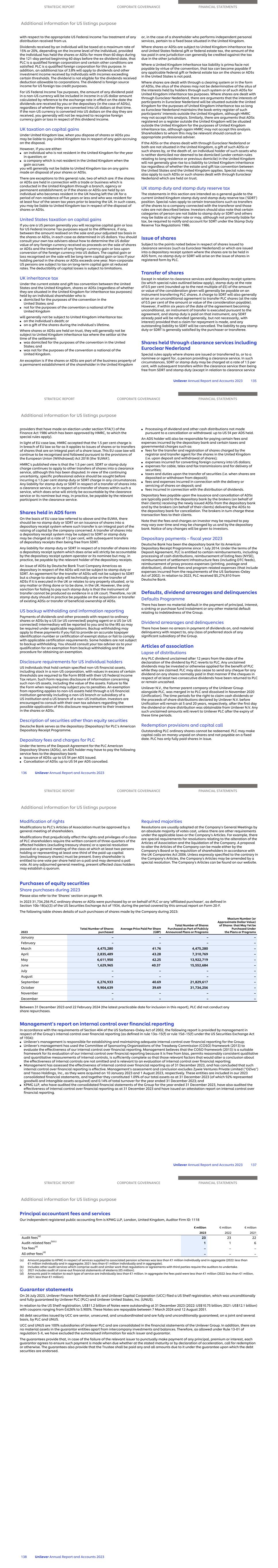 Adrian Hennah Chair of the Audit Committee On behalf of the Audit Committee, I am pleased to present the Committee’s report for the year ended 31 December 2023. In 2023, the Committee concluded the year with three members. Hein Schumacher was appointed as CEO of Unilever, Judith Hartmann moved to another committee, and we welcomed Ruby Lu. Her insights and experiences especially in evolving technology, are valuable additions to our Committee. The Committee believes it has carried out its duties effectively throughout the year and to a high standard, providing independent oversight. It has had good support from management and the internal audit team. The core of the work of the Committee has been to ensure the integrity of Unilever’s financial and non-financial reporting, the adequacy of its internal control framework and to oversee how the company manages its principal and emerging risks. The committee also participated in the selection of Fernando Fernandez as Unilever’s new Chief Financial Officer. In the area of risk management, we continued to focus this year on cyber security, supply chain resilience, and data privacy. The Committee commissioned an independent assessment of our cyber security maturity to ensure adequacy of our capabilities and controls. The Committee engaged on the organisational changes the company is going through and their impact on reporting and the management of controls. We also met with management to discuss emerging developments in international taxation, pensions and sustainability reporting including pursuant to the Corporate Sustainability Reporting Directive (CSRD) and the new European Sustainability Reporting Standards (ESRSs). In addition to our reporting and control responsibilities, we focused this year on risks relating to cyber security, supply chain resilience and data privacy. We dedicated time and resources to enhancing our understanding of the Group’s continuously evolving regulatory and legal landscape, and how the Group is adapting to it. The Committee also reviewed all significant ethical and compliance matters. In addition to the formal meetings, the Committee members have been engaging with the business through market visits and during the year visited USA, Brazil, Argentina and the Netherlands. In 2024, our primary focus, beyond our core responsibilities, will remain on the evolving cyber security threat landscape and strengthening our supply chain resilience. We will also oversee the preparation for new compliance requirements, in particular enhanced sustainability reporting pursuant to CSRD and the ESRSs. Adrian Hennah Chair of the Audit Committee STRATEGIC REPORT CORPORATE GOVERNANCE FINANCIAL STATEMENTS Report of the Audit Committee Unilever Annual Report and Accounts 2023 107 Committee membership and attendance Attendance Adrian Hennah Chair 8/8 Susan Kilsby 8/8 Judith Hartmann (member up to and including 2 May 2023 ) 5/5 Hein Schumacher (member up to and including 2 May 2023) 5/5 Ruby Lu (member from 3 May 2023) 3/3 The Audit Committee is comprised only of independent Non- Executive Directors with a minimum requirement of three such members. The Audit Committee was chaired by Adrian Hennah. The other Committee members are Susan Kilsby, and Ruby Lu who was appointed in July 2023 replacing Judith Hartmann who transitioned to another committee. Hein Schumacher was appointed to become CEO of Unilever as of July 2023. The Board is satisfied that the members of the Audit Committee are competent in financial matters and have recent and relevant experience. For the purposes of the US Sarbanes-Oxley Act of 2002, Adrian Hennah is the Audit Committee’s financial expert. Other attendees at Committee meetings included the Chief Financial Officer (CFO), Chief Auditor, Deputy CFO & Controller, Chief Legal Officer & Group Secretary, Deputy Group Secretary & Head of Corporate Legal, General Counsel Corporate Governance and Group Corporate Legal, Head of Secretariat, EVP Sustainable Business Performance and Reporting and the external auditors. Throughout the year, the Committee members met periodically without others present and also held separate private sessions with the Chief Financial Officer, Chief Auditor and the external auditors. There were eight scheduled meetings of the Committee during the year. Attendance at the scheduled meetings is shown above. Given changes in the Committee membership this year, attendance is expressed as the number of meetings attended out of the number able to be attended during each director’s respective tenure on the Committee during the year. Role of the Committee The role and responsibilities of the Audit Committee are set out in written terms of reference which are reviewed annually by the Committee, considering relevant legislation, and recommended good practices. The terms of reference are contained within the document entitled "The Governance of Unilever" which is available on our website. The Committee’s responsibilities include, but are not limited to, the following matters: ■ oversight of the integrity of Unilever’s financial statements; ■ review of Unilever’s half-yearly and annual financial statements (including clarity and completeness of disclosure) and of the quarterly trading statements for quarter 1 and quarter 3; ■ oversight of risk management and internal control arrangements; ■ oversight of compliance with legal and regulatory requirements; ■ oversight of the external auditors’ performance, objectivity, qualifications, and independence; ■ the approval process of non-audit services; ■ recommendation to the Board of the nomination of the external auditors for shareholder approval; and approval of their fees, refer to note 25 on page 225; and ■ performance of the internal audit function. All relevant matters arising are brought to the attention of the Board. Committee Reviews To help the Committee meet its oversight responsibilities, focused kn