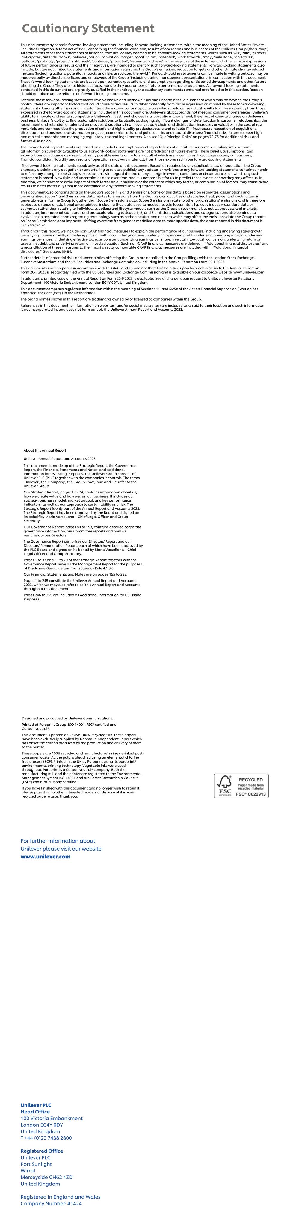 This document may contain forward-looking statements, including ‘forward-looking statements’ within the meaning of the United States Private Securities Litigation Reform Act of 1995, concerning the financial condition, results of operations and businesses of the Unilever Group (the ‘Group’). All statements other than statements of historical fact are, or may deemed to be, forward-looking statements. Words such as ‘will’, ‘aim’, ‘expects’, ‘anticipates’, ‘intends’, ‘looks’, ‘believes’, ‘vision’, ‘ambition’, ‘target’, ‘goal’, ‘plan’, ‘potential’, ‘work towards’, ‘may’, ‘milestone’, ‘objectives’, ‘outlook’, ‘probably’, ‘project’, ‘risk’, ‘seek’, ‘continue’, ‘projected’, ‘estimate’, ‘achieve’ or the negative of these terms, and other similar expressions of future performance or results and their negatives, are intended to identify such forward-looking statements. Forward-looking statements also include, but are not limited to, statements and information regarding the Group’s emissions reduction targets and other climate change related matters (including actions, potential impacts and risks associated therewith). Forward-looking statements can be made in writing but also may be made verbally by directors, officers and employees of the Group (including during management presentations) in connection with this document. These forward-looking statements are based upon current expectations and assumptions regarding anticipated developments and other factors affecting the Group. They are not historical facts, nor are they guarantees of future performance or outcomes. All forward-looking statements contained in this document are expressly qualified in their entirety by the cautionary statements contained or referred to in this section. Readers should not place undue reliance on forward-looking statements. Because these forward-looking statements involve known and unknown risks and uncertainties, a number of which may be beyond the Group's control, there are important factors that could cause actual results to differ materially from those expressed or implied by these forward-looking statements. Among other risks and uncertainties, the material or principal factors which could cause actual results to differ materially from those expressed in the forward-looking statements included in this document are: Unilever’s global brands not meeting consumer preferences; Unilever’s ability to innovate and remain competitive; Unilever’s investment choices in its portfolio management; the effect of climate change on Unilever’s business; Unilever’s ability to find sustainable solutions to its plastic packaging; significant changes or deterioration in customer relationships; the recruitment and retention of talented employees; disruptions in Unilever's supply chain and distribution; increases or volatility in the cost of raw materials and commodities; the production of safe and high quality products; secure and reliable IT infrastructure; execution of acquisitions, divestitures and business transformation projects; economic, social and political risks and natural disasters; financial risks; failure to meet high and ethical standards; and managing regulatory, tax and legal matters. Also see "Our Principal Risks" on pages 70-78 for additional risks and further discussion. The forward-looking statements are based on our beliefs, assumptions and expectations of our future performance, taking into account all information currently available to us. Forward-looking statements are not predictions of future events. These beliefs, assumptions, and expectations can change as a result of many possible events or factors, not all of which are known to us. If a change occurs, our business, financial condition, liquidity and results of operations may vary materially from those expressed in our forward-looking statements. The forward-looking statements speak only as of the date of this document. Except as required by any applicable law or regulation, the Group expressly disclaims any obligation or undertaking to release publicly any updates or revisions to any forward-looking statements contained herein to reflect any change in the Group’s expectations with regard thereto or any change in events, conditions or circumstances on which any such statement is based. New risks and uncertainties arise over time, and it is not possible for us to predict those events or how they may affect us. In addition, we cannot assess the impact of each factor on our business or the extent to which any factor, or combination of factors, may cause actual results to differ materially from those contained in any forward-looking statements. This document also contains data on the Group’s Scope 1, 2 and 3 emissions. Some of this data is based on estimates, assumptions and uncertainties. Scope 1 and 2 emissions data relates to emissions from the Group’s own activities and supplied heat, power and cooling and is generally easier for the Group to gather than Scope 3 emissions data. Scope 3 emissions relate to other organisations’ emissions and is therefore subject to a range of additional uncertainties, including that: data used to model lifecycle footprints is typically industry-standard data or estimates rather than relating to individual suppliers; and lifecycle models such as the Group’s cover many but not all products and markets. In addition, international standards and protocols relating to Scope 1, 2, and 3 emissions calculations and categorisations also continue to evolve, as do accepted norms regarding terminology such as carbon neutral and net zero which may affect the emissions data the Group reports. As Scope 3 emissions data improves, shifting over time from generic modelled data to more specific data, the data reported in this document is likely to evolve. Throughout this report, we include non-GAAP financial