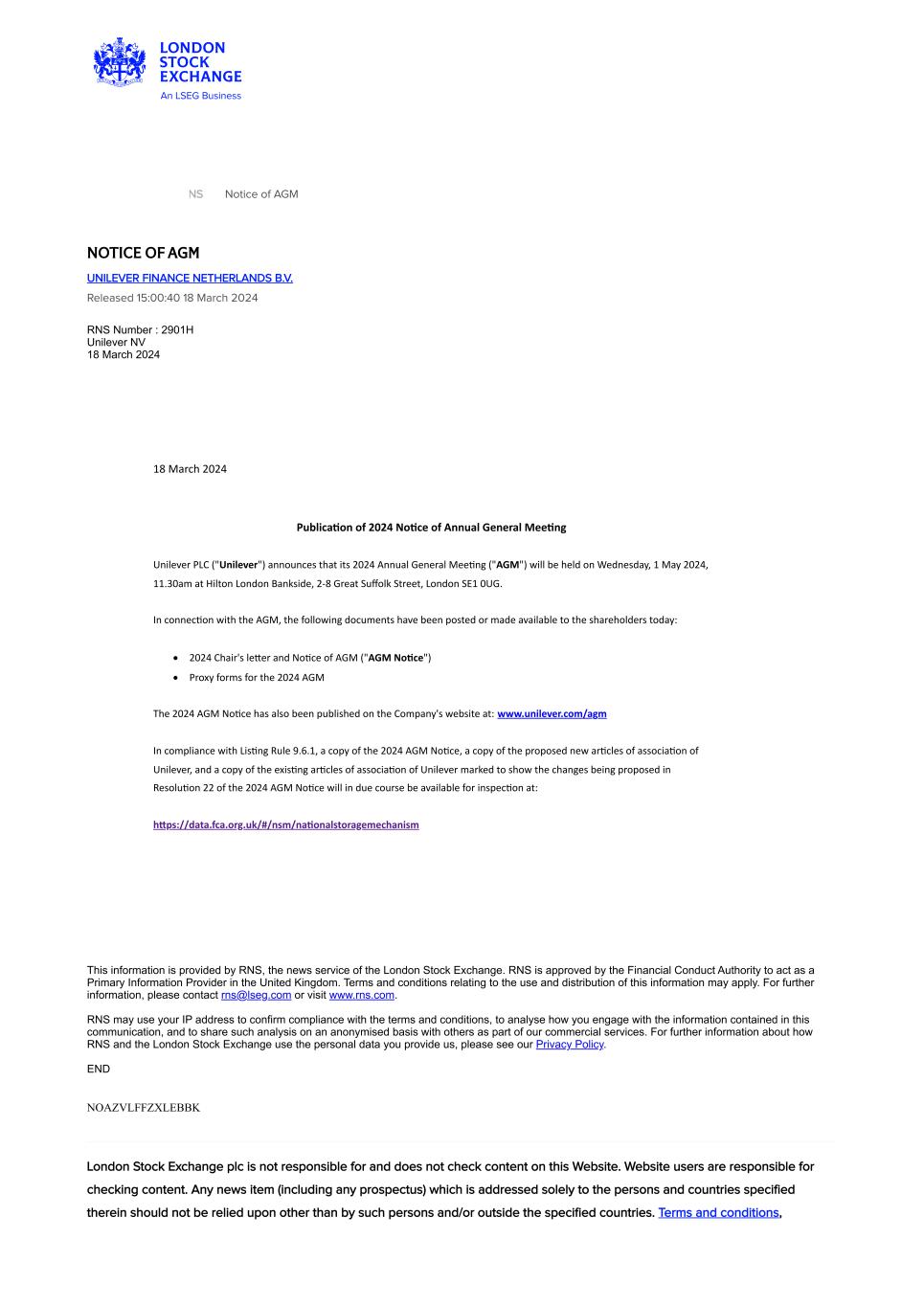 RNS Notice of AGM NOTICE OF AGM UNILEVER FINANCE NETHERLANDS B.V. Released 15:00:40 18 March 2024 RNS Number : 2901H Unilever NV 18 March 2024 18 March 2024 Publica�on of 2024 No�ce of Annual General Mee�ng Unilever PLC ("Unilever") announces that its 2024 Annual General Mee�ng ("AGM") will be held on Wednesday, 1 May 2024, 11.30am at Hilton London Bankside, 2-8 Great Suffolk Street, London SE1 0UG. In connec�on with the AGM, the following documents have been posted or made available to the shareholders today: · 2024 Chair's le�er and No�ce of AGM ("AGM No�ce") · Proxy forms for the 2024 AGM The 2024 AGM No�ce has also been published on the Company's website at: www.unilever.com/agm In compliance with Lis�ng Rule 9.6.1, a copy of the 2024 AGM No�ce, a copy of the proposed new ar�cles of associa�on of Unilever, and a copy of the exis�ng ar�cles of associa�on of Unilever marked to show the changes being proposed in Resolu�on 22 of the 2024 AGM No�ce will in due course be available for inspec�on at: h�ps://data.fca.org.uk/#/nsm/na�onalstoragemechanism This information is provided by RNS, the news service of the London Stock Exchange. RNS is approved by the Financial Conduct Authority to act as a Primary Information Provider in the United Kingdom. Terms and conditions relating to the use and distribution of this information may apply. For further information, please contact rns@lseg.com or visit www.rns.com. RNS may use your IP address to confirm compliance with the terms and conditions, to analyse how you engage with the information contained in this communication, and to share such analysis on an anonymised basis with others as part of our commercial services. For further information about how RNS and the London Stock Exchange use the personal data you provide us, please see our Privacy Policy. END NOAZVLFFZXLEBBK London Stock Exchange plc is not responsible for and does not check content on this Website. Website users are responsible for checking content. Any news item (including any prospectus) which is addressed solely to the persons and countries specified therein should not be relied upon other than by such persons and/or outside the specified countries. Terms and conditions,
