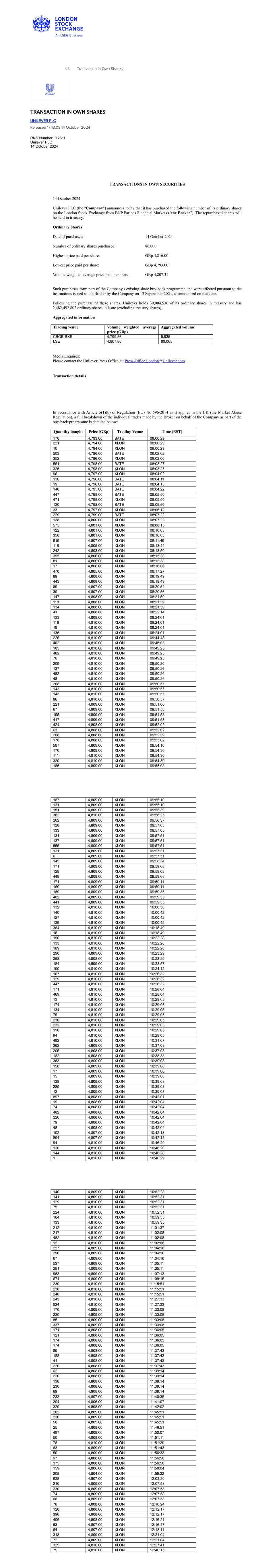 RNS Transaction in Own Shares TRANSACTION IN OWN SHARES UNILEVER PLC Released 17:13:03 14 October 2024 RNS Number : 1251I Unilever PLC 14 October 2024 TRANSACTIONS IN OWN SECURITIES 14 October 2024 Unilever PLC (the "Company") announces today that it has purchased the following number of its ordinary shares on the London Stock Exchange from BNP Paribas Financial Markets ("the Broker"). The repurchased shares will be held in treasury. Ordinary Shares Date of purchases: 14 October 2024 Number of ordinary shares purchased: 86,000 Highest price paid per share: GBp 4,816.00 Lowest price paid per share: GBp 4,793.00 Volume weighted average price paid per share: GBp 4,807.31 Such purchases form part of the Company's existing share buy-back programme and were effected pursuant to the instructions issued to the Broker by the Company on 13 September 2024, as announced on that date. Following the purchase of these shares, Unilever holds 39,004,536 of its ordinary shares in treasury and has 2,482,492,802 ordinary shares in issue (excluding treasury shares). Aggregated information Trading venue Volume weighted average price (GBp) Aggregated volume CBOE-BXE 4,799.86 5,935 LSE 4,807.86 80,065 Media Enquires: Please contact the Unilever Press Office at: Press-Office.London@Unilever.com Transaction details In accordance with Article 5(1)(b) of Regulation (EU) No 596/2014 as it applies in the UK (the Market Abuse Regulation), a full breakdown of the individual trades made by the Broker on behalf of the Company as part of the buy-back programme is detailed below: Quantity bought Price (GBp) Trading Venue Time (BST) 176 4,793.00 BATE 08:00:29 221 4,794.00 XLON 08:00:29 10 4,794.00 XLON 08:00:29 503 4,796.00 BATE 08:02:02 352 4,796.00 XLON 08:02:06 561 4,798.00 BATE 08:03:27 326 4,798.00 XLON 08:03:27 96 4,797.00 XLON 08:04:02 136 4,796.00 BATE 08:04:11 19 4,796.00 BATE 08:04:13 146 4,795.00 BATE 08:04:22 447 4,798.00 BATE 08:05:50 471 4,798.00 XLON 08:05:50 120 4,798.00 BATE 08:05:50 33 4,797.00 XLON 08:06:12 229 4,799.00 BATE 08:07:22 138 4,800.00 XLON 08:07:22 575 4,801.00 XLON 08:08:15 122 4,801.00 XLON 08:10:03 350 4,801.00 XLON 08:10:03 519 4,807.00 XLON 08:11:49 118 4,805.00 XLON 08:13:44 242 4,803.00 XLON 08:13:50 395 4,806.00 XLON 08:15:38 81 4,806.00 XLON 08:15:38 17 4,806.00 XLON 08:16:06 470 4,805.00 XLON 08:17:27 89 4,808.00 XLON 08:19:49 443 4,808.00 XLON 08:19:49 89 4,807.00 XLON 08:20:54 39 4,807.00 XLON 08:20:56 147 4,808.00 XLON 08:21:59 118 4,808.00 XLON 08:21:59 134 4,808.00 XLON 08:21:59 41 4,808.00 XLON 08:22:14 133 4,809.00 XLON 08:24:01 116 4,810.00 XLON 08:24:01 19 4,810.00 XLON 08:24:01 136 4,810.00 XLON 08:24:01 226 4,810.00 XLON 09:44:43 402 4,810.00 XLON 09:46:03 185 4,810.00 XLON 09:49:25 482 4,810.00 XLON 09:49:25 76 4,810.00 XLON 09:49:25 209 4,810.00 XLON 09:50:26 137 4,810.00 XLON 09:50:26 482 4,810.00 XLON 09:50:26 48 4,810.00 XLON 09:50:26 208 4,810.00 XLON 09:50:57 143 4,810.00 XLON 09:50:57 143 4,810.00 XLON 09:50:57 86 4,810.00 XLON 09:50:57 221 4,809.00 XLON 09:51:00 67 4,809.00 XLON 09:51:58 195 4,809.00 XLON 09:51:58 417 4,809.00 XLON 09:51:58 424 4,808.00 XLON 09:52:02 63 4,808.00 XLON 09:52:02 208 4,808.00 XLON 09:52:59 178 4,808.00 XLON 09:53:02 587 4,809.00 XLON 09:54:10 170 4,809.00 XLON 09:54:30 111 4,810.00 XLON 09:54:30 320 4,810.00 XLON 09:54:30 186 4,809.00 XLON 09:55:08 187 4,809.00 XLON 09:55:10 131 4,809.00 XLON 09:55:10 151 4,809.00 XLON 09:55:39 362 4,810.00 XLON 09:56:25 262 4,809.00 XLON 09:56:37 128 4,809.00 XLON 09:57:03 133 4,809.00 XLON 09:57:05 131 4,809.00 XLON 09:57:51 137 4,809.00 XLON 09:57:51 655 4,809.00 XLON 09:57:51 131 4,809.00 XLON 09:57:51 6 4,809.00 XLON 09:57:51 145 4,809.00 XLON 09:58:34 171 4,809.00 XLON 09:59:08 129 4,809.00 XLON 09:59:08 448 4,809.00 XLON 09:59:08 171 4,809.00 XLON 09:59:11 169 4,809.00 XLON 09:59:11 169 4,809.00 XLON 09:59:35 482 4,809.00 XLON 09:59:35 441 4,809.00 XLON 09:59:35 132 4,810.00 XLON 10:00:38 140 4,810.00 XLON 10:00:42 127 4,810.00 XLON 10:00:42 139 4,810.00 XLON 10:00:42 384 4,810.00 XLON 10:18:49 16 4,810.00 XLON 10:18:49 190 4,810.00 XLON 10:22:28 133 4,810.00 XLON 10:22:28 189 4,810.00 XLON 10:22:28 290 4,809.00 XLON 10:23:29 358 4,808.00 XLON 10:23:29 184 4,809.00 XLON 10:23:57 190 4,810.00 XLON 10:24:12 167 4,810.00 XLON 10:26:32 129 4,810.00 XLON 10:26:32 447 4,810.00 XLON 10:26:32 171 4,810.00 XLON 10:28:04 469 4,810.00 XLON 10:28:04 13 4,810.00 XLON 10:29:05 174 4,810.00 XLON 10:29:05 134 4,810.00 XLON 10:29:05 79 4,810.00 XLON 10:29:05 230 4,810.00 XLON 10:29:05 232 4,810.00 XLON 10:29:05 196 4,810.00 XLON 10:29:05 94 4,810.00 XLON 10:29:05 482 4,810.00 XLON 10:31:07 362 4,809.00 XLON 10:37:08 205 4,808.00 XLON 10:37:08 182 4,808.00 XLON 10:38:38 383 4,809.00 XLON 10:39:08 158 4,809.00 XLON 10:39:08 17 4,809.00 XLON 10:39:08 15 4,809.00 XLON 10:39:08 138 4,809.00 XLON 10:39:08 225 4,809.00 XLON 10:39:08 12 4,809.00 XLON 10:39:08 897 4,808.00 XLON 10:42:01 19 4,808.00 XLON 10:42:04 74 4,808.00 XLON 10:42:04 482 4,808.00 XLON 10:42:04 226 4,808.00 XLON 10:42:04 79 4,808.00 XLON 10:42:04 48 4,808.00 XLON 10:42:04 102 4,807.00 XLON 10:42:18 894 4,807.00 XLON 10:42:18 94 4,810.00 XLON 10:46:20 130 4,810.00 XLON 10:46:20 144 4,810.00 XLON 10:46:28 1 4,810.00 XLON 10:46:29 140 4,809.00 XLON 10:52:28 141 4,809.00 XLON 10:52:31 129 4,810.00 XLON 10:52:31 75 4,810.00 XLON 10:52:31 224 4,810.00 XLON 10:52:31 164 4,810.00 XLON 10:59:35 133 4,810.00 XLON 10:59:35 212 4,810.00 XLON 11:01:37 217 4,810.00 XLON 11:02:08 482 4,810.00 XLON 11:02:08 12 4,810.00 XLON 11:02:08 227 4,809.00 XLON 11:04:16 290 4,809.00 XLON 11:04:16 67 4,809.00 XLON 11:04:16 537 4,809.00 XLON 11:05:11 281 4,809.00 XLON 11:05:11 963 4,809.00 XLON 11:07:13 674 4,809.00 XLON 11:09:15 230 4,810.00 XLON 11:15:51 230 4,810.00 XLON 11:15:51 240 4,810.00 XLON 11:15:51 243 4,810.00 XLON 11:27:33 524 4,810.00 XLON 11:27:33 170 4,809.00 XLON 11:33:08 230 4,809.00 XLON 11:33:08 85 4,809.00 XLON 11:33:08 337 4,809.00 XLON 11:33:08 171 4,808.0
