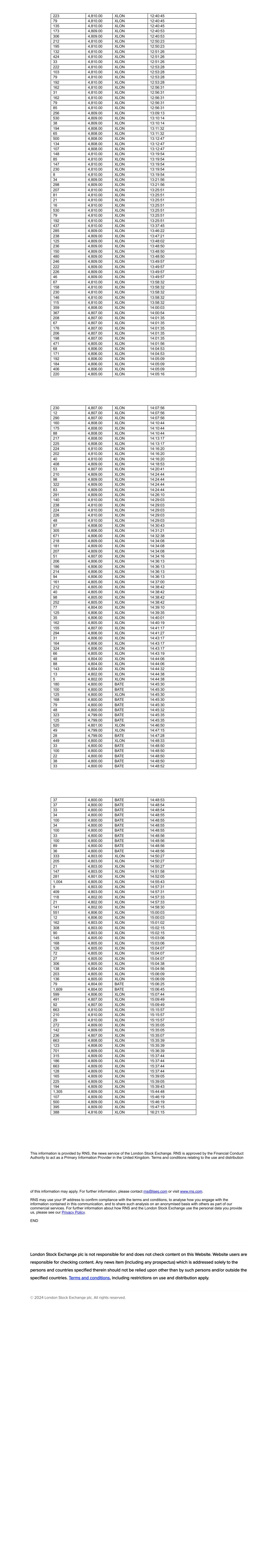 223 4,810.00 XLON 12:40:45 79 4,810.00 XLON 12:40:45 135 4,810.00 XLON 12:40:45 173 4,809.00 XLON 12:40:53 306 4,809.00 XLON 12:40:53 212 4,810.00 XLON 12:50:23 195 4,810.00 XLON 12:50:23 132 4,810.00 XLON 12:51:26 424 4,810.00 XLON 12:51:26 33 4,810.00 XLON 12:51:26 222 4,810.00 XLON 12:53:28 103 4,810.00 XLON 12:53:28 79 4,810.00 XLON 12:53:28 192 4,810.00 XLON 12:53:28 162 4,810.00 XLON 12:56:31 31 4,810.00 XLON 12:56:31 162 4,810.00 XLON 12:56:31 79 4,810.00 XLON 12:56:31 85 4,810.00 XLON 12:56:31 256 4,809.00 XLON 13:09:13 530 4,809.00 XLON 13:10:14 38 4,809.00 XLON 13:10:14 194 4,808.00 XLON 13:11:32 65 4,808.00 XLON 13:11:32 500 4,808.00 XLON 13:12:47 134 4,808.00 XLON 13:12:47 107 4,808.00 XLON 13:12:47 148 4,810.00 XLON 13:19:54 85 4,810.00 XLON 13:19:54 147 4,810.00 XLON 13:19:54 230 4,810.00 XLON 13:19:54 8 4,810.00 XLON 13:19:54 34 4,809.00 XLON 13:21:56 298 4,809.00 XLON 13:21:56 207 4,810.00 XLON 13:25:51 81 4,810.00 XLON 13:25:51 21 4,810.00 XLON 13:25:51 16 4,810.00 XLON 13:25:51 530 4,810.00 XLON 13:25:51 79 4,810.00 XLON 13:25:51 192 4,810.00 XLON 13:25:51 437 4,810.00 XLON 13:37:45 285 4,809.00 XLON 13:46:22 238 4,809.00 XLON 13:47:21 125 4,809.00 XLON 13:48:02 236 4,809.00 XLON 13:48:50 150 4,809.00 XLON 13:48:50 480 4,809.00 XLON 13:48:50 246 4,809.00 XLON 13:49:57 222 4,809.00 XLON 13:49:57 226 4,809.00 XLON 13:49:57 46 4,809.00 XLON 13:49:57 67 4,810.00 XLON 13:58:32 158 4,810.00 XLON 13:58:32 230 4,810.00 XLON 13:58:32 146 4,810.00 XLON 13:58:32 115 4,810.00 XLON 13:58:32 359 4,808.00 XLON 14:00:03 367 4,807.00 XLON 14:00:54 208 4,807.00 XLON 14:01:35 67 4,807.00 XLON 14:01:35 176 4,807.00 XLON 14:01:35 206 4,807.00 XLON 14:01:35 198 4,807.00 XLON 14:01:35 471 4,805.00 XLON 14:01:56 68 4,806.00 XLON 14:04:53 171 4,806.00 XLON 14:04:53 192 4,806.00 XLON 14:05:09 184 4,806.00 XLON 14:05:09 406 4,806.00 XLON 14:05:09 220 4,805.00 XLON 14:05:16 230 4,807.00 XLON 14:07:56 12 4,807.00 XLON 14:07:56 290 4,807.00 XLON 14:07:56 160 4,808.00 XLON 14:10:44 175 4,808.00 XLON 14:10:44 88 4,808.00 XLON 14:10:44 217 4,808.00 XLON 14:13:17 225 4,808.00 XLON 14:13:17 224 4,810.00 XLON 14:16:20 202 4,810.00 XLON 14:16:20 40 4,810.00 XLON 14:16:20 408 4,809.00 XLON 14:18:53 53 4,807.00 XLON 14:20:41 210 4,809.00 XLON 14:24:44 98 4,809.00 XLON 14:24:44 322 4,809.00 XLON 14:24:44 83 4,809.00 XLON 14:24:44 291 4,809.00 XLON 14:26:10 140 4,810.00 XLON 14:29:03 238 4,810.00 XLON 14:29:03 224 4,810.00 XLON 14:29:03 226 4,810.00 XLON 14:29:03 48 4,810.00 XLON 14:29:03 87 4,808.00 XLON 14:30:43 305 4,806.00 XLON 14:31:21 671 4,806.00 XLON 14:32:38 218 4,809.00 XLON 14:34:08 181 4,809.00 XLON 14:34:08 207 4,809.00 XLON 14:34:08 51 4,807.00 XLON 14:34:16 206 4,806.00 XLON 14:36:13 186 4,806.00 XLON 14:36:13 214 4,806.00 XLON 14:36:13 94 4,806.00 XLON 14:36:13 161 4,805.00 XLON 14:37:00 212 4,805.00 XLON 14:38:42 40 4,805.00 XLON 14:38:42 98 4,805.00 XLON 14:38:42 252 4,805.00 XLON 14:38:42 77 4,804.00 XLON 14:39:10 125 4,806.00 XLON 14:39:35 35 4,806.00 XLON 14:40:01 162 4,805.00 XLON 14:40:19 155 4,807.00 XLON 14:41:17 294 4,806.00 XLON 14:41:27 31 4,806.00 XLON 14:43:17 164 4,806.00 XLON 14:43:17 324 4,806.00 XLON 14:43:17 66 4,805.00 XLON 14:43:19 48 4,804.00 XLON 14:44:06 88 4,804.00 XLON 14:44:06 143 4,804.00 XLON 14:44:32 13 4,802.00 XLON 14:44:38 5 4,802.00 XLON 14:44:38 180 4,800.00 BATE 14:45:30 100 4,800.00 BATE 14:45:30 125 4,800.00 XLON 14:45:30 168 4,800.00 BATE 14:45:30 79 4,800.00 BATE 14:45:30 48 4,800.00 BATE 14:45:32 323 4,799.00 BATE 14:45:35 125 4,799.00 BATE 14:45:35 520 4,801.00 XLON 14:46:50 49 4,799.00 XLON 14:47:15 28 4,799.00 BATE 14:47:28 449 4,800.00 XLON 14:48:33 33 4,800.00 BATE 14:48:50 100 4,800.00 BATE 14:48:50 22 4,800.00 BATE 14:48:50 38 4,800.00 BATE 14:48:50 33 4,800.00 BATE 14:48:52 37 4,800.00 BATE 14:48:53 37 4,800.00 BATE 14:48:54 33 4,800.00 BATE 14:48:54 34 4,800.00 BATE 14:48:55 100 4,800.00 BATE 14:48:55 34 4,800.00 BATE 14:48:55 100 4,800.00 BATE 14:48:55 33 4,800.00 BATE 14:48:56 100 4,800.00 BATE 14:48:56 89 4,800.00 BATE 14:48:56 36 4,800.00 BATE 14:48:56 333 4,803.00 XLON 14:50:27 205 4,803.00 XLON 14:50:27 21 4,803.00 XLON 14:50:27 147 4,803.00 XLON 14:51:58 281 4,801.00 XLON 14:52:05 1,004 4,805.00 XLON 14:55:43 9 4,803.00 XLON 14:57:31 409 4,803.00 XLON 14:57:31 118 4,802.00 XLON 14:57:33 21 4,802.00 XLON 14:57:33 141 4,802.00 XLON 14:58:30 551 4,806.00 XLON 15:00:03 12 4,806.00 XLON 15:00:03 162 4,803.00 XLON 15:01:02 308 4,803.00 XLON 15:02:15 90 4,803.00 XLON 15:02:15 145 4,805.00 XLON 15:03:06 168 4,805.00 XLON 15:03:06 126 4,805.00 XLON 15:04:07 72 4,805.00 XLON 15:04:07 27 4,805.00 XLON 15:04:07 306 4,805.00 XLON 15:04:38 138 4,804.00 XLON 15:04:56 203 4,805.00 XLON 15:06:09 136 4,805.00 XLON 15:06:09 79 4,804.00 BATE 15:06:25 1,609 4,804.00 BATE 15:06:45 599 4,806.00 XLON 15:07:44 491 4,807.00 XLON 15:09:49 92 4,807.00 XLON 15:09:49 663 4,810.00 XLON 15:15:57 210 4,810.00 XLON 15:15:57 29 4,810.00 XLON 15:15:57 272 4,809.00 XLON 15:35:05 142 4,809.00 XLON 15:35:05 236 4,807.00 XLON 15:35:07 663 4,808.00 XLON 15:35:39 123 4,808.00 XLON 15:35:39 701 4,809.00 XLON 15:36:39 315 4,809.00 XLON 15:37:44 186 4,809.00 XLON 15:37:44 663 4,809.00 XLON 15:37:44 128 4,809.00 XLON 15:37:44 165 4,809.00 XLON 15:39:05 225 4,809.00 XLON 15:39:05 194 4,809.00 XLON 15:39:43 1,305 4,809.00 XLON 15:44:48 107 4,809.00 XLON 15:46:19 500 4,809.00 XLON 15:46:19 395 4,809.00 XLON 15:47:15 388 4,816.00 XLON 16:21:15 This information is provided by RNS, the news service of the London Stock Exchange. RNS is approved by the Financial Conduct Authority to act as a Primary Information Provider in the United Kingdom. Terms and conditions relating to the use and distribution of this information may apply. For further information, please contact rns@lseg.com or visit www.rns.com. RNS may use your IP address to confirm compliance with the terms and conditions, to analyse how you engage with the information contained in this communication, and to share such analysis on 