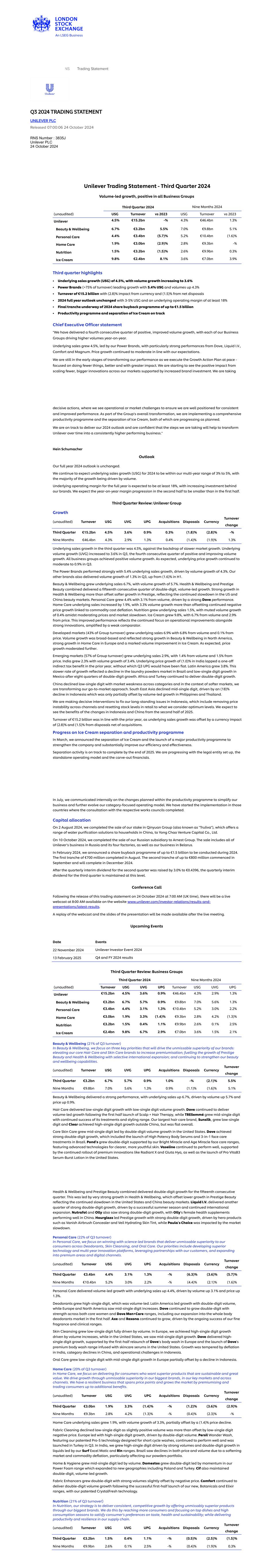 RNS Trading Statement Q3 2024 TRADING STATEMENT UNILEVER PLC Released 07:00:06 24 October 2024 RNS Number : 3835J Unilever PLC 24 October 2024 Unilever Trading Statement - Third Quarter 2024 Volume-led growth, positive in all Business Groups Third Quarter 2024 Nine Months 2024 (unaudited) USG Turnover vs 2023 USG Turnover vs 2023 Unilever 4.5% €15.2bn -% 4.3% €46.4bn 1.3% Beauty & Wellbeing 6.7% €3.2bn 5.5% 7.0% €9.8bn 5.1% Personal Care 4.4% €3.4bn (5.7)% 5.2% €10.4bn (1.6)% Home Care 1.9% €3.0bn (2.9)% 2.8% €9.3bn -% Nutrition 1.5% €3.2bn (1.5)% 2.6% €9.9bn 0.3% Ice Cream 9.8% €2.4bn 8.1% 3.6% €7.0bn 3.9%   Third quarter highlights •      Underlying sales growth (USG) of 4.5%, with volume growth increasing to 3.6% •      Power Brands (>75% of turnover) leading growth with 5.4% USG and volumes up 4.3% •      Turnover of €15.2 billion with (2.8)% impact from currency and (1.5)% from net disposals •      2024 full year outlook unchanged with 3-5% USG and an underlying operating margin of at least 18% •      Final tranche underway of 2024 share buyback programme of up to €1.5 billion •      Productivity programme and separation of Ice Cream on track Chief Executive Officer statement "We have delivered a fourth consecutive quarter of positive, improved volume growth, with each of our Business Groups driving higher volumes year-on-year. Underlying sales grew 4.5%, led by our Power Brands, with particularly strong performances from Dove, Liquid I.V., Comfort and Magnum. Price growth continued to moderate in line with our expectations. We are still in the early stages of transforming our performance as we execute the Growth Action Plan at pace - focused on doing fewer things, better and with greater impact. We are starting to see the positive impact from scaling fewer, bigger innovations across our markets supported by increased brand investment. We are taking decisive actions, where we see operational or market challenges to ensure we are well positioned for consistent and improved performance. As part of the Group's overall transformation, we are implementing a comprehensive productivity programme and the separation of Ice Cream, both of which are progressing as planned. We are on track to deliver our 2024 outlook and are confident that the steps we are taking will help to transform Unilever over time into a consistently higher performing business."   Hein Schumacher Outlook Our full year 2024 outlook is unchanged. We continue to expect underlying sales growth (USG) for 2024 to be within our multi-year range of 3% to 5%, with the majority of the growth being driven by volume. Underlying operating margin for the full year is expected to be at least 18%, with increasing investment behind our brands. We expect the year-on-year margin progression in the second half to be smaller than in the first half.   Third Quarter Review: Unilever Group Growth (unaudited) Turnover USG UVG UPG Acquisitions Disposals Currency Turnover change Third Quarter €15.2bn 4.5% 3.6% 0.9% 0.3% (1.8)% (2.8)% -% Nine Months €46.4bn 4.3% 2.9% 1.3% 0.4% (1.4)% (1.9)% 1.3% Underlying sales growth in the third quarter was 4.5%, against the backdrop of slower market growth. Underlying volume growth (UVG) increased to 3.6% in Q3, the fourth consecutive quarter of positive and improving volume growth. All business groups achieved positive volume growth. As expected, underlying price growth continued to moderate to 0.9% in Q3. The Power Brands performed strongly with 5.4% underlying sales growth, driven by volume growth of 4.3%. Our other brands also delivered volume growth of 1.3% in Q3, up from (1.6)% in H1. Beauty & Wellbeing grew underlying sales 6.7%, with volume growth of 5.7%. Health & Wellbeing and Prestige Beauty combined delivered a fifteenth consecutive quarter of double-digit, volume-led growth. Strong growth in Health & Wellbeing more than offset softer growth in Prestige, reflecting the continued slowdown in the US and China beauty markets. Personal Care grew 4.4% with 3.1% from volume, driven by a strong Dove performance. Home Care underlying sales increased by 1.9%, with 3.3% volume growth more than offsetting continued negative price growth linked to commodity cost deflation. Nutrition grew underlying sales 1.5%, with muted volume growth of 0.4% amidst moderating prices and market slowdown. Ice Cream grew 9.8%, with 6.7% from volume and 2.9% from price. This improved performance reflects the continued focus on operational improvements alongside strong innovations, amplified by a weak comparator. Developed markets (43% of Group turnover) grew underlying sales 6.9% with 6.8% from volume and 0.1% from price. Volume growth was broad-based and reflected strong growth in Beauty & Wellbeing in North America, strong growth in Home Care in Europe and a marked volume improvement in Ice Cream. As expected, price growth moderated further. Emerging markets (57% of Group turnover) grew underlying sales 2.9%, with 1.4% from volume and 1.5% from price. India grew 2.3% with volume growth of 3.4%. Underlying price growth of (1.0)% in India lapped a one-off indirect tax benefit in the prior year, without which Q3 UPG would have been flat. Latin America grew 3.8%. This slower rate of growth reflected a decline in the laundry powders market in Brazil and low-single digit growth in Mexico after eight quarters of double-digit growth. Africa and Turkey continued to deliver double-digit growth. China declined low-single digit with market weakness across categories and in the context of softer markets, we are transforming our go-to-market approach. South East Asia declined mid-single digit, driven by an (18)% decline in Indonesia which was only partially offset by volume-led growth in Philippines and Thailand. We are making decisive interventions to fix our long-standing issues in Indonesia, which include removing price instability across channels and resetting st