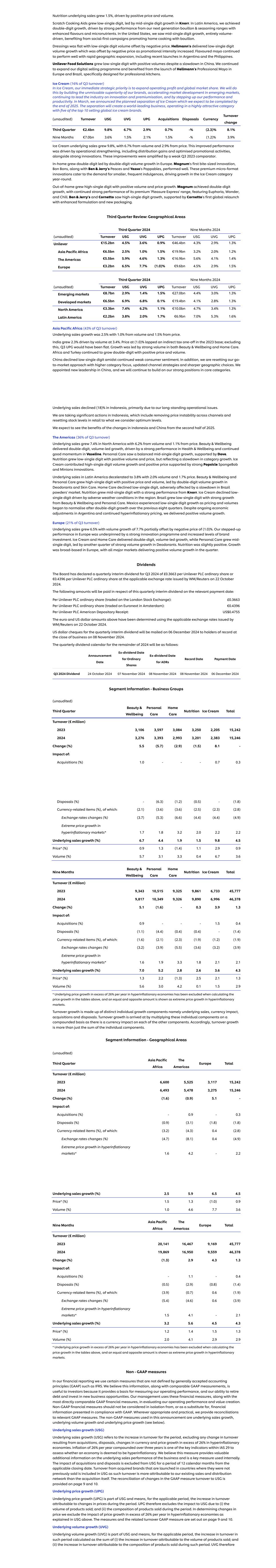Nutrition underlying sales grew 1.5%, driven by positive price and volume. Scratch Cooking Aids grew low-single digit, led by mid-single digit growth in Knorr. In Latin America, we achieved double-digit growth, driven by strong performance from our next generation bouillon & seasoning ranges with enhanced flavours and micronutrients. In the United States, we saw mid-single digit growth, entirely volume- driven, benefiting from social-first campaigns promoting home cooking with bouillon. Dressings was flat with low-single digit volume offset by negative price. Hellmann's delivered low-single digit volume growth which was offset by negative price as promotional intensity increased. Flavoured mayo continued to perform well with rapid geographic expansion, including recent launches in Argentina and the Philippines. Unilever Food Solutions grew low-single digit with positive volumes despite a slowdown in China. We continued to expand our digital selling programme and benefited from the launch of Hellmann's Professional Mayo in Europe and Brazil, specifically designed for professional kitchens. Ice Cream (16% of Q3 turnover) In Ice Cream, our immediate strategic priority is to expand operating profit and global market share. We will do this by building the unmissable superiority of our brands, accelerating market development in emerging markets, continuing to lead the industry on innovation and premiumisation, and by stepping up our performance and productivity. In March, we announced the planned separation of Ice Cream which we expect to be completed by the end of 2025. The separation will create a world-leading business, operating in a highly attractive category with five of the top 10 selling global ice cream brands. (unaudited) Turnover USG UVG UPG Acquisitions Disposals Currency Turnover change Third Quarter €2.4bn 9.8% 6.7% 2.9% 0.7% -% (2.3)% 8.1% Nine Months €7.0bn 3.6% 1.5% 2.1% 1.5% -% (1.2)% 3.9% Ice Cream underlying sales grew 9.8%, with 6.7% from volume and 2.9% from price. This improved performance was driven by operational strengthening, including distribution gains and optimised promotional activities, alongside strong innovations. These improvements were amplified by a weak Q3 2023 comparator. In-home grew double-digit led by double-digit volume growth in Europe. Magnum's first bite-sized innovation, Bon Bons, along with Ben & Jerry's Peaces and Yasso's Poppables, performed well. These premium micro-format innovations cater to the demand for smaller, frequent indulgences, driving growth in the Ice Cream category year-round. Out-of-home grew high-single digit with positive volume and price growth. Magnum achieved double-digit growth, with continued strong performance of its premium 'Pleasure Express' range, featuring Euphoria, Wonder, and Chill. Ben & Jerry's and Cornetto saw high-single digit growth, supported by Cornetto's first global relaunch with enhanced formulation and new packaging.   Third Quarter Review: Geographical Areas   Third Quarter 2024 Nine Months 2024 (unaudited) Turnover USG UVG UPG Turnover USG UVG UPG Unilever €15.2bn 4.5% 3.6% 0.9% €46.4bn 4.3% 2.9% 1.3% Asia Pacific Africa €6.5bn 2.5% 1.0% 1.5% €19.9bn 3.2% 2.0% 1.2% The Americas €5.5bn 5.9% 4.6% 1.3% €16.9bn 5.6% 4.1% 1.4% Europe €3.2bn 6.5% 7.7% (1.0)% €9.6bn 4.5% 2.9% 1.5%   Third Quarter 2024 Nine Months 2024 (unaudited) Turnover USG UVG UPG Turnover USG UVG UPG Emerging markets €8.7bn 2.9% 1.4% 1.5% €27.0bn 4.4% 3.0% 1.3% Developed markets €6.5bn 6.9% 6.8% 0.1% €19.4bn 4.1% 2.8% 1.3% North America €3.3bn 7.4% 6.2% 1.1% €10.0bn 4.7% 3.4% 1.3% Latin America €2.2bn 3.8% 2.0% 1.7% €6.9bn 7.0% 5.3% 1.6% Asia Pacific Africa (43% of Q3 turnover) Underlying sales growth was 2.5% with 1.0% from volume and 1.5% from price. India grew 2.3% driven by volume at 3.4%. Price at (1.0)% lapped an indirect tax one-off in the 2023 base; excluding this, Q3 UPG would have been flat. Growth was led by strong volume in both Beauty & Wellbeing and Home Care. Africa and Turkey continued to grow double-digit with positive price and volume. China declined low-single digit amidst continued weak consumer sentiment. In addition, we are resetting our go- to-market approach with higher category focus, updated channel strategies and sharper geographic choices. We appointed new leadership in China, and we will continue to build on our strong positions in core categories. Underlying sales declined (18)% in Indonesia, primarily due to our long-standing operational issues. We are taking significant actions in Indonesia, which include removing price instability across channels and resetting stock levels in retail to what we consider optimum levels. We expect to see the benefits of the changes in Indonesia and China from the second half of 2025. The Americas (36% of Q3 turnover) Underlying sales grew 7.4% in North America with 6.2% from volume and 1.1% from price. Beauty & Wellbeing delivered double-digit, volume-led growth, driven by a strong performance in Health & Wellbeing and continued good momentum in Vaseline. Personal Care saw a balanced mid-single digit growth, supported by Dove. Nutrition grew low-single digit with positive volume and price, but reflecting a slowdown in category growth. Ice Cream contributed high-single digit volume growth and positive price supported by strong Popsicle SpongeBob and Minions innovations. Underlying sales in Latin America decelerated to 3.8% with 2.0% volume and 1.7% price. Beauty & Wellbeing and Personal Care grew high-single digit with positive price and volume, led by double-digit volume growth in Deodorants and Skin Care. Home Care declined low-single digit, adversely affected by a slowdown in Brazil powders' market. Nutrition grew mid-single digit with a strong performance from Knorr. Ice Cream declined low- single digit driven by adverse weather conditions in the region. Brazil grew low-single digit with strong growth from Beauty & Wellbeing and Perso
