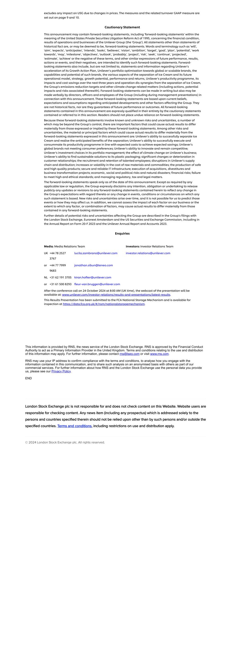 excludes any impact on USG due to changes in prices. The measures and the related turnover GAAP measure are set out on page 9 and 10. Cautionary Statement This announcement may contain forward-looking statements, including 'forward-looking statements' within the meaning of the United States Private Securities Litigation Reform Act of 1995, concerning the financial condition, results of operations and businesses of the Unilever Group (the 'Group'). All statements other than statements of historical fact are, or may be deemed to be, forward-looking statements. Words and terminology such as 'will', 'aim', 'expects', 'anticipates', 'intends', 'looks', 'believes', 'vision', 'ambition', 'target', 'goal', 'plan', 'potential', 'work towards', 'may', 'milestone', 'objectives', 'outlook', 'probably', 'project', 'risk', 'seek', 'continue', 'projected', 'estimate', 'achieve' or the negative of these terms, and other similar expressions of future performance, results, actions or events, and their negatives, are intended to identify such forward-looking statements. Forward- looking statements also include, but are not limited to, statements and information regarding Unilever's acceleration of its Growth Action Plan, Unilever's portfolio optimisation towards global or scalable brands, the capabilities and potential of such brands, the various aspects of the separation of Ice Cream and its future operational model, strategy, growth potential, performance and returns, Unilever's productivity programme, its impacts and cost savings over the next three years and operation dis-synergies from the separation of Ice Cream, the Group's emissions reduction targets and other climate change related matters (including actions, potential impacts and risks associated therewith). Forward-looking statements can be made in writing but also may be made verbally by directors, officers and employees of the Group (including during management presentations) in connection with this announcement. These forward-looking statements are based upon current beliefs, expectations and assumptions regarding anticipated developments and other factors affecting the Group. They are not historical facts, nor are they guarantees of future performance or outcomes. All forward-looking statements contained in this announcement are expressly qualified in their entirety by the cautionary statements contained or referred to in this section. Readers should not place undue reliance on forward-looking statements. Because these forward-looking statements involve known and unknown risks and uncertainties, a number of which may be beyond the Group's control, there are important factors that could cause actual results to differ materially from those expressed or implied by these forward-looking statements. Among other risks and uncertainties, the material or principal factors which could cause actual results to differ materially from the forward-looking statements expressed in this announcement are: Unilever's ability to successfully separate Ice Cream and realise the anticipated benefits of the separation; Unilever's ability to successfully execute and consummate its productivity programme in line with expected costs to achieve expected savings; Unilever's global brands not meeting consumer preferences; Unilever's ability to innovate and remain competitive; Unilever's investment choices in its portfolio management; the effect of climate change on Unilever's business; Unilever's ability to find sustainable solutions to its plastic packaging; significant changes or deterioration in customer relationships; the recruitment and retention of talented employees; disruptions in Unilever's supply chain and distribution; increases or volatility in the cost of raw materials and commodities; the production of safe and high quality products; secure and reliable IT infrastructure; execution of acquisitions, divestitures and business transformation projects; economic, social and political risks and natural disasters; financial risks; failure to meet high and ethical standards; and managing regulatory, tax and legal matters. The forward-looking statements speak only as of the date of this announcement. Except as required by any applicable law or regulation, the Group expressly disclaims any intention, obligation or undertaking to release publicly any updates or revisions to any forward-looking statements contained herein to reflect any change in the Group's expectations with regard thereto or any change in events, conditions or circumstances on which any such statement is based. New risks and uncertainties arise over time, and it is not possible for us to predict those events or how they may affect us. In addition, we cannot assess the impact of each factor on our business or the extent to which any factor, or combination of factors, may cause actual results to differ materially from those contained in any forward-looking statements. Further details of potential risks and uncertainties affecting the Group are described in the Group's filings with the London Stock Exchange, Euronext Amsterdam and the US Securities and Exchange Commission, including in the Annual Report on Form 20-F 2023 and the Unilever Annual Report and Accounts 2023. Enquiries   Media: Media Relations Team Investors: Investor Relations Team UK +44 78 2527 3767 lucila.zambrano@unilever.com investor.relations@unilever.com or +44 77 7999 9683 jonathan.sibun@teneo.com NL +31 62 191 3705 kiran.hofker@unilever.com or +31 61 500 8293 fleur-van.bruggen@unilever.com After the conference call on 24 October 2024 at 8:00 AM (UK time), the webcast of the presentation will be available at: www.unilever.com/investor-relations/results-and-presentations/latest-results. This Results Presentation has been submitted to the FCA National Storage Mechanism and is available for inspection at https://data.fca.org.uk/#/nsm/nationalstoragemechanism. This information is provided by RNS, the news service of the London Stock Exc