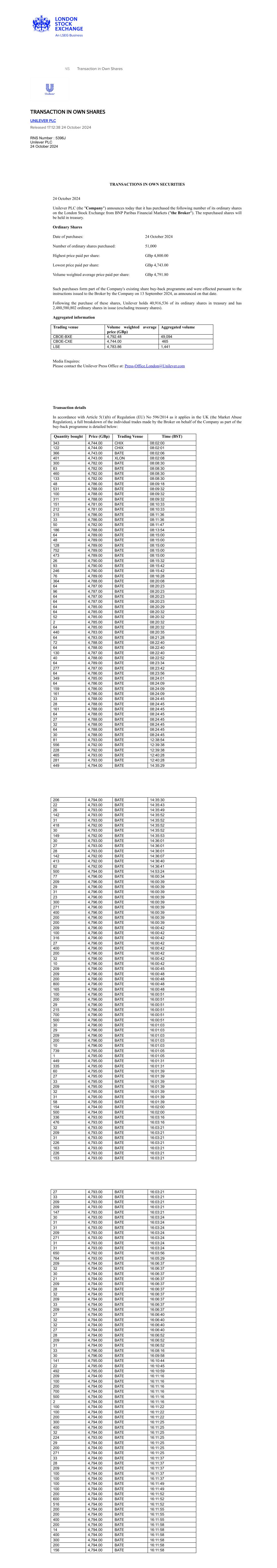 RNS Transaction in Own Shares TRANSACTION IN OWN SHARES UNILEVER PLC Released 17:12:38 24 October 2024 RNS Number : 5396J Unilever PLC 24 October 2024 TRANSACTIONS IN OWN SECURITIES 24 October 2024 Unilever PLC (the "Company") announces today that it has purchased the following number of its ordinary shares on the London Stock Exchange from BNP Paribas Financial Markets ("the Broker"). The repurchased shares will be held in treasury. Ordinary Shares Date of purchases: 24 October 2024 Number of ordinary shares purchased: 51,000 Highest price paid per share: GBp 4,800.00 Lowest price paid per share: GBp 4,743.00 Volume weighted average price paid per share: GBp 4,791.80 Such purchases form part of the Company's existing share buy-back programme and were effected pursuant to the instructions issued to the Broker by the Company on 13 September 2024, as announced on that date. Following the purchase of these shares, Unilever holds 40,916,536 of its ordinary shares in treasury and has 2,480,580,802 ordinary shares in issue (excluding treasury shares). Aggregated information Trading venue Volume weighted average price (GBp) Aggregated volume CBOE-BXE 4,792.48 49,094 CBOE-CXE 4,744.00 465 LSE 4,783.86 1,441 Media Enquires: Please contact the Unilever Press Office at: Press-Office.London@Unilever.com Transaction details In accordance with Article 5(1)(b) of Regulation (EU) No 596/2014 as it applies in the UK (the Market Abuse Regulation), a full breakdown of the individual trades made by the Broker on behalf of the Company as part of the buy-back programme is detailed below: Quantity bought Price (GBp) Trading Venue Time (BST) 343 4,744.00 CHIX 08:02:00 122 4,744.00 CHIX 08:02:01 366 4,743.00 BATE 08:02:06 401 4,743.00 XLON 08:02:08 300 4,782.00 BATE 08:08:30 83 4,782.00 BATE 08:08:30 460 4,782.00 BATE 08:08:30 133 4,782.00 BATE 08:08:30 48 4,786.00 BATE 08:09:18 531 4,788.00 BATE 08:09:32 100 4,788.00 BATE 08:09:32 311 4,788.00 BATE 08:09:32 151 4,781.00 BATE 08:10:33 212 4,781.00 BATE 08:10:33 315 4,786.00 BATE 08:11:36 33 4,786.00 BATE 08:11:36 50 4,782.00 BATE 08:11:47 186 4,788.00 BATE 08:13:54 64 4,789.00 BATE 08:15:00 48 4,789.00 BATE 08:15:00 128 4,789.00 BATE 08:15:00 752 4,789.00 BATE 08:15:00 473 4,789.00 BATE 08:15:00 26 4,790.00 BATE 08:15:32 93 4,790.00 BATE 08:15:42 246 4,790.00 BATE 08:15:42 76 4,789.00 BATE 08:16:28 364 4,788.00 BATE 08:20:08 64 4,787.00 BATE 08:20:23 96 4,787.00 BATE 08:20:23 64 4,787.00 BATE 08:20:23 64 4,787.00 BATE 08:20:23 64 4,785.00 BATE 08:20:29 64 4,785.00 BATE 08:20:32 52 4,785.00 BATE 08:20:32 2 4,785.00 BATE 08:20:32 64 4,785.00 BATE 08:20:32 440 4,783.00 BATE 08:20:35 64 4,783.00 BATE 08:21:28 72 4,788.00 BATE 08:22:40 64 4,788.00 BATE 08:22:40 130 4,787.00 BATE 08:22:40 40 4,788.00 BATE 08:22:52 64 4,789.00 BATE 08:23:34 277 4,787.00 BATE 08:23:42 64 4,786.00 BATE 08:23:56 349 4,785.00 BATE 08:24:01 64 4,786.00 BATE 08:24:09 159 4,786.00 BATE 08:24:09 161 4,786.00 BATE 08:24:09 33 4,788.00 BATE 08:24:45 28 4,788.00 BATE 08:24:45 161 4,788.00 BATE 08:24:45 64 4,788.00 BATE 08:24:45 27 4,788.00 BATE 08:24:45 32 4,788.00 BATE 08:24:45 64 4,788.00 BATE 08:24:45 30 4,788.00 BATE 08:24:45 81 4,793.00 BATE 12:38:54 556 4,792.00 BATE 12:39:38 228 4,792.00 BATE 12:39:38 465 4,793.00 BATE 12:40:28 281 4,793.00 BATE 12:40:28 449 4,794.00 BATE 14:35:29 206 4,794.00 BATE 14:35:30 22 4,793.00 BATE 14:35:43 26 4,793.00 BATE 14:35:49 142 4,793.00 BATE 14:35:52 31 4,793.00 BATE 14:35:52 418 4,792.00 BATE 14:35:52 30 4,793.00 BATE 14:35:52 149 4,792.00 BATE 14:35:53 30 4,793.00 BATE 14:36:01 27 4,793.00 BATE 14:36:01 28 4,793.00 BATE 14:36:01 142 4,792.00 BATE 14:36:07 413 4,792.00 BATE 14:36:40 82 4,792.00 BATE 14:36:41 500 4,794.00 BATE 14:53:24 77 4,796.00 BATE 16:00:34 209 4,796.00 BATE 16:00:39 29 4,796.00 BATE 16:00:39 31 4,796.00 BATE 16:00:39 23 4,796.00 BATE 16:00:39 300 4,796.00 BATE 16:00:39 271 4,796.00 BATE 16:00:39 400 4,796.00 BATE 16:00:39 200 4,796.00 BATE 16:00:39 200 4,796.00 BATE 16:00:39 209 4,796.00 BATE 16:00:42 100 4,796.00 BATE 16:00:42 316 4,796.00 BATE 16:00:42 27 4,796.00 BATE 16:00:42 400 4,796.00 BATE 16:00:42 200 4,796.00 BATE 16:00:42 32 4,796.00 BATE 16:00:42 10 4,796.00 BATE 16:00:42 209 4,796.00 BATE 16:00:45 209 4,796.00 BATE 16:00:48 200 4,796.00 BATE 16:00:48 800 4,796.00 BATE 16:00:48 165 4,796.00 BATE 16:00:48 100 4,796.00 BATE 16:00:51 200 4,796.00 BATE 16:00:51 29 4,796.00 BATE 16:00:51 215 4,796.00 BATE 16:00:51 700 4,796.00 BATE 16:00:51 500 4,796.00 BATE 16:00:51 30 4,796.00 BATE 16:01:03 29 4,796.00 BATE 16:01:03 209 4,796.00 BATE 16:01:03 200 4,796.00 BATE 16:01:03 10 4,796.00 BATE 16:01:03 739 4,795.00 BATE 16:01:05 1 4,795.00 BATE 16:01:05 449 4,795.00 BATE 16:01:31 335 4,795.00 BATE 16:01:31 60 4,795.00 BATE 16:01:39 27 4,795.00 BATE 16:01:39 33 4,795.00 BATE 16:01:39 209 4,795.00 BATE 16:01:39 32 4,795.00 BATE 16:01:39 31 4,795.00 BATE 16:01:39 58 4,795.00 BATE 16:01:39 154 4,794.00 BATE 16:02:00 500 4,794.00 BATE 16:02:00 336 4,793.00 BATE 16:03:16 476 4,793.00 BATE 16:03:16 32 4,793.00 BATE 16:03:21 209 4,793.00 BATE 16:03:21 31 4,793.00 BATE 16:03:21 226 4,793.00 BATE 16:03:21 163 4,793.00 BATE 16:03:21 226 4,793.00 BATE 16:03:21 153 4,793.00 BATE 16:03:21 27 4,793.00 BATE 16:03:21 33 4,793.00 BATE 16:03:21 209 4,793.00 BATE 16:03:21 209 4,793.00 BATE 16:03:21 147 4,793.00 BATE 16:03:21 30 4,793.00 BATE 16:03:24 31 4,793.00 BATE 16:03:24 31 4,793.00 BATE 16:03:24 209 4,793.00 BATE 16:03:24 271 4,793.00 BATE 16:03:24 31 4,793.00 BATE 16:03:24 31 4,793.00 BATE 16:03:24 650 4,792.00 BATE 16:03:56 764 4,793.00 BATE 16:05:29 209 4,794.00 BATE 16:06:37 32 4,794.00 BATE 16:06:37 30 4,794.00 BATE 16:06:37 21 4,794.00 BATE 16:06:37 209 4,794.00 BATE 16:06:37 28 4,794.00 BATE 16:06:37 32 4,794.00 BATE 16:06:37 209 4,794.00 BATE 16:06:37 33 4,794.00 BATE 16:06:37 209 4,794.00 BATE 16:06:37 27 4,794.00 BATE 16:06:40 32 4,794.00 BATE 16:06:40 32 4,794.00 BATE 16:06:40 27 4,794.00 BATE 16:06:40 28 4,794.00 BATE 16:06:52 209 4,7