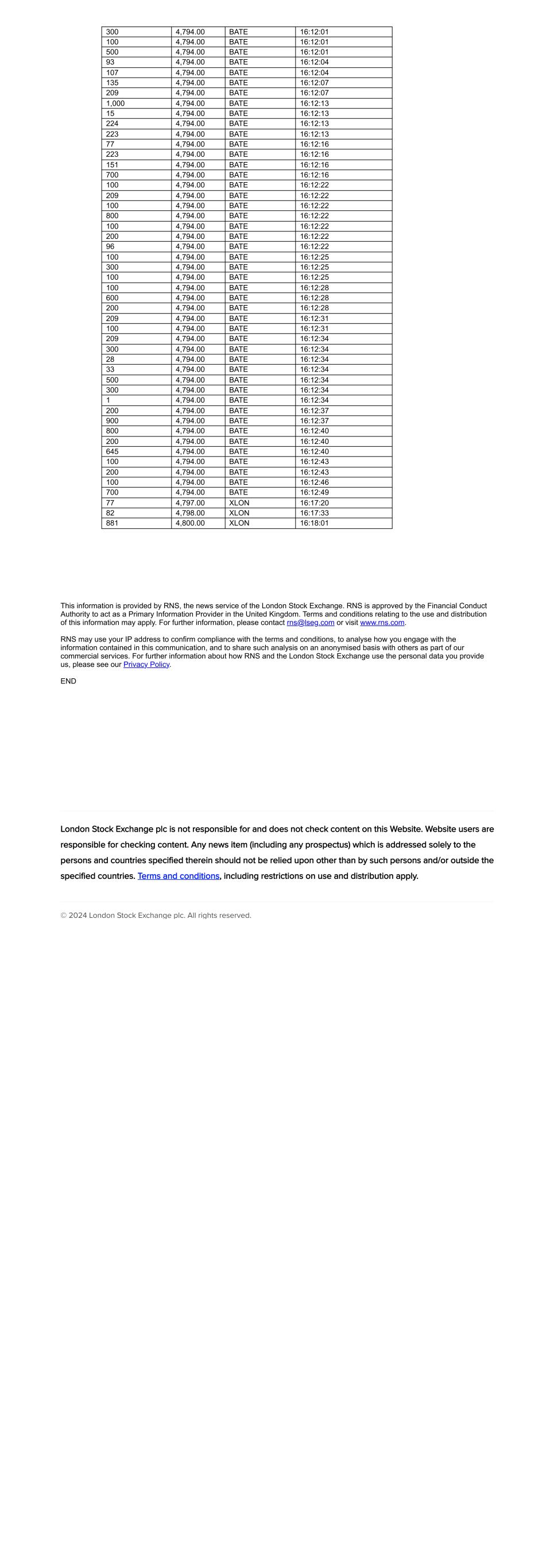 300 4,794.00 BATE 16:12:01 100 4,794.00 BATE 16:12:01 500 4,794.00 BATE 16:12:01 93 4,794.00 BATE 16:12:04 107 4,794.00 BATE 16:12:04 135 4,794.00 BATE 16:12:07 209 4,794.00 BATE 16:12:07 1,000 4,794.00 BATE 16:12:13 15 4,794.00 BATE 16:12:13 224 4,794.00 BATE 16:12:13 223 4,794.00 BATE 16:12:13 77 4,794.00 BATE 16:12:16 223 4,794.00 BATE 16:12:16 151 4,794.00 BATE 16:12:16 700 4,794.00 BATE 16:12:16 100 4,794.00 BATE 16:12:22 209 4,794.00 BATE 16:12:22 100 4,794.00 BATE 16:12:22 800 4,794.00 BATE 16:12:22 100 4,794.00 BATE 16:12:22 200 4,794.00 BATE 16:12:22 96 4,794.00 BATE 16:12:22 100 4,794.00 BATE 16:12:25 300 4,794.00 BATE 16:12:25 100 4,794.00 BATE 16:12:25 100 4,794.00 BATE 16:12:28 600 4,794.00 BATE 16:12:28 200 4,794.00 BATE 16:12:28 209 4,794.00 BATE 16:12:31 100 4,794.00 BATE 16:12:31 209 4,794.00 BATE 16:12:34 300 4,794.00 BATE 16:12:34 28 4,794.00 BATE 16:12:34 33 4,794.00 BATE 16:12:34 500 4,794.00 BATE 16:12:34 300 4,794.00 BATE 16:12:34 1 4,794.00 BATE 16:12:34 200 4,794.00 BATE 16:12:37 900 4,794.00 BATE 16:12:37 800 4,794.00 BATE 16:12:40 200 4,794.00 BATE 16:12:40 645 4,794.00 BATE 16:12:40 100 4,794.00 BATE 16:12:43 200 4,794.00 BATE 16:12:43 100 4,794.00 BATE 16:12:46 700 4,794.00 BATE 16:12:49 77 4,797.00 XLON 16:17:20 82 4,798.00 XLON 16:17:33 881 4,800.00 XLON 16:18:01 This information is provided by RNS, the news service of the London Stock Exchange. RNS is approved by the Financial Conduct Authority to act as a Primary Information Provider in the United Kingdom. Terms and conditions relating to the use and distribution of this information may apply. For further information, please contact rns@lseg.com or visit www.rns.com. RNS may use your IP address to confirm compliance with the terms and conditions, to analyse how you engage with the information contained in this communication, and to share such analysis on an anonymised basis with others as part of our commercial services. For further information about how RNS and the London Stock Exchange use the personal data you provide us, please see our Privacy Policy. END London Stock Exchange plc is not responsible for and does not check content on this Website. Website users are responsible for checking content. Any news item (including any prospectus) which is addressed solely to the persons and countries specified therein should not be relied upon other than by such persons and/or outside the specified countries. Terms and conditions, including restrictions on use and distribution apply. © 2024 London Stock Exchange plc. All rights reserved.