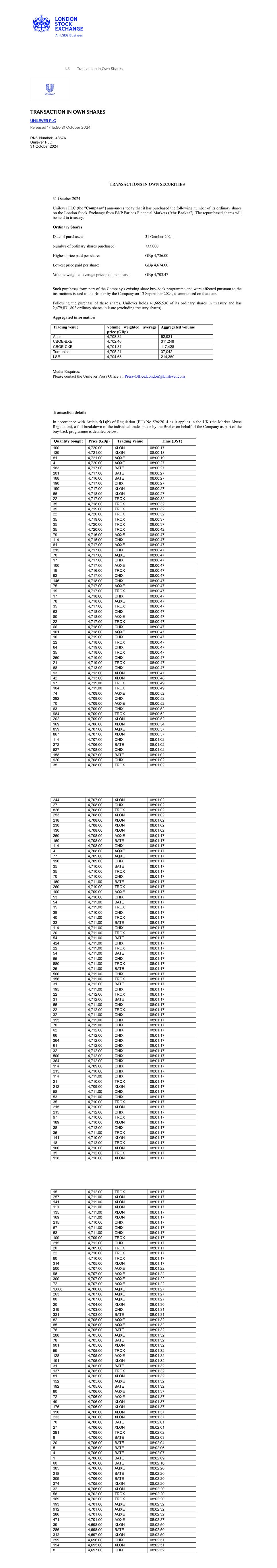RNS Transaction in Own Shares TRANSACTION IN OWN SHARES UNILEVER PLC Released 17:15:50 31 October 2024 RNS Number : 4857K Unilever PLC 31 October 2024 TRANSACTIONS IN OWN SECURITIES 31 October 2024 Unilever PLC (the "Company") announces today that it has purchased the following number of its ordinary shares on the London Stock Exchange from BNP Paribas Financial Markets ("the Broker"). The repurchased shares will be held in treasury. Ordinary Shares Date of purchases: 31 October 2024 Number of ordinary shares purchased: 733,000 Highest price paid per share: GBp 4,736.00 Lowest price paid per share: GBp 4,674.00 Volume weighted average price paid per share: GBp 4,703.47 Such purchases form part of the Company's existing share buy-back programme and were effected pursuant to the instructions issued to the Broker by the Company on 13 September 2024, as announced on that date. Following the purchase of these shares, Unilever holds 41,665,536 of its ordinary shares in treasury and has 2,479,831,802 ordinary shares in issue (excluding treasury shares). Aggregated information Trading venue Volume weighted average price (GBp) Aggregated volume Aquis 4,708.32 52,931 CBOE-BXE 4,702.46 311,249 CBOE-CXE 4,701.31 117,428 Turquoise 4,705.21 37,042 LSE 4,704.63 214,350 Media Enquires: Please contact the Unilever Press Office at: Press-Office.London@Unilever.com Transaction details In accordance with Article 5(1)(b) of Regulation (EU) No 596/2014 as it applies in the UK (the Market Abuse Regulation), a full breakdown of the individual trades made by the Broker on behalf of the Company as part of the buy-back programme is detailed below: Quantity bought Price (GBp) Trading Venue Time (BST) 100 4,720.00 XLON 08:00:17 139 4,721.00 XLON 08:00:18 81 4,721.00 AQXE 08:00:19 4 4,720.00 AQXE 08:00:27 183 4,717.00 BATE 08:00:27 201 4,717.00 BATE 08:00:27 188 4,716.00 BATE 08:00:27 190 4,717.00 CHIX 08:00:27 190 4,717.00 XLON 08:00:27 66 4,718.00 XLON 08:00:27 22 4,717.00 TRQX 08:00:32 35 4,718.00 TRQX 08:00:32 35 4,719.00 TRQX 08:00:32 22 4,720.00 TRQX 08:00:32 35 4,719.00 TRQX 08:00:37 35 4,720.00 TRQX 08:00:37 35 4,720.00 TRQX 08:00:42 79 4,716.00 AQXE 08:00:47 114 4,715.00 CHIX 08:00:47 81 4,717.00 AQXE 08:00:47 215 4,717.00 CHIX 08:00:47 70 4,717.00 AQXE 08:00:47 17 4,717.00 CHIX 08:00:47 100 4,717.00 AQXE 08:00:47 19 4,716.00 TRQX 08:00:47 62 4,717.00 CHIX 08:00:47 146 4,718.00 CHIX 08:00:47 75 4,717.00 AQXE 08:00:47 19 4,717.00 TRQX 08:00:47 17 4,718.00 CHIX 08:00:47 78 4,718.00 AQXE 08:00:47 35 4,717.00 TRQX 08:00:47 63 4,718.00 CHIX 08:00:47 80 4,718.00 AQXE 08:00:47 22 4,717.00 TRQX 08:00:47 66 4,718.00 CHIX 08:00:47 101 4,718.00 AQXE 08:00:47 10 4,719.00 CHIX 08:00:47 22 4,718.00 TRQX 08:00:47 64 4,719.00 CHIX 08:00:47 35 4,718.00 TRQX 08:00:47 250 4,719.00 CHIX 08:00:47 21 4,719.00 TRQX 08:00:47 68 4,713.00 CHIX 08:00:47 93 4,713.00 XLON 08:00:47 42 4,713.00 XLON 08:00:48 97 4,711.00 TRQX 08:00:49 104 4,711.00 TRQX 08:00:49 74 4,709.00 AQXE 08:00:52 292 4,708.00 CHIX 08:00:52 70 4,709.00 AQXE 08:00:52 63 4,709.00 CHIX 08:00:52 984 4,709.00 TRQX 08:00:52 202 4,709.00 XLON 08:00:52 169 4,706.00 XLON 08:00:54 859 4,707.00 AQXE 08:00:57 867 4,707.00 XLON 08:00:57 114 4,707.00 CHIX 08:01:02 272 4,706.00 BATE 08:01:02 527 4,708.00 CHIX 08:01:02 158 4,707.00 BATE 08:01:02 920 4,708.00 CHIX 08:01:02 35 4,708.00 TRQX 08:01:02 244 4,707.00 XLON 08:01:02 27 4,708.00 CHIX 08:01:02 826 4,708.00 TRQX 08:01:02 253 4,708.00 XLON 08:01:02 218 4,708.00 XLON 08:01:02 230 4,708.00 XLON 08:01:02 130 4,708.00 XLON 08:01:02 260 4,708.00 AQXE 08:01:17 160 4,708.00 BATE 08:01:17 114 4,708.00 CHIX 08:01:17 4 4,708.00 AQXE 08:01:17 77 4,709.00 AQXE 08:01:17 190 4,709.00 CHIX 08:01:17 35 4,710.00 BATE 08:01:17 35 4,710.00 TRQX 08:01:17 70 4,710.00 CHIX 08:01:17 160 4,711.00 BATE 08:01:17 260 4,710.00 TRQX 08:01:17 100 4,709.00 AQXE 08:01:17 53 4,710.00 CHIX 08:01:17 54 4,711.00 BATE 08:01:17 35 4,711.00 TRQX 08:01:17 38 4,710.00 CHIX 08:01:17 40 4,711.00 TRQX 08:01:17 33 4,711.00 BATE 08:01:17 114 4,711.00 CHIX 08:01:17 20 4,711.00 TRQX 08:01:17 54 4,711.00 BATE 08:01:17 424 4,711.00 CHIX 08:01:17 22 4,711.00 TRQX 08:01:17 54 4,711.00 BATE 08:01:17 65 4,711.00 CHIX 08:01:17 880 4,711.00 TRQX 08:01:17 25 4,711.00 BATE 08:01:17 500 4,711.00 CHIX 08:01:17 156 4,711.00 TRQX 08:01:17 31 4,712.00 BATE 08:01:17 195 4,711.00 CHIX 08:01:17 22 4,712.00 TRQX 08:01:17 31 4,712.00 BATE 08:01:17 55 4,711.00 CHIX 08:01:17 22 4,712.00 TRQX 08:01:17 32 4,711.00 CHIX 08:01:17 195 4,711.00 CHIX 08:01:17 70 4,711.00 CHIX 08:01:17 62 4,712.00 CHIX 08:01:17 66 4,712.00 CHIX 08:01:17 364 4,712.00 CHIX 08:01:17 61 4,712.00 CHIX 08:01:17 32 4,712.00 CHIX 08:01:17 500 4,712.00 CHIX 08:01:17 364 4,712.00 CHIX 08:01:17 114 4,709.00 CHIX 08:01:17 215 4,710.00 CHIX 08:01:17 114 4,711.00 CHIX 08:01:17 21 4,710.00 TRQX 08:01:17 212 4,709.00 XLON 08:01:17 58 4,711.00 CHIX 08:01:17 53 4,711.00 CHIX 08:01:17 35 4,710.00 TRQX 08:01:17 215 4,710.00 XLON 08:01:17 215 4,712.00 CHIX 08:01:17 97 4,710.00 TRQX 08:01:17 189 4,710.00 XLON 08:01:17 38 4,712.00 CHIX 08:01:17 35 4,711.00 TRQX 08:01:17 141 4,710.00 XLON 08:01:17 18 4,712.00 TRQX 08:01:17 100 4,710.00 XLON 08:01:17 35 4,712.00 TRQX 08:01:17 128 4,710.00 XLON 08:01:17 15 4,712.00 TRQX 08:01:17 257 4,711.00 XLON 08:01:17 141 4,711.00 XLON 08:01:17 119 4,711.00 XLON 08:01:17 135 4,711.00 XLON 08:01:17 169 4,711.00 XLON 08:01:17 215 4,710.00 CHIX 08:01:17 67 4,711.00 CHIX 08:01:17 53 4,711.00 CHIX 08:01:17 109 4,709.00 TRQX 08:01:17 215 4,712.00 CHIX 08:01:17 20 4,709.00 TRQX 08:01:17 22 4,710.00 TRQX 08:01:17 80 4,710.00 TRQX 08:01:17 314 4,705.00 XLON 08:01:17 500 4,707.00 AQXE 08:01:22 96 4,707.00 AQXE 08:01:22 300 4,707.00 AQXE 08:01:22 72 4,707.00 AQXE 08:01:22 1,006 4,706.00 AQXE 08:01:27 263 4,707.00 AQXE 08:01:27 80 4,707.00 AQXE 08:01:27 20 4,704.00 XLON 08:01:30 319 4,703.00 CHIX 08:01:31 331 4,703.00 BATE 08:01:31 82 4,705.00 AQXE 08:01:32 85 4,705.00 AQXE 08:01:32 78 4,705.00 BATE 08:01:32 288 4,705.00 