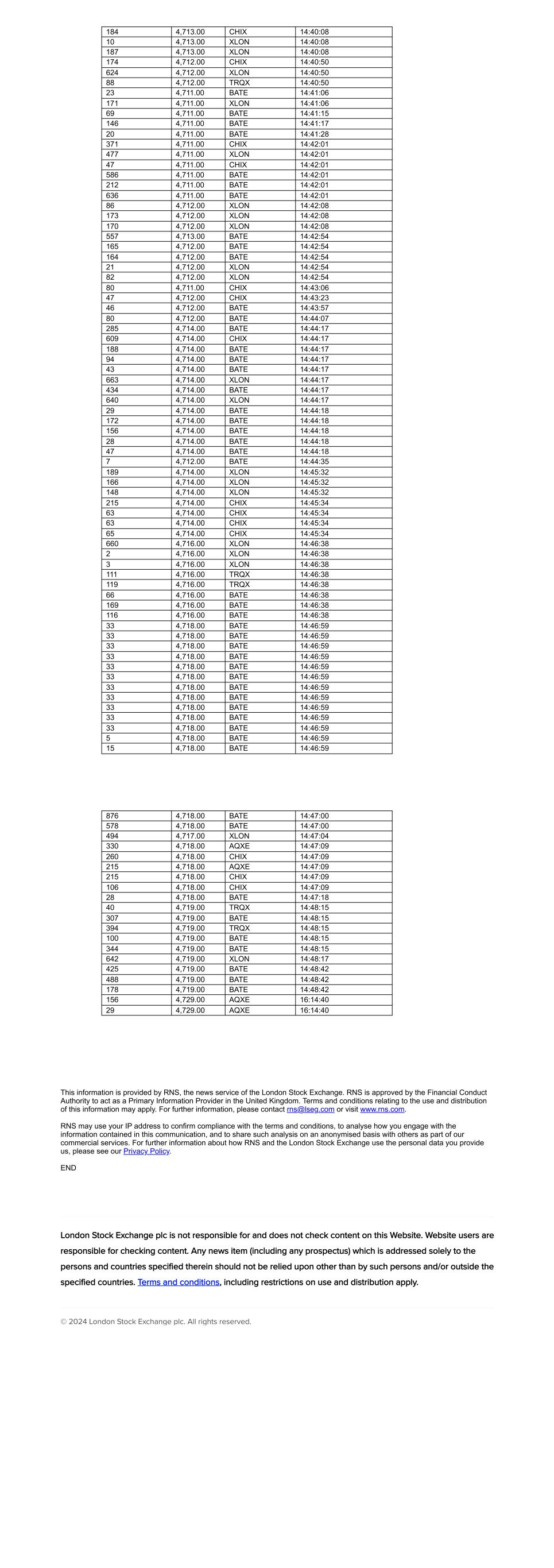 184 4,713.00 CHIX 14:40:08 10 4,713.00 XLON 14:40:08 187 4,713.00 XLON 14:40:08 174 4,712.00 CHIX 14:40:50 624 4,712.00 XLON 14:40:50 88 4,712.00 TRQX 14:40:50 23 4,711.00 BATE 14:41:06 171 4,711.00 XLON 14:41:06 69 4,711.00 BATE 14:41:15 146 4,711.00 BATE 14:41:17 20 4,711.00 BATE 14:41:28 371 4,711.00 CHIX 14:42:01 477 4,711.00 XLON 14:42:01 47 4,711.00 CHIX 14:42:01 586 4,711.00 BATE 14:42:01 212 4,711.00 BATE 14:42:01 636 4,711.00 BATE 14:42:01 86 4,712.00 XLON 14:42:08 173 4,712.00 XLON 14:42:08 170 4,712.00 XLON 14:42:08 557 4,713.00 BATE 14:42:54 165 4,712.00 BATE 14:42:54 164 4,712.00 BATE 14:42:54 21 4,712.00 XLON 14:42:54 82 4,712.00 XLON 14:42:54 80 4,711.00 CHIX 14:43:06 47 4,712.00 CHIX 14:43:23 46 4,712.00 BATE 14:43:57 80 4,712.00 BATE 14:44:07 285 4,714.00 BATE 14:44:17 609 4,714.00 CHIX 14:44:17 188 4,714.00 BATE 14:44:17 94 4,714.00 BATE 14:44:17 43 4,714.00 BATE 14:44:17 663 4,714.00 XLON 14:44:17 434 4,714.00 BATE 14:44:17 640 4,714.00 XLON 14:44:17 29 4,714.00 BATE 14:44:18 172 4,714.00 BATE 14:44:18 156 4,714.00 BATE 14:44:18 28 4,714.00 BATE 14:44:18 47 4,714.00 BATE 14:44:18 7 4,712.00 BATE 14:44:35 189 4,714.00 XLON 14:45:32 166 4,714.00 XLON 14:45:32 148 4,714.00 XLON 14:45:32 215 4,714.00 CHIX 14:45:34 63 4,714.00 CHIX 14:45:34 63 4,714.00 CHIX 14:45:34 65 4,714.00 CHIX 14:45:34 660 4,716.00 XLON 14:46:38 2 4,716.00 XLON 14:46:38 3 4,716.00 XLON 14:46:38 111 4,716.00 TRQX 14:46:38 119 4,716.00 TRQX 14:46:38 66 4,716.00 BATE 14:46:38 169 4,716.00 BATE 14:46:38 116 4,716.00 BATE 14:46:38 33 4,718.00 BATE 14:46:59 33 4,718.00 BATE 14:46:59 33 4,718.00 BATE 14:46:59 33 4,718.00 BATE 14:46:59 33 4,718.00 BATE 14:46:59 33 4,718.00 BATE 14:46:59 33 4,718.00 BATE 14:46:59 33 4,718.00 BATE 14:46:59 33 4,718.00 BATE 14:46:59 33 4,718.00 BATE 14:46:59 33 4,718.00 BATE 14:46:59 5 4,718.00 BATE 14:46:59 15 4,718.00 BATE 14:46:59 876 4,718.00 BATE 14:47:00 578 4,718.00 BATE 14:47:00 494 4,717.00 XLON 14:47:04 330 4,718.00 AQXE 14:47:09 260 4,718.00 CHIX 14:47:09 215 4,718.00 AQXE 14:47:09 215 4,718.00 CHIX 14:47:09 106 4,718.00 CHIX 14:47:09 28 4,718.00 BATE 14:47:18 40 4,719.00 TRQX 14:48:15 307 4,719.00 BATE 14:48:15 394 4,719.00 TRQX 14:48:15 100 4,719.00 BATE 14:48:15 344 4,719.00 BATE 14:48:15 642 4,719.00 XLON 14:48:17 425 4,719.00 BATE 14:48:42 488 4,719.00 BATE 14:48:42 178 4,719.00 BATE 14:48:42 156 4,729.00 AQXE 16:14:40 29 4,729.00 AQXE 16:14:40 This information is provided by RNS, the news service of the London Stock Exchange. RNS is approved by the Financial Conduct Authority to act as a Primary Information Provider in the United Kingdom. Terms and conditions relating to the use and distribution of this information may apply. For further information, please contact rns@lseg.com or visit www.rns.com. RNS may use your IP address to confirm compliance with the terms and conditions, to analyse how you engage with the information contained in this communication, and to share such analysis on an anonymised basis with others as part of our commercial services. For further information about how RNS and the London Stock Exchange use the personal data you provide us, please see our Privacy Policy. END London Stock Exchange plc is not responsible for and does not check content on this Website. Website users are responsible for checking content. Any news item (including any prospectus) which is addressed solely to the persons and countries specified therein should not be relied upon other than by such persons and/or outside the specified countries. Terms and conditions, including restrictions on use and distribution apply. © 2024 London Stock Exchange plc. All rights reserved.