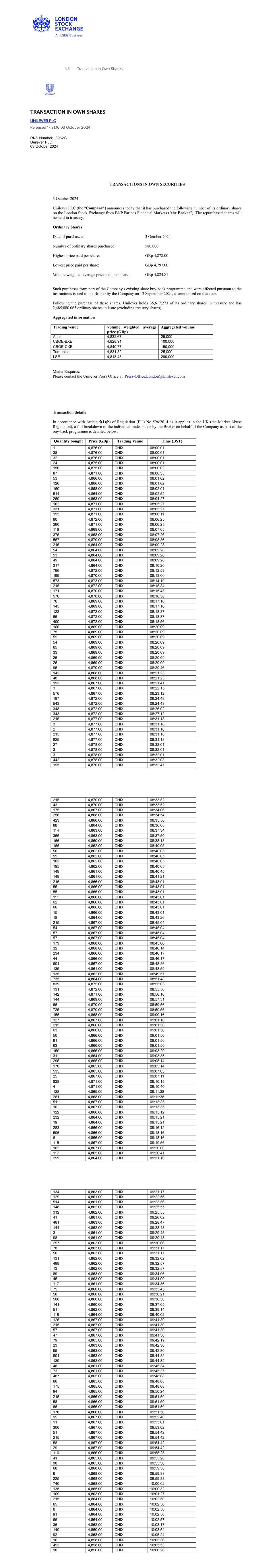 RNS Transaction in Own Shares TRANSACTION IN OWN SHARES UNILEVER PLC Released 17:31:16 03 October 2024 RNS Number : 8962G Unilever PLC 03 October 2024 TRANSACTIONS IN OWN SECURITIES 3 October 2024 Unilever PLC (the "Company") announces today that it has purchased the following number of its ordinary shares on the London Stock Exchange from BNP Paribas Financial Markets ("the Broker"). The repurchased shares will be held in treasury. Ordinary Shares Date of purchases: 3 October 2024 Number of ordinary shares purchased: 580,000 Highest price paid per share: GBp 4,878.00 Lowest price paid per share: GBp 4,797.00 Volume weighted average price paid per share: GBp 4,824.81 Such purchases form part of the Company's existing share buy-back programme and were effected pursuant to the instructions issued to the Broker by the Company on 13 September 2024, as announced on that date. Following the purchase of these shares, Unilever holds 35,617,273 of its ordinary shares in treasury and has 2,485,880,065 ordinary shares in issue (excluding treasury shares). Aggregated information Trading venue Volume weighted average price (GBp) Aggregated volume Aquis 4,832.67 25,000 CBOE-BXE 4,828.91 100,000 CBOE-CXE 4,840.77 150,000 Turquoise 4,831.82 25,000 LSE 4,813.48 280,000 Media Enquires: Please contact the Unilever Press Office at: Press-Office.London@Unilever.com Transaction details In accordance with Article 5(1)(b) of Regulation (EU) No 596/2014 as it applies in the UK (the Market Abuse Regulation), a full breakdown of the individual trades made by the Broker on behalf of the Company as part of the buy-back programme is detailed below: Quantity bought Price (GBp) Trading Venue Time (BST) 1 4,876.00 CHIX 08:00:01 38 4,876.00 CHIX 08:00:01 32 4,876.00 CHIX 08:00:01 24 4,875.00 CHIX 08:00:01 150 4,875.00 CHIX 08:00:02 87 4,871.00 CHIX 08:00:35 53 4,866.00 CHIX 08:01:02 126 4,866.00 CHIX 08:01:02 160 4,858.00 CHIX 08:02:01 514 4,864.00 CHIX 08:02:52 260 4,863.00 CHIX 08:04:27 102 4,871.00 CHIX 08:05:27 331 4,871.00 CHIX 08:05:27 195 4,871.00 CHIX 08:06:11 80 4,872.00 CHIX 08:06:25 280 4,871.00 CHIX 08:06:25 116 4,868.00 CHIX 08:07:05 375 4,868.00 CHIX 08:07:26 567 4,870.00 CHIX 08:08:36 215 4,864.00 CHIX 08:09:28 54 4,864.00 CHIX 08:09:28 53 4,864.00 CHIX 08:09:28 49 4,864.00 CHIX 08:09:28 317 4,864.00 CHIX 08:10:20 796 4,872.00 CHIX 08:12:59 199 4,870.00 CHIX 08:13:00 573 4,873.00 CHIX 08:14:19 215 4,872.00 CHIX 08:15:34 171 4,870.00 CHIX 08:15:43 576 4,870.00 CHIX 08:16:38 76 4,869.00 CHIX 08:17:10 145 4,869.00 CHIX 08:17:10 122 4,872.00 CHIX 08:18:37 66 4,872.00 CHIX 08:18:37 400 4,872.00 CHIX 08:18:56 160 4,869.00 CHIX 08:20:09 75 4,869.00 CHIX 08:20:09 59 4,869.00 CHIX 08:20:09 54 4,869.00 CHIX 08:20:09 65 4,869.00 CHIX 08:20:09 33 4,869.00 CHIX 08:20:09 25 4,869.00 CHIX 08:20:09 26 4,869.00 CHIX 08:20:09 95 4,870.00 CHIX 08:20:46 142 4,868.00 CHIX 08:21:23 48 4,868.00 CHIX 08:21:23 193 4,867.00 CHIX 08:21:41 3 4,867.00 CHIX 08:22:15 576 4,867.00 CHIX 08:23:12 197 4,872.00 CHIX 08:24:48 543 4,872.00 CHIX 08:24:48 348 4,872.00 CHIX 08:26:02 343 4,872.00 CHIX 08:27:12 215 4,877.00 CHIX 08:31:18 3 4,877.00 CHIX 08:31:18 2 4,877.00 CHIX 08:31:18 215 4,877.00 CHIX 08:31:18 825 4,877.00 CHIX 08:31:18 27 4,878.00 CHIX 08:32:01 3 4,878.00 CHIX 08:32:01 3 4,878.00 CHIX 08:32:01 442 4,878.00 CHIX 08:32:03 195 4,870.00 CHIX 08:32:47 215 4,870.00 CHIX 08:33:52 43 4,870.00 CHIX 08:33:52 175 4,867.00 CHIX 08:34:06 256 4,868.00 CHIX 08:34:54 423 4,866.00 CHIX 08:35:56 88 4,864.00 CHIX 08:36:08 114 4,863.00 CHIX 08:37:34 356 4,863.00 CHIX 08:37:50 166 4,860.00 CHIX 08:38:18 166 4,862.00 CHIX 08:40:05 50 4,862.00 CHIX 08:40:05 59 4,862.00 CHIX 08:40:05 182 4,862.00 CHIX 08:40:05 195 4,862.00 CHIX 08:40:05 149 4,861.00 CHIX 08:40:45 148 4,861.00 CHIX 08:41:21 215 4,866.00 CHIX 08:43:01 55 4,866.00 CHIX 08:43:01 55 4,866.00 CHIX 08:43:01 111 4,866.00 CHIX 08:43:01 62 4,866.00 CHIX 08:43:01 66 4,866.00 CHIX 08:43:01 15 4,866.00 CHIX 08:43:01 18 4,864.00 CHIX 08:43:26 215 4,867.00 CHIX 08:45:04 54 4,867.00 CHIX 08:45:04 57 4,867.00 CHIX 08:45:04 57 4,867.00 CHIX 08:45:04 179 4,868.00 CHIX 08:45:06 32 4,868.00 CHIX 08:46:14 234 4,866.00 CHIX 08:46:17 44 4,866.00 CHIX 08:46:17 601 4,867.00 CHIX 08:48:26 135 4,861.00 CHIX 08:48:59 135 4,862.00 CHIX 08:49:57 735 4,864.00 CHIX 08:51:48 839 4,875.00 CHIX 08:55:03 131 4,872.00 CHIX 08:55:56 142 4,871.00 CHIX 08:56:16 144 4,869.00 CHIX 08:57:31 66 4,870.00 CHIX 08:59:56 725 4,870.00 CHIX 08:59:56 155 4,868.00 CHIX 09:00:16 127 4,867.00 CHIX 09:01:10 215 4,866.00 CHIX 09:01:50 63 4,866.00 CHIX 09:01:50 50 4,866.00 CHIX 09:01:50 91 4,866.00 CHIX 09:01:50 63 4,866.00 CHIX 09:01:50 150 4,866.00 CHIX 09:03:29 311 4,864.00 CHIX 09:03:35 296 4,865.00 CHIX 09:05:14 170 4,865.00 CHIX 09:05:14 535 4,865.00 CHIX 09:07:03 25 4,867.00 CHIX 09:07:11 838 4,871.00 CHIX 09:10:15 4 4,871.00 CHIX 09:10:40 138 4,869.00 CHIX 09:11:38 261 4,868.00 CHIX 09:11:38 511 4,867.00 CHIX 09:13:35 10 4,867.00 CHIX 09:13:35 122 4,866.00 CHIX 09:15:12 232 4,864.00 CHIX 09:15:21 19 4,864.00 CHIX 09:15:21 283 4,866.00 CHIX 09:16:12 506 4,866.00 CHIX 09:18:16 6 4,866.00 CHIX 09:18:16 115 4,867.00 CHIX 09:19:56 162 4,867.00 CHIX 09:20:00 117 4,865.00 CHIX 09:20:41 259 4,864.00 CHIX 09:21:16 134 4,863.00 CHIX 09:21:17 129 4,861.00 CHIX 09:22:56 514 4,861.00 CHIX 09:23:56 148 4,862.00 CHIX 09:25:55 312 4,862.00 CHIX 09:25:55 41 4,861.00 CHIX 09:26:02 481 4,863.00 CHIX 09:28:47 144 4,862.00 CHIX 09:28:48 3 4,861.00 CHIX 09:29:43 98 4,861.00 CHIX 09:29:43 257 4,863.00 CHIX 09:30:06 78 4,863.00 CHIX 09:31:17 50 4,863.00 CHIX 09:31:17 131 4,862.00 CHIX 09:32:02 498 4,862.00 CHIX 09:32:57 13 4,862.00 CHIX 09:32:57 89 4,863.00 CHIX 09:34:06 45 4,863.00 CHIX 09:34:09 117 4,861.00 CHIX 09:34:36 75 4,860.00 CHIX 09:35:45 58 4,860.00 CHIX 09:36:21 508 4,860.00 CHIX 09:36:30 141 4,860.00 CHIX 09:37:05 511 4,862.00 CHIX 09:39:14 118 4,864.00 CHIX 09:40:02 126 4,867.00 CHIX 09:41:30 215 4,867.00 CHIX 09:41:30 57 4,867.00 CHIX 09:41:3