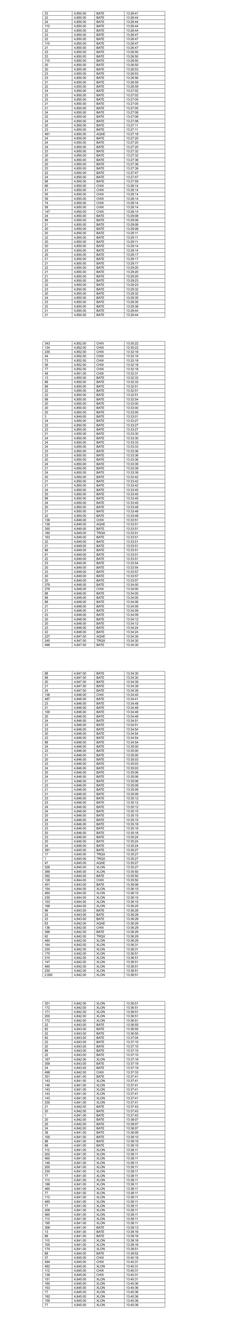 110 4,854.00 BATE 13:09:07 24 4,854.00 BATE 13:09:07 23 4,854.00 BATE 13:09:07 22 4,854.00 BATE 13:09:07 313 4,856.00 CHIX 13:12:28 77 4,856.00 CHIX 13:12:28 55 4,856.00 CHIX 13:12:28 24 4,856.00 CHIX 13:12:28 139 4,856.00 CHIX 13:12:28 114 4,854.00 CHIX 13:13:03 63 4,855.00 TRQX 13:13:23 19 4,855.00 TRQX 13:13:23 20 4,855.00 TRQX 13:13:23 61 4,855.00 TRQX 13:13:23 63 4,855.00 TRQX 13:13:23 19 4,855.00 TRQX 13:13:23 20 4,855.00 TRQX 13:13:23 22 4,855.00 TRQX 13:13:23 63 4,855.00 TRQX 13:13:23 63 4,855.00 TRQX 13:13:23 21 4,855.00 TRQX 13:13:23 3 4,855.00 TRQX 13:13:23 63 4,855.00 TRQX 13:13:23 63 4,855.00 TRQX 13:13:23 21 4,855.00 TRQX 13:13:23 313 4,858.00 CHIX 13:15:01 56 4,858.00 CHIX 13:15:01 82 4,858.00 CHIX 13:15:01 37 4,858.00 CHIX 13:15:01 19 4,856.00 CHIX 13:16:45 32 4,855.00 CHIX 13:16:45 248 4,855.00 CHIX 13:16:46 270 4,853.00 TRQX 13:16:48 195 4,853.00 AQXE 13:16:48 130 4,853.00 BATE 13:16:48 257 4,851.00 BATE 13:16:53 74 4,850.00 AQXE 13:16:56 17 4,851.00 TRQX 13:17:33 19 4,851.00 TRQX 13:17:33 63 4,851.00 TRQX 13:17:33 92 4,851.00 TRQX 13:17:33 100 4,851.00 TRQX 13:17:33 17 4,851.00 TRQX 13:17:33 63 4,851.00 TRQX 13:17:33 19 4,851.00 TRQX 13:17:33 22 4,851.00 TRQX 13:17:33 63 4,851.00 TRQX 13:17:33 20 4,851.00 TRQX 13:17:33 110 4,851.00 BATE 13:17:33 23 4,851.00 BATE 13:17:33 21 4,851.00 BATE 13:17:33 110 4,851.00 BATE 13:17:33 22 4,851.00 BATE 13:17:33 110 4,851.00 BATE 13:17:33 88 4,851.00 BATE 13:17:33 110 4,851.00 BATE 13:17:33 22 4,851.00 BATE 13:17:33 109 4,851.00 BATE 13:17:33 374 4,851.00 AQXE 13:17:38 81 4,851.00 AQXE 13:17:38 83 4,851.00 AQXE 13:17:38 79 4,851.00 AQXE 13:17:38 85 4,851.00 AQXE 13:17:38 2 4,851.00 BATE 13:18:04 21 4,851.00 BATE 13:18:10 20 4,851.00 BATE 13:18:10 110 4,851.00 BATE 13:18:10 63 4,851.00 TRQX 13:18:28 17 4,851.00 TRQX 13:18:28 21 4,851.00 TRQX 13:18:28 100 4,851.00 TRQX 13:18:28 17 4,851.00 TRQX 13:18:28 17 4,851.00 TRQX 13:19:01 18 4,851.00 TRQX 13:19:04 18 4,851.00 TRQX 13:19:04 19 4,851.00 TRQX 13:19:04 76 4,851.00 CHIX 13:19:05 313 4,851.00 CHIX 13:19:05 48 4,851.00 CHIX 13:19:05 109 4,851.00 AQXE 13:19:10 80 4,851.00 AQXE 13:19:10 87 4,851.00 AQXE 13:19:10 20 4,851.00 TRQX 13:19:32 61 4,851.00 TRQX 13:19:32 17 4,851.00 TRQX 13:19:32 18 4,851.00 TRQX 13:19:32 84 4,851.00 AQXE 13:19:43 82 4,851.00 AQXE 13:19:46 86 4,851.00 AQXE 13:19:49 89 4,851.00 AQXE 13:19:49 85 4,851.00 AQXE 13:19:49 446 4,851.00 TRQX 13:20:26 110 4,851.00 BATE 13:20:28 24 4,851.00 BATE 13:20:28 20 4,851.00 BATE 13:20:28 110 4,851.00 BATE 13:20:28 20 4,851.00 BATE 13:20:28 110 4,851.00 BATE 13:20:28 110 4,851.00 BATE 13:20:28 20 4,851.00 BATE 13:20:28 110 4,851.00 BATE 13:20:28 110 4,851.00 BATE 13:20:28 21 4,851.00 BATE 13:20:28 110 4,851.00 BATE 13:20:28 110 4,851.00 BATE 13:20:28 22 4,851.00 BATE 13:20:28 82 4,851.00 BATE 13:20:28 500 4,851.00 AQXE 13:20:29 84 4,851.00 AQXE 13:20:29 116 4,851.00 AQXE 13:20:29 51 4,851.00 AQXE 13:20:29 63 4,851.00 TRQX 13:20:30 21 4,851.00 TRQX 13:20:30 18 4,851.00 TRQX 13:20:30 63 4,851.00 TRQX 13:20:30 17 4,851.00 TRQX 13:20:30 63 4,851.00 TRQX 13:20:30 21 4,851.00 TRQX 13:20:30 18 4,851.00 TRQX 13:20:30 20 4,851.00 TRQX 13:21:00 63 4,851.00 TRQX 13:21:00 20 4,851.00 TRQX 13:21:00 18 4,851.00 TRQX 13:21:00 63 4,851.00 TRQX 13:21:00 61 4,851.00 TRQX 13:21:00 41 4,851.00 TRQX 13:21:31 22 4,851.00 TRQX 13:21:31 63 4,851.00 TRQX 13:21:31 17 4,851.00 TRQX 13:21:31 19 4,851.00 TRQX 13:21:31 18 4,851.00 TRQX 13:21:31 24 4,851.00 TRQX 13:21:31 18 4,851.00 TRQX 13:21:31 4 4,851.00 AQXE 13:21:42 127 4,851.00 CHIX 13:21:43 21 4,851.00 CHIX 13:21:43 235 4,851.00 CHIX 13:21:43 184 4,851.00 CHIX 13:21:51 374 4,851.00 AQXE 13:21:54 88 4,851.00 AQXE 13:21:54 118 4,851.00 AQXE 13:21:54 82 4,851.00 AQXE 13:21:54 32 4,851.00 AQXE 13:21:54 51 4,851.00 AQXE 13:21:54 50 4,851.00 TRQX 13:22:01 20 4,851.00 TRQX 13:22:01 18 4,851.00 TRQX 13:22:01 17 4,851.00 TRQX 13:22:04 18 4,851.00 TRQX 13:22:04 27 4,851.00 TRQX 13:22:04 19 4,851.00 TRQX 13:22:04 17 4,851.00 TRQX 13:22:08 21 4,851.00 TRQX 13:22:08 17 4,851.00 TRQX 13:22:08 28 4,851.00 TRQX 13:22:32 19 4,851.00 TRQX 13:22:32 20 4,851.00 TRQX 13:22:32 17 4,851.00 TRQX 13:22:32 21 4,851.00 TRQX 13:22:35 21 4,851.00 TRQX 13:22:35 20 4,851.00 TRQX 13:22:35 17 4,851.00 TRQX 13:22:38 21 4,851.00 TRQX 13:22:38 19 4,851.00 TRQX 13:22:41 19 4,851.00 TRQX 13:22:41 108 4,851.00 AQXE 13:22:43 88 4,851.00 AQXE 13:22:43 458 4,851.00 AQXE 13:22:43 23 4,851.00 BATE 13:22:58 23 4,851.00 BATE 13:22:58 18 4,851.00 TRQX 13:23:02 17 4,851.00 TRQX 13:23:02 19 4,851.00 TRQX 13:23:02 63 4,851.00 TRQX 13:23:02 21 4,851.00 TRQX 13:23:02 21 4,851.00 BATE 13:23:04 23 4,851.00 BATE 13:23:04 20 4,851.00 BATE 13:23:04 19 4,851.00 TRQX 13:23:05 20 4,851.00 TRQX 13:23:05 63 4,851.00 TRQX 13:23:05 20 4,851.00 TRQX 13:23:05 23 4,851.00 BATE 13:23:07 22 4,851.00 BATE 13:23:07 24 4,851.00 BATE 13:23:10 24 4,851.00 BATE 13:23:10 110 4,851.00 BATE 13:23:10 24 4,851.00 BATE 13:23:10 110 4,851.00 BATE 13:23:13 22 4,851.00 BATE 13:23:13 21 4,851.00 BATE 13:23:13 110 4,851.00 BATE 13:23:13 22 4,851.00 BATE 13:23:13 110 4,851.00 BATE 13:23:13 20 4,851.00 BATE 13:23:16 23 4,851.00 BATE 13:23:16 24 4,851.00 BATE 13:23:16 22 4,851.00 BATE 13:23:19 22 4,851.00 BATE 13:23:19 23 4,851.00 BATE 13:23:22 22 4,851.00 BATE 13:23:22 526 4,851.00 CHIX 13:24:55 88 4,851.00 BATE 13:24:56 116 4,851.00 AQXE 13:24:56 92 4,851.00 AQXE 13:24:56 84 4,851.00 AQXE 13:24:56 19 4,851.00 TRQX 13:24:57 18 4,851.00 TRQX 13:24:57 21 4,851.00 TRQX 13:24:57 88 4,851.00 AQXE 13:24:59 374 4,851.00 AQXE 13:24:59 111 4,851.00 AQXE 13:24:59 87 4,851.00 AQXE 13:24:59 50 4,851.00 AQXE 13:24:59 17 4,851.00 TRQX 13:25:00 20 4,851.00 TRQX 13:25:00 19 4,851.00 TRQX 13:25:06 21 4,851.00 TRQX 13:25:06 18 4,851.00 TRQX 13:25:09 18 4,851.00 TRQX 13:25:09 2 4,851.00 BATE 13:25:11 20 4,851.00 BATE 13:25:14 24 4,851.00 BATE 13:25:14 20 4,851.00 BATE 13:25:17 21 4,851.00 BATE 13:25:17 17 4,851.00 TRQX 13:25:21 21 4,851.00 TRQX 13:25:21 18 4,851.00 TRQX 13:25:27 19 4,851.00 TRQX 13:25:27 19 