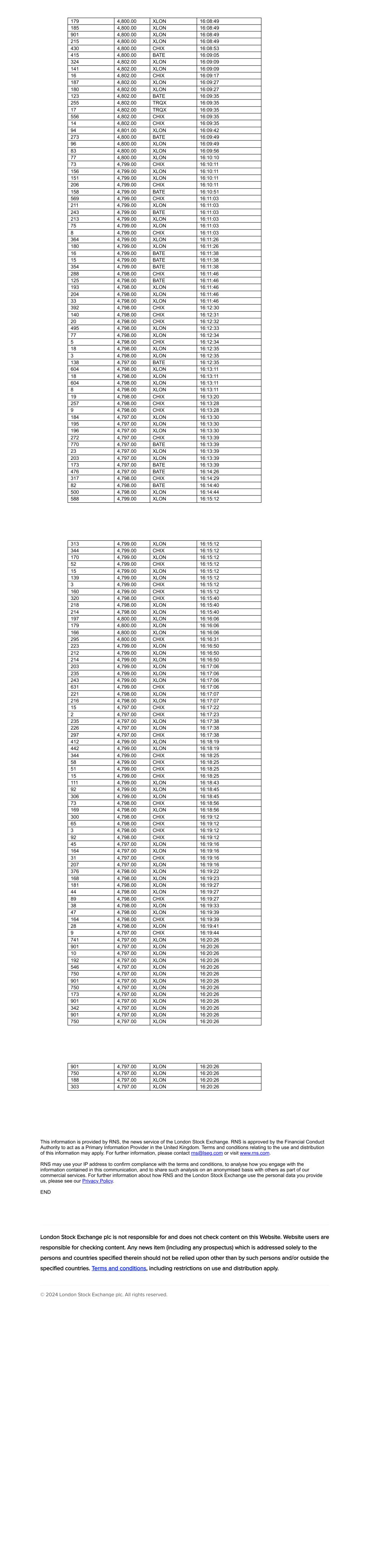 179 4,800.00 XLON 16:08:49 185 4,800.00 XLON 16:08:49 901 4,800.00 XLON 16:08:49 215 4,800.00 XLON 16:08:49 430 4,800.00 CHIX 16:08:53 415 4,800.00 BATE 16:09:05 324 4,802.00 XLON 16:09:09 141 4,802.00 XLON 16:09:09 16 4,802.00 CHIX 16:09:17 187 4,802.00 XLON 16:09:27 180 4,802.00 XLON 16:09:27 123 4,802.00 BATE 16:09:35 255 4,802.00 TRQX 16:09:35 17 4,802.00 TRQX 16:09:35 556 4,802.00 CHIX 16:09:35 14 4,802.00 CHIX 16:09:35 94 4,801.00 XLON 16:09:42 273 4,800.00 BATE 16:09:49 96 4,800.00 XLON 16:09:49 83 4,800.00 XLON 16:09:56 77 4,800.00 XLON 16:10:10 73 4,799.00 CHIX 16:10:11 156 4,799.00 XLON 16:10:11 151 4,799.00 XLON 16:10:11 206 4,799.00 CHIX 16:10:11 158 4,799.00 BATE 16:10:51 569 4,799.00 CHIX 16:11:03 211 4,799.00 XLON 16:11:03 243 4,799.00 BATE 16:11:03 213 4,799.00 XLON 16:11:03 75 4,799.00 XLON 16:11:03 8 4,799.00 CHIX 16:11:03 364 4,799.00 XLON 16:11:26 180 4,799.00 XLON 16:11:26 16 4,799.00 BATE 16:11:38 15 4,799.00 BATE 16:11:38 354 4,799.00 BATE 16:11:38 288 4,798.00 CHIX 16:11:46 125 4,798.00 BATE 16:11:46 193 4,798.00 XLON 16:11:46 204 4,798.00 XLON 16:11:46 33 4,798.00 XLON 16:11:46 392 4,798.00 CHIX 16:12:30 140 4,798.00 CHIX 16:12:31 20 4,798.00 CHIX 16:12:32 495 4,798.00 XLON 16:12:33 77 4,798.00 XLON 16:12:34 5 4,798.00 CHIX 16:12:34 18 4,798.00 XLON 16:12:35 3 4,798.00 XLON 16:12:35 138 4,797.00 BATE 16:12:35 604 4,798.00 XLON 16:13:11 18 4,798.00 XLON 16:13:11 604 4,798.00 XLON 16:13:11 8 4,798.00 XLON 16:13:11 19 4,798.00 CHIX 16:13:20 257 4,798.00 CHIX 16:13:28 9 4,798.00 CHIX 16:13:28 184 4,797.00 XLON 16:13:30 195 4,797.00 XLON 16:13:30 196 4,797.00 XLON 16:13:30 272 4,797.00 CHIX 16:13:39 770 4,797.00 BATE 16:13:39 23 4,797.00 XLON 16:13:39 203 4,797.00 XLON 16:13:39 173 4,797.00 BATE 16:13:39 476 4,797.00 BATE 16:14:26 317 4,798.00 CHIX 16:14:29 82 4,798.00 BATE 16:14:40 500 4,798.00 XLON 16:14:44 588 4,799.00 XLON 16:15:12 313 4,799.00 XLON 16:15:12 344 4,799.00 CHIX 16:15:12 170 4,799.00 XLON 16:15:12 52 4,799.00 CHIX 16:15:12 15 4,799.00 XLON 16:15:12 139 4,799.00 XLON 16:15:12 3 4,799.00 CHIX 16:15:12 160 4,799.00 CHIX 16:15:12 320 4,798.00 CHIX 16:15:40 218 4,798.00 XLON 16:15:40 214 4,798.00 XLON 16:15:40 197 4,800.00 XLON 16:16:06 179 4,800.00 XLON 16:16:06 166 4,800.00 XLON 16:16:06 295 4,800.00 CHIX 16:16:31 223 4,799.00 XLON 16:16:50 212 4,799.00 XLON 16:16:50 214 4,799.00 XLON 16:16:50 203 4,799.00 XLON 16:17:06 235 4,799.00 XLON 16:17:06 243 4,799.00 XLON 16:17:06 631 4,799.00 CHIX 16:17:06 221 4,798.00 XLON 16:17:07 216 4,798.00 XLON 16:17:07 15 4,797.00 CHIX 16:17:22 2 4,797.00 CHIX 16:17:23 235 4,797.00 XLON 16:17:38 226 4,797.00 XLON 16:17:38 297 4,797.00 CHIX 16:17:38 412 4,799.00 XLON 16:18:19 442 4,799.00 XLON 16:18:19 344 4,799.00 CHIX 16:18:25 58 4,799.00 CHIX 16:18:25 51 4,799.00 CHIX 16:18:25 15 4,799.00 CHIX 16:18:25 111 4,799.00 XLON 16:18:43 92 4,799.00 XLON 16:18:45 306 4,799.00 XLON 16:18:45 73 4,798.00 CHIX 16:18:56 169 4,798.00 XLON 16:18:56 300 4,798.00 CHIX 16:19:12 65 4,798.00 CHIX 16:19:12 3 4,798.00 CHIX 16:19:12 92 4,798.00 CHIX 16:19:12 45 4,797.00 XLON 16:19:16 164 4,797.00 XLON 16:19:16 31 4,797.00 CHIX 16:19:16 207 4,797.00 XLON 16:19:16 376 4,798.00 XLON 16:19:22 168 4,798.00 XLON 16:19:23 181 4,798.00 XLON 16:19:27 44 4,798.00 XLON 16:19:27 89 4,798.00 CHIX 16:19:27 38 4,798.00 XLON 16:19:33 47 4,798.00 XLON 16:19:39 164 4,798.00 CHIX 16:19:39 28 4,798.00 XLON 16:19:41 9 4,797.00 CHIX 16:19:44 741 4,797.00 XLON 16:20:26 901 4,797.00 XLON 16:20:26 10 4,797.00 XLON 16:20:26 192 4,797.00 XLON 16:20:26 546 4,797.00 XLON 16:20:26 750 4,797.00 XLON 16:20:26 901 4,797.00 XLON 16:20:26 750 4,797.00 XLON 16:20:26 173 4,797.00 XLON 16:20:26 901 4,797.00 XLON 16:20:26 342 4,797.00 XLON 16:20:26 901 4,797.00 XLON 16:20:26 750 4,797.00 XLON 16:20:26 901 4,797.00 XLON 16:20:26 750 4,797.00 XLON 16:20:26 188 4,797.00 XLON 16:20:26 303 4,797.00 XLON 16:20:26 This information is provided by RNS, the news service of the London Stock Exchange. RNS is approved by the Financial Conduct Authority to act as a Primary Information Provider in the United Kingdom. Terms and conditions relating to the use and distribution of this information may apply. For further information, please contact rns@lseg.com or visit www.rns.com. RNS may use your IP address to confirm compliance with the terms and conditions, to analyse how you engage with the information contained in this communication, and to share such analysis on an anonymised basis with others as part of our commercial services. For further information about how RNS and the London Stock Exchange use the personal data you provide us, please see our Privacy Policy. END London Stock Exchange plc is not responsible for and does not check content on this Website. Website users are responsible for checking content. Any news item (including any prospectus) which is addressed solely to the persons and countries specified therein should not be relied upon other than by such persons and/or outside the specified countries. Terms and conditions, including restrictions on use and distribution apply. © 2024 London Stock Exchange plc. All rights reserved.