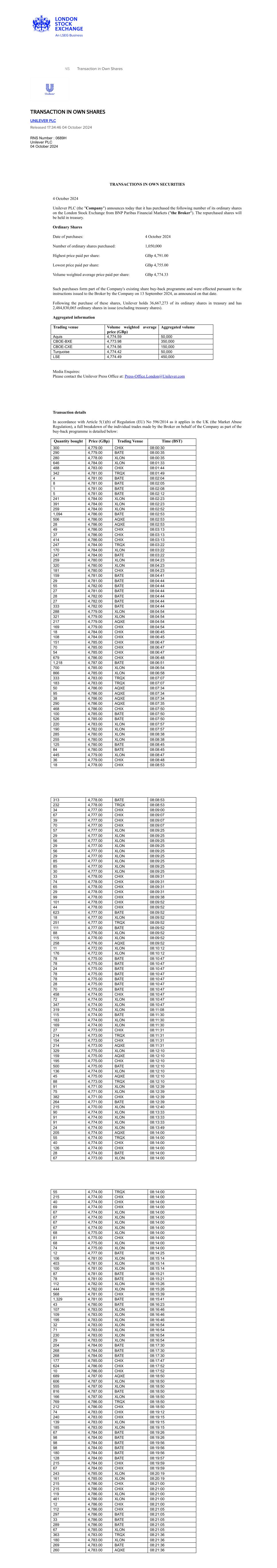 RNS Transaction in Own Shares TRANSACTION IN OWN SHARES UNILEVER PLC Released 17:34:46 04 October 2024 RNS Number : 0689H Unilever PLC 04 October 2024 TRANSACTIONS IN OWN SECURITIES 4 October 2024 Unilever PLC (the "Company") announces today that it has purchased the following number of its ordinary shares on the London Stock Exchange from BNP Paribas Financial Markets ("the Broker"). The repurchased shares will be held in treasury. Ordinary Shares Date of purchases: 4 October 2024 Number of ordinary shares purchased: 1,050,000 Highest price paid per share: GBp 4,791.00 Lowest price paid per share: GBp 4,755.00 Volume weighted average price paid per share: GBp 4,774.33 Such purchases form part of the Company's existing share buy-back programme and were effected pursuant to the instructions issued to the Broker by the Company on 13 September 2024, as announced on that date. Following the purchase of these shares, Unilever holds 36,667,273 of its ordinary shares in treasury and has 2,484,830,065 ordinary shares in issue (excluding treasury shares). Aggregated information Trading venue Volume weighted average price (GBp) Aggregated volume Aquis 4,774.59 50,000 CBOE-BXE 4,773.98 350,000 CBOE-CXE 4,774.56 150,000 Turquoise 4,774.42 50,000 LSE 4,774.49 450,000 Media Enquires: Please contact the Unilever Press Office at: Press-Office.London@Unilever.com Transaction details In accordance with Article 5(1)(b) of Regulation (EU) No 596/2014 as it applies in the UK (the Market Abuse Regulation), a full breakdown of the individual trades made by the Broker on behalf of the Company as part of the buy-back programme is detailed below: Quantity bought Price (GBp) Trading Venue Time (BST) 300 4,779.00 CHIX 08:00:30 290 4,779.00 BATE 08:00:35 280 4,778.00 XLON 08:00:35 646 4,784.00 XLON 08:01:33 488 4,783.00 CHIX 08:01:44 342 4,781.00 TRQX 08:01:49 4 4,781.00 BATE 08:02:04 8 4,781.00 BATE 08:02:05 1 4,781.00 BATE 08:02:08 5 4,781.00 BATE 08:02:12 241 4,784.00 XLON 08:02:23 391 4,784.00 XLON 08:02:23 259 4,784.00 XLON 08:02:52 1,094 4,786.00 BATE 08:02:53 506 4,786.00 AQXE 08:02:53 28 4,786.00 AQXE 08:02:53 49 4,786.00 CHIX 08:03:13 37 4,786.00 CHIX 08:03:13 414 4,786.00 CHIX 08:03:13 247 4,784.00 TRQX 08:03:22 170 4,784.00 XLON 08:03:22 247 4,784.00 BATE 08:03:22 259 4,780.00 XLON 08:04:23 320 4,780.00 XLON 08:04:23 181 4,780.00 CHIX 08:04:23 159 4,781.00 BATE 08:04:41 29 4,781.00 BATE 08:04:44 55 4,782.00 BATE 08:04:44 27 4,781.00 BATE 08:04:44 28 4,782.00 BATE 08:04:44 27 4,782.00 BATE 08:04:44 333 4,782.00 BATE 08:04:44 288 4,779.00 XLON 08:04:54 321 4,779.00 XLON 08:04:54 217 4,779.00 AQXE 08:04:54 169 4,779.00 CHIX 08:04:54 18 4,784.00 CHIX 08:06:45 108 4,784.00 CHIX 08:06:45 151 4,785.00 CHIX 08:06:47 70 4,785.00 CHIX 08:06:47 54 4,785.00 CHIX 08:06:47 679 4,786.00 CHIX 08:06:48 1,218 4,787.00 BATE 08:06:51 700 4,785.00 XLON 08:06:54 866 4,785.00 XLON 08:06:58 333 4,783.00 TRQX 08:07:07 183 4,783.00 TRQX 08:07:07 50 4,786.00 AQXE 08:07:34 95 4,786.00 AQXE 08:07:34 38 4,786.00 AQXE 08:07:34 290 4,786.00 AQXE 08:07:35 468 4,786.00 CHIX 08:07:50 100 4,785.00 BATE 08:07:50 526 4,785.00 BATE 08:07:50 220 4,783.00 XLON 08:07:57 190 4,782.00 XLON 08:07:57 285 4,780.00 XLON 08:08:38 255 4,780.00 XLON 08:08:38 125 4,780.00 BATE 08:08:45 84 4,780.00 BATE 08:08:45 445 4,779.00 XLON 08:08:47 36 4,779.00 CHIX 08:08:48 18 4,778.00 CHIX 08:08:53 313 4,778.00 BATE 08:08:53 232 4,778.00 TRQX 08:08:53 34 4,777.00 CHIX 08:09:00 67 4,777.00 CHIX 08:09:07 39 4,777.00 CHIX 08:09:07 70 4,777.00 CHIX 08:09:07 57 4,777.00 XLON 08:09:25 29 4,777.00 XLON 08:09:25 56 4,777.00 XLON 08:09:25 29 4,777.00 XLON 08:09:25 56 4,777.00 XLON 08:09:25 29 4,777.00 XLON 08:09:25 85 4,777.00 XLON 08:09:25 85 4,777.00 XLON 08:09:25 30 4,777.00 XLON 08:09:25 33 4,778.00 CHIX 08:09:31 74 4,778.00 CHIX 08:09:31 65 4,778.00 CHIX 08:09:31 29 4,778.00 CHIX 08:09:31 99 4,778.00 CHIX 08:09:38 101 4,778.00 CHIX 08:09:52 44 4,778.00 CHIX 08:09:52 623 4,777.00 BATE 08:09:52 18 4,777.00 XLON 08:09:52 251 4,777.00 TRQX 08:09:52 111 4,777.00 BATE 08:09:52 88 4,776.00 XLON 08:09:52 115 4,776.00 XLON 08:09:52 258 4,776.00 AQXE 08:09:52 11 4,772.00 XLON 08:10:12 176 4,772.00 XLON 08:10:12 78 4,775.00 BATE 08:10:47 78 4,775.00 BATE 08:10:47 24 4,775.00 BATE 08:10:47 78 4,775.00 BATE 08:10:47 78 4,775.00 BATE 08:10:47 28 4,775.00 BATE 08:10:47 70 4,775.00 BATE 08:10:47 458 4,774.00 CHIX 08:10:47 72 4,774.00 XLON 08:10:47 347 4,774.00 XLON 08:10:47 319 4,774.00 XLON 08:11:08 115 4,774.00 BATE 08:11:30 183 4,774.00 XLON 08:11:30 169 4,774.00 XLON 08:11:30 27 4,773.00 CHIX 08:11:31 214 4,773.00 TRQX 08:11:31 154 4,773.00 CHIX 08:11:31 214 4,773.00 AQXE 08:11:31 329 4,775.00 XLON 08:12:10 159 4,775.00 AQXE 08:12:10 195 4,775.00 CHIX 08:12:10 500 4,775.00 BATE 08:12:10 136 4,774.00 XLON 08:12:10 45 4,775.00 AQXE 08:12:10 88 4,773.00 TRQX 08:12:10 91 4,771.00 XLON 08:12:39 75 4,771.00 XLON 08:12:39 382 4,771.00 CHIX 08:12:39 264 4,771.00 BATE 08:12:39 215 4,770.00 XLON 08:12:40 90 4,774.00 XLON 08:13:33 91 4,774.00 XLON 08:13:33 91 4,774.00 XLON 08:13:33 24 4,774.00 XLON 08:13:49 205 4,774.00 AQXE 08:14:00 55 4,774.00 TRQX 08:14:00 40 4,774.00 CHIX 08:14:00 126 4,774.00 CHIX 08:14:00 28 4,774.00 BATE 08:14:00 67 4,773.00 XLON 08:14:00 55 4,774.00 TRQX 08:14:00 215 4,774.00 CHIX 08:14:00 40 4,774.00 CHIX 08:14:00 69 4,774.00 CHIX 08:14:00 67 4,774.00 XLON 08:14:00 67 4,774.00 XLON 08:14:00 67 4,774.00 XLON 08:14:00 67 4,774.00 XLON 08:14:00 68 4,775.00 XLON 08:14:00 81 4,775.00 CHIX 08:14:00 68 4,775.00 XLON 08:14:00 74 4,775.00 XLON 08:14:00 12 4,777.00 BATE 08:14:25 106 4,781.00 XLON 08:15:14 403 4,781.00 XLON 08:15:14 100 4,781.00 XLON 08:15:14 87 4,781.00 BATE 08:15:21 78 4,781.00 BATE 08:15:21 112 4,782.00 XLON 08:15:26 444 4,782.00 XLON 08:15:26 568 4,781.00 CHIX 08:15:39 1,329 4,781.00 BATE 08:15:41 43 4,780.00 BATE 08:16:23 107 4,783.00 XLON 08:16:46 109 4,783.00 XLON 08:16:46 195 4,783.00 XLON 08:16:46 32 4,783.00 XLON 08:16:54 71 4,783.00 XLON 08:16:54 230