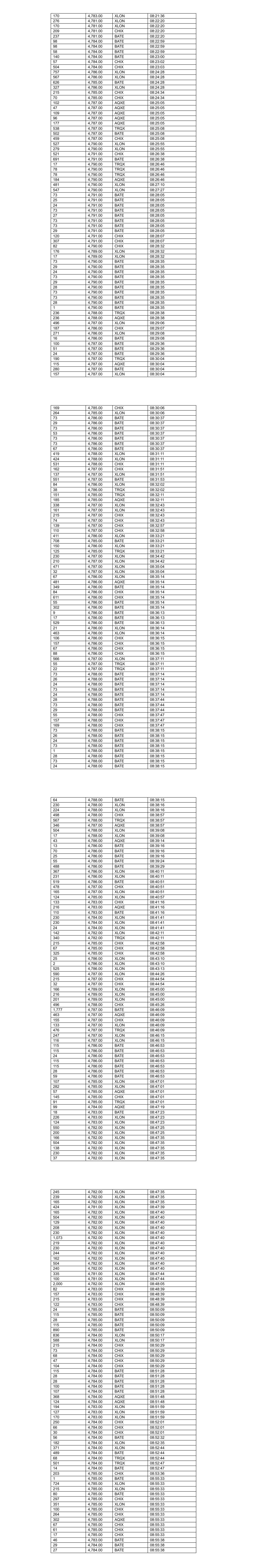 170 4,783.00 XLON 08:21:36 276 4,781.00 XLON 08:22:20 170 4,781.00 XLON 08:22:20 209 4,781.00 CHIX 08:22:20 237 4,781.00 BATE 08:22:20 98 4,784.00 BATE 08:22:59 98 4,784.00 BATE 08:22:59 58 4,784.00 BATE 08:22:59 140 4,784.00 BATE 08:23:00 57 4,784.00 CHIX 08:23:02 504 4,784.00 CHIX 08:23:03 757 4,786.00 XLON 08:24:28 567 4,786.00 XLON 08:24:28 626 4,785.00 BATE 08:24:28 327 4,786.00 XLON 08:24:28 215 4,785.00 CHIX 08:24:34 70 4,785.00 CHIX 08:24:34 102 4,787.00 AQXE 08:25:05 47 4,787.00 AQXE 08:25:05 109 4,787.00 AQXE 08:25:05 96 4,787.00 AQXE 08:25:05 177 4,787.00 AQXE 08:25:05 538 4,787.00 TRQX 08:25:08 502 4,787.00 BATE 08:25:08 459 4,787.00 CHIX 08:25:08 527 4,790.00 XLON 08:25:55 279 4,790.00 XLON 08:25:55 521 4,791.00 CHIX 08:26:38 691 4,791.00 BATE 08:26:38 17 4,790.00 TRQX 08:26:46 78 4,790.00 TRQX 08:26:46 78 4,790.00 TRQX 08:26:46 184 4,790.00 AQXE 08:26:46 481 4,790.00 XLON 08:27:10 547 4,790.00 XLON 08:27:27 73 4,791.00 BATE 08:28:05 25 4,791.00 BATE 08:28:05 24 4,791.00 BATE 08:28:05 73 4,791.00 BATE 08:28:05 27 4,791.00 BATE 08:28:05 73 4,791.00 BATE 08:28:05 73 4,791.00 BATE 08:28:05 29 4,791.00 BATE 08:28:05 120 4,791.00 CHIX 08:28:07 307 4,791.00 CHIX 08:28:07 82 4,790.00 CHIX 08:28:32 176 4,789.00 XLON 08:28:32 17 4,789.00 XLON 08:28:32 73 4,790.00 BATE 08:28:35 29 4,790.00 BATE 08:28:35 24 4,790.00 BATE 08:28:35 73 4,790.00 BATE 08:28:35 29 4,790.00 BATE 08:28:35 28 4,790.00 BATE 08:28:35 73 4,790.00 BATE 08:28:35 73 4,790.00 BATE 08:28:35 28 4,790.00 BATE 08:28:35 1 4,790.00 BATE 08:28:35 236 4,788.00 TRQX 08:28:38 236 4,788.00 AQXE 08:28:38 496 4,787.00 XLON 08:29:06 187 4,786.00 CHIX 08:29:07 271 4,786.00 XLON 08:29:08 16 4,786.00 BATE 08:29:08 100 4,787.00 BATE 08:29:36 51 4,787.00 BATE 08:29:36 24 4,787.00 BATE 08:29:36 190 4,787.00 TRQX 08:30:04 115 4,787.00 AQXE 08:30:04 280 4,787.00 BATE 08:30:04 157 4,787.00 XLON 08:30:04 169 4,785.00 CHIX 08:30:06 264 4,785.00 XLON 08:30:06 73 4,786.00 BATE 08:30:37 29 4,786.00 BATE 08:30:37 73 4,786.00 BATE 08:30:37 53 4,786.00 BATE 08:30:37 73 4,786.00 BATE 08:30:37 73 4,786.00 BATE 08:30:37 67 4,786.00 BATE 08:30:37 419 4,788.00 XLON 08:31:11 424 4,788.00 XLON 08:31:11 531 4,788.00 CHIX 08:31:11 162 4,787.00 CHIX 08:31:51 137 4,787.00 XLON 08:31:51 551 4,787.00 BATE 08:31:53 84 4,786.00 XLON 08:32:02 38 4,786.00 TRQX 08:32:02 151 4,785.00 TRQX 08:32:11 185 4,785.00 AQXE 08:32:11 338 4,787.00 XLON 08:32:43 161 4,787.00 XLON 08:32:43 215 4,787.00 CHIX 08:32:43 74 4,787.00 CHIX 08:32:43 139 4,787.00 CHIX 08:32:57 110 4,787.00 CHIX 08:32:58 411 4,786.00 XLON 08:33:21 708 4,785.00 BATE 08:33:21 150 4,786.00 XLON 08:33:21 125 4,785.00 TRQX 08:33:21 230 4,787.00 XLON 08:34:42 210 4,787.00 XLON 08:34:42 471 4,787.00 XLON 08:35:04 32 4,787.00 XLON 08:35:04 67 4,786.00 XLON 08:35:14 481 4,786.00 AQXE 08:35:14 349 4,786.00 BATE 08:35:14 84 4,786.00 CHIX 08:35:14 611 4,786.00 CHIX 08:35:14 55 4,786.00 BATE 08:35:14 302 4,786.00 BATE 08:35:14 9 4,786.00 BATE 08:36:13 17 4,786.00 BATE 08:36:13 529 4,786.00 BATE 08:36:13 21 4,786.00 XLON 08:36:14 463 4,786.00 XLON 08:36:14 106 4,786.00 CHIX 08:36:15 157 4,786.00 CHIX 08:36:15 67 4,786.00 CHIX 08:36:15 88 4,786.00 CHIX 08:36:15 566 4,787.00 XLON 08:37:11 55 4,787.00 TRQX 08:37:11 22 4,787.00 TRQX 08:37:11 73 4,788.00 BATE 08:37:14 26 4,788.00 BATE 08:37:14 24 4,788.00 BATE 08:37:14 73 4,788.00 BATE 08:37:14 24 4,788.00 BATE 08:37:14 28 4,788.00 BATE 08:37:44 73 4,788.00 BATE 08:37:44 29 4,788.00 BATE 08:37:44 55 4,788.00 CHIX 08:37:47 157 4,788.00 CHIX 08:37:47 169 4,788.00 CHIX 08:37:47 73 4,788.00 BATE 08:38:15 26 4,788.00 BATE 08:38:15 24 4,788.00 BATE 08:38:15 73 4,788.00 BATE 08:38:15 1 4,788.00 BATE 08:38:15 28 4,788.00 BATE 08:38:15 73 4,788.00 BATE 08:38:15 24 4,788.00 BATE 08:38:15 64 4,788.00 BATE 08:38:15 230 4,788.00 XLON 08:38:16 224 4,788.00 XLON 08:38:16 498 4,788.00 CHIX 08:38:57 567 4,788.00 TRQX 08:38:57 346 4,787.00 AQXE 08:38:57 504 4,788.00 XLON 08:39:08 17 4,788.00 XLON 08:39:08 43 4,786.00 AQXE 08:39:14 13 4,786.00 BATE 08:39:16 70 4,786.00 BATE 08:39:16 25 4,786.00 BATE 08:39:16 55 4,786.00 BATE 08:39:24 488 4,786.00 BATE 08:39:29 367 4,786.00 XLON 08:40:11 231 4,786.00 XLON 08:40:11 519 4,786.00 BATE 08:40:51 478 4,787.00 CHIX 08:40:51 165 4,787.00 XLON 08:40:51 124 4,785.00 XLON 08:40:57 133 4,783.00 CHIX 08:41:16 216 4,783.00 AQXE 08:41:16 110 4,783.00 BATE 08:41:16 230 4,784.00 XLON 08:41:41 230 4,784.00 XLON 08:41:41 24 4,784.00 XLON 08:41:41 142 4,782.00 XLON 08:42:11 340 4,782.00 TRQX 08:42:11 215 4,785.00 CHIX 08:42:58 67 4,785.00 CHIX 08:42:58 325 4,785.00 CHIX 08:42:58 25 4,786.00 XLON 08:43:10 2 4,786.00 XLON 08:43:10 525 4,786.00 XLON 08:43:13 590 4,787.00 XLON 08:44:26 215 4,787.00 CHIX 08:44:54 32 4,787.00 CHIX 08:44:54 166 4,789.00 XLON 08:45:00 216 4,789.00 XLON 08:45:00 201 4,789.00 XLON 08:45:00 496 4,788.00 CHIX 08:45:26 1,777 4,787.00 BATE 08:46:09 463 4,787.00 AQXE 08:46:09 155 4,787.00 CHIX 08:46:09 133 4,787.00 XLON 08:46:09 476 4,787.00 TRQX 08:46:09 247 4,787.00 XLON 08:46:15 116 4,787.00 XLON 08:46:15 115 4,786.00 BATE 08:46:53 115 4,786.00 BATE 08:46:53 24 4,786.00 BATE 08:46:53 115 4,786.00 BATE 08:46:53 115 4,786.00 BATE 08:46:53 28 4,786.00 BATE 08:46:53 59 4,786.00 BATE 08:46:53 107 4,785.00 XLON 08:47:01 282 4,785.00 XLON 08:47:01 57 4,785.00 AQXE 08:47:01 145 4,785.00 CHIX 08:47:01 91 4,785.00 TRQX 08:47:01 99 4,784.00 AQXE 08:47:19 18 4,783.00 BATE 08:47:23 226 4,783.00 XLON 08:47:23 124 4,783.00 XLON 08:47:23 550 4,782.00 XLON 08:47:25 200 4,782.00 XLON 08:47:25 166 4,782.00 XLON 08:47:35 504 4,782.00 XLON 08:47:35 138 4,782.00 XLON 08:47:35 230 4,782.00 XLON 08:47:35 37 4,782.00 XLON 08:47:35 245 4,782.00 XLON 08:47:35 239 4,782.00 XLON 08:47:35 165 4,782.00 XLON 08:47:35 424 4,781.00 XLON 08:47:39 165 4,782.00 XLON 08:47:40 504 4,782.00 XLON 08:47:40 129 4,782.00 XLON 08:47:40 208 4,782.00 XLON 08:47:40 230 4,782.00 XLON 08:47:40 1,073 4,782.00 XLON 08:47:40 219 4,782.00 XLON 08:47:40 230 4,782.00 XLON 08:47:40 244 4,782.00 XLO