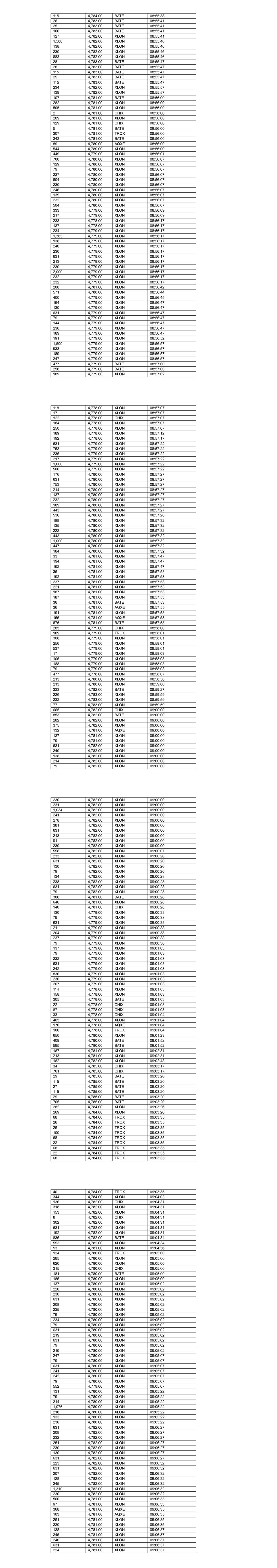 115 4,784.00 BATE 08:55:38 26 4,783.00 BATE 08:55:41 25 4,783.00 BATE 08:55:41 100 4,783.00 BATE 08:55:41 127 4,782.00 XLON 08:55:41 1,500 4,782.00 XLON 08:55:46 138 4,782.00 XLON 08:55:46 230 4,782.00 XLON 08:55:46 883 4,782.00 XLON 08:55:46 28 4,783.00 BATE 08:55:47 28 4,783.00 BATE 08:55:47 115 4,783.00 BATE 08:55:47 25 4,783.00 BATE 08:55:47 115 4,783.00 BATE 08:55:47 234 4,782.00 XLON 08:55:57 139 4,782.00 XLON 08:55:57 107 4,781.00 BATE 08:56:00 282 4,781.00 XLON 08:56:00 505 4,781.00 XLON 08:56:00 2 4,781.00 CHIX 08:56:00 209 4,781.00 XLON 08:56:00 129 4,781.00 CHIX 08:56:00 5 4,781.00 BATE 08:56:00 307 4,781.00 TRQX 08:56:00 343 4,781.00 BATE 08:56:00 89 4,780.00 AQXE 08:56:00 544 4,780.00 XLON 08:56:00 449 4,779.00 XLON 08:56:01 700 4,780.00 XLON 08:56:07 129 4,780.00 XLON 08:56:07 79 4,780.00 XLON 08:56:07 237 4,780.00 XLON 08:56:07 504 4,780.00 XLON 08:56:07 230 4,780.00 XLON 08:56:07 246 4,780.00 XLON 08:56:07 139 4,780.00 XLON 08:56:07 232 4,780.00 XLON 08:56:07 504 4,780.00 XLON 08:56:07 333 4,779.00 XLON 08:56:09 217 4,779.00 XLON 08:56:09 233 4,778.00 XLON 08:56:17 137 4,778.00 XLON 08:56:17 234 4,779.00 XLON 08:56:17 1,363 4,779.00 XLON 08:56:17 138 4,779.00 XLON 08:56:17 240 4,779.00 XLON 08:56:17 230 4,779.00 XLON 08:56:17 631 4,779.00 XLON 08:56:17 213 4,779.00 XLON 08:56:17 230 4,779.00 XLON 08:56:17 2,000 4,779.00 XLON 08:56:17 232 4,779.00 XLON 08:56:17 232 4,779.00 XLON 08:56:17 208 4,781.00 XLON 08:56:42 571 4,780.00 XLON 08:56:44 400 4,779.00 XLON 08:56:45 194 4,779.00 XLON 08:56:47 130 4,779.00 XLON 08:56:47 631 4,779.00 XLON 08:56:47 79 4,779.00 XLON 08:56:47 144 4,779.00 XLON 08:56:47 236 4,779.00 XLON 08:56:47 189 4,779.00 XLON 08:56:47 191 4,779.00 XLON 08:56:52 1,500 4,779.00 XLON 08:56:57 933 4,779.00 XLON 08:56:57 189 4,779.00 XLON 08:56:57 247 4,779.00 XLON 08:56:57 477 4,779.00 BATE 08:57:00 256 4,779.00 BATE 08:57:00 189 4,779.00 XLON 08:57:02 118 4,778.00 XLON 08:57:07 17 4,778.00 XLON 08:57:07 122 4,778.00 CHIX 08:57:07 184 4,778.00 XLON 08:57:07 250 4,778.00 XLON 08:57:07 189 4,778.00 XLON 08:57:12 192 4,778.00 XLON 08:57:17 631 4,779.00 XLON 08:57:22 753 4,779.00 XLON 08:57:22 236 4,779.00 XLON 08:57:22 217 4,779.00 XLON 08:57:22 1,000 4,779.00 XLON 08:57:22 500 4,779.00 XLON 08:57:22 176 4,780.00 XLON 08:57:27 631 4,780.00 XLON 08:57:27 753 4,780.00 XLON 08:57:27 214 4,780.00 XLON 08:57:27 137 4,780.00 XLON 08:57:27 232 4,780.00 XLON 08:57:27 189 4,780.00 XLON 08:57:27 443 4,780.00 XLON 08:57:27 536 4,780.00 XLON 08:57:28 188 4,780.00 XLON 08:57:32 135 4,780.00 XLON 08:57:32 222 4,780.00 XLON 08:57:32 443 4,780.00 XLON 08:57:32 1,000 4,780.00 XLON 08:57:32 447 4,780.00 XLON 08:57:32 184 4,780.00 XLON 08:57:32 33 4,781.00 XLON 08:57:47 194 4,781.00 XLON 08:57:47 192 4,781.00 XLON 08:57:47 36 4,781.00 XLON 08:57:53 192 4,781.00 XLON 08:57:53 237 4,781.00 XLON 08:57:53 221 4,781.00 XLON 08:57:53 187 4,781.00 XLON 08:57:53 187 4,781.00 XLON 08:57:53 36 4,781.00 BATE 08:57:53 36 4,781.00 AQXE 08:57:55 191 4,781.00 XLON 08:57:58 155 4,781.00 AQXE 08:57:58 676 4,781.00 BATE 08:57:58 285 4,779.00 CHIX 08:58:00 189 4,779.00 TRQX 08:58:01 308 4,779.00 XLON 08:58:01 256 4,779.00 XLON 08:58:01 537 4,779.00 XLON 08:58:01 17 4,779.00 XLON 08:58:03 105 4,779.00 XLON 08:58:03 188 4,779.00 XLON 08:58:03 79 4,779.00 XLON 08:58:03 477 4,778.00 XLON 08:58:07 213 4,780.00 XLON 08:58:58 213 4,780.00 XLON 08:59:06 333 4,782.00 BATE 08:59:27 226 4,783.00 XLON 08:59:59 232 4,783.00 XLON 08:59:59 77 4,783.00 XLON 08:59:59 665 4,782.00 CHIX 09:00:00 853 4,782.00 BATE 09:00:00 282 4,782.00 XLON 09:00:00 375 4,782.00 XLON 09:00:00 132 4,781.00 AQXE 09:00:00 137 4,781.00 XLON 09:00:00 79 4,781.00 XLON 09:00:00 631 4,782.00 XLON 09:00:00 240 4,782.00 XLON 09:00:00 138 4,782.00 XLON 09:00:00 214 4,782.00 XLON 09:00:00 79 4,782.00 XLON 09:00:00 230 4,782.00 XLON 09:00:00 231 4,782.00 XLON 09:00:00 1,034 4,782.00 XLON 09:00:00 241 4,782.00 XLON 09:00:00 278 4,782.00 XLON 09:00:00 381 4,782.00 XLON 09:00:00 631 4,782.00 XLON 09:00:00 213 4,782.00 XLON 09:00:00 91 4,782.00 XLON 09:00:00 230 4,782.00 XLON 09:00:00 558 4,782.00 XLON 09:00:07 233 4,782.00 XLON 09:00:20 631 4,782.00 XLON 09:00:20 130 4,782.00 XLON 09:00:20 79 4,782.00 XLON 09:00:20 134 4,782.00 XLON 09:00:28 238 4,782.00 XLON 09:00:28 631 4,782.00 XLON 09:00:28 79 4,782.00 XLON 09:00:28 306 4,781.00 BATE 09:00:28 646 4,781.00 XLON 09:00:28 140 4,781.00 CHIX 09:00:28 130 4,779.00 XLON 09:00:38 79 4,779.00 XLON 09:00:38 631 4,779.00 XLON 09:00:38 211 4,779.00 XLON 09:00:38 204 4,779.00 XLON 09:00:38 237 4,779.00 XLON 09:00:38 79 4,779.00 XLON 09:00:38 137 4,779.00 XLON 09:01:03 79 4,779.00 XLON 09:01:03 232 4,779.00 XLON 09:01:03 631 4,779.00 XLON 09:01:03 242 4,779.00 XLON 09:01:03 830 4,779.00 XLON 09:01:03 230 4,779.00 XLON 09:01:03 207 4,779.00 XLON 09:01:03 114 4,778.00 XLON 09:01:03 158 4,778.00 XLON 09:01:03 305 4,778.00 BATE 09:01:03 22 4,778.00 CHIX 09:01:03 87 4,778.00 CHIX 09:01:03 33 4,778.00 CHIX 09:01:04 465 4,778.00 XLON 09:01:04 170 4,778.00 AQXE 09:01:04 100 4,778.00 TRQX 09:01:04 650 4,780.00 XLON 09:01:23 409 4,780.00 BATE 09:01:52 595 4,780.00 BATE 09:01:52 187 4,781.00 XLON 09:02:31 213 4,781.00 XLON 09:02:31 182 4,782.00 XLON 09:02:43 34 4,785.00 CHIX 09:03:17 761 4,785.00 CHIX 09:03:17 29 4,785.00 BATE 09:03:20 115 4,785.00 BATE 09:03:20 27 4,785.00 BATE 09:03:20 115 4,785.00 BATE 09:03:20 29 4,785.00 BATE 09:03:20 705 4,785.00 BATE 09:03:20 282 4,784.00 XLON 09:03:26 269 4,784.00 XLON 09:03:26 68 4,784.00 TRQX 09:03:35 26 4,784.00 TRQX 09:03:35 25 4,784.00 TRQX 09:03:35 100 4,784.00 TRQX 09:03:35 68 4,784.00 TRQX 09:03:35 22 4,784.00 TRQX 09:03:35 68 4,784.00 TRQX 09:03:35 22 4,784.00 TRQX 09:03:35 68 4,784.00 TRQX 09:03:35 40 4,784.00 TRQX 09:03:35 344 4,784.00 XLON 09:04:03 136 4,782.00 CHIX 09:04:31 318 4,782.00 XLON 09:04:31 153 4,782.00 XLON 09:04:31 8 4,782.00 CHIX 09:04:31 302 4,782.00 XLON 09:04:31 631 4,782.00 XLON 09:04:31 192 4,782.00 XLON 09:04:31 836 4,782.00 BATE 09:04:34 553 4,782.0