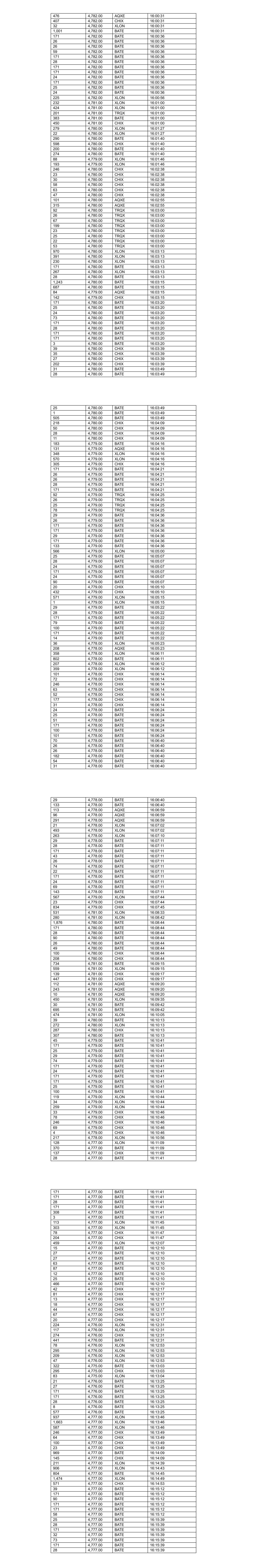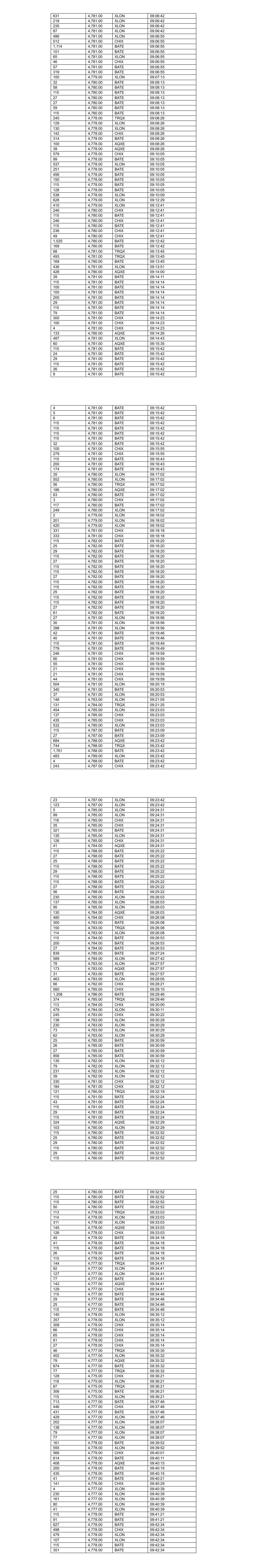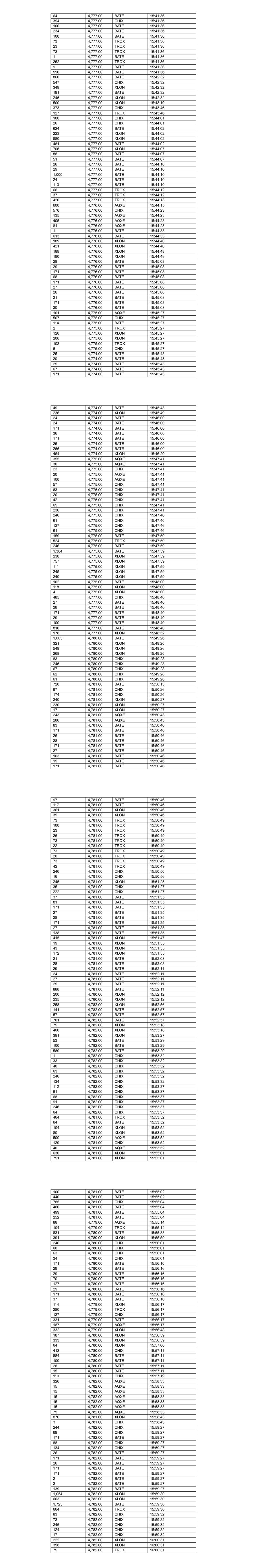 476 4,782.00 AQXE 16:00:31 407 4,782.00 CHIX 16:00:31 32 4,782.00 XLON 16:00:31 1,001 4,782.00 BATE 16:00:31 171 4,782.00 BATE 16:00:36 26 4,782.00 BATE 16:00:36 26 4,782.00 BATE 16:00:36 59 4,782.00 BATE 16:00:36 171 4,782.00 BATE 16:00:36 28 4,782.00 BATE 16:00:36 171 4,782.00 BATE 16:00:36 171 4,782.00 BATE 16:00:36 24 4,782.00 BATE 16:00:36 171 4,782.00 BATE 16:00:36 25 4,782.00 BATE 16:00:36 24 4,782.00 BATE 16:00:36 225 4,782.00 XLON 16:00:56 232 4,781.00 XLON 16:01:00 424 4,781.00 XLON 16:01:00 201 4,781.00 TRQX 16:01:00 383 4,781.00 BATE 16:01:00 450 4,781.00 CHIX 16:01:00 279 4,780.00 XLON 16:01:27 22 4,780.00 XLON 16:01:27 290 4,780.00 BATE 16:01:40 598 4,780.00 CHIX 16:01:40 200 4,780.00 BATE 16:01:40 274 4,780.00 BATE 16:01:40 88 4,779.00 XLON 16:01:46 193 4,779.00 XLON 16:01:46 246 4,780.00 CHIX 16:02:38 23 4,780.00 CHIX 16:02:38 30 4,780.00 CHIX 16:02:38 58 4,780.00 CHIX 16:02:38 63 4,780.00 CHIX 16:02:38 47 4,780.00 CHIX 16:02:38 101 4,780.00 AQXE 16:02:55 315 4,780.00 AQXE 16:02:55 92 4,780.00 TRQX 16:03:00 26 4,780.00 TRQX 16:03:00 67 4,780.00 TRQX 16:03:00 199 4,780.00 TRQX 16:03:00 23 4,780.00 TRQX 16:03:00 25 4,780.00 TRQX 16:03:00 22 4,780.00 TRQX 16:03:00 53 4,780.00 TRQX 16:03:00 970 4,780.00 XLON 16:03:13 391 4,780.00 XLON 16:03:13 230 4,780.00 XLON 16:03:13 171 4,780.00 BATE 16:03:13 267 4,780.00 XLON 16:03:13 28 4,780.00 BATE 16:03:13 1,243 4,780.00 BATE 16:03:15 687 4,780.00 BATE 16:03:15 84 4,779.00 AQXE 16:03:15 142 4,779.00 CHIX 16:03:15 171 4,780.00 BATE 16:03:20 25 4,780.00 BATE 16:03:20 24 4,780.00 BATE 16:03:20 73 4,780.00 BATE 16:03:20 171 4,780.00 BATE 16:03:20 28 4,780.00 BATE 16:03:20 171 4,780.00 BATE 16:03:20 171 4,780.00 BATE 16:03:20 3 4,780.00 BATE 16:03:20 39 4,780.00 CHIX 16:03:39 35 4,780.00 CHIX 16:03:39 27 4,780.00 CHIX 16:03:39 202 4,780.00 CHIX 16:03:39 31 4,780.00 BATE 16:03:49 28 4,780.00 BATE 16:03:49 25 4,780.00 BATE 16:03:49 1 4,780.00 BATE 16:03:49 505 4,780.00 BATE 16:03:49 218 4,780.00 CHIX 16:04:09 50 4,780.00 CHIX 16:04:09 28 4,780.00 CHIX 16:04:09 11 4,780.00 CHIX 16:04:09 183 4,779.00 BATE 16:04:16 131 4,779.00 AQXE 16:04:16 348 4,779.00 XLON 16:04:16 570 4,779.00 XLON 16:04:16 305 4,779.00 CHIX 16:04:16 171 4,779.00 BATE 16:04:21 26 4,779.00 BATE 16:04:21 26 4,779.00 BATE 16:04:21 28 4,779.00 BATE 16:04:21 171 4,779.00 BATE 16:04:21 92 4,779.00 TRQX 16:04:25 26 4,779.00 TRQX 16:04:25 25 4,779.00 TRQX 16:04:25 78 4,779.00 TRQX 16:04:25 29 4,779.00 BATE 16:04:36 26 4,779.00 BATE 16:04:36 171 4,779.00 BATE 16:04:36 171 4,779.00 BATE 16:04:36 29 4,779.00 BATE 16:04:36 171 4,779.00 BATE 16:04:36 133 4,779.00 BATE 16:04:36 566 4,779.00 XLON 16:05:00 25 4,779.00 BATE 16:05:07 28 4,779.00 BATE 16:05:07 24 4,779.00 BATE 16:05:07 171 4,779.00 BATE 16:05:07 24 4,779.00 BATE 16:05:07 90 4,779.00 BATE 16:05:07 20 4,779.00 CHIX 16:05:10 432 4,779.00 CHIX 16:05:10 571 4,779.00 XLON 16:05:15 1 4,779.00 XLON 16:05:15 29 4,779.00 BATE 16:05:22 28 4,779.00 BATE 16:05:22 171 4,779.00 BATE 16:05:22 79 4,779.00 BATE 16:05:22 100 4,779.00 BATE 16:05:22 171 4,779.00 BATE 16:05:22 14 4,779.00 BATE 16:05:22 36 4,778.00 XLON 16:05:23 208 4,778.00 AQXE 16:05:23 358 4,778.00 XLON 16:06:11 802 4,778.00 BATE 16:06:11 207 4,778.00 XLON 16:06:12 359 4,778.00 XLON 16:06:12 101 4,778.00 CHIX 16:06:14 72 4,778.00 CHIX 16:06:14 246 4,778.00 CHIX 16:06:14 63 4,778.00 CHIX 16:06:14 52 4,778.00 CHIX 16:06:14 177 4,778.00 CHIX 16:06:14 31 4,778.00 CHIX 16:06:14 24 4,778.00 BATE 16:06:24 25 4,778.00 BATE 16:06:24 51 4,778.00 BATE 16:06:24 171 4,778.00 BATE 16:06:24 100 4,778.00 BATE 16:06:24 101 4,778.00 BATE 16:06:24 70 4,778.00 BATE 16:06:40 26 4,778.00 BATE 16:06:40 26 4,778.00 BATE 16:06:40 182 4,778.00 BATE 16:06:40 54 4,778.00 BATE 16:06:40 31 4,778.00 BATE 16:06:40 29 4,778.00 BATE 16:06:40 133 4,778.00 BATE 16:06:40 113 4,778.00 AQXE 16:06:59 96 4,778.00 AQXE 16:06:59 291 4,778.00 AQXE 16:06:59 21 4,778.00 XLON 16:07:02 493 4,778.00 XLON 16:07:02 263 4,778.00 XLON 16:07:10 29 4,778.00 BATE 16:07:11 28 4,778.00 BATE 16:07:11 171 4,778.00 BATE 16:07:11 43 4,778.00 BATE 16:07:11 26 4,778.00 BATE 16:07:11 74 4,778.00 BATE 16:07:11 22 4,778.00 BATE 16:07:11 171 4,778.00 BATE 16:07:11 24 4,778.00 BATE 16:07:11 69 4,778.00 BATE 16:07:11 143 4,778.00 BATE 16:07:11 567 4,779.00 XLON 16:07:44 23 4,779.00 CHIX 16:07:44 834 4,779.00 CHIX 16:07:45 531 4,781.00 XLON 16:08:33 280 4,781.00 XLON 16:08:42 1,876 4,780.00 BATE 16:08:44 171 4,780.00 BATE 16:08:44 28 4,780.00 BATE 16:08:44 90 4,780.00 BATE 16:08:44 26 4,780.00 BATE 16:08:44 49 4,780.00 BATE 16:08:44 100 4,780.00 CHIX 16:08:44 208 4,780.00 CHIX 16:08:44 734 4,781.00 BATE 16:09:15 559 4,781.00 XLON 16:09:15 139 4,781.00 CHIX 16:09:17 447 4,781.00 CHIX 16:09:17 112 4,781.00 AQXE 16:09:20 243 4,781.00 AQXE 16:09:20 10 4,781.00 AQXE 16:09:20 450 4,781.00 XLON 16:09:35 30 4,781.00 BATE 16:09:42 695 4,781.00 BATE 16:09:42 474 4,781.00 XLON 16:10:05 39 4,780.00 BATE 16:10:13 272 4,780.00 XLON 16:10:13 287 4,780.00 CHIX 16:10:13 307 4,780.00 BATE 16:10:13 45 4,779.00 BATE 16:10:41 171 4,779.00 BATE 16:10:41 25 4,779.00 BATE 16:10:41 29 4,779.00 BATE 16:10:41 74 4,779.00 BATE 16:10:41 171 4,779.00 BATE 16:10:41 24 4,779.00 BATE 16:10:41 171 4,779.00 BATE 16:10:41 171 4,779.00 BATE 16:10:41 25 4,779.00 BATE 16:10:41 100 4,779.00 BATE 16:10:41 119 4,779.00 XLON 16:10:44 34 4,779.00 XLON 16:10:44 259 4,779.00 XLON 16:10:44 33 4,779.00 CHIX 16:10:46 78 4,779.00 CHIX 16:10:46 246 4,779.00 CHIX 16:10:46 69 4,779.00 CHIX 16:10:46 4 4,779.00 CHIX 16:10:46 217 4,778.00 XLON 16:10:56 128 4,777.00 XLON 16:11:09 370 4,777.00 BATE 16:11:09 137 4,777.00 CHIX 16:11:09 28 4,777.00 BATE 16:11:41 171 4,777.00 BATE 16:11:41 171 4,777.00 BATE 16:11:41 28 4,777.00 BATE 16:11:41 171 4,777.00 BATE 16:11:41 308 4,777.00 BATE 16:11:41 3 4,777.00 BATE 16:11:41 113 4,777.00 XLON 16:11:45 303 4,777.00 XLON 16:11:45 78 4,777.00 CHIX 16:11:47 204 4,777.00 CHIX 16:11:47 459 4,777.00 XLON 16:12:07 15 4,777.00 BATE 16:12:10 27 4,777.00 BATE 16:12:10 27 4,7