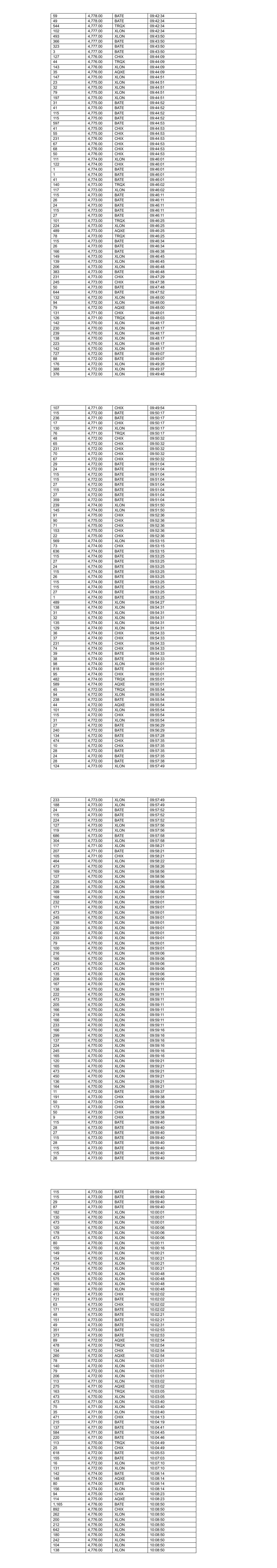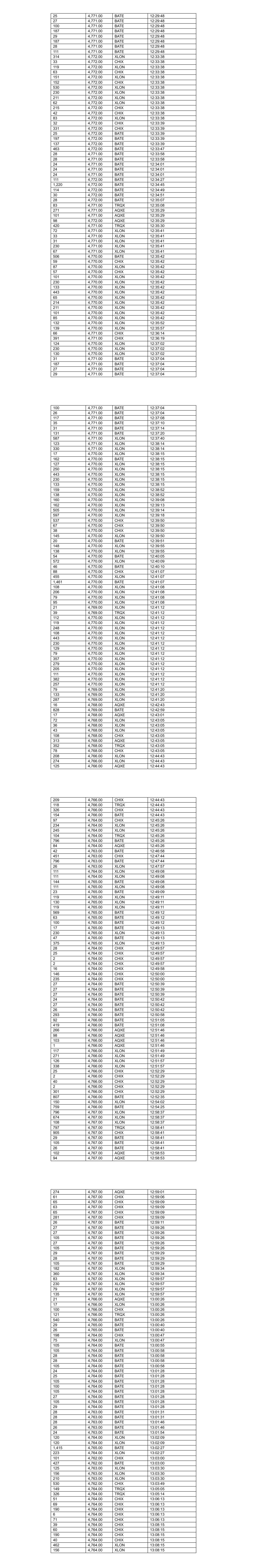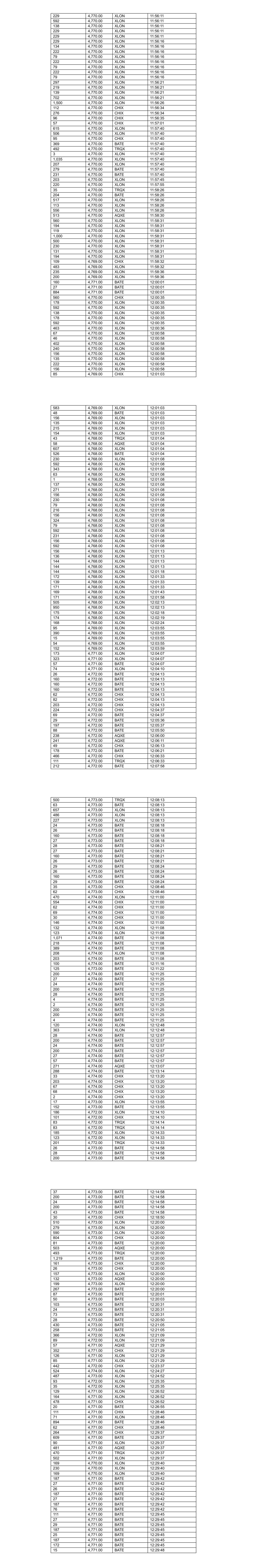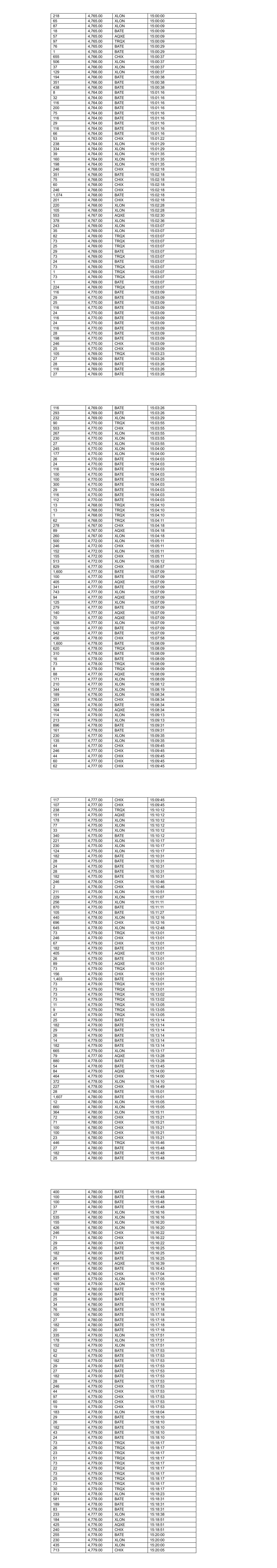 22 4,776.00 TRQX 10:54:05 28 4,776.00 TRQX 10:54:05 24 4,776.00 BATE 10:54:21 26 4,776.00 BATE 10:54:21 136 4,776.00 BATE 10:54:21 29 4,776.00 BATE 10:54:21 55 4,776.00 BATE 10:54:21 116 4,776.00 XLON 10:54:30 111 4,776.00 XLON 10:54:30 169 4,776.00 XLON 10:54:41 123 4,776.00 XLON 10:54:41 26 4,777.00 BATE 10:55:04 29 4,777.00 BATE 10:55:04 136 4,777.00 BATE 10:55:04 27 4,777.00 BATE 10:55:04 694 4,777.00 BATE 10:55:04 44 4,776.00 CHIX 10:55:33 504 4,776.00 CHIX 10:55:46 230 4,776.00 XLON 10:56:24 88 4,776.00 XLON 10:56:24 33 4,776.00 XLON 10:56:24 79 4,776.00 XLON 10:56:24 80 4,776.00 XLON 10:56:24 103 4,776.00 XLON 10:57:03 222 4,776.00 XLON 10:57:03 116 4,776.00 XLON 10:57:03 418 4,776.00 CHIX 10:57:35 45 4,775.00 XLON 10:58:08 105 4,775.00 XLON 10:58:08 49 4,775.00 CHIX 10:58:08 41 4,775.00 AQXE 10:58:08 728 4,775.00 BATE 10:58:08 37 4,775.00 TRQX 10:58:08 103 4,774.00 CHIX 10:58:41 119 4,774.00 CHIX 10:59:06 912 4,774.00 BATE 10:59:12 532 4,774.00 XLON 10:59:41 67 4,774.00 XLON 10:59:41 465 4,774.00 XLON 10:59:41 360 4,774.00 AQXE 10:59:55 24 4,775.00 BATE 10:59:55 136 4,775.00 BATE 10:59:55 136 4,775.00 BATE 10:59:55 29 4,775.00 BATE 10:59:55 559 4,775.00 BATE 10:59:55 109 4,774.00 AQXE 11:00:20 81 4,773.00 TRQX 11:00:31 747 4,773.00 BATE 11:01:01 415 4,773.00 TRQX 11:01:01 40 4,772.00 AQXE 11:01:08 343 4,772.00 CHIX 11:01:08 92 4,772.00 XLON 11:01:08 113 4,772.00 XLON 11:01:08 43 4,772.00 CHIX 11:02:24 734 4,772.00 BATE 11:02:24 69 4,772.00 CHIX 11:02:25 348 4,771.00 CHIX 11:02:33 111 4,771.00 XLON 11:02:39 230 4,771.00 XLON 11:02:39 93 4,772.00 XLON 11:02:39 15 4,772.00 XLON 11:02:39 101 4,772.00 XLON 11:02:39 102 4,772.00 BATE 11:04:08 44 4,772.00 CHIX 11:04:12 372 4,772.00 CHIX 11:04:12 721 4,772.00 BATE 11:04:44 135 4,772.00 XLON 11:04:44 210 4,772.00 XLON 11:04:44 230 4,772.00 XLON 11:04:44 75 4,772.00 XLON 11:04:44 135 4,772.00 XLON 11:04:44 34 4,772.00 XLON 11:04:44 55 4,771.00 CHIX 11:04:52 5 4,771.00 CHIX 11:04:52 131 4,771.00 XLON 11:05:11 138 4,771.00 XLON 11:05:11 277 4,771.00 XLON 11:05:11 100 4,772.00 BATE 11:05:13 25 4,772.00 BATE 11:05:13 28 4,772.00 BATE 11:05:13 136 4,772.00 BATE 11:05:13 29 4,772.00 BATE 11:05:13 33 4,772.00 BATE 11:05:13 136 4,772.00 BATE 11:05:13 136 4,772.00 BATE 11:05:13 29 4,772.00 BATE 11:05:13 77 4,772.00 BATE 11:05:13 287 4,771.00 AQXE 11:06:31 187 4,771.00 AQXE 11:06:36 29 4,772.00 BATE 11:06:39 28 4,772.00 BATE 11:06:39 24 4,772.00 BATE 11:06:39 29 4,772.00 BATE 11:06:42 28 4,772.00 BATE 11:06:42 25 4,772.00 BATE 11:06:42 698 4,772.00 BATE 11:06:42 33 4,771.00 CHIX 11:06:44 504 4,771.00 CHIX 11:06:51 25 4,771.00 TRQX 11:06:51 466 4,771.00 TRQX 11:07:03 102 4,770.00 XLON 11:07:06 118 4,770.00 XLON 11:07:06 91 4,770.00 XLON 11:07:06 230 4,770.00 XLON 11:07:06 260 4,770.00 XLON 11:07:06 127 4,770.00 XLON 11:07:06 39 4,770.00 XLON 11:07:06 79 4,770.00 XLON 11:07:06 212 4,770.00 XLON 11:07:06 79 4,770.00 XLON 11:07:06 130 4,770.00 XLON 11:07:06 130 4,770.00 XLON 11:07:06 129 4,770.00 XLON 11:07:11 135 4,770.00 XLON 11:07:11 160 4,770.00 XLON 11:07:11 237 4,770.00 XLON 11:07:11 129 4,770.00 XLON 11:07:11 129 4,770.00 XLON 11:07:16 128 4,770.00 XLON 11:07:21 473 4,770.00 XLON 11:07:21 130 4,770.00 XLON 11:07:21 215 4,770.00 XLON 11:07:21 209 4,770.00 XLON 11:07:21 229 4,770.00 XLON 11:07:21 128 4,770.00 XLON 11:07:21 473 4,770.00 XLON 11:07:21 79 4,770.00 XLON 11:07:21 128 4,770.00 XLON 11:07:21 128 4,770.00 XLON 11:07:21 128 4,770.00 XLON 11:07:26 737 4,770.00 XLON 11:07:26 127 4,770.00 XLON 11:07:26 127 4,770.00 XLON 11:07:31 126 4,770.00 XLON 11:07:36 126 4,770.00 XLON 11:07:41 127 4,770.00 XLON 11:07:46 127 4,770.00 XLON 11:07:51 127 4,770.00 XLON 11:07:56 127 4,770.00 XLON 11:08:01 127 4,770.00 XLON 11:08:06 389 4,770.00 XLON 11:08:06 127 4,770.00 XLON 11:08:07 127 4,770.00 XLON 11:08:07 127 4,770.00 XLON 11:08:12 126 4,770.00 XLON 11:08:14 12 4,771.00 BATE 11:08:16 156 4,771.00 BATE 11:08:16 774 4,772.00 BATE 11:08:38 126 4,772.00 XLON 11:08:45 163 4,772.00 XLON 11:08:45 106 4,772.00 XLON 11:08:45 73 4,772.00 XLON 11:08:45 149 4,770.00 BATE 11:09:10 81 4,770.00 XLON 11:09:10 414 4,770.00 XLON 11:09:10 68 4,770.00 BATE 11:09:12 361 4,770.00 XLON 11:09:12 105 4,770.00 XLON 11:09:15 112 4,770.00 XLON 11:09:15 127 4,770.00 XLON 11:09:15 79 4,770.00 XLON 11:09:15 473 4,770.00 XLON 11:09:15 230 4,770.00 XLON 11:09:15 103 4,770.00 XLON 11:09:15 215 4,770.00 CHIX 11:09:17 29 4,771.00 CHIX 11:10:06 245 4,771.00 CHIX 11:10:06 825 4,772.00 BATE 11:10:29 138 4,773.00 BATE 11:11:58 625 4,773.00 BATE 11:12:00 65 4,772.00 BATE 11:13:02 615 4,772.00 CHIX 11:13:02 634 4,772.00 XLON 11:13:02 351 4,772.00 AQXE 11:13:02 508 4,772.00 XLON 11:13:02 207 4,772.00 CHIX 11:13:02 114 4,772.00 XLON 11:13:02 95 4,772.00 XLON 11:13:02 113 4,772.00 XLON 11:13:02 69 4,772.00 XLON 11:13:02 107 4,770.00 CHIX 11:13:28 265 4,770.00 BATE 11:13:28 128 4,770.00 BATE 11:13:28 141 4,770.00 XLON 11:13:28 141 4,770.00 XLON 11:13:28 90 4,770.00 XLON 11:13:28 116 4,770.00 XLON 11:13:28 203 4,770.00 XLON 11:13:28 25 4,770.00 TRQX 11:13:28 230 4,770.00 XLON 11:13:28 473 4,770.00 XLON 11:13:28 133 4,770.00 XLON 11:13:28 200 4,770.00 XLON 11:13:28 242 4,770.00 XLON 11:13:28 217 4,770.00 XLON 11:13:28 25 4,770.00 TRQX 11:13:28 111 4,770.00 XLON 11:13:28 232 4,770.00 XLON 11:13:28 131 4,770.00 AQXE 11:13:30 346 4,770.00 XLON 11:13:30 774 4,771.00 BATE 11:15:33 516 4,771.00 TRQX 11:15:33 25 4,771.00 BATE 11:15:33 407 4,771.00 XLON 11:15:52 798 4,771.00 BATE 11:16:01 508 4,771.00 CHIX 11:16:01 109 4,771.00 XLON 11:16:14 19 4,771.00 XLON 11:16:14 105 4,771.00 XLON 11:16:14 184 4,771.00 XLON 11:16:14 607 4,772.00 BATE 11:17:22 174 4,772.00 BATE 11:17:30 62 4,771.00 XLON 11:17:31 105 4,770.00 XLON 11:17:33 22 4,770.00 XLON 11:17:33 230 4,770.00 XLON 11:17:33 245 4,770.00 XLON 11:17:33 105 4,770.00 XLON 11:17:33 12 4,770.00 XLON 11:17:33 105 4,770.00 XLON 11:17:33 105 4,770.00 XLON 11:17:38 108 4,770.00 XLON 11:17:43 108 4,770.00 XLON 11:17:43 124 4,770.00 XLON 11:17:48 491 4,770.00 XLON 11:1