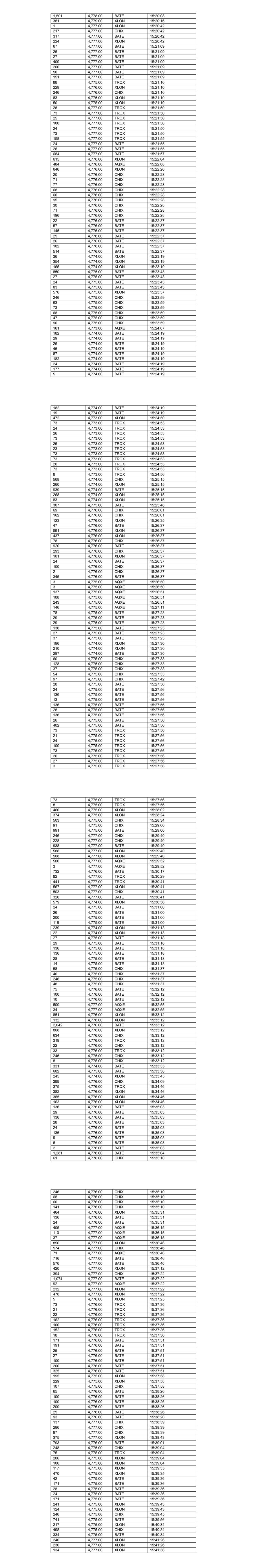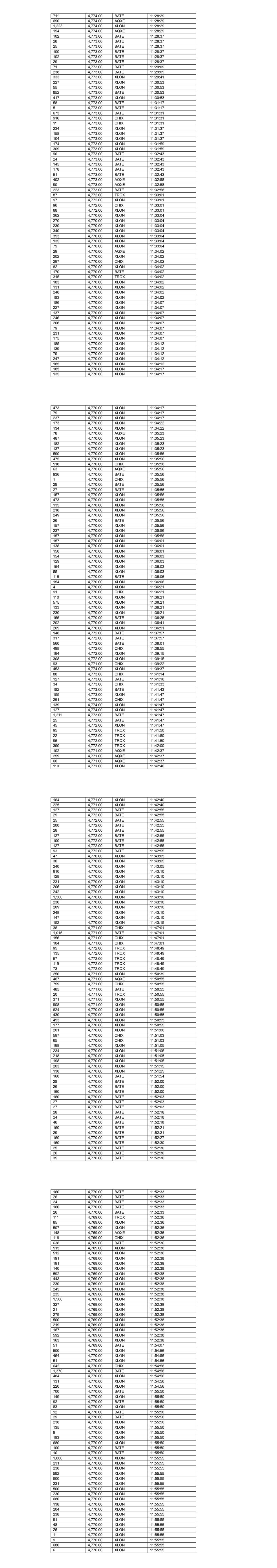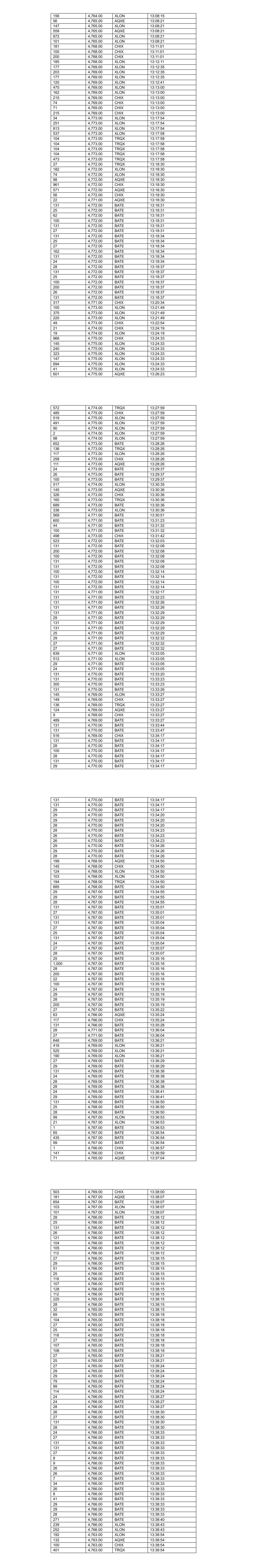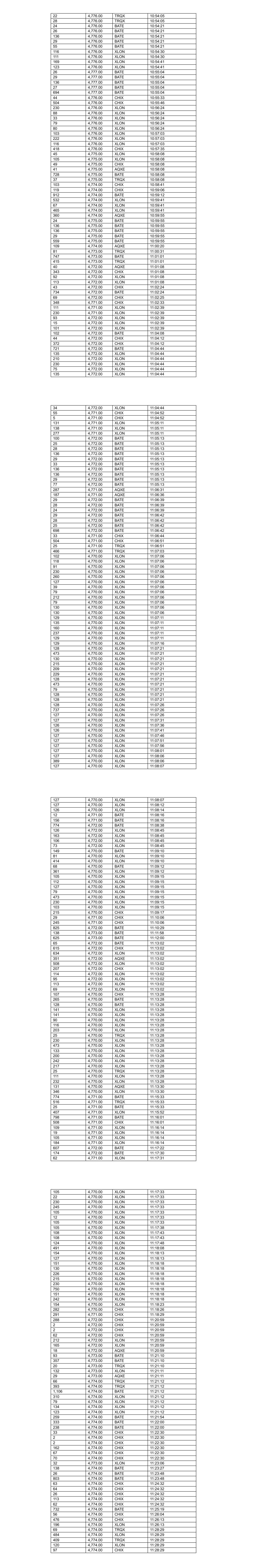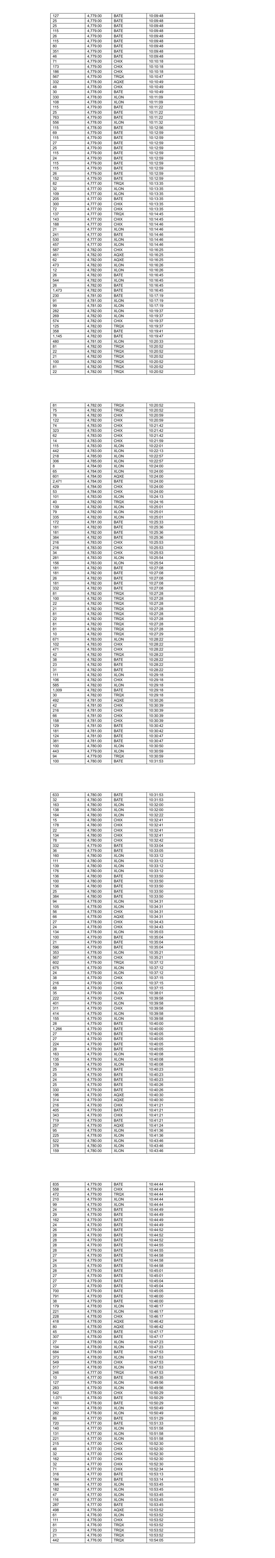 22 4,776.00 TRQX 10:54:05 28 4,776.00 TRQX 10:54:05 24 4,776.00 BATE 10:54:21 26 4,776.00 BATE 10:54:21 136 4,776.00 BATE 10:54:21 29 4,776.00 BATE 10:54:21 55 4,776.00 BATE 10:54:21 116 4,776.00 XLON 10:54:30 111 4,776.00 XLON 10:54:30 169 4,776.00 XLON 10:54:41 123 4,776.00 XLON 10:54:41 26 4,777.00 BATE 10:55:04 29 4,777.00 BATE 10:55:04 136 4,777.00 BATE 10:55:04 27 4,777.00 BATE 10:55:04 694 4,777.00 BATE 10:55:04 44 4,776.00 CHIX 10:55:33 504 4,776.00 CHIX 10:55:46 230 4,776.00 XLON 10:56:24 88 4,776.00 XLON 10:56:24 33 4,776.00 XLON 10:56:24 79 4,776.00 XLON 10:56:24 80 4,776.00 XLON 10:56:24 103 4,776.00 XLON 10:57:03 222 4,776.00 XLON 10:57:03 116 4,776.00 XLON 10:57:03 418 4,776.00 CHIX 10:57:35 45 4,775.00 XLON 10:58:08 105 4,775.00 XLON 10:58:08 49 4,775.00 CHIX 10:58:08 41 4,775.00 AQXE 10:58:08 728 4,775.00 BATE 10:58:08 37 4,775.00 TRQX 10:58:08 103 4,774.00 CHIX 10:58:41 119 4,774.00 CHIX 10:59:06 912 4,774.00 BATE 10:59:12 532 4,774.00 XLON 10:59:41 67 4,774.00 XLON 10:59:41 465 4,774.00 XLON 10:59:41 360 4,774.00 AQXE 10:59:55 24 4,775.00 BATE 10:59:55 136 4,775.00 BATE 10:59:55 136 4,775.00 BATE 10:59:55 29 4,775.00 BATE 10:59:55 559 4,775.00 BATE 10:59:55 109 4,774.00 AQXE 11:00:20 81 4,773.00 TRQX 11:00:31 747 4,773.00 BATE 11:01:01 415 4,773.00 TRQX 11:01:01 40 4,772.00 AQXE 11:01:08 343 4,772.00 CHIX 11:01:08 92 4,772.00 XLON 11:01:08 113 4,772.00 XLON 11:01:08 43 4,772.00 CHIX 11:02:24 734 4,772.00 BATE 11:02:24 69 4,772.00 CHIX 11:02:25 348 4,771.00 CHIX 11:02:33 111 4,771.00 XLON 11:02:39 230 4,771.00 XLON 11:02:39 93 4,772.00 XLON 11:02:39 15 4,772.00 XLON 11:02:39 101 4,772.00 XLON 11:02:39 102 4,772.00 BATE 11:04:08 44 4,772.00 CHIX 11:04:12 372 4,772.00 CHIX 11:04:12 721 4,772.00 BATE 11:04:44 135 4,772.00 XLON 11:04:44 210 4,772.00 XLON 11:04:44 230 4,772.00 XLON 11:04:44 75 4,772.00 XLON 11:04:44 135 4,772.00 XLON 11:04:44 34 4,772.00 XLON 11:04:44 55 4,771.00 CHIX 11:04:52 5 4,771.00 CHIX 11:04:52 131 4,771.00 XLON 11:05:11 138 4,771.00 XLON 11:05:11 277 4,771.00 XLON 11:05:11 100 4,772.00 BATE 11:05:13 25 4,772.00 BATE 11:05:13 28 4,772.00 BATE 11:05:13 136 4,772.00 BATE 11:05:13 29 4,772.00 BATE 11:05:13 33 4,772.00 BATE 11:05:13 136 4,772.00 BATE 11:05:13 136 4,772.00 BATE 11:05:13 29 4,772.00 BATE 11:05:13 77 4,772.00 BATE 11:05:13 287 4,771.00 AQXE 11:06:31 187 4,771.00 AQXE 11:06:36 29 4,772.00 BATE 11:06:39 28 4,772.00 BATE 11:06:39 24 4,772.00 BATE 11:06:39 29 4,772.00 BATE 11:06:42 28 4,772.00 BATE 11:06:42 25 4,772.00 BATE 11:06:42 698 4,772.00 BATE 11:06:42 33 4,771.00 CHIX 11:06:44 504 4,771.00 CHIX 11:06:51 25 4,771.00 TRQX 11:06:51 466 4,771.00 TRQX 11:07:03 102 4,770.00 XLON 11:07:06 118 4,770.00 XLON 11:07:06 91 4,770.00 XLON 11:07:06 230 4,770.00 XLON 11:07:06 260 4,770.00 XLON 11:07:06 127 4,770.00 XLON 11:07:06 39 4,770.00 XLON 11:07:06 79 4,770.00 XLON 11:07:06 212 4,770.00 XLON 11:07:06 79 4,770.00 XLON 11:07:06 130 4,770.00 XLON 11:07:06 130 4,770.00 XLON 11:07:06 129 4,770.00 XLON 11:07:11 135 4,770.00 XLON 11:07:11 160 4,770.00 XLON 11:07:11 237 4,770.00 XLON 11:07:11 129 4,770.00 XLON 11:07:11 129 4,770.00 XLON 11:07:16 128 4,770.00 XLON 11:07:21 473 4,770.00 XLON 11:07:21 130 4,770.00 XLON 11:07:21 215 4,770.00 XLON 11:07:21 209 4,770.00 XLON 11:07:21 229 4,770.00 XLON 11:07:21 128 4,770.00 XLON 11:07:21 473 4,770.00 XLON 11:07:21 79 4,770.00 XLON 11:07:21 128 4,770.00 XLON 11:07:21 128 4,770.00 XLON 11:07:21 128 4,770.00 XLON 11:07:26 737 4,770.00 XLON 11:07:26 127 4,770.00 XLON 11:07:26 127 4,770.00 XLON 11:07:31 126 4,770.00 XLON 11:07:36 126 4,770.00 XLON 11:07:41 127 4,770.00 XLON 11:07:46 127 4,770.00 XLON 11:07:51 127 4,770.00 XLON 11:07:56 127 4,770.00 XLON 11:08:01 127 4,770.00 XLON 11:08:06 389 4,770.00 XLON 11:08:06 127 4,770.00 XLON 11:08:07 127 4,770.00 XLON 11:08:07 127 4,770.00 XLON 11:08:12 126 4,770.00 XLON 11:08:14 12 4,771.00 BATE 11:08:16 156 4,771.00 BATE 11:08:16 774 4,772.00 BATE 11:08:38 126 4,772.00 XLON 11:08:45 163 4,772.00 XLON 11:08:45 106 4,772.00 XLON 11:08:45 73 4,772.00 XLON 11:08:45 149 4,770.00 BATE 11:09:10 81 4,770.00 XLON 11:09:10 414 4,770.00 XLON 11:09:10 68 4,770.00 BATE 11:09:12 361 4,770.00 XLON 11:09:12 105 4,770.00 XLON 11:09:15 112 4,770.00 XLON 11:09:15 127 4,770.00 XLON 11:09:15 79 4,770.00 XLON 11:09:15 473 4,770.00 XLON 11:09:15 230 4,770.00 XLON 11:09:15 103 4,770.00 XLON 11:09:15 215 4,770.00 CHIX 11:09:17 29 4,771.00 CHIX 11:10:06 245 4,771.00 CHIX 11:10:06 825 4,772.00 BATE 11:10:29 138 4,773.00 BATE 11:11:58 625 4,773.00 BATE 11:12:00 65 4,772.00 BATE 11:13:02 615 4,772.00 CHIX 11:13:02 634 4,772.00 XLON 11:13:02 351 4,772.00 AQXE 11:13:02 508 4,772.00 XLON 11:13:02 207 4,772.00 CHIX 11:13:02 114 4,772.00 XLON 11:13:02 95 4,772.00 XLON 11:13:02 113 4,772.00 XLON 11:13:02 69 4,772.00 XLON 11:13:02 107 4,770.00 CHIX 11:13:28 265 4,770.00 BATE 11:13:28 128 4,770.00 BATE 11:13:28 141 4,770.00 XLON 11:13:28 141 4,770.00 XLON 11:13:28 90 4,770.00 XLON 11:13:28 116 4,770.00 XLON 11:13:28 203 4,770.00 XLON 11:13:28 25 4,770.00 TRQX 11:13:28 230 4,770.00 XLON 11:13:28 473 4,770.00 XLON 11:13:28 133 4,770.00 XLON 11:13:28 200 4,770.00 XLON 11:13:28 242 4,770.00 XLON 11:13:28 217 4,770.00 XLON 11:13:28 25 4,770.00 TRQX 11:13:28 111 4,770.00 XLON 11:13:28 232 4,770.00 XLON 11:13:28 131 4,770.00 AQXE 11:13:30 346 4,770.00 XLON 11:13:30 774 4,771.00 BATE 11:15:33 516 4,771.00 TRQX 11:15:33 25 4,771.00 BATE 11:15:33 407 4,771.00 XLON 11:15:52 798 4,771.00 BATE 11:16:01 508 4,771.00 CHIX 11:16:01 109 4,771.00 XLON 11:16:14 19 4,771.00 XLON 11:16:14 105 4,771.00 XLON 11:16:14 184 4,771.00 XLON 11:16:14 607 4,772.00 BATE 11:17:22 174 4,772.00 BATE 11:17:30 62 4,771.00 XLON 11:17:31 105 4,770.00 XLON 11:17:33 22 4,770.00 XLON 11:17:33 230 4,770.00 XLON 11:17:33 245 4,770.00 XLON 11:17:33 105 4,770.00 XLON 11:17:33 12 4,770.00 XLON 11:17:33 105 4,770.00 XLON 11:17:33 105 4,770.00 XLON 11:17:38 108 4,770.00 XLON 11:17:43 108 4,770.00 XLON 11:17:43 124 4,770.00 XLON 11:17:48 491 4,770.00 XLON 11:1