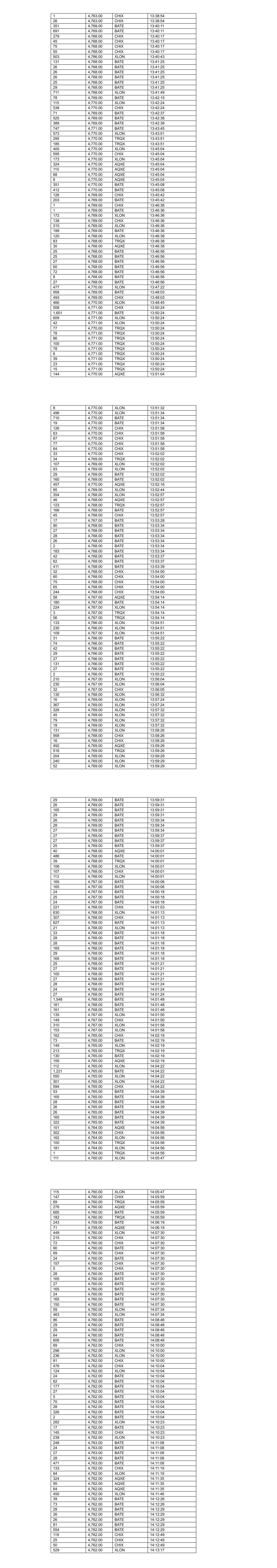 1 4,763.00 CHIX 13:38:54 26 4,763.00 CHIX 13:38:54 351 4,769.00 BATE 13:40:11 691 4,769.00 BATE 13:40:11 279 4,768.00 CHIX 13:40:17 45 4,768.00 CHIX 13:40:17 75 4,768.00 CHIX 13:40:17 55 4,768.00 CHIX 13:40:17 503 4,766.00 XLON 13:40:43 131 4,768.00 BATE 13:41:25 26 4,768.00 BATE 13:41:25 26 4,768.00 BATE 13:41:25 26 4,768.00 BATE 13:41:25 25 4,768.00 BATE 13:41:25 29 4,768.00 BATE 13:41:25 711 4,768.00 XLON 13:41:49 78 4,769.00 BATE 13:42:15 115 4,770.00 XLON 13:42:24 538 4,770.00 CHIX 13:42:24 71 4,769.00 BATE 13:42:37 525 4,769.00 BATE 13:42:38 389 4,769.00 BATE 13:42:39 747 4,771.00 BATE 13:43:45 573 4,770.00 XLON 13:43:51 295 4,770.00 TRQX 13:43:51 185 4,770.00 TRQX 13:43:51 400 4,770.00 XLON 13:45:04 595 4,770.00 CHIX 13:45:04 173 4,770.00 XLON 13:45:04 324 4,770.00 AQXE 13:45:04 110 4,770.00 AQXE 13:45:04 68 4,770.00 AQXE 13:45:04 8 4,770.00 AQXE 13:45:04 351 4,770.00 BATE 13:45:08 412 4,770.00 BATE 13:45:08 126 4,769.00 CHIX 13:45:42 203 4,769.00 BATE 13:45:42 1 4,769.00 CHIX 13:46:36 1 4,769.00 BATE 13:46:36 172 4,769.00 XLON 13:46:36 138 4,769.00 CHIX 13:46:36 310 4,769.00 XLON 13:46:36 199 4,769.00 BATE 13:46:36 120 4,768.00 XLON 13:46:38 83 4,768.00 TRQX 13:46:38 30 4,768.00 AQXE 13:46:38 25 4,768.00 BATE 13:46:56 25 4,768.00 BATE 13:46:56 27 4,768.00 BATE 13:46:56 60 4,768.00 BATE 13:46:56 72 4,768.00 BATE 13:46:56 8 4,768.00 BATE 13:46:56 27 4,768.00 BATE 13:46:56 477 4,770.00 XLON 13:47:22 958 4,769.00 BATE 13:48:03 493 4,769.00 CHIX 13:48:03 466 4,770.00 XLON 13:48:45 508 4,771.00 CHIX 13:50:24 1,601 4,771.00 BATE 13:50:24 609 4,771.00 XLON 13:50:24 42 4,771.00 XLON 13:50:24 77 4,770.00 TRQX 13:50:24 78 4,771.00 TRQX 13:50:24 86 4,771.00 TRQX 13:50:24 100 4,771.00 TRQX 13:50:24 78 4,771.00 TRQX 13:50:24 6 4,771.00 TRQX 13:50:24 39 4,771.00 TRQX 13:50:24 23 4,771.00 TRQX 13:50:24 15 4,771.00 TRQX 13:50:24 144 4,770.00 AQXE 13:51:04 8 4,770.00 XLON 13:51:32 496 4,770.00 XLON 13:51:34 710 4,770.00 BATE 13:51:34 19 4,770.00 BATE 13:51:34 126 4,770.00 CHIX 13:51:58 63 4,770.00 CHIX 13:51:58 67 4,770.00 CHIX 13:51:58 77 4,770.00 CHIX 13:51:58 64 4,770.00 CHIX 13:51:58 33 4,770.00 CHIX 13:52:02 34 4,769.00 TRQX 13:52:02 107 4,769.00 XLON 13:52:02 93 4,769.00 XLON 13:52:02 29 4,769.00 BATE 13:52:02 160 4,769.00 BATE 13:52:02 457 4,770.00 AQXE 13:52:16 95 4,769.00 XLON 13:52:44 354 4,768.00 XLON 13:52:57 46 4,768.00 AQXE 13:52:57 123 4,768.00 TRQX 13:52:57 166 4,768.00 BATE 13:52:57 45 4,768.00 CHIX 13:52:57 17 4,767.00 BATE 13:53:28 90 4,768.00 BATE 13:53:34 27 4,768.00 BATE 13:53:34 28 4,768.00 BATE 13:53:34 26 4,768.00 BATE 13:53:34 2 4,768.00 BATE 13:53:34 183 4,768.00 BATE 13:53:34 42 4,768.00 BATE 13:53:37 62 4,768.00 BATE 13:53:37 411 4,768.00 BATE 13:53:39 32 4,768.00 CHIX 13:54:00 60 4,768.00 CHIX 13:54:00 75 4,768.00 CHIX 13:54:00 65 4,768.00 CHIX 13:54:00 244 4,768.00 CHIX 13:54:00 58 4,767.00 AQXE 13:54:14 180 4,767.00 BATE 13:54:14 224 4,767.00 XLON 13:54:14 3 4,767.00 TRQX 13:54:14 56 4,767.00 TRQX 13:54:14 133 4,766.00 XLON 13:54:51 230 4,766.00 XLON 13:54:51 109 4,767.00 XLON 13:54:51 31 4,766.00 BATE 13:55:22 74 4,766.00 BATE 13:55:22 42 4,766.00 BATE 13:55:22 29 4,766.00 BATE 13:55:22 27 4,766.00 BATE 13:55:22 131 4,766.00 BATE 13:55:22 27 4,766.00 BATE 13:55:22 2 4,766.00 BATE 13:55:22 210 4,767.00 XLON 13:56:04 230 4,767.00 XLON 13:56:04 32 4,767.00 CHIX 13:56:05 130 4,768.00 XLON 13:56:32 16 4,769.00 XLON 13:57:24 367 4,769.00 XLON 13:57:24 326 4,769.00 XLON 13:57:32 45 4,769.00 XLON 13:57:32 79 4,769.00 XLON 13:57:32 18 4,769.00 XLON 13:57:32 131 4,768.00 XLON 13:58:26 958 4,768.00 CHIX 13:58:26 16 4,768.00 CHIX 13:58:26 492 4,769.00 AQXE 13:59:26 516 4,769.00 TRQX 13:59:26 204 4,769.00 XLON 13:59:29 240 4,769.00 XLON 13:59:29 52 4,769.00 XLON 13:59:29 29 4,769.00 BATE 13:59:31 26 4,769.00 BATE 13:59:31 165 4,769.00 BATE 13:59:31 29 4,769.00 BATE 13:59:31 26 4,769.00 BATE 13:59:34 28 4,769.00 BATE 13:59:34 27 4,769.00 BATE 13:59:34 27 4,769.00 BATE 13:59:37 27 4,769.00 BATE 13:59:37 25 4,769.00 BATE 13:59:37 40 4,768.00 AQXE 14:00:01 486 4,768.00 BATE 14:00:01 39 4,768.00 TRQX 14:00:01 106 4,768.00 XLON 14:00:01 107 4,768.00 CHIX 14:00:01 113 4,768.00 XLON 14:00:01 165 4,767.00 BATE 14:00:06 165 4,767.00 BATE 14:00:06 24 4,767.00 BATE 14:00:18 25 4,767.00 BATE 14:00:18 24 4,767.00 BATE 14:00:18 221 4,768.00 CHIX 14:01:03 630 4,768.00 XLON 14:01:13 307 4,768.00 CHIX 14:01:13 627 4,768.00 BATE 14:01:13 21 4,768.00 XLON 14:01:13 33 4,768.00 BATE 14:01:18 28 4,768.00 BATE 14:01:18 28 4,768.00 BATE 14:01:18 165 4,768.00 BATE 14:01:18 29 4,768.00 BATE 14:01:18 165 4,768.00 BATE 14:01:18 25 4,768.00 BATE 14:01:21 27 4,768.00 BATE 14:01:21 100 4,768.00 BATE 14:01:21 27 4,768.00 BATE 14:01:21 28 4,768.00 BATE 14:01:24 24 4,768.00 BATE 14:01:24 27 4,768.00 BATE 14:01:24 1,548 4,768.00 BATE 14:01:48 161 4,768.00 BATE 14:01:48 161 4,768.00 BATE 14:01:48 135 4,767.00 XLON 14:01:50 149 4,767.00 CHIX 14:01:50 310 4,767.00 XLON 14:01:58 153 4,767.00 XLON 14:01:58 162 4,765.00 CHIX 14:02:19 73 4,765.00 BATE 14:02:19 149 4,765.00 XLON 14:02:19 213 4,765.00 TRQX 14:02:19 130 4,765.00 BATE 14:02:19 159 4,765.00 AQXE 14:02:19 112 4,765.00 XLON 14:04:22 1,221 4,765.00 BATE 14:04:22 550 4,765.00 XLON 14:04:22 301 4,765.00 XLON 14:04:22 594 4,765.00 CHIX 14:04:22 53 4,765.00 BATE 14:04:39 165 4,765.00 BATE 14:04:39 28 4,765.00 BATE 14:04:39 26 4,765.00 BATE 14:04:39 26 4,765.00 BATE 14:04:39 165 4,765.00 BATE 14:04:39 322 4,765.00 BATE 14:04:39 101 4,764.00 AQXE 14:04:56 302 4,764.00 CHIX 14:04:56 162 4,764.00 XLON 14:04:56 100 4,764.00 TRQX 14:04:56 181 4,764.00 XLON 14:04:56 1 4,764.00 TRQX 14:04:56 111 4,760.00 XLON 14:05:47 115 4,760.00 XLON 14:05:47 147 4,760.00 CHIX 14:05:59 69 4,760.00 TRQX 14:05:59 276 4,760.00 AQXE 14:05:59 685 4,760.00 BATE 14:05:59 182 4,760.00 TRQX 14:05:59 243 4,759.00 BATE 14:06:19 71 4,759.00 AQXE 14:06:19 449 4,760.00 XLON 14:07:30 215 4,760.00 CHIX 14:07:30 72 4,760.00 CHIX 14:07:30 90 4,760.00 BATE 14:07:30 69 4,760.00 CHIX 14:07:30 24 4,760.00 BAT