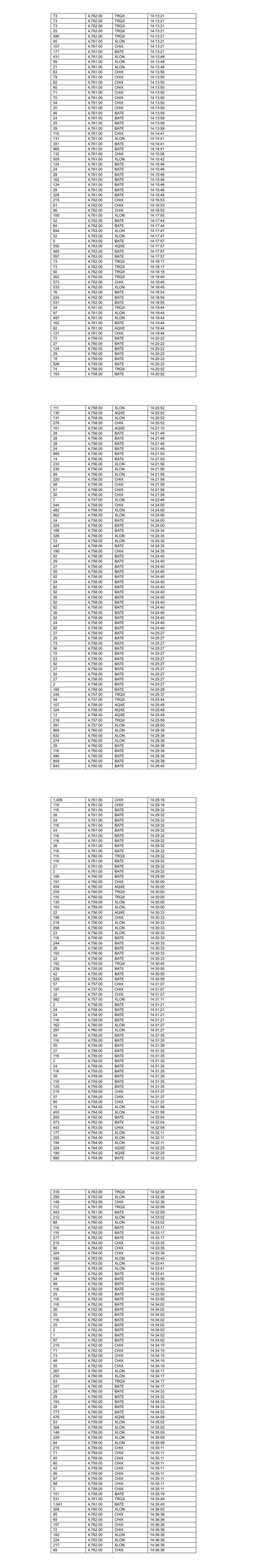 73 4,762.00 TRQX 14:13:21 73 4,762.00 TRQX 14:13:21 73 4,762.00 TRQX 14:13:21 25 4,762.00 TRQX 14:13:21 490 4,762.00 TRQX 14:13:21 45 4,761.00 XLON 14:13:21 107 4,761.00 CHIX 14:13:21 171 4,761.00 BATE 14:13:21 431 4,761.00 XLON 14:13:48 59 4,761.00 XLON 14:13:48 21 4,761.00 XLON 14:13:48 63 4,761.00 CHIX 14:13:50 79 4,761.00 CHIX 14:13:50 62 4,761.00 CHIX 14:13:50 60 4,761.00 CHIX 14:13:50 71 4,761.00 CHIX 14:13:50 70 4,761.00 CHIX 14:13:50 54 4,761.00 CHIX 14:13:50 20 4,761.00 CHIX 14:13:50 46 4,761.00 BATE 14:13:59 24 4,761.00 BATE 14:13:59 25 4,761.00 BATE 14:13:59 29 4,761.00 BATE 14:13:59 115 4,761.00 CHIX 14:14:41 131 4,761.00 XLON 14:14:41 351 4,761.00 BATE 14:14:41 665 4,761.00 BATE 14:14:41 132 4,761.00 CHIX 14:15:06 505 4,761.00 XLON 14:15:42 124 4,761.00 BATE 14:15:46 24 4,761.00 BATE 14:15:46 28 4,761.00 BATE 14:15:46 162 4,761.00 BATE 14:15:46 124 4,761.00 BATE 14:15:46 28 4,761.00 BATE 14:15:46 329 4,761.00 BATE 14:15:46 215 4,762.00 CHIX 14:16:53 61 4,762.00 CHIX 14:16:53 66 4,762.00 CHIX 14:16:53 100 4,761.00 XLON 14:17:05 52 4,762.00 BATE 14:17:44 64 4,762.00 BATE 14:17:44 694 4,763.00 XLON 14:17:47 32 4,763.00 XLON 14:17:47 5 4,763.00 BATE 14:17:57 555 4,763.00 AQXE 14:17:57 485 4,763.00 BATE 14:17:57 557 4,763.00 BATE 14:17:57 73 4,762.00 TRQX 14:18:17 73 4,762.00 TRQX 14:18:17 60 4,762.00 TRQX 14:18:18 262 4,762.00 TRQX 14:18:40 573 4,762.00 CHIX 14:18:40 533 4,762.00 XLON 14:18:45 76 4,762.00 BATE 14:18:54 224 4,762.00 BATE 14:18:54 531 4,762.00 BATE 14:18:55 54 4,761.00 TRQX 14:19:44 97 4,761.00 XLON 14:19:44 497 4,761.00 XLON 14:19:44 162 4,761.00 BATE 14:19:44 62 4,761.00 AQXE 14:19:44 121 4,761.00 CHIX 14:19:44 72 4,759.00 BATE 14:20:22 27 4,760.00 BATE 14:20:22 124 4,760.00 BATE 14:20:22 29 4,760.00 BATE 14:20:22 18 4,759.00 BATE 14:20:22 526 4,759.00 BATE 14:20:22 74 4,758.00 TRQX 14:20:52 153 4,758.00 BATE 14:20:52 111 4,758.00 XLON 14:20:52 130 4,758.00 AQXE 14:20:52 131 4,758.00 XLON 14:20:52 276 4,758.00 CHIX 14:20:52 101 4,756.00 AQXE 14:21:10 28 4,756.00 BATE 14:21:49 28 4,756.00 BATE 14:21:49 28 4,756.00 BATE 14:21:49 24 4,756.00 BATE 14:21:49 685 4,756.00 BATE 14:21:50 14 4,756.00 BATE 14:21:50 233 4,756.00 XLON 14:21:56 230 4,756.00 XLON 14:21:56 68 4,756.00 XLON 14:21:56 220 4,756.00 CHIX 14:21:58 68 4,756.00 CHIX 14:21:58 61 4,756.00 CHIX 14:21:58 30 4,756.00 CHIX 14:21:58 7 4,757.00 XLON 14:22:46 544 4,758.00 CHIX 14:24:00 482 4,758.00 XLON 14:24:00 662 4,758.00 XLON 14:24:00 24 4,758.00 BATE 14:24:00 224 4,758.00 BATE 14:24:00 189 4,758.00 BATE 14:24:34 326 4,758.00 XLON 14:24:35 72 4,758.00 XLON 14:24:35 447 4,758.00 BATE 14:24:35 190 4,758.00 CHIX 14:24:35 92 4,758.00 BATE 14:24:40 29 4,758.00 BATE 14:24:40 27 4,758.00 BATE 14:24:40 55 4,758.00 BATE 14:24:40 92 4,758.00 BATE 14:24:40 24 4,758.00 BATE 14:24:40 92 4,758.00 BATE 14:24:40 92 4,758.00 BATE 14:24:40 26 4,758.00 BATE 14:24:40 92 4,758.00 BATE 14:24:40 92 4,758.00 BATE 14:24:40 26 4,758.00 BATE 14:24:40 92 4,758.00 BATE 14:24:40 24 4,758.00 BATE 14:24:40 92 4,758.00 BATE 14:24:40 27 4,758.00 BATE 14:25:27 29 4,758.00 BATE 14:25:27 73 4,758.00 BATE 14:25:27 36 4,758.00 BATE 14:25:27 72 4,758.00 BATE 14:25:27 23 4,758.00 BATE 14:25:27 92 4,758.00 BATE 14:25:27 27 4,758.00 BATE 14:25:27 92 4,758.00 BATE 14:25:27 27 4,758.00 BATE 14:25:27 2 4,758.00 BATE 14:25:27 166 4,758.00 BATE 14:25:28 246 4,757.00 TRQX 14:25:37 54 4,757.00 TRQX 14:25:44 107 4,758.00 AQXE 14:25:49 324 4,758.00 AQXE 14:25:49 12 4,758.00 AQXE 14:25:49 218 4,757.00 TRQX 14:25:59 391 4,757.00 XLON 14:26:00 968 4,760.00 XLON 14:28:38 632 4,760.00 XLON 14:28:38 274 4,760.00 XLON 14:28:38 29 4,760.00 BATE 14:28:38 116 4,760.00 BATE 14:28:38 495 4,760.00 BATE 14:28:38 859 4,760.00 BATE 14:28:38 843 4,760.00 BATE 14:28:40 1,406 4,761.00 CHIX 14:29:18 119 4,761.00 CHIX 14:29:18 116 4,761.00 BATE 14:29:32 26 4,761.00 BATE 14:29:32 24 4,761.00 BATE 14:29:32 116 4,761.00 BATE 14:29:32 24 4,761.00 BATE 14:29:32 116 4,761.00 BATE 14:29:32 116 4,761.00 BATE 14:29:32 26 4,761.00 BATE 14:29:32 116 4,761.00 BATE 14:29:32 115 4,760.00 TRQX 14:29:32 116 4,761.00 BATE 14:29:32 27 4,761.00 BATE 14:29:32 2 4,761.00 BATE 14:29:32 188 4,760.00 BATE 14:29:59 157 4,760.00 CHIX 14:30:00 454 4,760.00 AQXE 14:30:00 259 4,760.00 TRQX 14:30:00 116 4,760.00 TRQX 14:30:00 135 4,759.00 XLON 14:30:00 153 4,759.00 XLON 14:30:00 22 4,756.00 AQXE 14:30:33 198 4,756.00 CHIX 14:30:33 216 4,756.00 XLON 14:30:33 298 4,756.00 XLON 14:30:33 23 4,756.00 XLON 14:30:33 116 4,756.00 BATE 14:30:33 244 4,756.00 BATE 14:30:33 26 4,756.00 BATE 14:30:33 152 4,756.00 BATE 14:30:33 22 4,756.00 BATE 14:30:33 152 4,755.00 TRQX 14:30:40 238 4,755.00 BATE 14:30:50 42 4,755.00 BATE 14:30:50 529 4,755.00 BATE 14:30:59 57 4,757.00 CHIX 14:31:07 197 4,757.00 CHIX 14:31:07 32 4,757.00 CHIX 14:31:07 582 4,757.00 XLON 14:31:11 2 4,758.00 BATE 14:31:21 24 4,758.00 BATE 14:31:21 24 4,758.00 BATE 14:31:21 116 4,758.00 BATE 14:31:21 162 4,760.00 XLON 14:31:27 297 4,760.00 XLON 14:31:27 49 4,759.00 BATE 14:31:35 116 4,759.00 BATE 14:31:35 25 4,759.00 BATE 14:31:35 27 4,759.00 BATE 14:31:35 116 4,759.00 BATE 14:31:35 2 4,759.00 BATE 14:31:35 24 4,759.00 BATE 14:31:35 116 4,759.00 BATE 14:31:35 28 4,759.00 BATE 14:31:35 116 4,759.00 BATE 14:31:35 125 4,759.00 BATE 14:31:35 215 4,759.00 CHIX 14:31:37 37 4,759.00 CHIX 14:31:37 60 4,759.00 CHIX 14:31:37 15 4,764.00 XLON 14:31:58 453 4,764.00 XLON 14:31:58 200 4,762.00 BATE 14:32:04 573 4,762.00 BATE 14:32:04 443 4,763.00 CHIX 14:32:08 177 4,764.00 XLON 14:32:11 200 4,764.00 XLON 14:32:11 194 4,764.00 XLON 14:32:11 324 4,764.00 AQXE 14:32:25 180 4,764.00 AQXE 14:32:25 695 4,764.00 BATE 14:32:33 318 4,763.00 TRQX 14:32:36 250 4,763.00 XLON 14:32:36 149 4,763.00 CHIX 14:32:36 112 4,761.00 TRQX 14:32:59 453 4,761.00 BATE 14:32:59 212 4,760.00 XLON 14:33:02 68 4,760.00 XLON 14:33:02 116 4,762.00 BATE 14:33:17 116 4,762.00 BATE 14:33:17 277 4,762.00 BATE 14:33:17 215 4,764.00 CHIX 14:33:35 60 4,764.00 CHIX 14:33:35 324 4,764.00 CHIX 14:33:35 456 4,763.