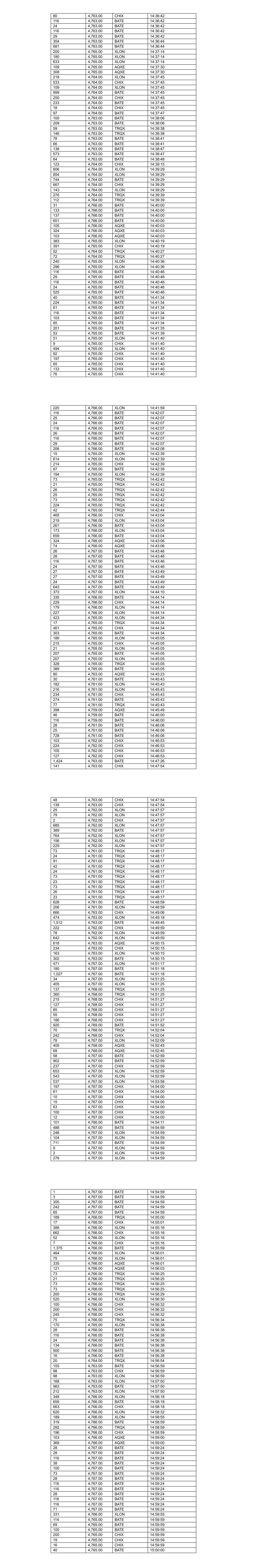 25 4,771.00 BATE 12:29:48 27 4,771.00 BATE 12:29:48 100 4,771.00 BATE 12:29:48 187 4,771.00 BATE 12:29:48 29 4,771.00 BATE 12:29:48 187 4,771.00 BATE 12:29:48 28 4,771.00 BATE 12:29:48 111 4,771.00 BATE 12:29:48 314 4,772.00 XLON 12:33:38 33 4,772.00 CHIX 12:33:38 119 4,772.00 XLON 12:33:38 63 4,772.00 CHIX 12:33:38 151 4,772.00 XLON 12:33:38 152 4,772.00 CHIX 12:33:38 530 4,772.00 XLON 12:33:38 230 4,772.00 XLON 12:33:38 211 4,772.00 XLON 12:33:38 62 4,772.00 XLON 12:33:38 215 4,772.00 CHIX 12:33:38 42 4,772.00 CHIX 12:33:38 83 4,772.00 XLON 12:33:38 32 4,772.00 CHIX 12:33:39 331 4,772.00 CHIX 12:33:39 25 4,772.00 BATE 12:33:39 197 4,772.00 BATE 12:33:39 137 4,772.00 BATE 12:33:39 463 4,772.00 BATE 12:33:47 28 4,771.00 BATE 12:33:58 28 4,771.00 BATE 12:33:58 24 4,771.00 BATE 12:34:01 24 4,771.00 BATE 12:34:01 24 4,771.00 BATE 12:34:01 111 4,772.00 BATE 12:34:27 1,220 4,772.00 BATE 12:34:45 114 4,772.00 BATE 12:34:49 30 4,772.00 BATE 12:34:51 28 4,772.00 BATE 12:35:07 83 4,771.00 TRQX 12:35:08 271 4,771.00 AQXE 12:35:29 101 4,771.00 AQXE 12:35:29 98 4,772.00 AQXE 12:35:29 420 4,771.00 TRQX 12:35:30 72 4,771.00 XLON 12:35:41 33 4,771.00 XLON 12:35:41 31 4,771.00 XLON 12:35:41 230 4,771.00 XLON 12:35:41 67 4,771.00 XLON 12:35:41 506 4,770.00 BATE 12:35:42 59 4,770.00 CHIX 12:35:42 87 4,770.00 XLON 12:35:42 57 4,770.00 CHIX 12:35:42 101 4,770.00 XLON 12:35:42 230 4,770.00 XLON 12:35:42 133 4,770.00 XLON 12:35:42 443 4,770.00 XLON 12:35:42 65 4,770.00 XLON 12:35:42 214 4,770.00 XLON 12:35:42 211 4,770.00 XLON 12:35:42 101 4,770.00 XLON 12:35:42 85 4,770.00 XLON 12:35:42 132 4,770.00 XLON 12:35:52 139 4,770.00 XLON 12:35:57 66 4,771.00 CHIX 12:36:14 391 4,771.00 CHIX 12:36:19 124 4,770.00 XLON 12:37:02 230 4,770.00 XLON 12:37:02 130 4,770.00 XLON 12:37:02 31 4,771.00 BATE 12:37:04 187 4,771.00 BATE 12:37:04 27 4,771.00 BATE 12:37:04 29 4,771.00 BATE 12:37:04 100 4,771.00 BATE 12:37:04 26 4,771.00 BATE 12:37:04 117 4,771.00 BATE 12:37:08 35 4,771.00 BATE 12:37:10 31 4,771.00 BATE 12:37:14 131 4,771.00 BATE 12:37:20 587 4,771.00 XLON 12:37:40 123 4,771.00 XLON 12:38:14 330 4,771.00 XLON 12:38:14 17 4,770.00 XLON 12:38:15 162 4,770.00 BATE 12:38:15 127 4,770.00 XLON 12:38:15 250 4,770.00 XLON 12:38:15 443 4,770.00 XLON 12:38:15 230 4,770.00 XLON 12:38:15 133 4,770.00 XLON 12:38:15 159 4,770.00 XLON 12:38:52 138 4,770.00 XLON 12:38:52 160 4,770.00 XLON 12:39:08 162 4,770.00 XLON 12:39:13 505 4,770.00 XLON 12:39:14 597 4,770.00 XLON 12:39:18 537 4,770.00 CHIX 12:39:50 67 4,770.00 CHIX 12:39:50 38 4,770.00 CHIX 12:39:50 145 4,770.00 XLON 12:39:50 20 4,770.00 BATE 12:39:51 148 4,770.00 XLON 12:39:55 138 4,770.00 XLON 12:39:55 54 4,770.00 BATE 12:40:05 572 4,770.00 XLON 12:40:09 46 4,770.00 BATE 12:40:10 88 4,770.00 CHIX 12:41:07 455 4,770.00 XLON 12:41:07 1,461 4,770.00 BATE 12:41:07 108 4,770.00 XLON 12:41:08 206 4,770.00 XLON 12:41:08 79 4,770.00 XLON 12:41:08 95 4,770.00 XLON 12:41:08 21 4,769.00 XLON 12:41:12 39 4,769.00 TRQX 12:41:12 112 4,770.00 XLON 12:41:12 119 4,770.00 XLON 12:41:12 248 4,770.00 XLON 12:41:12 108 4,770.00 XLON 12:41:12 443 4,770.00 XLON 12:41:12 230 4,770.00 XLON 12:41:12 129 4,770.00 XLON 12:41:12 79 4,770.00 XLON 12:41:12 357 4,770.00 XLON 12:41:12 279 4,770.00 XLON 12:41:12 205 4,770.00 XLON 12:41:12 111 4,770.00 XLON 12:41:12 382 4,770.00 XLON 12:41:12 257 4,770.00 XLON 12:41:12 79 4,769.00 XLON 12:41:20 133 4,769.00 XLON 12:41:20 287 4,769.00 XLON 12:41:20 16 4,768.00 AQXE 12:42:43 828 4,769.00 BATE 12:42:59 17 4,768.00 AQXE 12:43:01 72 4,768.00 XLON 12:43:05 36 4,768.00 XLON 12:43:05 43 4,768.00 XLON 12:43:05 108 4,768.00 CHIX 12:43:05 313 4,768.00 AQXE 12:43:05 352 4,768.00 TRQX 12:43:05 78 4,768.00 CHIX 12:43:05 208 4,766.00 XLON 12:44:43 274 4,766.00 XLON 12:44:43 125 4,766.00 AQXE 12:44:43 209 4,766.00 CHIX 12:44:43 118 4,766.00 TRQX 12:44:43 326 4,766.00 CHIX 12:44:43 154 4,766.00 BATE 12:44:43 97 4,764.00 CHIX 12:45:26 234 4,764.00 XLON 12:45:26 245 4,764.00 XLON 12:45:26 104 4,764.00 TRQX 12:45:26 796 4,764.00 BATE 12:45:26 84 4,764.00 AQXE 12:45:26 42 4,763.00 BATE 12:46:58 451 4,763.00 CHIX 12:47:44 796 4,763.00 BATE 12:47:44 26 4,763.00 XLON 12:47:57 111 4,764.00 XLON 12:49:08 111 4,764.00 XLON 12:49:08 144 4,765.00 BATE 12:49:08 111 4,765.00 XLON 12:49:08 23 4,765.00 BATE 12:49:09 119 4,765.00 XLON 12:49:11 130 4,765.00 XLON 12:49:11 119 4,765.00 XLON 12:49:11 569 4,765.00 BATE 12:49:12 63 4,765.00 BATE 12:49:12 100 4,765.00 BATE 12:49:12 17 4,765.00 BATE 12:49:13 230 4,765.00 XLON 12:49:13 47 4,765.00 BATE 12:49:13 375 4,765.00 XLON 12:49:13 28 4,764.00 CHIX 12:49:57 25 4,764.00 CHIX 12:49:57 2 4,764.00 CHIX 12:49:57 2 4,764.00 CHIX 12:49:57 16 4,764.00 CHIX 12:49:58 146 4,764.00 CHIX 12:50:00 235 4,764.00 CHIX 12:50:00 27 4,764.00 BATE 12:50:39 27 4,764.00 BATE 12:50:39 27 4,764.00 BATE 12:50:39 24 4,764.00 BATE 12:50:42 27 4,764.00 BATE 12:50:42 26 4,764.00 BATE 12:50:42 293 4,766.00 BATE 12:50:58 92 4,766.00 BATE 12:51:05 419 4,766.00 BATE 12:51:08 266 4,766.00 AQXE 12:51:46 98 4,766.00 AQXE 12:51:46 103 4,766.00 AQXE 12:51:46 1 4,766.00 AQXE 12:51:46 117 4,766.00 XLON 12:51:49 271 4,766.00 XLON 12:51:49 126 4,766.00 XLON 12:51:57 338 4,766.00 XLON 12:51:57 25 4,766.00 CHIX 12:52:29 2 4,766.00 CHIX 12:52:29 40 4,766.00 CHIX 12:52:29 2 4,766.00 CHIX 12:52:29 301 4,766.00 CHIX 12:52:29 807 4,766.00 BATE 12:52:35 150 4,765.00 XLON 12:54:02 759 4,766.00 BATE 12:54:25 796 4,767.00 XLON 12:58:37 674 4,767.00 XLON 12:58:37 108 4,767.00 XLON 12:58:37 797 4,767.00 TRQX 12:58:41 905 4,767.00 CHIX 12:58:41 29 4,767.00 BATE 12:58:41 105 4,767.00 BATE 12:58:41 26 4,767.00 BATE 12:58:41 102 4,767.00 AQXE 12:58:53 94 4,767.00 AQXE 12:58:53 274 4,767.00 AQXE 12:59:01 61 4,767.00 CHIX 12:59:06 65 4,767.00 CHIX 12:59:09 63 4,767.00 CHIX 12:59:09 65 4,767.00 CHIX 12:59:09 281 4,767.00 CHIX 12:59:09 26 4,767.00 BATE 12:59:11 27 4,767.00 BATE 12:59:26 27 4,767.00 BATE 12:59:26 105 4,767.00 BATE 12:59:26 27 4,767.00 BATE 12:59:26 105 4,767.00 BATE 12:59:26 29 4,767.00 BATE 1