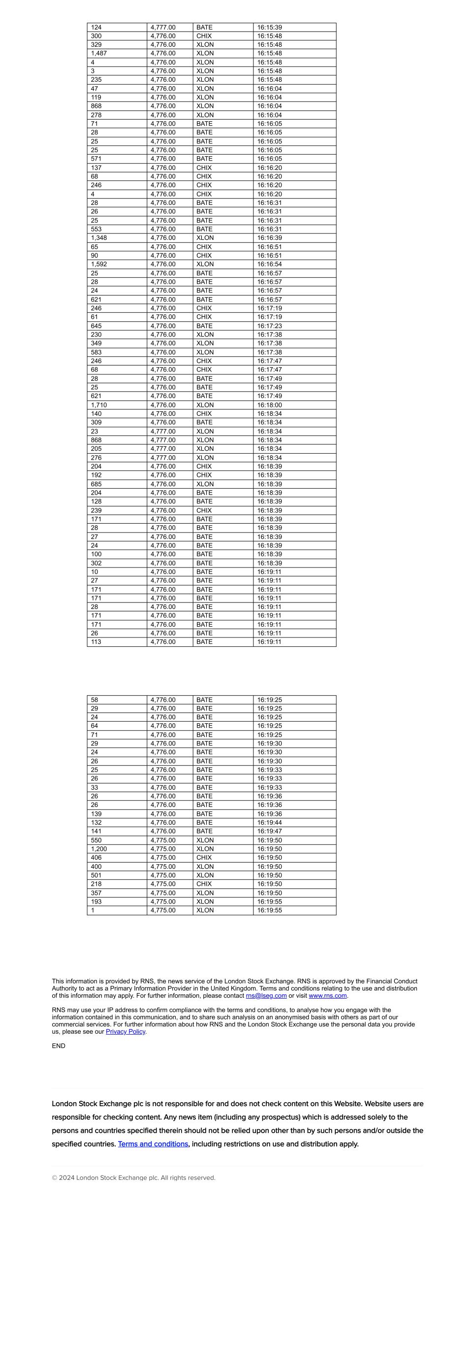 124 4,777.00 BATE 16:15:39 300 4,776.00 CHIX 16:15:48 329 4,776.00 XLON 16:15:48 1,487 4,776.00 XLON 16:15:48 4 4,776.00 XLON 16:15:48 3 4,776.00 XLON 16:15:48 235 4,776.00 XLON 16:15:48 47 4,776.00 XLON 16:16:04 119 4,776.00 XLON 16:16:04 868 4,776.00 XLON 16:16:04 278 4,776.00 XLON 16:16:04 71 4,776.00 BATE 16:16:05 28 4,776.00 BATE 16:16:05 25 4,776.00 BATE 16:16:05 25 4,776.00 BATE 16:16:05 571 4,776.00 BATE 16:16:05 137 4,776.00 CHIX 16:16:20 68 4,776.00 CHIX 16:16:20 246 4,776.00 CHIX 16:16:20 4 4,776.00 CHIX 16:16:20 28 4,776.00 BATE 16:16:31 26 4,776.00 BATE 16:16:31 25 4,776.00 BATE 16:16:31 553 4,776.00 BATE 16:16:31 1,348 4,776.00 XLON 16:16:39 65 4,776.00 CHIX 16:16:51 90 4,776.00 CHIX 16:16:51 1,592 4,776.00 XLON 16:16:54 25 4,776.00 BATE 16:16:57 28 4,776.00 BATE 16:16:57 24 4,776.00 BATE 16:16:57 621 4,776.00 BATE 16:16:57 246 4,776.00 CHIX 16:17:19 61 4,776.00 CHIX 16:17:19 645 4,776.00 BATE 16:17:23 230 4,776.00 XLON 16:17:38 349 4,776.00 XLON 16:17:38 583 4,776.00 XLON 16:17:38 246 4,776.00 CHIX 16:17:47 68 4,776.00 CHIX 16:17:47 28 4,776.00 BATE 16:17:49 25 4,776.00 BATE 16:17:49 621 4,776.00 BATE 16:17:49 1,710 4,776.00 XLON 16:18:00 140 4,776.00 CHIX 16:18:34 309 4,776.00 BATE 16:18:34 23 4,777.00 XLON 16:18:34 868 4,777.00 XLON 16:18:34 205 4,777.00 XLON 16:18:34 276 4,777.00 XLON 16:18:34 204 4,776.00 CHIX 16:18:39 192 4,776.00 CHIX 16:18:39 685 4,776.00 XLON 16:18:39 204 4,776.00 BATE 16:18:39 128 4,776.00 BATE 16:18:39 239 4,776.00 CHIX 16:18:39 171 4,776.00 BATE 16:18:39 28 4,776.00 BATE 16:18:39 27 4,776.00 BATE 16:18:39 24 4,776.00 BATE 16:18:39 100 4,776.00 BATE 16:18:39 302 4,776.00 BATE 16:18:39 10 4,776.00 BATE 16:19:11 27 4,776.00 BATE 16:19:11 171 4,776.00 BATE 16:19:11 171 4,776.00 BATE 16:19:11 28 4,776.00 BATE 16:19:11 171 4,776.00 BATE 16:19:11 171 4,776.00 BATE 16:19:11 26 4,776.00 BATE 16:19:11 113 4,776.00 BATE 16:19:11 58 4,776.00 BATE 16:19:25 29 4,776.00 BATE 16:19:25 24 4,776.00 BATE 16:19:25 64 4,776.00 BATE 16:19:25 71 4,776.00 BATE 16:19:25 29 4,776.00 BATE 16:19:30 24 4,776.00 BATE 16:19:30 26 4,776.00 BATE 16:19:30 25 4,776.00 BATE 16:19:33 26 4,776.00 BATE 16:19:33 33 4,776.00 BATE 16:19:33 26 4,776.00 BATE 16:19:36 26 4,776.00 BATE 16:19:36 139 4,776.00 BATE 16:19:36 132 4,776.00 BATE 16:19:44 141 4,776.00 BATE 16:19:47 550 4,775.00 XLON 16:19:50 1,200 4,775.00 XLON 16:19:50 406 4,775.00 CHIX 16:19:50 400 4,775.00 XLON 16:19:50 501 4,775.00 XLON 16:19:50 218 4,775.00 CHIX 16:19:50 357 4,775.00 XLON 16:19:50 193 4,775.00 XLON 16:19:55 1 4,775.00 XLON 16:19:55 This information is provided by RNS, the news service of the London Stock Exchange. RNS is approved by the Financial Conduct Authority to act as a Primary Information Provider in the United Kingdom. Terms and conditions relating to the use and distribution of this information may apply. For further information, please contact rns@lseg.com or visit www.rns.com. RNS may use your IP address to confirm compliance with the terms and conditions, to analyse how you engage with the information contained in this communication, and to share such analysis on an anonymised basis with others as part of our commercial services. For further information about how RNS and the London Stock Exchange use the personal data you provide us, please see our Privacy Policy. END London Stock Exchange plc is not responsible for and does not check content on this Website. Website users are responsible for checking content. Any news item (including any prospectus) which is addressed solely to the persons and countries specified therein should not be relied upon other than by such persons and/or outside the specified countries. Terms and conditions, including restrictions on use and distribution apply. © 2024 London Stock Exchange plc. All rights reserved.