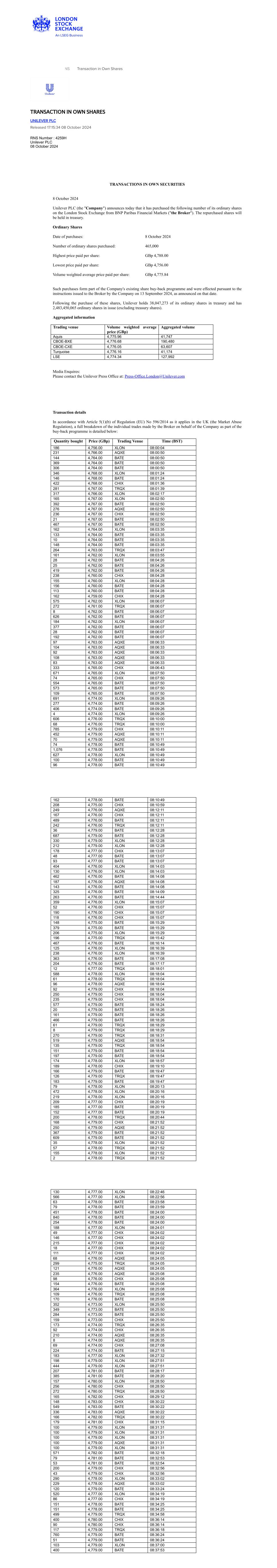 RNS Transaction in Own Shares TRANSACTION IN OWN SHARES UNILEVER PLC Released 17:15:34 08 October 2024 RNS Number : 4259H Unilever PLC 08 October 2024 TRANSACTIONS IN OWN SECURITIES 8 October 2024 Unilever PLC (the "Company") announces today that it has purchased the following number of its ordinary shares on the London Stock Exchange from BNP Paribas Financial Markets ("the Broker"). The repurchased shares will be held in treasury. Ordinary Shares Date of purchases: 8 October 2024 Number of ordinary shares purchased: 465,000 Highest price paid per share: GBp 4,788.00 Lowest price paid per share: GBp 4,756.00 Volume weighted average price paid per share: GBp 4,775.84 Such purchases form part of the Company's existing share buy-back programme and were effected pursuant to the instructions issued to the Broker by the Company on 13 September 2024, as announced on that date. Following the purchase of these shares, Unilever holds 38,047,273 of its ordinary shares in treasury and has 2,483,450,065 ordinary shares in issue (excluding treasury shares). Aggregated information Trading venue Volume weighted average price (GBp) Aggregated volume Aquis 4,775.96 41,747 CBOE-BXE 4,776.68 190,480 CBOE-CXE 4,776.05 63,607 Turquoise 4,776.16 41,174 LSE 4,774.34 127,992 Media Enquires: Please contact the Unilever Press Office at: Press-Office.London@Unilever.com Transaction details In accordance with Article 5(1)(b) of Regulation (EU) No 596/2014 as it applies in the UK (the Market Abuse Regulation), a full breakdown of the individual trades made by the Broker on behalf of the Company as part of the buy-back programme is detailed below: Quantity bought Price (GBp) Trading Venue Time (BST) 186 4,756.00 XLON 08:00:04 231 4,766.00 AQXE 08:00:50 144 4,764.00 BATE 08:00:50 369 4,764.00 BATE 08:00:50 306 4,764.00 BATE 08:00:50 346 4,768.00 XLON 08:01:24 146 4,768.00 BATE 08:01:24 422 4,768.00 CHIX 08:01:36 281 4,767.00 TRQX 08:01:39 317 4,766.00 XLON 08:02:17 165 4,767.00 XLON 08:02:50 392 4,767.00 BATE 08:02:50 276 4,767.00 AQXE 08:02:50 236 4,767.00 CHIX 08:02:50 21 4,767.00 BATE 08:02:50 467 4,767.00 BATE 08:02:50 162 4,764.00 XLON 08:03:35 133 4,764.00 BATE 08:03:35 10 4,764.00 BATE 08:03:35 148 4,764.00 BATE 08:03:35 264 4,763.00 TRQX 08:03:47 161 4,762.00 XLON 08:03:55 28 4,762.00 BATE 08:04:26 25 4,762.00 BATE 08:04:26 419 4,762.00 BATE 08:04:26 238 4,760.00 CHIX 08:04:28 155 4,760.00 XLON 08:04:28 156 4,760.00 BATE 08:04:28 113 4,760.00 BATE 08:04:28 162 4,759.00 CHIX 08:04:28 575 4,762.00 XLON 08:06:07 272 4,761.00 TRQX 08:06:07 8 4,762.00 BATE 08:06:07 626 4,762.00 BATE 08:06:07 184 4,762.00 XLON 08:06:07 377 4,762.00 BATE 08:06:07 28 4,762.00 BATE 08:06:07 192 4,762.00 BATE 08:06:07 97 4,763.00 AQXE 08:06:33 104 4,763.00 AQXE 08:06:33 92 4,763.00 AQXE 08:06:33 108 4,763.00 AQXE 08:06:33 83 4,763.00 AQXE 08:06:33 333 4,765.00 CHIX 08:06:43 671 4,765.00 XLON 08:07:50 74 4,765.00 CHIX 08:07:50 554 4,765.00 BATE 08:07:50 573 4,765.00 BATE 08:07:50 109 4,765.00 BATE 08:07:50 691 4,774.00 XLON 08:09:26 277 4,774.00 BATE 08:09:26 406 4,774.00 BATE 08:09:26 4 4,774.00 XLON 08:09:26 606 4,776.00 TRQX 08:10:00 68 4,776.00 TRQX 08:10:00 785 4,779.00 CHIX 08:10:11 452 4,779.00 AQXE 08:10:11 70 4,779.00 AQXE 08:10:11 74 4,778.00 BATE 08:10:49 1,076 4,778.00 BATE 08:10:49 627 4,778.00 XLON 08:10:49 100 4,778.00 BATE 08:10:49 96 4,778.00 BATE 08:10:49 162 4,778.00 BATE 08:10:49 208 4,775.00 CHIX 08:10:59 249 4,776.00 AQXE 08:12:11 167 4,776.00 CHIX 08:12:11 489 4,776.00 BATE 08:12:11 242 4,776.00 TRQX 08:12:11 36 4,779.00 BATE 08:12:28 687 4,779.00 BATE 08:12:28 330 4,779.00 XLON 08:12:28 212 4,779.00 XLON 08:12:28 178 4,777.00 CHIX 08:13:07 48 4,777.00 BATE 08:13:07 93 4,777.00 BATE 08:13:07 404 4,776.00 XLON 08:14:03 130 4,776.00 XLON 08:14:03 462 4,776.00 BATE 08:14:08 187 4,776.00 AQXE 08:14:08 143 4,776.00 BATE 08:14:08 325 4,776.00 BATE 08:14:09 263 4,776.00 BATE 08:14:44 359 4,776.00 XLON 08:15:07 52 4,776.00 CHIX 08:15:07 190 4,776.00 CHIX 08:15:07 118 4,776.00 CHIX 08:15:07 148 4,775.00 BATE 08:15:29 379 4,775.00 BATE 08:15:29 206 4,775.00 XLON 08:15:29 196 4,775.00 TRQX 08:15:42 467 4,776.00 BATE 08:16:14 125 4,776.00 XLON 08:16:39 238 4,776.00 XLON 08:16:39 363 4,776.00 BATE 08:17:08 204 4,776.00 BATE 08:17:17 12 4,777.00 TRQX 08:18:01 588 4,778.00 XLON 08:18:04 61 4,778.00 TRQX 08:18:04 96 4,778.00 AQXE 08:18:04 92 4,779.00 CHIX 08:18:04 250 4,779.00 CHIX 08:18:04 235 4,779.00 CHIX 08:18:04 577 4,779.00 BATE 08:18:24 20 4,779.00 BATE 08:18:26 161 4,779.00 BATE 08:18:26 466 4,779.00 BATE 08:18:26 61 4,779.00 TRQX 08:18:29 8 4,779.00 TRQX 08:18:29 270 4,779.00 TRQX 08:18:31 519 4,779.00 AQXE 08:18:54 135 4,779.00 TRQX 08:18:54 151 4,779.00 BATE 08:18:54 197 4,779.00 BATE 08:18:54 174 4,778.00 XLON 08:18:57 189 4,778.00 CHIX 08:19:10 166 4,779.00 BATE 08:19:47 126 4,779.00 TRQX 08:19:47 183 4,779.00 BATE 08:19:47 79 4,778.00 XLON 08:20:13 472 4,778.00 XLON 08:20:16 219 4,778.00 XLON 08:20:16 209 4,777.00 CHIX 08:20:19 185 4,777.00 BATE 08:20:19 152 4,777.00 BATE 08:20:19 200 4,778.00 TRQX 08:20:44 168 4,779.00 CHIX 08:21:52 250 4,779.00 AQXE 08:21:52 367 4,779.00 BATE 08:21:52 609 4,779.00 BATE 08:21:52 35 4,778.00 XLON 08:21:52 57 4,778.00 TRQX 08:21:52 155 4,778.00 XLON 08:21:52 2 4,778.00 TRQX 08:21:52 130 4,777.00 XLON 08:22:46 566 4,777.00 XLON 08:22:56 63 4,778.00 BATE 08:23:58 79 4,778.00 BATE 08:23:59 451 4,778.00 BATE 08:24:00 840 4,778.00 BATE 08:24:00 254 4,778.00 BATE 08:24:00 188 4,777.00 XLON 08:24:01 49 4,777.00 CHIX 08:24:02 146 4,777.00 CHIX 08:24:02 215 4,777.00 CHIX 08:24:02 18 4,777.00 CHIX 08:24:02 111 4,777.00 CHIX 08:24:02 68 4,776.00 AQXE 08:24:05 299 4,775.00 TRQX 08:24:05 121 4,776.00 AQXE 08:24:05 235 4,776.00 AQXE 08:25:08 98 4,776.00 CHIX 08:25:08 154 4,776.00 BATE 08:25:08 364 4,776.00 XLON 08:25:08 109 4,776.00 TRQX 08:25:08 170 4,776.00 BATE 08:25:08 352 4,773.00 XLON 08:25:50 349 4,773.00 BATE 08:25:50 284 4,773.00 BATE 08:25:50 159 4,773.00 CHIX 08:25:50 173 4,774.00 TRQX 0