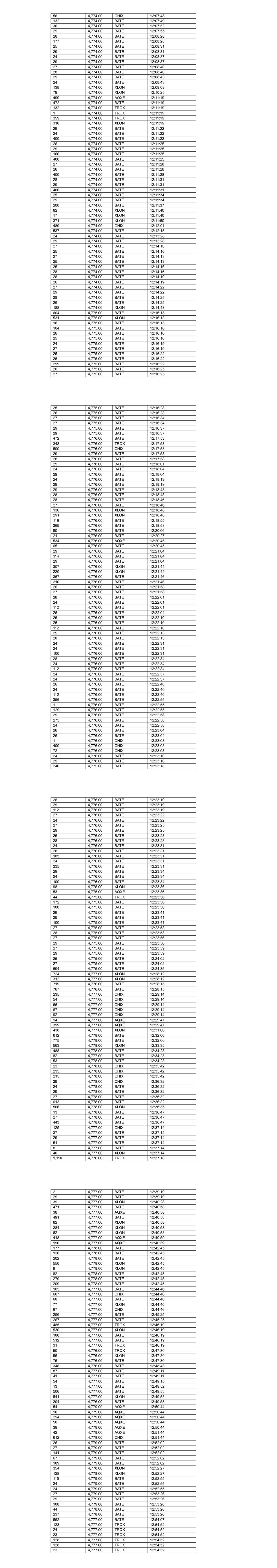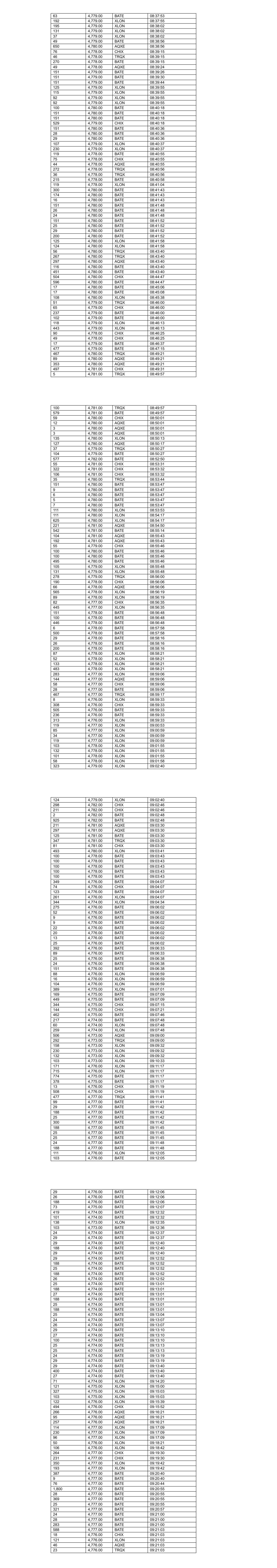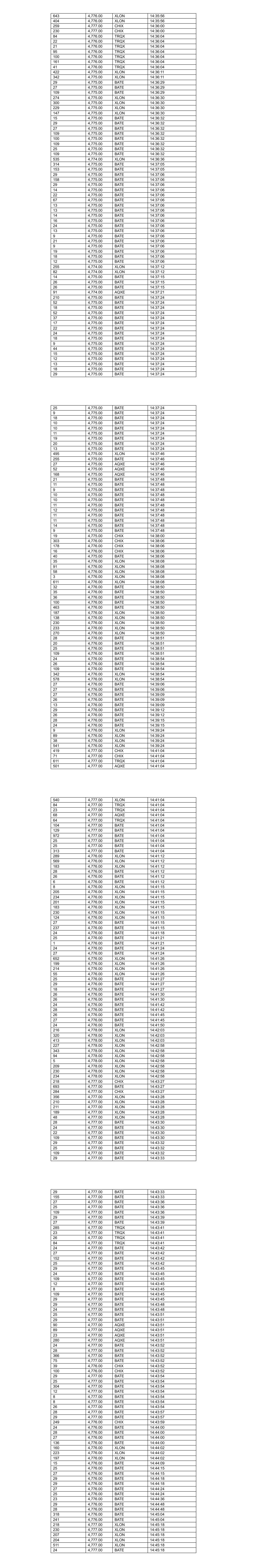 28 4,772.00 BATE 11:41:17 27 4,772.00 BATE 11:41:17 29 4,772.00 BATE 11:41:20 25 4,772.00 BATE 11:41:20 168 4,772.00 BATE 11:41:20 26 4,772.00 BATE 11:41:20 26 4,772.00 BATE 11:41:20 28 4,772.00 BATE 11:41:20 26 4,772.00 BATE 11:41:23 28 4,772.00 BATE 11:41:23 29 4,772.00 BATE 11:41:26 28 4,772.00 BATE 11:41:26 26 4,772.00 BATE 11:41:26 26 4,772.00 BATE 11:41:26 24 4,772.00 BATE 11:41:29 24 4,772.00 BATE 11:41:29 29 4,772.00 BATE 11:41:32 26 4,772.00 BATE 11:41:32 27 4,772.00 BATE 11:41:35 26 4,772.00 BATE 11:41:35 53 4,772.00 BATE 11:41:35 28 4,772.00 BATE 11:41:35 28 4,772.00 BATE 11:41:35 30 4,771.00 BATE 11:41:35 229 4,771.00 AQXE 11:41:35 114 4,771.00 TRQX 11:41:35 526 4,771.00 CHIX 11:41:35 441 4,771.00 BATE 11:41:35 91 4,771.00 XLON 11:41:35 332 4,771.00 AQXE 11:41:35 81 4,771.00 AQXE 11:41:35 28 4,773.00 BATE 11:43:55 24 4,773.00 BATE 11:43:55 34 4,773.00 BATE 11:44:01 29 4,773.00 BATE 11:44:01 27 4,773.00 BATE 11:44:01 24 4,773.00 BATE 11:44:07 25 4,773.00 BATE 11:44:07 29 4,773.00 BATE 11:44:10 25 4,773.00 BATE 11:44:10 27 4,773.00 BATE 11:44:13 27 4,773.00 BATE 11:44:13 26 4,773.00 BATE 11:44:19 27 4,773.00 BATE 11:44:19 27 4,773.00 BATE 11:44:22 24 4,773.00 BATE 11:44:22 28 4,773.00 BATE 11:44:25 24 4,773.00 BATE 11:44:25 29 4,773.00 BATE 11:44:37 28 4,773.00 BATE 11:44:37 25 4,773.00 BATE 11:44:40 24 4,773.00 BATE 11:44:43 24 4,773.00 BATE 11:44:46 29 4,773.00 BATE 11:44:46 659 4,773.00 XLON 11:45:14 263 4,773.00 CHIX 11:45:14 500 4,773.00 XLON 11:48:08 514 4,776.00 CHIX 11:50:51 495 4,776.00 AQXE 11:50:51 515 4,776.00 XLON 11:50:51 64 4,776.00 TRQX 11:50:51 561 4,776.00 TRQX 11:50:51 29 4,776.00 BATE 11:50:53 24 4,776.00 BATE 11:50:53 158 4,776.00 BATE 11:50:53 26 4,776.00 BATE 11:50:56 27 4,776.00 BATE 11:50:56 3 4,776.00 BATE 11:50:56 21 4,776.00 BATE 11:50:56 27 4,776.00 BATE 11:51:05 26 4,776.00 BATE 11:51:05 3 4,776.00 BATE 11:51:05 28 4,776.00 BATE 11:51:08 28 4,776.00 BATE 11:51:08 27 4,776.00 BATE 11:51:47 204 4,776.00 BATE 11:51:47 26 4,776.00 BATE 11:51:47 100 4,776.00 BATE 11:51:47 451 4,776.00 XLON 11:52:52 26 4,776.00 BATE 11:52:56 26 4,776.00 BATE 11:53:17 29 4,776.00 BATE 11:53:17 29 4,776.00 BATE 11:53:44 24 4,776.00 BATE 11:53:44 29 4,776.00 BATE 11:53:47 29 4,776.00 BATE 11:53:47 28 4,776.00 BATE 11:54:17 26 4,776.00 BATE 11:54:17 16 4,776.00 BATE 11:54:20 26 4,776.00 BATE 11:54:20 25 4,776.00 BATE 11:54:20 24 4,776.00 BATE 11:54:26 28 4,776.00 BATE 11:54:26 28 4,776.00 BATE 11:54:32 28 4,776.00 BATE 11:54:32 25 4,776.00 BATE 11:54:50 28 4,776.00 BATE 11:54:50 26 4,776.00 BATE 11:54:53 28 4,776.00 BATE 11:54:53 14 4,776.00 CHIX 11:55:10 50 4,776.00 CHIX 11:55:10 108 4,776.00 CHIX 11:55:10 145 4,776.00 XLON 11:55:27 401 4,776.00 XLON 11:55:27 24 4,776.00 BATE 11:55:29 29 4,776.00 BATE 11:55:29 27 4,776.00 BATE 11:55:32 27 4,776.00 BATE 11:55:32 27 4,776.00 BATE 11:55:35 28 4,776.00 BATE 11:55:35 24 4,776.00 BATE 11:55:38 29 4,776.00 BATE 11:55:38 27 4,776.00 BATE 11:55:41 27 4,776.00 BATE 11:55:41 3 4,776.00 BATE 11:55:41 24 4,776.00 BATE 11:55:44 27 4,776.00 BATE 11:55:44 77 4,775.00 TRQX 11:55:45 70 4,775.00 AQXE 11:55:45 44 4,775.00 CHIX 11:55:45 24 4,775.00 BATE 11:55:47 130 4,775.00 BATE 11:55:47 24 4,775.00 BATE 11:55:47 24 4,775.00 BATE 11:56:08 25 4,775.00 BATE 11:56:08 24 4,775.00 BATE 11:56:11 24 4,775.00 BATE 11:56:11 17 4,775.00 BATE 11:56:11 17 4,775.00 BATE 11:56:11 17 4,775.00 BATE 11:56:11 29 4,775.00 BATE 11:56:11 27 4,775.00 BATE 11:56:14 24 4,775.00 BATE 11:56:14 110 4,775.00 BATE 11:56:14 27 4,775.00 BATE 11:56:17 27 4,775.00 BATE 11:56:17 28 4,775.00 BATE 11:56:20 24 4,775.00 BATE 11:56:20 17 4,775.00 BATE 11:56:20 17 4,775.00 BATE 11:56:20 24 4,775.00 BATE 11:56:20 110 4,774.00 XLON 11:56:22 335 4,774.00 CHIX 11:56:22 329 4,774.00 AQXE 11:56:22 329 4,774.00 TRQX 11:56:22 438 4,774.00 BATE 11:56:22 403 4,774.00 BATE 11:56:22 25 4,774.00 BATE 11:56:27 24 4,774.00 BATE 11:56:27 1,175 4,774.00 BATE 11:56:42 30 4,774.00 BATE 11:56:45 17 4,774.00 BATE 11:56:48 289 4,774.00 BATE 11:56:48 17 4,774.00 BATE 11:56:48 17 4,774.00 BATE 11:56:48 29 4,774.00 BATE 11:56:48 24 4,774.00 BATE 11:57:09 25 4,774.00 BATE 11:57:09 25 4,774.00 BATE 11:57:12 26 4,774.00 BATE 11:57:12 26 4,774.00 BATE 11:57:15 27 4,774.00 BATE 11:57:15 528 4,776.00 BATE 11:58:07 24 4,776.00 BATE 11:58:09 26 4,776.00 BATE 11:58:09 23 4,776.00 BATE 11:58:09 24 4,776.00 BATE 11:58:12 27 4,776.00 BATE 11:58:12 29 4,776.00 XLON 11:58:37 440 4,776.00 XLON 11:58:37 41 4,776.00 XLON 11:58:37 94 4,776.00 BATE 11:58:39 28 4,776.00 BATE 11:58:42 28 4,776.00 BATE 11:58:42 29 4,776.00 BATE 11:59:12 28 4,776.00 BATE 11:59:12 24 4,776.00 BATE 11:59:15 26 4,776.00 BATE 11:59:15 28 4,776.00 BATE 11:59:18 27 4,776.00 BATE 11:59:18 25 4,776.00 BATE 11:59:21 25 4,776.00 BATE 11:59:21 26 4,776.00 BATE 11:59:24 24 4,776.00 BATE 11:59:24 28 4,776.00 BATE 11:59:27 24 4,776.00 BATE 11:59:27 24 4,776.00 BATE 11:59:33 27 4,776.00 BATE 11:59:33 27 4,776.00 BATE 11:59:36 26 4,776.00 BATE 11:59:36 28 4,776.00 BATE 11:59:39 24 4,776.00 BATE 11:59:39 26 4,776.00 BATE 11:59:42 24 4,776.00 BATE 11:59:42 26 4,776.00 BATE 11:59:45 26 4,776.00 BATE 11:59:45 29 4,776.00 BATE 11:59:48 29 4,776.00 BATE 11:59:48 3 4,776.00 BATE 11:59:48 26 4,776.00 BATE 11:59:48 25 4,776.00 BATE 11:59:51 28 4,776.00 BATE 11:59:51 83 4,776.00 BATE 11:59:51 24 4,776.00 BATE 12:00:06 26 4,776.00 BATE 12:00:06 27 4,776.00 BATE 12:00:09 29 4,776.00 BATE 12:00:09 28 4,776.00 BATE 12:00:15 24 4,776.00 BATE 12:00:15 26 4,776.00 BATE 12:00:18 24 4,776.00 BATE 12:00:18 26 4,776.00 BATE 12:00:21 26 4,776.00 BATE 12:00:21 25 4,776.00 BATE 12:00:24 26 4,776.00 BATE 12:00:24 37 4,775.00 BATE 12:00:27 27 4,776.00 BATE 12:00:33 29 4,776.00 BATE 12:00:33 33 4,775.00 CHIX 12:00:45 456 4,775.00 CHIX 12:00:53 473 4,775.00 BATE 12:00:53 26 4,775.00 BATE 12:00:57 29 4,775.00 BATE 12:00:57 271 4,775.00 BATE 12:00:57 99 4,775.00 XLON 12:01:03 129 4,775.00 XLON 12:01:03 60 4,775.00 CHIX 12:02:00 274 4,775.00 XLON 12:02:00 26 4,775.00 BATE 12:02:30 24 4,775.00