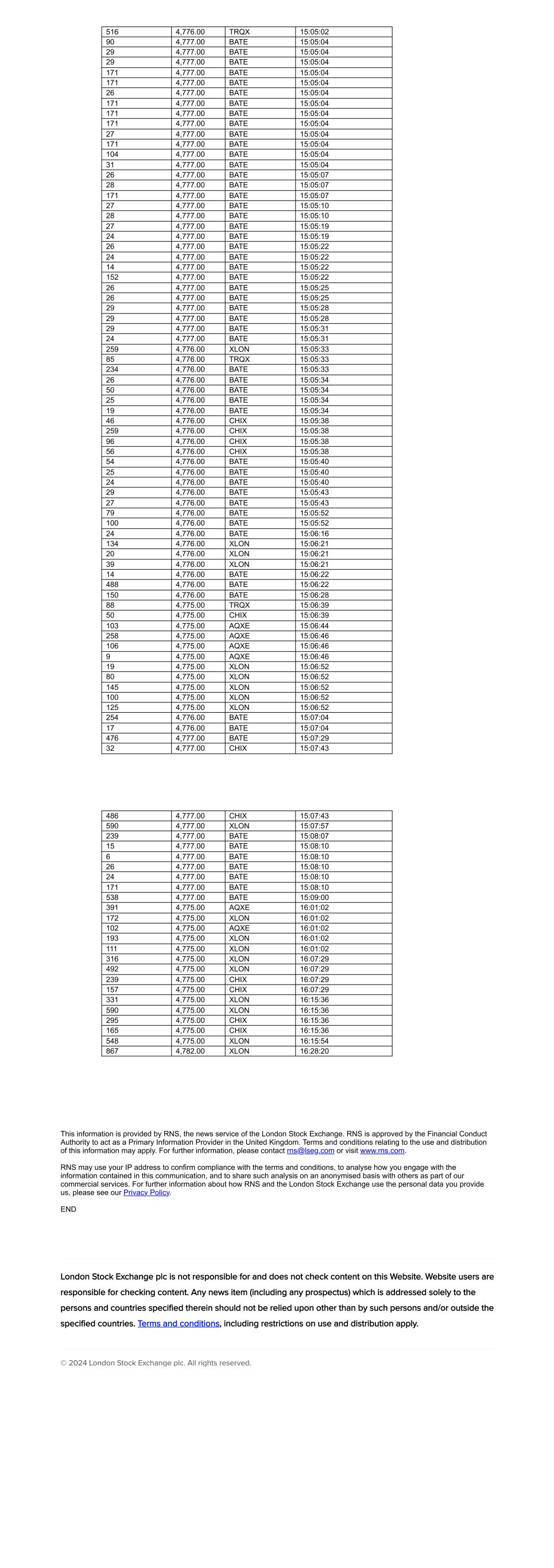 516 4,776.00 TRQX 15:05:02 90 4,777.00 BATE 15:05:04 29 4,777.00 BATE 15:05:04 29 4,777.00 BATE 15:05:04 171 4,777.00 BATE 15:05:04 171 4,777.00 BATE 15:05:04 26 4,777.00 BATE 15:05:04 171 4,777.00 BATE 15:05:04 171 4,777.00 BATE 15:05:04 171 4,777.00 BATE 15:05:04 27 4,777.00 BATE 15:05:04 171 4,777.00 BATE 15:05:04 104 4,777.00 BATE 15:05:04 31 4,777.00 BATE 15:05:04 26 4,777.00 BATE 15:05:07 28 4,777.00 BATE 15:05:07 171 4,777.00 BATE 15:05:07 27 4,777.00 BATE 15:05:10 28 4,777.00 BATE 15:05:10 27 4,777.00 BATE 15:05:19 24 4,777.00 BATE 15:05:19 26 4,777.00 BATE 15:05:22 24 4,777.00 BATE 15:05:22 14 4,777.00 BATE 15:05:22 152 4,777.00 BATE 15:05:22 26 4,777.00 BATE 15:05:25 26 4,777.00 BATE 15:05:25 29 4,777.00 BATE 15:05:28 29 4,777.00 BATE 15:05:28 29 4,777.00 BATE 15:05:31 24 4,777.00 BATE 15:05:31 259 4,776.00 XLON 15:05:33 85 4,776.00 TRQX 15:05:33 234 4,776.00 BATE 15:05:33 26 4,776.00 BATE 15:05:34 50 4,776.00 BATE 15:05:34 25 4,776.00 BATE 15:05:34 19 4,776.00 BATE 15:05:34 46 4,776.00 CHIX 15:05:38 259 4,776.00 CHIX 15:05:38 96 4,776.00 CHIX 15:05:38 56 4,776.00 CHIX 15:05:38 54 4,776.00 BATE 15:05:40 25 4,776.00 BATE 15:05:40 24 4,776.00 BATE 15:05:40 29 4,776.00 BATE 15:05:43 27 4,776.00 BATE 15:05:43 79 4,776.00 BATE 15:05:52 100 4,776.00 BATE 15:05:52 24 4,776.00 BATE 15:06:16 134 4,776.00 XLON 15:06:21 20 4,776.00 XLON 15:06:21 39 4,776.00 XLON 15:06:21 14 4,776.00 BATE 15:06:22 488 4,776.00 BATE 15:06:22 150 4,776.00 BATE 15:06:28 88 4,775.00 TRQX 15:06:39 50 4,775.00 CHIX 15:06:39 103 4,775.00 AQXE 15:06:44 258 4,775.00 AQXE 15:06:46 106 4,775.00 AQXE 15:06:46 9 4,775.00 AQXE 15:06:46 19 4,775.00 XLON 15:06:52 80 4,775.00 XLON 15:06:52 145 4,775.00 XLON 15:06:52 100 4,775.00 XLON 15:06:52 125 4,775.00 XLON 15:06:52 254 4,776.00 BATE 15:07:04 17 4,776.00 BATE 15:07:04 476 4,777.00 BATE 15:07:29 32 4,777.00 CHIX 15:07:43 486 4,777.00 CHIX 15:07:43 590 4,777.00 XLON 15:07:57 239 4,777.00 BATE 15:08:07 15 4,777.00 BATE 15:08:10 6 4,777.00 BATE 15:08:10 26 4,777.00 BATE 15:08:10 24 4,777.00 BATE 15:08:10 171 4,777.00 BATE 15:08:10 538 4,777.00 BATE 15:09:00 391 4,775.00 AQXE 16:01:02 172 4,775.00 XLON 16:01:02 102 4,775.00 AQXE 16:01:02 193 4,775.00 XLON 16:01:02 111 4,775.00 XLON 16:01:02 316 4,775.00 XLON 16:07:29 492 4,775.00 XLON 16:07:29 239 4,775.00 CHIX 16:07:29 157 4,775.00 CHIX 16:07:29 331 4,775.00 XLON 16:15:36 590 4,775.00 XLON 16:15:36 295 4,775.00 CHIX 16:15:36 165 4,775.00 CHIX 16:15:36 548 4,775.00 XLON 16:15:54 867 4,782.00 XLON 16:28:20 This information is provided by RNS, the news service of the London Stock Exchange. RNS is approved by the Financial Conduct Authority to act as a Primary Information Provider in the United Kingdom. Terms and conditions relating to the use and distribution of this information may apply. For further information, please contact rns@lseg.com or visit www.rns.com. RNS may use your IP address to confirm compliance with the terms and conditions, to analyse how you engage with the information contained in this communication, and to share such analysis on an anonymised basis with others as part of our commercial services. For further information about how RNS and the London Stock Exchange use the personal data you provide us, please see our Privacy Policy. END London Stock Exchange plc is not responsible for and does not check content on this Website. Website users are responsible for checking content. Any news item (including any prospectus) which is addressed solely to the persons and countries specified therein should not be relied upon other than by such persons and/or outside the specified countries. Terms and conditions, including restrictions on use and distribution apply. © 2024 London Stock Exchange plc. All rights reserved.