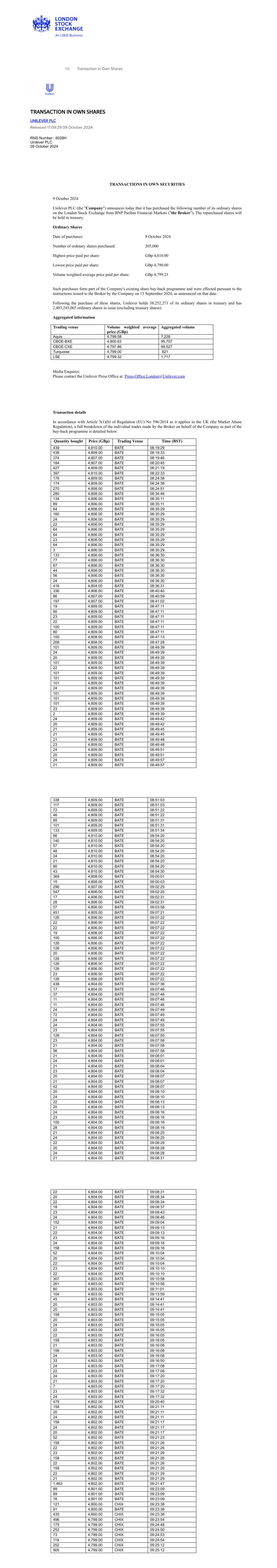 RNS Transaction in Own Shares TRANSACTION IN OWN SHARES UNILEVER PLC Released 17:09:29 09 October 2024 RNS Number : 6028H Unilever PLC 09 October 2024 TRANSACTIONS IN OWN SECURITIES 9 October 2024 Unilever PLC (the "Company") announces today that it has purchased the following number of its ordinary shares on the London Stock Exchange from BNP Paribas Financial Markets ("the Broker"). The repurchased shares will be held in treasury. Ordinary Shares Date of purchases: 9 October 2024 Number of ordinary shares purchased: 205,000 Highest price paid per share: GBp 4,810.00 Lowest price paid per share: GBp 4,790.00 Volume weighted average price paid per share: GBp 4,799.23 Such purchases form part of the Company's existing share buy-back programme and were effected pursuant to the instructions issued to the Broker by the Company on 13 September 2024, as announced on that date. Following the purchase of these shares, Unilever holds 38,252,273 of its ordinary shares in treasury and has 2,483,245,065 ordinary shares in issue (excluding treasury shares). Aggregated information Trading venue Volume weighted average price (GBp) Aggregated volume Aquis 4,799.58 7,228 CBOE-BXE 4,800.63 95,707 CBOE-CXE 4,797.86 99,527 Turquoise 4,799.00 821 LSE 4,799.32 1,717 Media Enquires: Please contact the Unilever Press Office at: Press-Office.London@Unilever.com Transaction details In accordance with Article 5(1)(b) of Regulation (EU) No 596/2014 as it applies in the UK (the Market Abuse Regulation), a full breakdown of the individual trades made by the Broker on behalf of the Company as part of the buy-back programme is detailed below: Quantity bought Price (GBp) Trading Venue Time (BST) 439 4,810.00 BATE 08:19:29 438 4,809.00 BATE 08:19:33 374 4,807.00 BATE 08:19:46 184 4,807.00 BATE 08:20:45 427 4,809.00 BATE 08:21:19 397 4,810.00 BATE 08:22:33 176 4,809.00 BATE 08:24:38 174 4,809.00 BATE 08:24:38 270 4,808.00 BATE 08:24:51 280 4,808.00 BATE 08:34:46 134 4,806.00 BATE 08:35:11 89 4,806.00 BATE 08:35:11 64 4,806.00 BATE 08:35:29 160 4,806.00 BATE 08:35:29 24 4,806.00 BATE 08:35:29 22 4,806.00 BATE 08:35:29 64 4,806.00 BATE 08:35:29 64 4,806.00 BATE 08:35:29 23 4,806.00 BATE 08:35:29 64 4,806.00 BATE 08:35:29 3 4,806.00 BATE 08:35:29 133 4,806.00 BATE 08:36:30 77 4,806.00 BATE 08:36:30 67 4,806.00 BATE 08:36:30 44 4,806.00 BATE 08:36:30 56 4,806.00 BATE 08:36:30 24 4,806.00 BATE 08:36:30 416 4,804.00 BATE 08:36:31 336 4,806.00 BATE 08:40:40 86 4,807.00 BATE 08:40:59 197 4,807.00 BATE 08:41:02 19 4,809.00 BATE 08:47:11 80 4,809.00 BATE 08:47:11 23 4,809.00 BATE 08:47:11 22 4,809.00 BATE 08:47:11 100 4,809.00 BATE 08:47:11 80 4,809.00 BATE 08:47:11 100 4,808.00 BATE 08:47:13 208 4,808.00 BATE 08:47:28 101 4,809.00 BATE 08:49:39 24 4,809.00 BATE 08:49:39 20 4,809.00 BATE 08:49:39 101 4,809.00 BATE 08:49:39 22 4,809.00 BATE 08:49:39 101 4,809.00 BATE 08:49:39 101 4,809.00 BATE 08:49:39 101 4,809.00 BATE 08:49:39 24 4,809.00 BATE 08:49:39 101 4,809.00 BATE 08:49:39 101 4,809.00 BATE 08:49:39 101 4,809.00 BATE 08:49:39 23 4,809.00 BATE 08:49:39 2 4,809.00 BATE 08:49:39 24 4,809.00 BATE 08:49:42 20 4,809.00 BATE 08:49:42 21 4,809.00 BATE 08:49:45 21 4,809.00 BATE 08:49:45 21 4,809.00 BATE 08:49:48 23 4,809.00 BATE 08:49:48 24 4,809.00 BATE 08:49:51 20 4,809.00 BATE 08:49:51 24 4,809.00 BATE 08:49:57 21 4,809.00 BATE 08:49:57 338 4,809.00 BATE 08:51:03 117 4,809.00 BATE 08:51:03 72 4,809.00 BATE 08:51:22 46 4,809.00 BATE 08:51:22 85 4,809.00 BATE 08:51:31 101 4,809.00 BATE 08:51:31 133 4,809.00 BATE 08:51:34 66 4,810.00 BATE 08:54:20 140 4,810.00 BATE 08:54:20 57 4,810.00 BATE 08:54:20 48 4,810.00 BATE 08:54:20 24 4,810.00 BATE 08:54:20 21 4,810.00 BATE 08:54:20 80 4,810.00 BATE 08:54:20 43 4,810.00 BATE 08:54:30 369 4,808.00 BATE 09:00:01 15 4,808.00 BATE 09:00:03 296 4,807.00 BATE 09:02:25 547 4,806.00 BATE 09:02:25 17 4,806.00 BATE 09:02:31 28 4,806.00 BATE 09:02:31 57 4,806.00 BATE 09:03:58 451 4,805.00 BATE 09:07:21 126 4,806.00 BATE 09:07:22 22 4,806.00 BATE 09:07:22 22 4,806.00 BATE 09:07:22 19 4,806.00 BATE 09:07:22 100 4,806.00 BATE 09:07:22 126 4,806.00 BATE 09:07:22 126 4,806.00 BATE 09:07:22 20 4,806.00 BATE 09:07:22 126 4,806.00 BATE 09:07:22 126 4,806.00 BATE 09:07:22 126 4,806.00 BATE 09:07:22 23 4,806.00 BATE 09:07:22 126 4,806.00 BATE 09:07:22 438 4,804.00 BATE 09:07:36 17 4,804.00 BATE 09:07:46 37 4,804.00 BATE 09:07:46 11 4,804.00 BATE 09:07:46 11 4,804.00 BATE 09:07:46 24 4,804.00 BATE 09:07:49 72 4,804.00 BATE 09:07:49 24 4,804.00 BATE 09:07:49 24 4,804.00 BATE 09:07:55 23 4,804.00 BATE 09:07:55 126 4,804.00 BATE 09:07:55 23 4,804.00 BATE 09:07:58 21 4,804.00 BATE 09:07:58 56 4,804.00 BATE 09:07:58 21 4,804.00 BATE 09:08:01 24 4,804.00 BATE 09:08:01 21 4,804.00 BATE 09:08:04 23 4,804.00 BATE 09:08:04 20 4,804.00 BATE 09:08:07 21 4,804.00 BATE 09:08:07 42 4,804.00 BATE 09:08:07 20 4,804.00 BATE 09:08:10 24 4,804.00 BATE 09:08:10 22 4,804.00 BATE 09:08:13 20 4,804.00 BATE 09:08:13 24 4,804.00 BATE 09:08:16 23 4,804.00 BATE 09:08:16 100 4,804.00 BATE 09:08:16 28 4,804.00 BATE 09:08:19 21 4,804.00 BATE 09:08:25 24 4,804.00 BATE 09:08:25 22 4,804.00 BATE 09:08:28 20 4,804.00 BATE 09:08:28 24 4,804.00 BATE 09:08:28 21 4,804.00 BATE 09:08:31 22 4,804.00 BATE 09:08:31 20 4,804.00 BATE 09:08:34 22 4,804.00 BATE 09:08:34 18 4,804.00 BATE 09:08:37 23 4,804.00 BATE 09:08:43 24 4,804.00 BATE 09:08:46 152 4,804.00 BATE 09:09:04 21 4,804.00 BATE 09:09:13 22 4,804.00 BATE 09:09:13 23 4,804.00 BATE 09:09:16 24 4,804.00 BATE 09:09:16 158 4,804.00 BATE 09:09:16 52 4,804.00 BATE 09:10:04 20 4,804.00 BATE 09:10:04 22 4,804.00 BATE 09:10:04 23 4,804.00 BATE 09:10:10 22 4,804.00 BATE 09:10:10 307 4,803.00 BATE 09:10:58 261 4,803.00 BATE 09:10:58 80 4,803.00 BATE 09:11:01 104 4,803.00 BATE 09:13:59 45 4,803.00 BATE 09:14:41 20 4,803.00 BATE 09:14:41 20 4,803.00 BATE 09:14:41 158 4,803.00 BATE 09:15:05 20 4,803.00 BATE 09:15:05 24 4,803.00 BATE 09:15:05 22 4,803.00 BATE 09:16:05 22 4,803.00 BATE 09:16:05 158 4,803.00 BATE 0