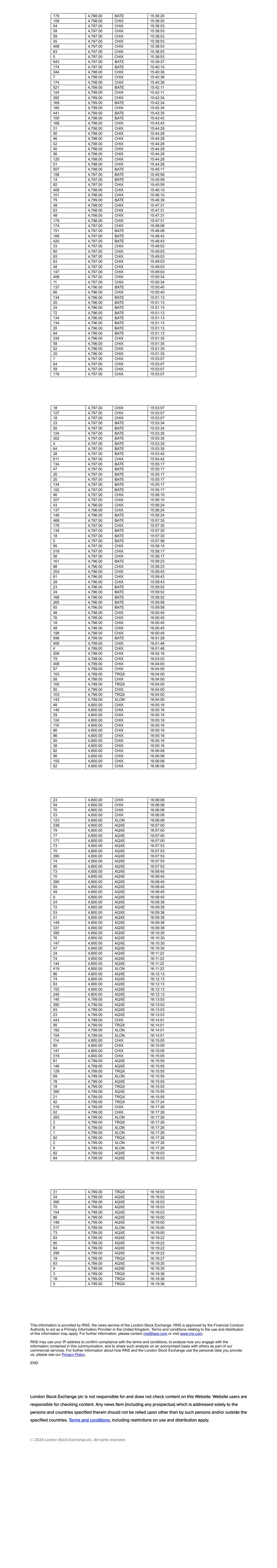 179 4,798.00 BATE 15:38:20 159 4,798.00 CHIX 15:38:20 54 4,797.00 CHIX 15:38:53 59 4,797.00 CHIX 15:38:53 59 4,797.00 CHIX 15:38:53 45 4,797.00 CHIX 15:38:53 408 4,797.00 CHIX 15:38:53 63 4,797.00 CHIX 15:38:53 5 4,797.00 CHIX 15:38:53 643 4,797.00 BATE 15:39:37 174 4,797.00 BATE 15:40:10 344 4,798.00 CHIX 15:40:36 7 4,798.00 CHIX 15:40:36 174 4,798.00 CHIX 15:40:36 521 4,799.00 BATE 15:42:11 124 4,799.00 CHIX 15:42:11 392 4,799.00 CHIX 15:42:34 169 4,799.00 BATE 15:42:34 185 4,799.00 CHIX 15:42:34 441 4,799.00 BATE 15:43:35 100 4,798.00 BATE 15:43:43 168 4,798.00 CHIX 15:43:43 31 4,798.00 CHIX 15:44:28 50 4,798.00 CHIX 15:44:28 46 4,798.00 CHIX 15:44:28 42 4,798.00 CHIX 15:44:28 40 4,798.00 CHIX 15:44:28 56 4,798.00 CHIX 15:44:28 120 4,798.00 CHIX 15:44:28 51 4,798.00 CHIX 15:44:28 507 4,798.00 BATE 15:45:17 158 4,797.00 BATE 15:45:58 14 4,797.00 BATE 15:45:59 92 4,797.00 CHIX 15:45:59 408 4,798.00 CHIX 15:46:10 101 4,798.00 CHIX 15:46:10 79 4,799.00 BATE 15:46:39 48 4,798.00 CHIX 15:47:31 63 4,798.00 CHIX 15:47:31 48 4,798.00 CHIX 15:47:31 179 4,798.00 CHIX 15:47:31 174 4,797.00 CHIX 15:48:08 151 4,797.00 BATE 15:48:08 168 4,797.00 BATE 15:48:43 420 4,797.00 BATE 15:48:43 33 4,797.00 CHIX 15:49:03 60 4,797.00 CHIX 15:49:03 93 4,797.00 CHIX 15:49:03 63 4,797.00 CHIX 15:49:03 48 4,797.00 CHIX 15:49:03 147 4,797.00 CHIX 15:49:03 408 4,797.00 CHIX 15:50:34 11 4,797.00 CHIX 15:50:34 137 4,796.00 BATE 15:50:40 66 4,796.00 CHIX 15:50:40 134 4,796.00 BATE 15:51:13 20 4,796.00 BATE 15:51:13 24 4,796.00 BATE 15:51:13 72 4,796.00 BATE 15:51:13 134 4,796.00 BATE 15:51:13 134 4,796.00 BATE 15:51:13 20 4,796.00 BATE 15:51:13 64 4,796.00 BATE 15:51:13 334 4,796.00 CHIX 15:51:35 59 4,796.00 CHIX 15:51:35 52 4,796.00 CHIX 15:51:35 25 4,796.00 CHIX 15:51:35 1 4,797.00 CHIX 15:53:07 64 4,797.00 CHIX 15:53:07 59 4,797.00 CHIX 15:53:07 178 4,797.00 CHIX 15:53:07 18 4,797.00 CHIX 15:53:07 127 4,797.00 CHIX 15:53:07 18 4,797.00 CHIX 15:53:07 23 4,797.00 BATE 15:53:34 55 4,797.00 BATE 15:53:34 124 4,797.00 BATE 15:53:35 302 4,797.00 BATE 15:53:35 4 4,797.00 BATE 15:53:35 64 4,797.00 BATE 15:53:35 28 4,797.00 BATE 15:53:42 611 4,797.00 CHIX 15:54:42 134 4,797.00 BATE 15:55:17 47 4,797.00 BATE 15:55:17 20 4,797.00 BATE 15:55:17 20 4,797.00 BATE 15:55:17 134 4,797.00 BATE 15:55:17 102 4,797.00 BATE 15:55:17 46 4,797.00 CHIX 15:56:10 327 4,797.00 CHIX 15:56:10 43 4,796.00 CHIX 15:56:24 137 4,796.00 CHIX 15:56:24 146 4,796.00 BATE 15:56:24 468 4,797.00 BATE 15:57:30 176 4,797.00 CHIX 15:57:30 134 4,797.00 BATE 15:57:30 18 4,797.00 BATE 15:57:30 5 4,797.00 BATE 15:57:58 95 4,797.00 CHIX 15:58:15 318 4,797.00 CHIX 15:58:17 56 4,797.00 CHIX 15:58:17 161 4,796.00 BATE 15:58:23 88 4,796.00 CHIX 15:58:23 253 4,796.00 CHIX 15:59:43 81 4,796.00 CHIX 15:59:43 29 4,796.00 CHIX 15:59:43 23 4,796.00 BATE 15:59:52 24 4,796.00 BATE 15:59:52 168 4,796.00 BATE 15:59:52 265 4,796.00 BATE 15:59:58 65 4,796.00 BATE 15:59:58 48 4,798.00 CHIX 16:00:45 76 4,798.00 CHIX 16:00:45 18 4,798.00 CHIX 16:00:45 48 4,798.00 CHIX 16:00:45 198 4,798.00 CHIX 16:00:45 596 4,799.00 BATE 16:01:28 408 4,799.00 CHIX 16:01:46 4 4,799.00 CHIX 16:01:46 206 4,798.00 CHIX 16:02:16 79 4,798.00 CHIX 16:03:03 408 4,799.00 CHIX 16:04:00 57 4,799.00 CHIX 16:04:00 103 4,799.00 TRQX 16:04:00 58 4,799.00 CHIX 16:04:00 100 4,799.00 TRQX 16:04:00 50 4,799.00 CHIX 16:04:00 103 4,799.00 TRQX 16:04:00 143 4,799.00 XLON 16:04:00 48 4,800.00 CHIX 16:05:16 140 4,800.00 CHIX 16:05:16 29 4,800.00 CHIX 16:05:16 124 4,800.00 CHIX 16:05:16 116 4,800.00 CHIX 16:05:16 66 4,800.00 CHIX 16:05:16 86 4,800.00 CHIX 16:05:16 50 4,800.00 CHIX 16:05:16 38 4,800.00 CHIX 16:05:16 82 4,800.00 CHIX 16:06:08 56 4,800.00 CHIX 16:06:08 155 4,800.00 CHIX 16:06:08 62 4,800.00 CHIX 16:06:08 23 4,800.00 CHIX 16:06:08 54 4,800.00 CHIX 16:06:08 70 4,800.00 CHIX 16:06:08 53 4,800.00 CHIX 16:06:08 123 4,800.00 XLON 16:06:08 338 4,800.00 AQXE 16:07:00 79 4,800.00 AQXE 16:07:00 77 4,800.00 AQXE 16:07:00 171 4,800.00 AQXE 16:07:00 73 4,800.00 AQXE 16:07:53 70 4,800.00 AQXE 16:07:53 390 4,800.00 AQXE 16:07:53 74 4,800.00 AQXE 16:07:53 46 4,800.00 AQXE 16:07:53 73 4,800.00 AQXE 16:08:45 70 4,800.00 AQXE 16:08:45 390 4,800.00 AQXE 16:08:45 59 4,800.00 AQXE 16:08:45 49 4,800.00 AQXE 16:08:45 9 4,800.00 AQXE 16:08:45 24 4,800.00 AQXE 16:09:38 72 4,800.00 AQXE 16:09:38 53 4,800.00 AQXE 16:09:38 41 4,800.00 AQXE 16:09:38 149 4,800.00 AQXE 16:09:38 331 4,800.00 AQXE 16:09:38 390 4,800.00 AQXE 16:10:30 76 4,800.00 AQXE 16:10:30 147 4,800.00 AQXE 16:10:30 47 4,800.00 AQXE 16:10:30 24 4,800.00 AQXE 16:11:22 74 4,800.00 AQXE 16:11:22 144 4,800.00 AQXE 16:11:22 419 4,800.00 XLON 16:11:22 86 4,800.00 AQXE 16:12:13 74 4,800.00 AQXE 16:12:13 63 4,800.00 AQXE 16:12:13 152 4,800.00 AQXE 16:12:13 249 4,800.00 AQXE 16:12:13 145 4,799.00 AQXE 16:13:03 390 4,799.00 AQXE 16:13:03 83 4,799.00 AQXE 16:13:03 23 4,799.00 AQXE 16:13:03 443 4,799.00 CHIX 16:14:01 95 4,799.00 TRQX 16:14:01 192 4,799.00 XLON 16:14:01 154 4,799.00 XLON 16:14:01 114 4,800.00 CHIX 16:15:05 69 4,800.00 CHIX 16:15:05 147 4,800.00 CHIX 16:15:05 319 4,800.00 CHIX 16:15:05 81 4,799.00 AQXE 16:15:55 146 4,799.00 AQXE 16:15:55 129 4,799.00 TRQX 16:15:55 69 4,799.00 XLON 16:15:55 78 4,799.00 AQXE 16:15:55 18 4,799.00 TRQX 16:15:55 390 4,799.00 AQXE 16:15:55 21 4,799.00 TRQX 16:15:55 92 4,799.00 TRQX 16:17:24 318 4,799.00 CHIX 16:17:26 62 4,799.00 CHIX 16:17:26 283 4,799.00 XLON 16:17:26 2 4,799.00 TRQX 16:17:26 8 4,799.00 XLON 16:17:26 1 4,799.00 XLON 16:17:26 82 4,799.00 TRQX 16:17:26 2 4,799.00 XLON 16:17:26 6 4,799.00 XLON 16:17:26 82 4,799.00 AQXE 16:18:03 84 4,799.00 AQXE 16:18:03 31 4,799.00 TRQX 16:18:03 24 4,799.00 AQXE 16:18:03 390 4,799.00 AQXE 16:18:03 70 4,799.00 AQXE 16:18:03 154 4,799.00 AQXE 16:18:03 86 4,799.00 AQXE 16:19:00 148 4,799.00 AQXE 16:19:00 317 4,799.00 XLON 16:19:00 73 4,799.00 AQXE 16:19:00 83 4,799.00 AQXE 16:19:22 80 4,799.00 AQXE 16:19:22 64 4,799.00 AQXE 16:19:22 298 4,799.00 AQXE 16:19:22 19 4,799.00 TRQX 16:19:27 83 4,799.00 AQX