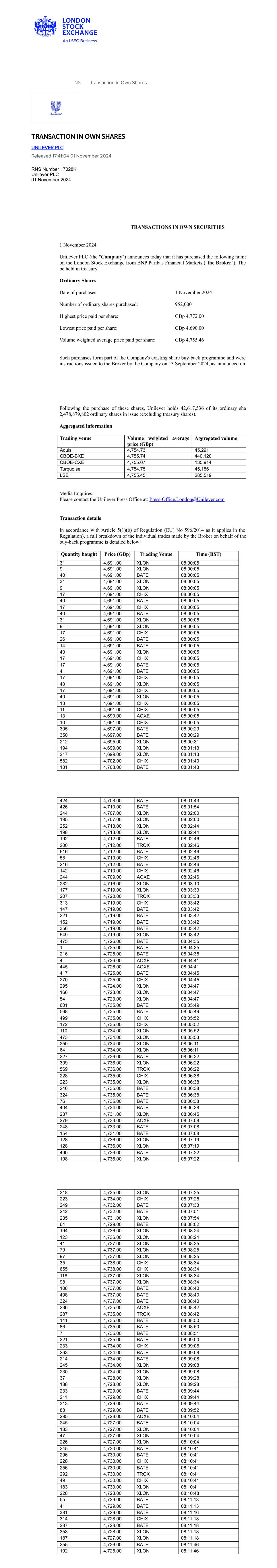 RNS Transaction in Own Shares TRANSACTION IN OWN SHARES UNILEVER PLC Released 17:41:04 01 November 2024 RNS Number : 7028K Unilever PLC 01 November 2024 TRANSACTIONS IN OWN SECURITIES 1 November 2024 Unilever PLC (the "Company") announces today that it has purchased the following numb on the London Stock Exchange from BNP Paribas Financial Markets ("the Broker"). The be held in treasury. Ordinary Shares Date of purchases: 1 November 2024 Number of ordinary shares purchased: 952,000 Highest price paid per share: GBp 4,772.00 Lowest price paid per share: GBp 4,690.00 Volume weighted average price paid per share: GBp 4,755.46 Such purchases form part of the Company's existing share buy-back programme and were instructions issued to the Broker by the Company on 13 September 2024, as announced on Following the purchase of these shares, Unilever holds 42,617,536 of its ordinary shar 2,478,879,802 ordinary shares in issue (excluding treasury shares). Aggregated information Trading venue Volume weighted average price (GBp) Aggregated volume Aquis 4,754.73 45,291 CBOE-BXE 4,755.74 440,120 CBOE-CXE 4,755.07 135,914 Turquoise 4,754.75 45,156 LSE 4,755.45 285,519 Media Enquires: Please contact the Unilever Press Office at: Press-Office.London@Unilever.com Transaction details In accordance with Article 5(1)(b) of Regulation (EU) No 596/2014 as it applies in the Regulation), a full breakdown of the individual trades made by the Broker on behalf of the buy-back programme is detailed below: Quantity bought Price (GBp) Trading Venue Time (BST) 31 4,691.00 XLON 08:00:05 9 4,691.00 XLON 08:00:05 40 4,691.00 BATE 08:00:05 31 4,691.00 XLON 08:00:05 9 4,691.00 XLON 08:00:05 17 4,691.00 CHIX 08:00:05 40 4,691.00 BATE 08:00:05 17 4,691.00 CHIX 08:00:05 40 4,691.00 BATE 08:00:05 31 4,691.00 XLON 08:00:05 9 4,691.00 XLON 08:00:05 17 4,691.00 CHIX 08:00:05 26 4,691.00 BATE 08:00:05 14 4,691.00 BATE 08:00:05 40 4,691.00 XLON 08:00:05 17 4,691.00 CHIX 08:00:05 17 4,691.00 BATE 08:00:05 4 4,691.00 BATE 08:00:05 17 4,691.00 CHIX 08:00:05 40 4,691.00 XLON 08:00:05 17 4,691.00 CHIX 08:00:05 40 4,691.00 XLON 08:00:05 13 4,691.00 CHIX 08:00:05 11 4,691.00 CHIX 08:00:05 13 4,690.00 AQXE 08:00:05 10 4,691.00 CHIX 08:00:05 305 4,697.00 BATE 08:00:29 350 4,697.00 BATE 08:00:29 212 4,695.00 XLON 08:00:31 194 4,699.00 XLON 08:01:13 217 4,699.00 XLON 08:01:13 582 4,702.00 CHIX 08:01:40 131 4,708.00 BATE 08:01:43 424 4,708.00 BATE 08:01:43 426 4,710.00 BATE 08:01:54 244 4,707.00 XLON 08:02:00 195 4,707.00 XLON 08:02:00 252 4,713.00 XLON 08:02:44 198 4,713.00 XLON 08:02:44 192 4,712.00 BATE 08:02:46 200 4,712.00 TRQX 08:02:46 616 4,712.00 BATE 08:02:46 58 4,710.00 CHIX 08:02:46 216 4,712.00 BATE 08:02:46 142 4,710.00 CHIX 08:02:46 244 4,709.00 AQXE 08:02:46 232 4,716.00 XLON 08:03:10 177 4,719.00 XLON 08:03:33 207 4,720.00 TRQX 08:03:33 313 4,719.00 CHIX 08:03:42 147 4,719.00 BATE 08:03:42 221 4,719.00 BATE 08:03:42 152 4,719.00 BATE 08:03:42 356 4,719.00 BATE 08:03:42 549 4,719.00 XLON 08:03:42 475 4,726.00 BATE 08:04:35 1 4,725.00 BATE 08:04:35 216 4,725.00 BATE 08:04:35 4 4,726.00 AQXE 08:04:41 445 4,726.00 AQXE 08:04:41 417 4,725.00 BATE 08:04:45 270 4,725.00 CHIX 08:04:45 295 4,724.00 XLON 08:04:47 166 4,723.00 XLON 08:04:47 54 4,723.00 XLON 08:04:47 601 4,735.00 BATE 08:05:49 568 4,735.00 BATE 08:05:49 499 4,735.00 CHIX 08:05:52 172 4,735.00 CHIX 08:05:52 110 4,734.00 XLON 08:05:52 473 4,734.00 XLON 08:05:53 250 4,734.00 XLON 08:06:11 64 4,734.00 XLON 08:06:11 227 4,736.00 BATE 08:06:22 309 4,736.00 XLON 08:06:22 569 4,736.00 TRQX 08:06:22 228 4,735.00 CHIX 08:06:38 223 4,735.00 XLON 08:06:38 246 4,735.00 BATE 08:06:38 324 4,735.00 BATE 08:06:38 76 4,735.00 BATE 08:06:38 404 4,734.00 BATE 08:06:38 237 4,731.00 XLON 08:06:45 279 4,733.00 AQXE 08:07:08 248 4,733.00 BATE 08:07:08 154 4,731.00 BATE 08:07:08 128 4,736.00 XLON 08:07:19 128 4,736.00 XLON 08:07:19 490 4,736.00 BATE 08:07:22 198 4,736.00 XLON 08:07:22 218 4,735.00 XLON 08:07:25 223 4,734.00 CHIX 08:07:25 249 4,732.00 BATE 08:07:33 242 4,732.00 BATE 08:07:51 235 4,731.00 XLON 08:07:54 64 4,729.00 BATE 08:08:02 194 4,736.00 XLON 08:08:24 123 4,736.00 XLON 08:08:24 41 4,737.00 XLON 08:08:25 79 4,737.00 XLON 08:08:25 97 4,737.00 XLON 08:08:25 35 4,738.00 CHIX 08:08:34 655 4,738.00 CHIX 08:08:34 118 4,737.00 XLON 08:08:34 98 4,737.00 XLON 08:08:34 108 4,737.00 BATE 08:08:40 498 4,737.00 BATE 08:08:40 324 4,737.00 BATE 08:08:40 236 4,735.00 AQXE 08:08:42 287 4,735.00 TRQX 08:08:42 141 4,735.00 BATE 08:08:50 86 4,735.00 BATE 08:08:50 7 4,735.00 BATE 08:08:51 221 4,735.00 BATE 08:09:00 233 4,734.00 CHIX 08:09:08 263 4,734.00 BATE 08:09:08 214 4,734.00 BATE 08:09:08 245 4,734.00 XLON 08:09:08 230 4,734.00 XLON 08:09:08 37 4,728.00 XLON 08:09:28 188 4,728.00 XLON 08:09:28 233 4,729.00 BATE 08:09:44 211 4,729.00 CHIX 08:09:44 313 4,729.00 BATE 08:09:44 88 4,729.00 BATE 08:09:52 295 4,728.00 AQXE 08:10:04 245 4,727.00 BATE 08:10:04 183 4,727.00 XLON 08:10:04 47 4,727.00 XLON 08:10:04 226 4,727.00 XLON 08:10:04 245 4,730.00 BATE 08:10:41 296 4,730.00 BATE 08:10:41 228 4,730.00 CHIX 08:10:41 256 4,730.00 BATE 08:10:41 292 4,730.00 TRQX 08:10:41 49 4,730.00 CHIX 08:10:41 183 4,730.00 XLON 08:10:41 228 4,728.00 XLON 08:10:48 55 4,729.00 BATE 08:11:13 41 4,729.00 BATE 08:11:13 381 4,729.00 BATE 08:11:16 314 4,728.00 CHIX 08:11:18 287 4,728.00 BATE 08:11:18 353 4,728.00 XLON 08:11:18 187 4,727.00 XLON 08:11:18 255 4,726.00 BATE 08:11:46 192 4,725.00 XLON 08:11:46
