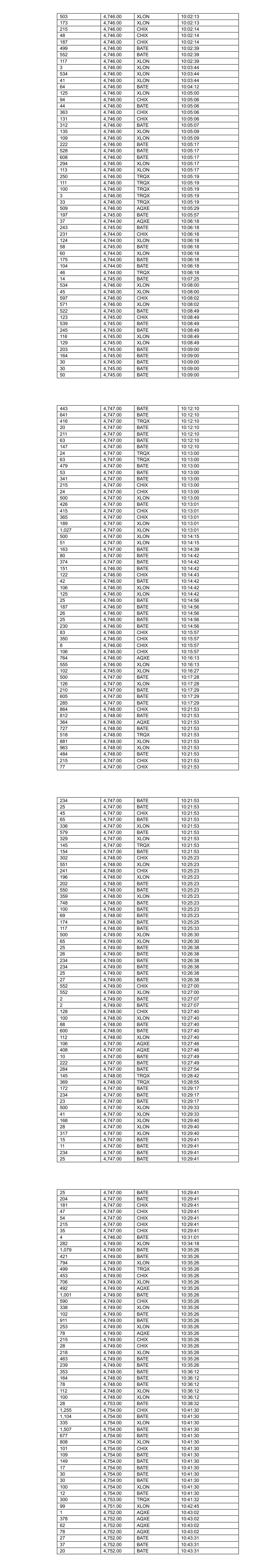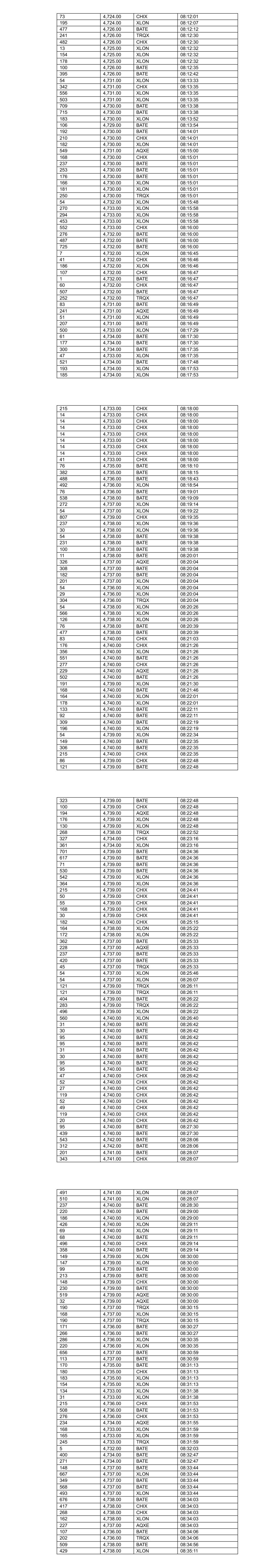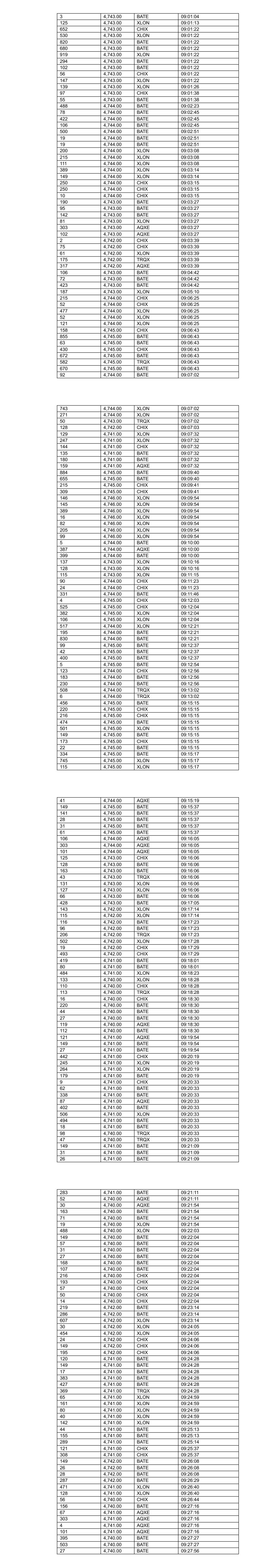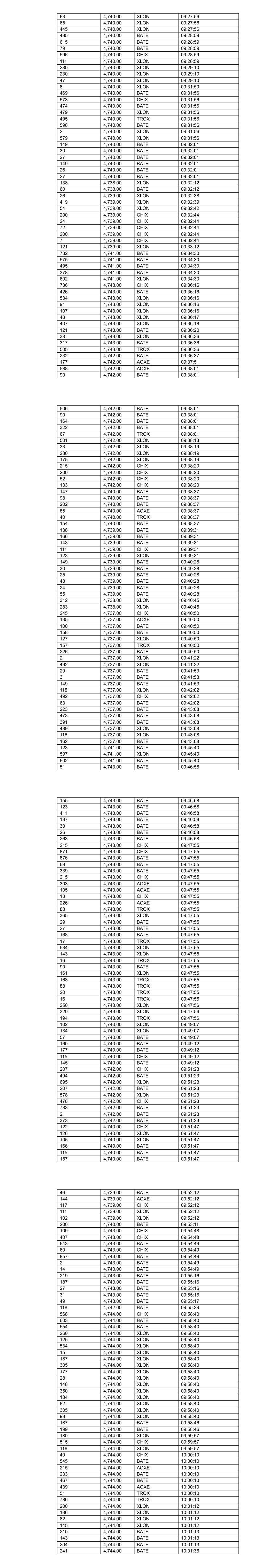 73 4,724.00 CHIX 08:12:01 195 4,724.00 XLON 08:12:07 477 4,726.00 BATE 08:12:12 241 4,726.00 TRQX 08:12:30 482 4,726.00 CHIX 08:12:30 13 4,725.00 XLON 08:12:32 154 4,725.00 XLON 08:12:32 178 4,725.00 XLON 08:12:32 100 4,726.00 BATE 08:12:35 395 4,726.00 BATE 08:12:42 54 4,731.00 XLON 08:13:33 342 4,731.00 CHIX 08:13:35 556 4,731.00 XLON 08:13:35 503 4,731.00 XLON 08:13:35 709 4,730.00 BATE 08:13:38 715 4,730.00 BATE 08:13:38 183 4,730.00 XLON 08:13:52 106 4,729.00 BATE 08:13:54 192 4,730.00 BATE 08:14:01 210 4,730.00 CHIX 08:14:01 182 4,730.00 XLON 08:14:01 549 4,731.00 AQXE 08:15:00 168 4,730.00 CHIX 08:15:01 237 4,730.00 BATE 08:15:01 253 4,730.00 BATE 08:15:01 176 4,730.00 BATE 08:15:01 166 4,730.00 XLON 08:15:01 181 4,730.00 XLON 08:15:01 250 4,730.00 TRQX 08:15:01 54 4,732.00 XLON 08:15:48 270 4,733.00 XLON 08:15:58 294 4,733.00 XLON 08:15:58 453 4,733.00 XLON 08:15:58 552 4,733.00 CHIX 08:16:00 276 4,732.00 BATE 08:16:00 487 4,732.00 BATE 08:16:00 725 4,732.00 BATE 08:16:00 7 4,732.00 XLON 08:16:45 41 4,732.00 CHIX 08:16:46 186 4,732.00 XLON 08:16:46 107 4,732.00 CHIX 08:16:47 1 4,732.00 BATE 08:16:47 60 4,732.00 CHIX 08:16:47 507 4,732.00 BATE 08:16:47 252 4,732.00 TRQX 08:16:47 83 4,731.00 BATE 08:16:49 241 4,731.00 AQXE 08:16:49 51 4,731.00 XLON 08:16:49 207 4,731.00 BATE 08:16:49 500 4,733.00 XLON 08:17:29 61 4,734.00 BATE 08:17:30 177 4,734.00 BATE 08:17:30 300 4,734.00 BATE 08:17:35 47 4,733.00 XLON 08:17:35 521 4,734.00 BATE 08:17:48 193 4,734.00 XLON 08:17:53 185 4,734.00 XLON 08:17:53 215 4,733.00 CHIX 08:18:00 14 4,733.00 CHIX 08:18:00 14 4,733.00 CHIX 08:18:00 14 4,733.00 CHIX 08:18:00 14 4,733.00 CHIX 08:18:00 14 4,733.00 CHIX 08:18:00 14 4,733.00 CHIX 08:18:00 14 4,733.00 CHIX 08:18:00 41 4,733.00 CHIX 08:18:00 76 4,735.00 BATE 08:18:10 382 4,735.00 BATE 08:18:15 488 4,736.00 BATE 08:18:43 492 4,736.00 XLON 08:18:54 76 4,736.00 BATE 08:19:01 538 4,738.00 BATE 08:19:09 272 4,737.00 XLON 08:19:14 54 4,737.00 XLON 08:19:22 807 4,739.00 CHIX 08:19:35 237 4,738.00 XLON 08:19:36 30 4,738.00 XLON 08:19:36 54 4,738.00 BATE 08:19:38 231 4,738.00 BATE 08:19:38 100 4,738.00 BATE 08:19:38 11 4,738.00 BATE 08:20:01 326 4,737.00 AQXE 08:20:04 308 4,737.00 BATE 08:20:04 182 4,737.00 BATE 08:20:04 201 4,737.00 XLON 08:20:04 54 4,736.00 XLON 08:20:04 29 4,736.00 XLON 08:20:04 304 4,736.00 TRQX 08:20:04 54 4,738.00 XLON 08:20:26 566 4,738.00 XLON 08:20:26 126 4,738.00 XLON 08:20:26 76 4,738.00 BATE 08:20:39 477 4,738.00 BATE 08:20:39 83 4,740.00 CHIX 08:21:03 176 4,740.00 CHIX 08:21:26 356 4,740.00 XLON 08:21:26 551 4,740.00 BATE 08:21:26 277 4,740.00 CHIX 08:21:26 229 4,740.00 AQXE 08:21:26 502 4,740.00 BATE 08:21:26 191 4,739.00 XLON 08:21:30 168 4,740.00 BATE 08:21:46 164 4,740.00 XLON 08:22:01 178 4,740.00 XLON 08:22:01 133 4,740.00 BATE 08:22:11 92 4,740.00 BATE 08:22:11 309 4,740.00 BATE 08:22:19 196 4,740.00 XLON 08:22:19 54 4,739.00 XLON 08:22:34 149 4,740.00 BATE 08:22:35 306 4,740.00 BATE 08:22:35 215 4,740.00 CHIX 08:22:35 86 4,739.00 CHIX 08:22:48 121 4,739.00 BATE 08:22:48 323 4,739.00 BATE 08:22:48 100 4,739.00 CHIX 08:22:48 194 4,739.00 AQXE 08:22:48 176 4,739.00 XLON 08:22:48 130 4,739.00 XLON 08:22:48 268 4,738.00 TRQX 08:22:52 327 4,734.00 CHIX 08:23:16 361 4,734.00 XLON 08:23:16 701 4,739.00 BATE 08:24:36 617 4,739.00 BATE 08:24:36 71 4,739.00 BATE 08:24:36 530 4,739.00 BATE 08:24:36 542 4,739.00 XLON 08:24:36 364 4,739.00 XLON 08:24:36 215 4,739.00 CHIX 08:24:41 50 4,739.00 CHIX 08:24:41 55 4,739.00 CHIX 08:24:41 168 4,739.00 CHIX 08:24:41 30 4,739.00 CHIX 08:24:41 182 4,740.00 CHIX 08:25:15 164 4,738.00 XLON 08:25:22 172 4,738.00 XLON 08:25:22 362 4,737.00 BATE 08:25:33 228 4,737.00 AQXE 08:25:33 237 4,737.00 BATE 08:25:33 420 4,737.00 BATE 08:25:33 45 4,737.00 TRQX 08:25:33 54 4,737.00 XLON 08:25:46 54 4,737.00 XLON 08:26:07 121 4,739.00 TRQX 08:26:11 121 4,739.00 TRQX 08:26:11 404 4,739.00 BATE 08:26:22 283 4,739.00 TRQX 08:26:22 496 4,739.00 XLON 08:26:22 560 4,740.00 XLON 08:26:40 31 4,740.00 BATE 08:26:42 30 4,740.00 BATE 08:26:42 95 4,740.00 BATE 08:26:42 95 4,740.00 BATE 08:26:42 31 4,740.00 BATE 08:26:42 30 4,740.00 BATE 08:26:42 95 4,740.00 BATE 08:26:42 95 4,740.00 BATE 08:26:42 47 4,740.00 CHIX 08:26:42 52 4,740.00 CHIX 08:26:42 27 4,740.00 CHIX 08:26:42 119 4,740.00 CHIX 08:26:42 52 4,740.00 CHIX 08:26:42 49 4,740.00 CHIX 08:26:42 119 4,740.00 CHIX 08:26:42 20 4,740.00 CHIX 08:26:42 95 4,740.00 BATE 08:27:30 439 4,740.00 BATE 08:27:30 543 4,742.00 BATE 08:28:06 312 4,742.00 BATE 08:28:06 201 4,741.00 BATE 08:28:07 343 4,741.00 CHIX 08:28:07 491 4,741.00 XLON 08:28:07 510 4,741.00 XLON 08:28:07 237 4,740.00 BATE 08:28:30 220 4,740.00 BATE 08:29:00 186 4,740.00 XLON 08:29:00 426 4,740.00 XLON 08:29:11 69 4,740.00 XLON 08:29:11 68 4,740.00 BATE 08:29:11 496 4,740.00 CHIX 08:29:14 358 4,740.00 BATE 08:29:14 149 4,739.00 XLON 08:30:00 147 4,739.00 XLON 08:30:00 99 4,739.00 BATE 08:30:00 213 4,739.00 BATE 08:30:00 148 4,739.00 CHIX 08:30:00 230 4,739.00 BATE 08:30:00 519 4,739.00 AQXE 08:30:00 32 4,739.00 AQXE 08:30:00 190 4,737.00 TRQX 08:30:15 168 4,737.00 XLON 08:30:15 190 4,737.00 TRQX 08:30:15 171 4,736.00 BATE 08:30:27 266 4,736.00 BATE 08:30:27 286 4,736.00 XLON 08:30:35 220 4,736.00 XLON 08:30:35 656 4,737.00 BATE 08:30:59 113 4,737.00 BATE 08:30:59 170 4,735.00 BATE 08:31:13 180 4,735.00 CHIX 08:31:13 183 4,735.00 XLON 08:31:13 154 4,735.00 XLON 08:31:13 134 4,733.00 XLON 08:31:38 31 4,733.00 XLON 08:31:38 215 4,736.00 CHIX 08:31:53 508 4,736.00 BATE 08:31:53 276 4,736.00 CHIX 08:31:53 234 4,734.00 AQXE 08:31:55 168 4,733.00 XLON 08:31:59 165 4,733.00 XLON 08:31:59 245 4,733.00 TRQX 08:31:59 5 4,732.00 BATE 08:32:03 400 4,734.00 BATE 08:32:47 271 4,734.00 BATE 08:32:47 148 4,737.00 BATE 08:33:44 667 4,737.00 XLON 08:33:44 349 4,737.00 BATE 08:33:44 568 4,737.00 BATE 08:33:44 493 4,737.00 XLON 08:33:44 676 4,738.00 BATE 08:34:03 417 4,738.00 CHIX 08:34:03 268 4,738.00 CHIX 08:34:03 162 4,738.00 XLON 08:34:03 227 4,737.00 AQXE 08:34:03 107 4,736.00 BATE