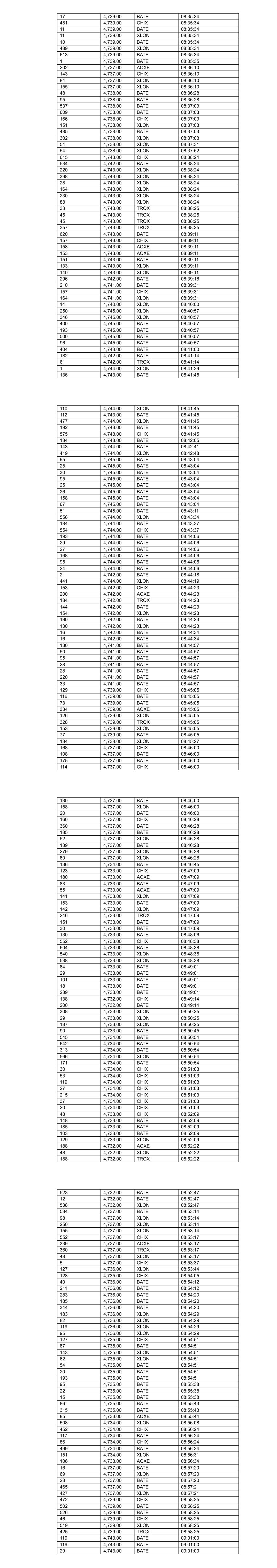 17 4,739.00 BATE 08:35:34 481 4,739.00 CHIX 08:35:34 11 4,739.00 BATE 08:35:34 11 4,739.00 XLON 08:35:34 10 4,739.00 BATE 08:35:34 489 4,739.00 XLON 08:35:34 613 4,739.00 BATE 08:35:34 1 4,739.00 BATE 08:35:35 202 4,737.00 AQXE 08:36:10 143 4,737.00 CHIX 08:36:10 84 4,737.00 XLON 08:36:10 155 4,737.00 XLON 08:36:10 48 4,738.00 BATE 08:36:28 95 4,738.00 BATE 08:36:28 537 4,738.00 BATE 08:37:03 609 4,738.00 BATE 08:37:03 166 4,738.00 CHIX 08:37:03 151 4,738.00 XLON 08:37:03 485 4,738.00 BATE 08:37:03 302 4,738.00 XLON 08:37:03 54 4,738.00 XLON 08:37:31 54 4,738.00 XLON 08:37:52 615 4,743.00 CHIX 08:38:24 534 4,742.00 BATE 08:38:24 220 4,743.00 XLON 08:38:24 398 4,743.00 XLON 08:38:24 28 4,743.00 XLON 08:38:24 164 4,743.00 XLON 08:38:24 230 4,743.00 XLON 08:38:24 88 4,743.00 XLON 08:38:24 33 4,743.00 TRQX 08:38:25 45 4,743.00 TRQX 08:38:25 45 4,743.00 TRQX 08:38:25 357 4,743.00 TRQX 08:38:25 620 4,743.00 BATE 08:39:11 157 4,743.00 CHIX 08:39:11 158 4,743.00 AQXE 08:39:11 153 4,743.00 AQXE 08:39:11 151 4,743.00 BATE 08:39:11 133 4,743.00 XLON 08:39:11 140 4,743.00 XLON 08:39:11 296 4,742.00 BATE 08:39:18 210 4,741.00 BATE 08:39:31 157 4,741.00 CHIX 08:39:31 164 4,741.00 XLON 08:39:31 14 4,740.00 XLON 08:40:00 250 4,745.00 XLON 08:40:57 346 4,745.00 XLON 08:40:57 400 4,745.00 BATE 08:40:57 193 4,745.00 BATE 08:40:57 500 4,745.00 BATE 08:40:57 96 4,745.00 BATE 08:40:57 404 4,743.00 BATE 08:41:00 182 4,742.00 BATE 08:41:14 61 4,742.00 TRQX 08:41:14 1 4,744.00 XLON 08:41:29 136 4,743.00 BATE 08:41:45 110 4,744.00 XLON 08:41:45 112 4,743.00 BATE 08:41:45 477 4,744.00 XLON 08:41:45 192 4,743.00 BATE 08:41:45 575 4,743.00 CHIX 08:41:45 134 4,743.00 BATE 08:42:05 143 4,744.00 BATE 08:42:41 419 4,744.00 XLON 08:42:48 95 4,745.00 BATE 08:43:04 25 4,745.00 BATE 08:43:04 30 4,745.00 BATE 08:43:04 95 4,745.00 BATE 08:43:04 25 4,745.00 BATE 08:43:04 26 4,745.00 BATE 08:43:04 158 4,745.00 BATE 08:43:04 67 4,745.00 BATE 08:43:04 51 4,745.00 BATE 08:43:11 556 4,744.00 XLON 08:43:34 184 4,744.00 BATE 08:43:37 554 4,744.00 CHIX 08:43:37 193 4,744.00 BATE 08:44:06 29 4,744.00 BATE 08:44:06 27 4,744.00 BATE 08:44:06 168 4,744.00 BATE 08:44:06 95 4,744.00 BATE 08:44:06 24 4,744.00 BATE 08:44:06 2 4,742.00 BATE 08:44:18 441 4,744.00 XLON 08:44:19 153 4,742.00 CHIX 08:44:23 200 4,742.00 AQXE 08:44:23 184 4,742.00 TRQX 08:44:23 144 4,742.00 BATE 08:44:23 154 4,742.00 XLON 08:44:23 190 4,742.00 BATE 08:44:23 130 4,742.00 XLON 08:44:23 16 4,742.00 BATE 08:44:34 16 4,742.00 BATE 08:44:34 130 4,741.00 BATE 08:44:57 50 4,741.00 BATE 08:44:57 95 4,741.00 BATE 08:44:57 28 4,741.00 BATE 08:44:57 28 4,741.00 BATE 08:44:57 220 4,741.00 BATE 08:44:57 33 4,741.00 BATE 08:44:57 129 4,739.00 CHIX 08:45:05 116 4,739.00 BATE 08:45:05 73 4,739.00 BATE 08:45:05 334 4,739.00 AQXE 08:45:05 126 4,739.00 XLON 08:45:05 328 4,739.00 TRQX 08:45:05 153 4,739.00 XLON 08:45:05 77 4,739.00 BATE 08:45:05 134 4,738.00 XLON 08:45:27 168 4,737.00 CHIX 08:46:00 108 4,737.00 BATE 08:46:00 175 4,737.00 BATE 08:46:00 114 4,737.00 CHIX 08:46:00 130 4,737.00 BATE 08:46:00 158 4,737.00 XLON 08:46:00 20 4,737.00 BATE 08:46:00 160 4,737.00 CHIX 08:46:28 360 4,737.00 BATE 08:46:28 185 4,737.00 BATE 08:46:28 52 4,737.00 XLON 08:46:28 139 4,737.00 BATE 08:46:28 279 4,737.00 XLON 08:46:28 80 4,737.00 XLON 08:46:28 136 4,734.00 BATE 08:46:45 123 4,733.00 CHIX 08:47:09 180 4,733.00 AQXE 08:47:09 83 4,733.00 BATE 08:47:09 55 4,733.00 AQXE 08:47:09 141 4,733.00 XLON 08:47:09 153 4,733.00 BATE 08:47:09 142 4,733.00 XLON 08:47:09 246 4,733.00 TRQX 08:47:09 151 4,733.00 BATE 08:47:09 30 4,733.00 BATE 08:47:09 130 4,733.00 BATE 08:48:06 552 4,733.00 CHIX 08:48:38 604 4,733.00 BATE 08:48:38 540 4,733.00 XLON 08:48:38 538 4,733.00 XLON 08:48:38 84 4,733.00 BATE 08:49:01 29 4,733.00 BATE 08:49:01 101 4,733.00 BATE 08:49:01 18 4,733.00 BATE 08:49:01 239 4,733.00 BATE 08:49:01 138 4,732.00 CHIX 08:49:14 200 4,732.00 BATE 08:49:14 308 4,733.00 XLON 08:50:25 29 4,733.00 XLON 08:50:25 187 4,733.00 XLON 08:50:25 90 4,733.00 BATE 08:50:45 545 4,734.00 BATE 08:50:54 642 4,734.00 BATE 08:50:54 313 4,734.00 BATE 08:50:54 566 4,734.00 XLON 08:50:54 171 4,734.00 BATE 08:50:54 30 4,734.00 CHIX 08:51:03 53 4,734.00 CHIX 08:51:03 119 4,734.00 CHIX 08:51:03 27 4,734.00 CHIX 08:51:03 215 4,734.00 CHIX 08:51:03 37 4,734.00 CHIX 08:51:03 20 4,734.00 CHIX 08:51:03 48 4,733.00 CHIX 08:52:09 148 4,733.00 BATE 08:52:09 185 4,733.00 BATE 08:52:09 103 4,733.00 BATE 08:52:09 129 4,733.00 XLON 08:52:09 188 4,732.00 AQXE 08:52:22 48 4,732.00 XLON 08:52:22 188 4,732.00 TRQX 08:52:22 523 4,732.00 BATE 08:52:47 12 4,732.00 BATE 08:52:47 538 4,732.00 XLON 08:52:47 534 4,737.00 BATE 08:53:14 98 4,737.00 XLON 08:53:14 250 4,737.00 XLON 08:53:14 155 4,737.00 XLON 08:53:14 552 4,737.00 CHIX 08:53:17 339 4,737.00 AQXE 08:53:17 360 4,737.00 TRQX 08:53:17 48 4,737.00 XLON 08:53:17 5 4,737.00 CHIX 08:53:37 127 4,736.00 XLON 08:53:44 128 4,735.00 CHIX 08:54:05 40 4,736.00 BATE 08:54:12 211 4,736.00 BATE 08:54:12 283 4,736.00 BATE 08:54:20 185 4,736.00 BATE 08:54:20 344 4,736.00 BATE 08:54:20 183 4,736.00 XLON 08:54:29 82 4,736.00 XLON 08:54:29 119 4,736.00 XLON 08:54:29 95 4,736.00 XLON 08:54:29 127 4,735.00 CHIX 08:54:51 87 4,735.00 BATE 08:54:51 143 4,735.00 XLON 08:54:51 62 4,735.00 XLON 08:54:51 54 4,735.00 BATE 08:54:51 20 4,735.00 BATE 08:54:51 193 4,735.00 BATE 08:54:51 95 4,735.00 BATE 08:55:38 22 4,735.00 BATE 08:55:38 15 4,735.00 BATE 08:55:38 86 4,735.00 BATE 08:55:43 315 4,735.00 BATE 08:55:43 85 4,733.00 AQXE 08:55:44 508 4,734.00 XLON 08:56:08 452 4,734.00 CHIX 08:56:24 117 4,734.00 BATE 08:56:24 86 4,734.00 CHIX 08:56:24 499 4,734.00 BATE 08:56:24 151 4,734.00 XLON 08:56:31 106 4,733.00 AQXE 08:56:34 16 4,737.00 BATE 08:57:20 69 4,737.00 XLON 08:57:20 28 4,737.00 BATE 08:57:20 465 4,737.00 BATE 08:57:21 427 4,737.00 XLON 08:57:21 472 4,739.00 CHIX 08:58:25 502 4,739.00 BATE 08:58:25 526 4,739.00 BATE 08:58:25 46 4,739.00 CHIX 08:58:25 519 4,739.00 XLON 08:58:25 425 4,739.00 TRQX 08:58:25 119 4,743