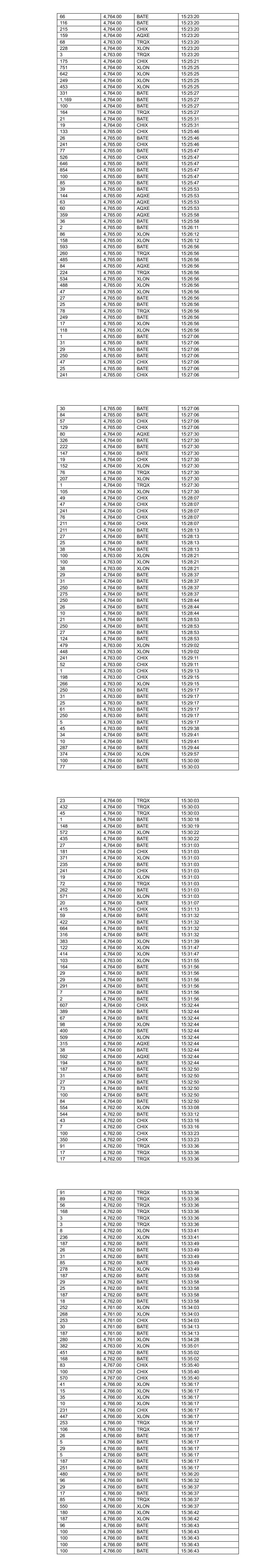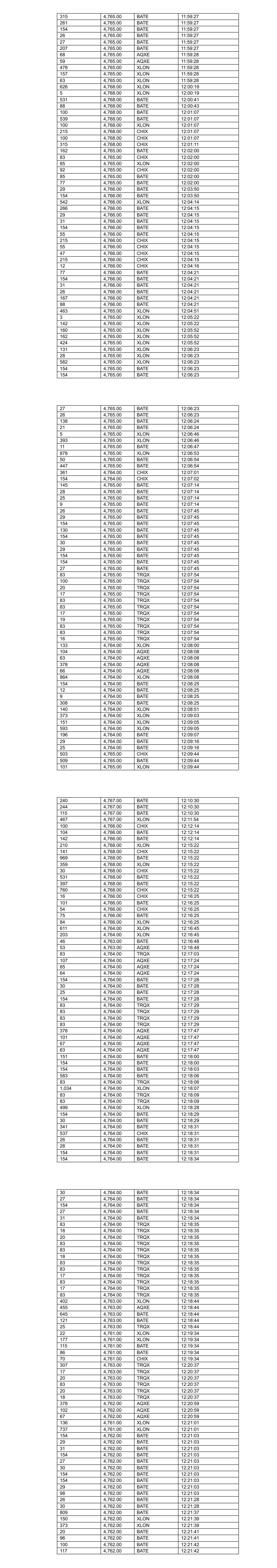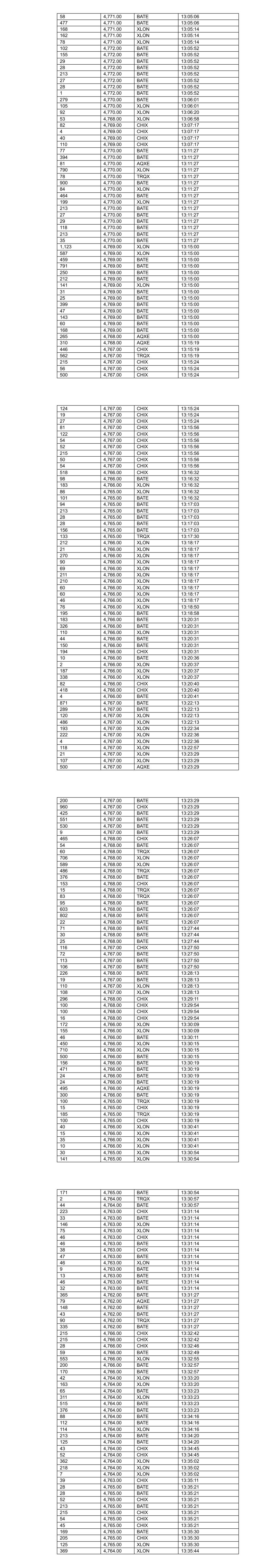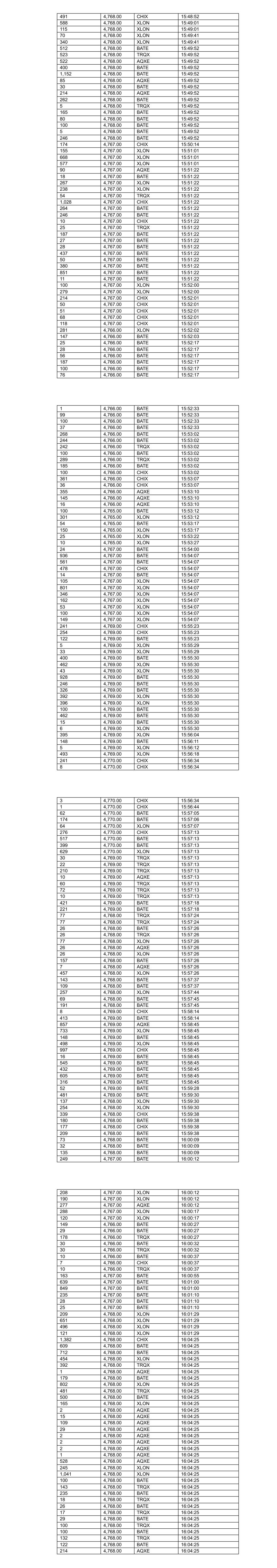115 4,764.00 BATE 11:11:59 519 4,764.00 BATE 11:11:59 442 4,764.00 BATE 11:11:59 206 4,764.00 BATE 11:12:23 30 4,764.00 BATE 11:12:23 25 4,764.00 BATE 11:12:23 206 4,764.00 BATE 11:12:23 4 4,764.00 BATE 11:12:23 243 4,764.00 CHIX 11:12:23 238 4,764.00 CHIX 11:12:23 388 4,764.00 XLON 11:12:30 22 4,763.00 XLON 11:13:03 34 4,763.00 XLON 11:13:03 427 4,764.00 BATE 11:13:30 200 4,764.00 XLON 11:13:31 24 4,764.00 XLON 11:13:31 297 4,764.00 XLON 11:13:33 20 4,764.00 XLON 11:13:33 378 4,764.00 AQXE 11:13:41 63 4,764.00 AQXE 11:13:41 55 4,764.00 AQXE 11:13:41 83 4,764.00 TRQX 11:14:01 3 4,764.00 TRQX 11:14:01 284 4,764.00 TRQX 11:14:30 117 4,764.00 TRQX 11:14:30 500 4,764.00 XLON 11:14:32 12 4,764.00 XLON 11:14:32 28 4,764.00 BATE 11:14:56 29 4,764.00 BATE 11:14:56 569 4,766.00 CHIX 11:15:10 531 4,765.00 BATE 11:15:18 565 4,765.00 BATE 11:15:18 153 4,765.00 XLON 11:15:56 230 4,765.00 XLON 11:15:56 92 4,765.00 XLON 11:15:56 474 4,765.00 CHIX 11:17:33 37 4,765.00 CHIX 11:17:44 8 4,764.00 BATE 11:18:05 347 4,766.00 XLON 11:18:28 101 4,766.00 XLON 11:18:28 67 4,765.00 BATE 11:20:00 414 4,766.00 BATE 11:20:11 496 4,766.00 CHIX 11:20:11 400 4,766.00 BATE 11:20:11 155 4,766.00 BATE 11:20:11 55 4,766.00 BATE 11:20:11 942 4,766.00 BATE 11:20:17 180 4,766.00 XLON 11:20:30 159 4,766.00 XLON 11:20:30 146 4,766.00 XLON 11:20:30 206 4,766.00 BATE 11:21:08 31 4,766.00 BATE 11:21:08 26 4,766.00 BATE 11:21:08 17 4,766.00 BATE 11:21:08 206 4,766.00 BATE 11:21:08 20 4,766.00 BATE 11:21:08 16 4,766.00 BATE 11:21:08 10 4,766.00 BATE 11:21:08 5 4,765.00 CHIX 11:21:08 97 4,765.00 CHIX 11:21:14 98 4,765.00 XLON 11:21:14 117 4,765.00 BATE 11:21:14 21 4,764.00 BATE 11:22:00 388 4,764.00 XLON 11:22:09 191 4,764.00 XLON 11:22:09 133 4,764.00 BATE 11:22:36 31 4,764.00 BATE 11:22:36 29 4,764.00 BATE 11:22:36 3 4,766.00 BATE 11:24:27 397 4,767.00 BATE 11:25:07 47 4,767.00 BATE 11:25:07 900 4,767.00 CHIX 11:25:11 213 4,767.00 BATE 11:25:11 928 4,767.00 BATE 11:25:11 810 4,767.00 XLON 11:25:11 7 4,767.00 CHIX 11:25:11 237 4,767.00 BATE 11:25:11 17 4,767.00 BATE 11:25:11 7 4,767.00 XLON 11:25:11 61 4,766.00 CHIX 11:25:59 25 4,767.00 BATE 11:26:44 27 4,767.00 BATE 11:26:44 175 4,767.00 BATE 11:26:44 228 4,767.00 BATE 11:26:44 595 4,768.00 BATE 11:29:44 595 4,768.00 CHIX 11:29:44 649 4,768.00 XLON 11:29:44 563 4,768.00 BATE 11:29:44 81 4,768.00 BATE 11:29:44 329 4,768.00 BATE 11:30:48 16 4,768.00 XLON 11:32:37 474 4,768.00 XLON 11:33:42 160 4,768.00 BATE 11:34:03 491 4,768.00 CHIX 11:34:03 80 4,768.00 XLON 11:34:03 559 4,768.00 BATE 11:34:03 424 4,768.00 XLON 11:34:03 215 4,768.00 CHIX 11:34:03 53 4,768.00 CHIX 11:34:03 48 4,768.00 CHIX 11:34:03 266 4,768.00 BATE 11:34:03 931 4,769.00 BATE 11:34:37 168 4,768.00 CHIX 11:34:37 8 4,768.00 BATE 11:34:38 134 4,768.00 BATE 11:34:45 81 4,767.00 XLON 11:35:55 200 4,767.00 CHIX 11:35:55 148 4,767.00 BATE 11:35:55 188 4,767.00 BATE 11:35:55 215 4,768.00 CHIX 11:38:48 77 4,768.00 XLON 11:38:48 72 4,768.00 XLON 11:38:48 331 4,768.00 CHIX 11:38:48 598 4,768.00 XLON 11:38:48 187 4,767.00 CHIX 11:40:20 89 4,767.00 XLON 11:40:20 1,001 4,767.00 BATE 11:40:21 308 4,769.00 BATE 11:40:46 158 4,769.00 BATE 11:40:58 1,009 4,770.00 BATE 11:41:31 561 4,770.00 XLON 11:41:51 245 4,767.00 BATE 11:42:49 289 4,767.00 CHIX 11:42:49 111 4,767.00 XLON 11:42:49 3 4,767.00 BATE 11:42:53 4 4,767.00 BATE 11:42:56 28 4,767.00 BATE 11:42:56 27 4,767.00 BATE 11:42:56 206 4,767.00 BATE 11:42:56 218 4,767.00 BATE 11:42:56 731 4,767.00 CHIX 11:45:12 499 4,767.00 BATE 11:45:12 500 4,767.00 XLON 11:45:31 192 4,767.00 CHIX 11:45:31 37 4,767.00 BATE 11:45:31 1 4,767.00 XLON 11:45:31 374 4,767.00 BATE 11:45:56 30 4,767.00 BATE 11:45:56 29 4,767.00 BATE 11:45:56 131 4,767.00 BATE 11:45:56 129 4,767.00 BATE 11:46:42 680 4,768.00 BATE 11:47:49 165 4,768.00 XLON 11:47:58 164 4,768.00 XLON 11:47:58 82 4,768.00 XLON 11:47:58 354 4,768.00 CHIX 11:49:11 243 4,768.00 CHIX 11:50:00 482 4,768.00 BATE 11:50:00 533 4,768.00 BATE 11:50:00 4 4,766.00 XLON 11:50:30 100 4,766.00 XLON 11:50:30 140 4,766.00 XLON 11:50:30 200 4,766.00 XLON 11:50:30 54 4,767.00 CHIX 11:51:32 51 4,767.00 CHIX 11:51:32 174 4,767.00 CHIX 11:51:32 236 4,767.00 CHIX 11:51:32 256 4,768.00 XLON 11:53:18 179 4,768.00 XLON 11:53:18 198 4,768.00 BATE 11:53:19 84 4,768.00 BATE 11:53:20 29 4,768.00 BATE 11:53:20 449 4,768.00 BATE 11:53:21 192 4,768.00 BATE 11:53:21 24 4,768.00 BATE 11:53:21 400 4,768.00 BATE 11:53:21 174 4,768.00 BATE 11:53:21 74 4,768.00 XLON 11:53:21 157 4,768.00 BATE 11:53:33 100 4,768.00 CHIX 11:54:05 364 4,768.00 CHIX 11:54:05 257 4,766.00 BATE 11:54:32 188 4,766.00 BATE 11:54:32 29 4,766.00 CHIX 11:54:32 198 4,766.00 XLON 11:54:32 103 4,766.00 XLON 11:54:32 107 4,765.00 CHIX 11:54:49 413 4,766.00 BATE 11:56:13 34 4,766.00 BATE 11:56:37 35 4,766.00 BATE 11:56:37 9 4,766.00 BATE 11:56:37 13 4,766.00 BATE 11:56:37 15 4,766.00 BATE 11:56:37 9 4,766.00 BATE 11:56:37 182 4,765.00 XLON 11:56:40 77 4,765.00 XLON 11:56:40 11 4,765.00 XLON 11:56:40 49 4,765.00 XLON 11:56:40 51 4,765.00 XLON 11:56:40 131 4,765.00 XLON 11:56:40 353 4,765.00 XLON 11:56:43 29 4,765.00 XLON 11:56:43 176 4,765.00 XLON 11:56:43 18 4,765.00 CHIX 11:57:34 523 4,765.00 BATE 11:57:34 305 4,765.00 CHIX 11:57:34 156 4,765.00 CHIX 11:57:34 40 4,765.00 CHIX 11:57:34 108 4,765.00 BATE 11:57:35 80 4,765.00 BATE 11:57:35 29 4,765.00 BATE 11:57:35 23 4,765.00 BATE 11:57:35 26 4,765.00 BATE 11:57:35 44 4,765.00 BATE 11:57:35 23 4,765.00 BATE 11:57:35 19 4,765.00 BATE 11:57:35 11 4,765.00 BATE 11:57:35 26 4,765.00 BATE 11:57:35 19 4,765.00 BATE 11:57:35 15 4,765.00 BATE 11:57:35 18 4,765.00 BATE 11:57:35 9 4,765.00 BATE 11:57:35 10 4,765.00 BATE 11:57:35 14 4,765.00 BATE 11:57:35 11 4,765.00 BATE 11:57:35 11 4,765.00 BATE 11:57:35 14 4,765.00 BATE 11:57:35 9 4,765.00 BATE 11:57:35 138 4,764.00 BATE 11:57:41 98 4,764.00 XLON 11:57:41 30 4,763.00 BATE 11:57:42 19 4,764.00 XLON 11:57:44 14 4,764.00 XLON 11:57:44 10 4,764.00 XLON 11:57:44 260 4,764.00 XLON 11:57:44 179 4,764.00 XLON 11:57:44 176 4,764.00 