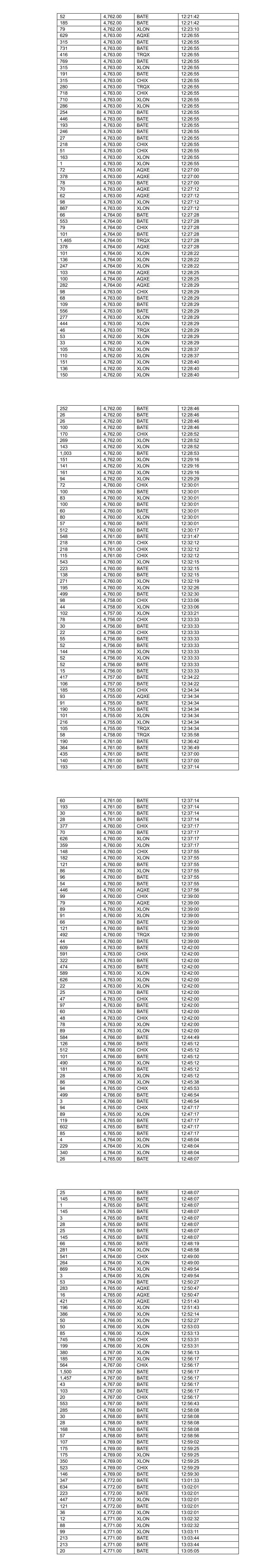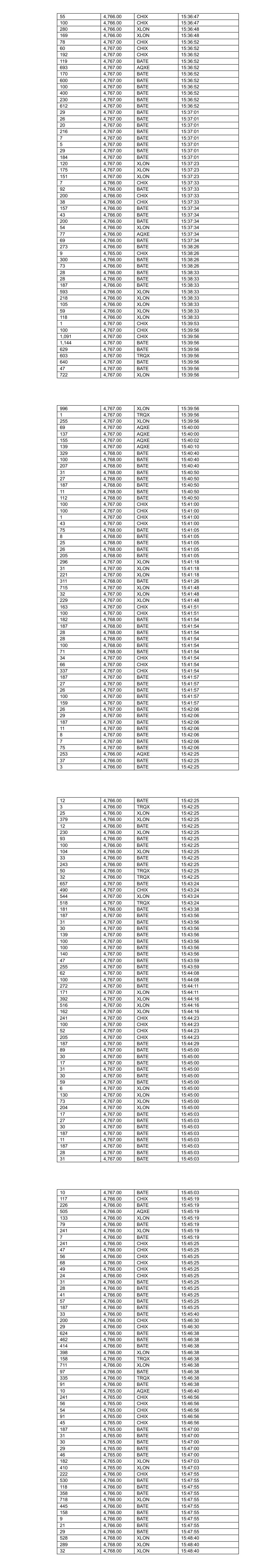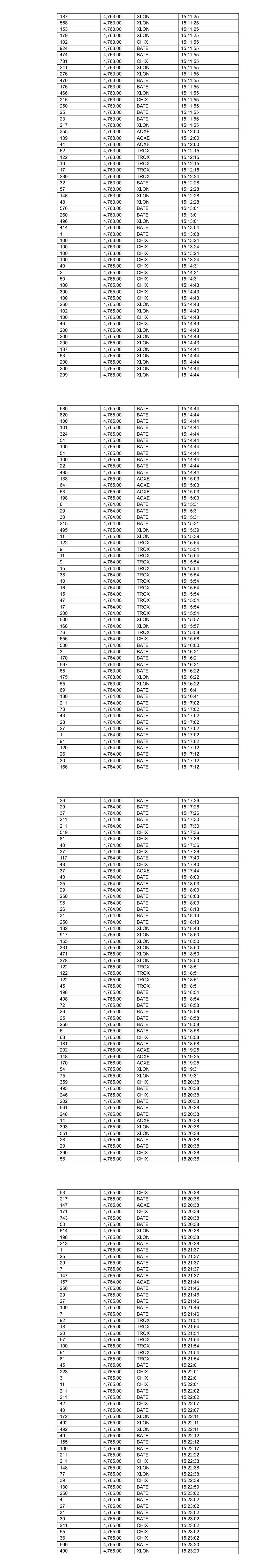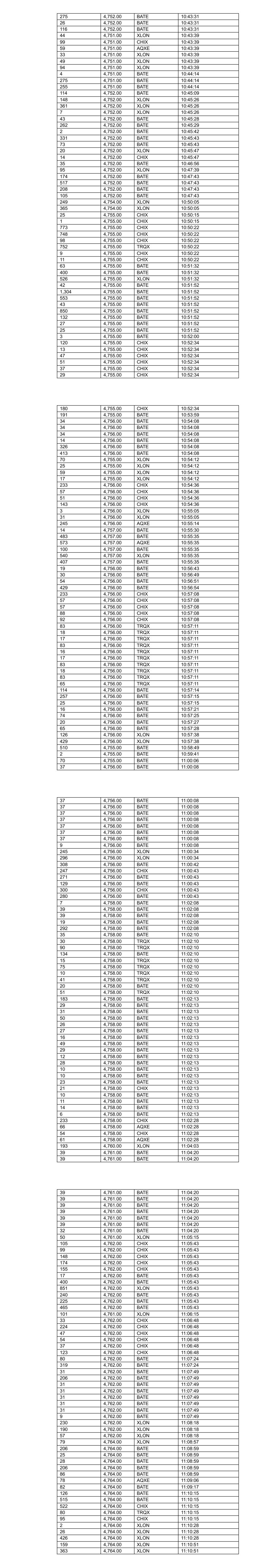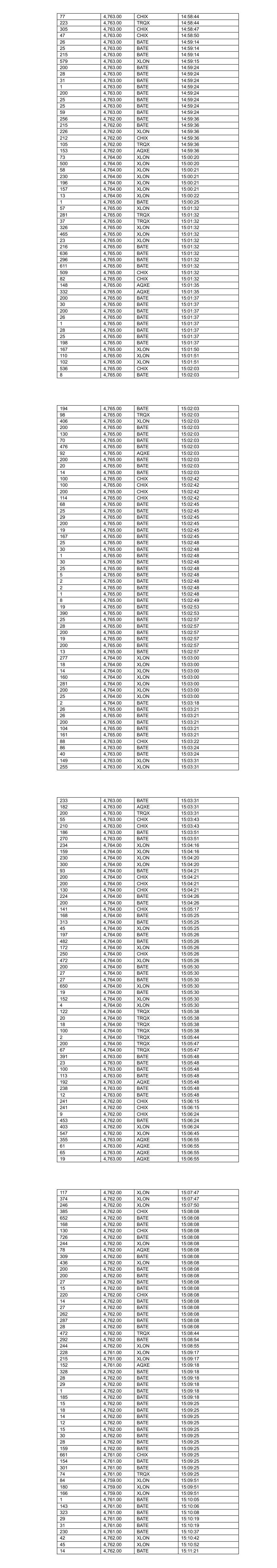 115 4,764.00 BATE 11:11:59 519 4,764.00 BATE 11:11:59 442 4,764.00 BATE 11:11:59 206 4,764.00 BATE 11:12:23 30 4,764.00 BATE 11:12:23 25 4,764.00 BATE 11:12:23 206 4,764.00 BATE 11:12:23 4 4,764.00 BATE 11:12:23 243 4,764.00 CHIX 11:12:23 238 4,764.00 CHIX 11:12:23 388 4,764.00 XLON 11:12:30 22 4,763.00 XLON 11:13:03 34 4,763.00 XLON 11:13:03 427 4,764.00 BATE 11:13:30 200 4,764.00 XLON 11:13:31 24 4,764.00 XLON 11:13:31 297 4,764.00 XLON 11:13:33 20 4,764.00 XLON 11:13:33 378 4,764.00 AQXE 11:13:41 63 4,764.00 AQXE 11:13:41 55 4,764.00 AQXE 11:13:41 83 4,764.00 TRQX 11:14:01 3 4,764.00 TRQX 11:14:01 284 4,764.00 TRQX 11:14:30 117 4,764.00 TRQX 11:14:30 500 4,764.00 XLON 11:14:32 12 4,764.00 XLON 11:14:32 28 4,764.00 BATE 11:14:56 29 4,764.00 BATE 11:14:56 569 4,766.00 CHIX 11:15:10 531 4,765.00 BATE 11:15:18 565 4,765.00 BATE 11:15:18 153 4,765.00 XLON 11:15:56 230 4,765.00 XLON 11:15:56 92 4,765.00 XLON 11:15:56 474 4,765.00 CHIX 11:17:33 37 4,765.00 CHIX 11:17:44 8 4,764.00 BATE 11:18:05 347 4,766.00 XLON 11:18:28 101 4,766.00 XLON 11:18:28 67 4,765.00 BATE 11:20:00 414 4,766.00 BATE 11:20:11 496 4,766.00 CHIX 11:20:11 400 4,766.00 BATE 11:20:11 155 4,766.00 BATE 11:20:11 55 4,766.00 BATE 11:20:11 942 4,766.00 BATE 11:20:17 180 4,766.00 XLON 11:20:30 159 4,766.00 XLON 11:20:30 146 4,766.00 XLON 11:20:30 206 4,766.00 BATE 11:21:08 31 4,766.00 BATE 11:21:08 26 4,766.00 BATE 11:21:08 17 4,766.00 BATE 11:21:08 206 4,766.00 BATE 11:21:08 20 4,766.00 BATE 11:21:08 16 4,766.00 BATE 11:21:08 10 4,766.00 BATE 11:21:08 5 4,765.00 CHIX 11:21:08 97 4,765.00 CHIX 11:21:14 98 4,765.00 XLON 11:21:14 117 4,765.00 BATE 11:21:14 21 4,764.00 BATE 11:22:00 388 4,764.00 XLON 11:22:09 191 4,764.00 XLON 11:22:09 133 4,764.00 BATE 11:22:36 31 4,764.00 BATE 11:22:36 29 4,764.00 BATE 11:22:36 3 4,766.00 BATE 11:24:27 397 4,767.00 BATE 11:25:07 47 4,767.00 BATE 11:25:07 900 4,767.00 CHIX 11:25:11 213 4,767.00 BATE 11:25:11 928 4,767.00 BATE 11:25:11 810 4,767.00 XLON 11:25:11 7 4,767.00 CHIX 11:25:11 237 4,767.00 BATE 11:25:11 17 4,767.00 BATE 11:25:11 7 4,767.00 XLON 11:25:11 61 4,766.00 CHIX 11:25:59 25 4,767.00 BATE 11:26:44 27 4,767.00 BATE 11:26:44 175 4,767.00 BATE 11:26:44 228 4,767.00 BATE 11:26:44 595 4,768.00 BATE 11:29:44 595 4,768.00 CHIX 11:29:44 649 4,768.00 XLON 11:29:44 563 4,768.00 BATE 11:29:44 81 4,768.00 BATE 11:29:44 329 4,768.00 BATE 11:30:48 16 4,768.00 XLON 11:32:37 474 4,768.00 XLON 11:33:42 160 4,768.00 BATE 11:34:03 491 4,768.00 CHIX 11:34:03 80 4,768.00 XLON 11:34:03 559 4,768.00 BATE 11:34:03 424 4,768.00 XLON 11:34:03 215 4,768.00 CHIX 11:34:03 53 4,768.00 CHIX 11:34:03 48 4,768.00 CHIX 11:34:03 266 4,768.00 BATE 11:34:03 931 4,769.00 BATE 11:34:37 168 4,768.00 CHIX 11:34:37 8 4,768.00 BATE 11:34:38 134 4,768.00 BATE 11:34:45 81 4,767.00 XLON 11:35:55 200 4,767.00 CHIX 11:35:55 148 4,767.00 BATE 11:35:55 188 4,767.00 BATE 11:35:55 215 4,768.00 CHIX 11:38:48 77 4,768.00 XLON 11:38:48 72 4,768.00 XLON 11:38:48 331 4,768.00 CHIX 11:38:48 598 4,768.00 XLON 11:38:48 187 4,767.00 CHIX 11:40:20 89 4,767.00 XLON 11:40:20 1,001 4,767.00 BATE 11:40:21 308 4,769.00 BATE 11:40:46 158 4,769.00 BATE 11:40:58 1,009 4,770.00 BATE 11:41:31 561 4,770.00 XLON 11:41:51 245 4,767.00 BATE 11:42:49 289 4,767.00 CHIX 11:42:49 111 4,767.00 XLON 11:42:49 3 4,767.00 BATE 11:42:53 4 4,767.00 BATE 11:42:56 28 4,767.00 BATE 11:42:56 27 4,767.00 BATE 11:42:56 206 4,767.00 BATE 11:42:56 218 4,767.00 BATE 11:42:56 731 4,767.00 CHIX 11:45:12 499 4,767.00 BATE 11:45:12 500 4,767.00 XLON 11:45:31 192 4,767.00 CHIX 11:45:31 37 4,767.00 BATE 11:45:31 1 4,767.00 XLON 11:45:31 374 4,767.00 BATE 11:45:56 30 4,767.00 BATE 11:45:56 29 4,767.00 BATE 11:45:56 131 4,767.00 BATE 11:45:56 129 4,767.00 BATE 11:46:42 680 4,768.00 BATE 11:47:49 165 4,768.00 XLON 11:47:58 164 4,768.00 XLON 11:47:58 82 4,768.00 XLON 11:47:58 354 4,768.00 CHIX 11:49:11 243 4,768.00 CHIX 11:50:00 482 4,768.00 BATE 11:50:00 533 4,768.00 BATE 11:50:00 4 4,766.00 XLON 11:50:30 100 4,766.00 XLON 11:50:30 140 4,766.00 XLON 11:50:30 200 4,766.00 XLON 11:50:30 54 4,767.00 CHIX 11:51:32 51 4,767.00 CHIX 11:51:32 174 4,767.00 CHIX 11:51:32 236 4,767.00 CHIX 11:51:32 256 4,768.00 XLON 11:53:18 179 4,768.00 XLON 11:53:18 198 4,768.00 BATE 11:53:19 84 4,768.00 BATE 11:53:20 29 4,768.00 BATE 11:53:20 449 4,768.00 BATE 11:53:21 192 4,768.00 BATE 11:53:21 24 4,768.00 BATE 11:53:21 400 4,768.00 BATE 11:53:21 174 4,768.00 BATE 11:53:21 74 4,768.00 XLON 11:53:21 157 4,768.00 BATE 11:53:33 100 4,768.00 CHIX 11:54:05 364 4,768.00 CHIX 11:54:05 257 4,766.00 BATE 11:54:32 188 4,766.00 BATE 11:54:32 29 4,766.00 CHIX 11:54:32 198 4,766.00 XLON 11:54:32 103 4,766.00 XLON 11:54:32 107 4,765.00 CHIX 11:54:49 413 4,766.00 BATE 11:56:13 34 4,766.00 BATE 11:56:37 35 4,766.00 BATE 11:56:37 9 4,766.00 BATE 11:56:37 13 4,766.00 BATE 11:56:37 15 4,766.00 BATE 11:56:37 9 4,766.00 BATE 11:56:37 182 4,765.00 XLON 11:56:40 77 4,765.00 XLON 11:56:40 11 4,765.00 XLON 11:56:40 49 4,765.00 XLON 11:56:40 51 4,765.00 XLON 11:56:40 131 4,765.00 XLON 11:56:40 353 4,765.00 XLON 11:56:43 29 4,765.00 XLON 11:56:43 176 4,765.00 XLON 11:56:43 18 4,765.00 CHIX 11:57:34 523 4,765.00 BATE 11:57:34 305 4,765.00 CHIX 11:57:34 156 4,765.00 CHIX 11:57:34 40 4,765.00 CHIX 11:57:34 108 4,765.00 BATE 11:57:35 80 4,765.00 BATE 11:57:35 29 4,765.00 BATE 11:57:35 23 4,765.00 BATE 11:57:35 26 4,765.00 BATE 11:57:35 44 4,765.00 BATE 11:57:35 23 4,765.00 BATE 11:57:35 19 4,765.00 BATE 11:57:35 11 4,765.00 BATE 11:57:35 26 4,765.00 BATE 11:57:35 19 4,765.00 BATE 11:57:35 15 4,765.00 BATE 11:57:35 18 4,765.00 BATE 11:57:35 9 4,765.00 BATE 11:57:35 10 4,765.00 BATE 11:57:35 14 4,765.00 BATE 11:57:35 11 4,765.00 BATE 11:57:35 11 4,765.00 BATE 11:57:35 14 4,765.00 BATE 11:57:35 9 4,765.00 BATE 11:57:35 138 4,764.00 BATE 11:57:41 98 4,764.00 XLON 11:57:41 30 4,763.00 BATE 11:57:42 19 4,764.00 XLON 11:57:44 14 4,764.00 XLON 11:57:44 10 4,764.00 XLON 11:57:44 260 4,764.00 XLON 11:57:44 179 4,764.00 XLON 11:57:44 176 4,764.00 