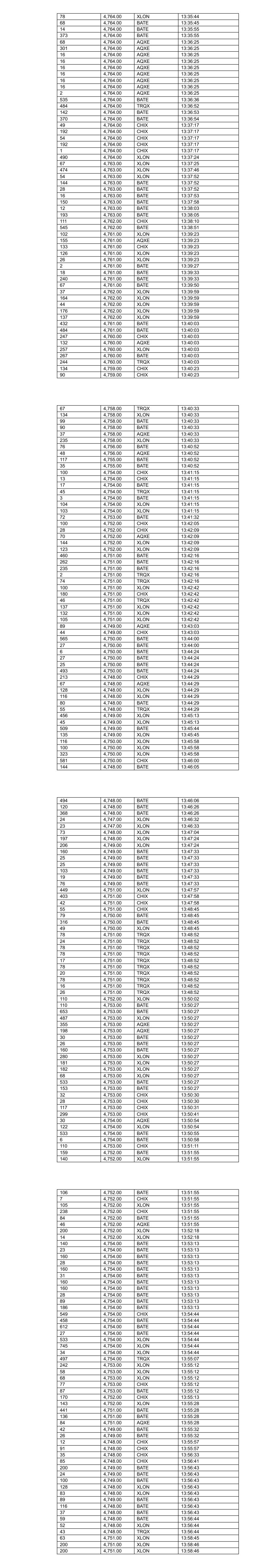78 4,764.00 XLON 13:35:44 68 4,764.00 BATE 13:35:45 14 4,764.00 BATE 13:35:55 373 4,764.00 BATE 13:35:55 68 4,764.00 AQXE 13:36:25 301 4,764.00 AQXE 13:36:25 16 4,764.00 AQXE 13:36:25 16 4,764.00 AQXE 13:36:25 16 4,764.00 AQXE 13:36:25 16 4,764.00 AQXE 13:36:25 16 4,764.00 AQXE 13:36:25 16 4,764.00 AQXE 13:36:25 2 4,764.00 AQXE 13:36:25 535 4,764.00 BATE 13:36:36 484 4,764.00 TRQX 13:36:52 142 4,764.00 BATE 13:36:53 370 4,764.00 BATE 13:36:54 49 4,764.00 CHIX 13:37:17 192 4,764.00 CHIX 13:37:17 54 4,764.00 CHIX 13:37:17 192 4,764.00 CHIX 13:37:17 1 4,764.00 CHIX 13:37:17 490 4,764.00 XLON 13:37:24 67 4,763.00 XLON 13:37:25 474 4,763.00 XLON 13:37:46 54 4,763.00 XLON 13:37:52 144 4,763.00 BATE 13:37:52 28 4,763.00 BATE 13:37:52 16 4,763.00 BATE 13:37:53 150 4,763.00 BATE 13:37:58 12 4,763.00 BATE 13:38:03 193 4,763.00 BATE 13:38:05 111 4,762.00 CHIX 13:38:10 545 4,762.00 BATE 13:38:51 102 4,761.00 XLON 13:39:23 155 4,761.00 AQXE 13:39:23 133 4,761.00 CHIX 13:39:23 126 4,761.00 XLON 13:39:23 26 4,761.00 XLON 13:39:23 2 4,761.00 BATE 13:39:27 18 4,761.00 BATE 13:39:33 240 4,761.00 BATE 13:39:33 67 4,761.00 BATE 13:39:50 37 4,762.00 XLON 13:39:59 164 4,762.00 XLON 13:39:59 44 4,762.00 XLON 13:39:59 176 4,762.00 XLON 13:39:59 137 4,762.00 XLON 13:39:59 432 4,761.00 BATE 13:40:03 484 4,761.00 BATE 13:40:03 247 4,760.00 CHIX 13:40:03 132 4,760.00 AQXE 13:40:03 257 4,760.00 XLON 13:40:03 267 4,760.00 BATE 13:40:03 244 4,760.00 TRQX 13:40:03 134 4,759.00 CHIX 13:40:23 90 4,759.00 CHIX 13:40:23 67 4,758.00 TRQX 13:40:33 134 4,758.00 XLON 13:40:33 99 4,758.00 BATE 13:40:33 90 4,758.00 BATE 13:40:33 37 4,758.00 AQXE 13:40:33 235 4,758.00 XLON 13:40:33 76 4,756.00 BATE 13:40:52 48 4,756.00 AQXE 13:40:52 117 4,755.00 BATE 13:40:52 35 4,755.00 BATE 13:40:52 100 4,754.00 CHIX 13:41:15 13 4,754.00 CHIX 13:41:15 17 4,754.00 BATE 13:41:15 45 4,754.00 TRQX 13:41:15 3 4,754.00 BATE 13:41:15 104 4,754.00 XLON 13:41:15 103 4,754.00 XLON 13:41:15 72 4,753.00 BATE 13:41:32 100 4,752.00 CHIX 13:42:05 28 4,752.00 CHIX 13:42:09 70 4,752.00 AQXE 13:42:09 144 4,752.00 XLON 13:42:09 123 4,752.00 XLON 13:42:09 460 4,751.00 BATE 13:42:16 262 4,751.00 BATE 13:42:16 235 4,751.00 BATE 13:42:16 2 4,751.00 TRQX 13:42:16 74 4,751.00 TRQX 13:42:16 100 4,751.00 XLON 13:42:42 180 4,751.00 CHIX 13:42:42 46 4,751.00 TRQX 13:42:42 137 4,751.00 XLON 13:42:42 132 4,751.00 XLON 13:42:42 105 4,751.00 XLON 13:42:42 89 4,749.00 AQXE 13:43:03 44 4,749.00 CHIX 13:43:03 565 4,750.00 BATE 13:44:00 27 4,750.00 BATE 13:44:00 6 4,750.00 BATE 13:44:24 27 4,750.00 BATE 13:44:24 25 4,750.00 BATE 13:44:24 493 4,750.00 BATE 13:44:24 213 4,748.00 CHIX 13:44:29 67 4,748.00 AQXE 13:44:29 128 4,748.00 XLON 13:44:29 116 4,748.00 XLON 13:44:29 80 4,748.00 BATE 13:44:29 55 4,748.00 TRQX 13:44:29 456 4,749.00 XLON 13:45:13 45 4,749.00 XLON 13:45:13 509 4,749.00 BATE 13:45:44 135 4,749.00 XLON 13:45:45 116 4,750.00 XLON 13:45:58 100 4,750.00 XLON 13:45:58 323 4,750.00 XLON 13:45:58 581 4,750.00 CHIX 13:46:00 144 4,748.00 BATE 13:46:05 494 4,748.00 BATE 13:46:06 120 4,748.00 BATE 13:46:26 368 4,748.00 BATE 13:46:26 24 4,747.00 XLON 13:46:32 23 4,747.00 XLON 13:46:33 73 4,748.00 XLON 13:47:04 197 4,748.00 XLON 13:47:24 206 4,749.00 XLON 13:47:24 160 4,749.00 BATE 13:47:33 25 4,749.00 BATE 13:47:33 25 4,749.00 BATE 13:47:33 103 4,749.00 BATE 13:47:33 19 4,749.00 BATE 13:47:33 76 4,749.00 BATE 13:47:33 449 4,751.00 XLON 13:47:57 403 4,751.00 CHIX 13:47:58 42 4,751.00 CHIX 13:47:58 55 4,751.00 CHIX 13:48:45 79 4,750.00 BATE 13:48:45 316 4,750.00 BATE 13:48:45 49 4,750.00 XLON 13:48:45 78 4,751.00 TRQX 13:48:52 24 4,751.00 TRQX 13:48:52 78 4,751.00 TRQX 13:48:52 78 4,751.00 TRQX 13:48:52 17 4,751.00 TRQX 13:48:52 78 4,751.00 TRQX 13:48:52 20 4,751.00 TRQX 13:48:52 78 4,751.00 TRQX 13:48:52 16 4,751.00 TRQX 13:48:52 26 4,751.00 TRQX 13:48:52 110 4,752.00 XLON 13:50:02 110 4,753.00 BATE 13:50:27 653 4,753.00 BATE 13:50:27 487 4,753.00 XLON 13:50:27 355 4,753.00 AQXE 13:50:27 198 4,753.00 AQXE 13:50:27 30 4,753.00 BATE 13:50:27 26 4,753.00 BATE 13:50:27 160 4,753.00 BATE 13:50:27 280 4,753.00 XLON 13:50:27 181 4,753.00 XLON 13:50:27 182 4,753.00 XLON 13:50:27 68 4,753.00 XLON 13:50:27 533 4,753.00 BATE 13:50:27 153 4,753.00 BATE 13:50:27 32 4,753.00 CHIX 13:50:30 28 4,753.00 CHIX 13:50:30 117 4,753.00 CHIX 13:50:31 299 4,753.00 CHIX 13:50:41 30 4,754.00 AQXE 13:50:54 122 4,754.00 XLON 13:50:54 533 4,754.00 BATE 13:50:55 6 4,754.00 BATE 13:50:58 110 4,753.00 CHIX 13:51:11 159 4,752.00 BATE 13:51:55 140 4,752.00 XLON 13:51:55 106 4,752.00 BATE 13:51:55 7 4,752.00 CHIX 13:51:55 105 4,752.00 XLON 13:51:55 238 4,752.00 CHIX 13:51:55 84 4,752.00 BATE 13:51:55 46 4,752.00 AQXE 13:51:55 200 4,752.00 XLON 13:52:18 14 4,752.00 XLON 13:52:18 140 4,754.00 BATE 13:53:13 23 4,754.00 BATE 13:53:13 160 4,754.00 BATE 13:53:13 28 4,754.00 BATE 13:53:13 160 4,754.00 BATE 13:53:13 31 4,754.00 BATE 13:53:13 160 4,754.00 BATE 13:53:13 160 4,754.00 BATE 13:53:13 28 4,754.00 BATE 13:53:13 89 4,754.00 BATE 13:53:13 186 4,754.00 BATE 13:53:13 549 4,754.00 CHIX 13:54:44 458 4,754.00 BATE 13:54:44 612 4,754.00 BATE 13:54:44 27 4,754.00 BATE 13:54:44 533 4,754.00 XLON 13:54:44 745 4,754.00 XLON 13:54:44 34 4,754.00 XLON 13:54:44 497 4,754.00 TRQX 13:55:07 242 4,753.00 XLON 13:55:12 58 4,753.00 XLON 13:55:12 68 4,753.00 XLON 13:55:12 77 4,753.00 CHIX 13:55:12 87 4,753.00 BATE 13:55:12 170 4,752.00 CHIX 13:55:13 143 4,752.00 XLON 13:55:28 441 4,751.00 BATE 13:55:28 136 4,751.00 BATE 13:55:28 84 4,751.00 AQXE 13:55:28 42 4,749.00 BATE 13:55:32 26 4,749.00 BATE 13:55:32 12 4,748.00 CHIX 13:55:57 91 4,748.00 CHIX 13:55:57 35 4,748.00 CHIX 13:56:33 85 4,748.00 CHIX 13:56:41 200 4,749.00 BATE 13:56:43 24 4,749.00 BATE 13:56:43 100 4,749.00 BATE 13:56:43 128 4,748.00 XLON 13:56:43 83 4,748.00 XLON 13:56:43 89 4,749.00 BATE 13:56:43 116 4,748.00 BATE 13:56:43 37 4,748.00 BATE 13:56:43 59 4,748.00 BATE 13:56:44 52 4,748.00 XLON 13:56:44 43 4,748.00 TRQX 13:56:44 63 4,751.00 XLON 13:58:45 200 4,751.00 XLON