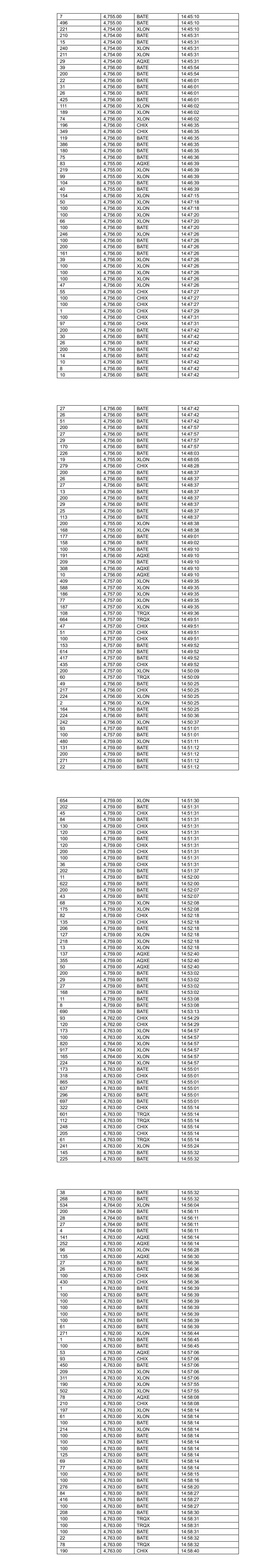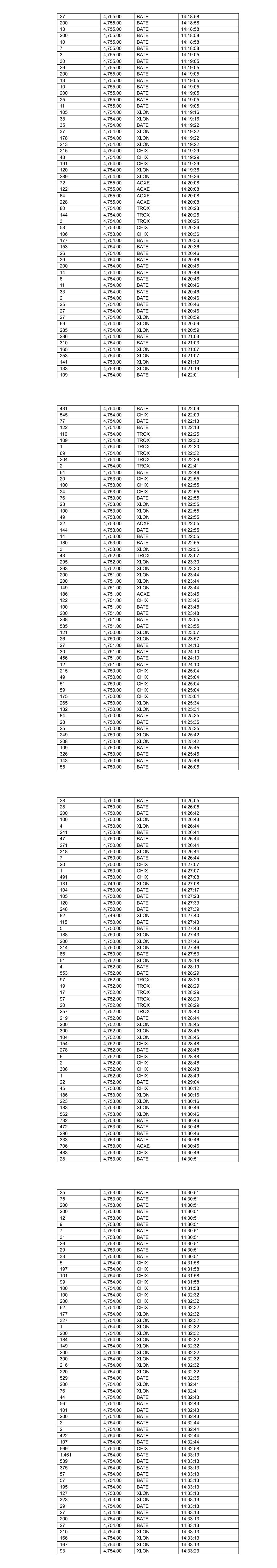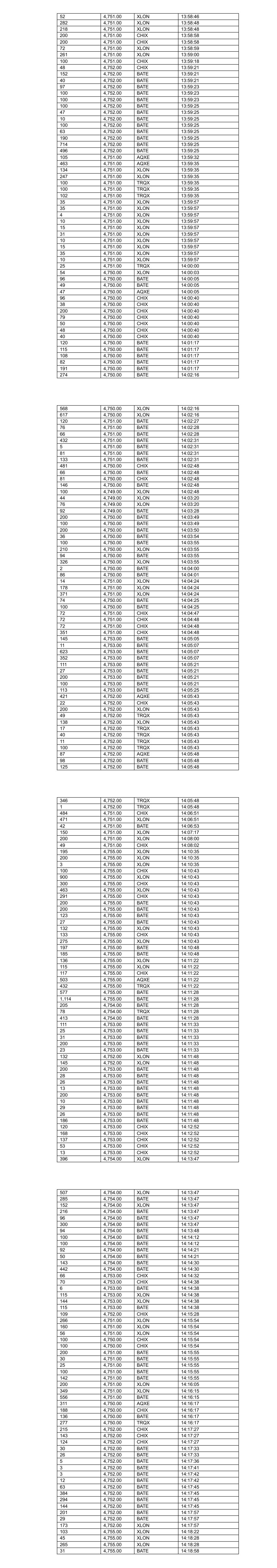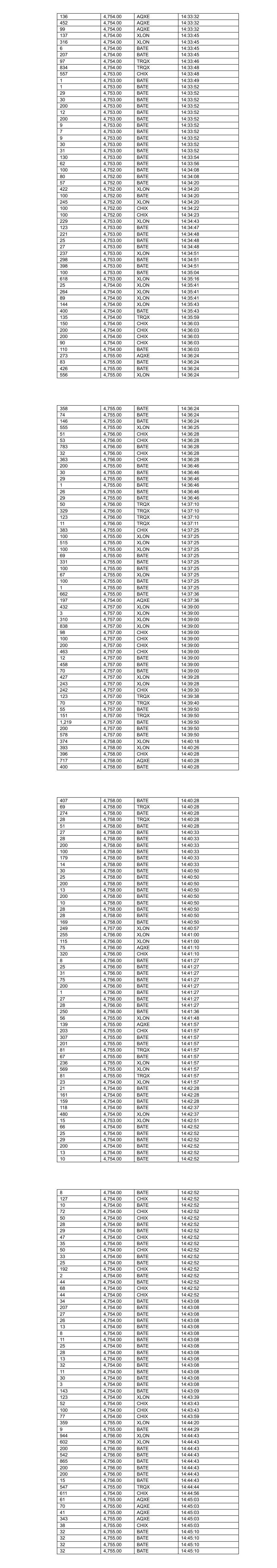 136 4,754.00 AQXE 14:33:32 452 4,754.00 AQXE 14:33:32 99 4,754.00 AQXE 14:33:32 137 4,754.00 XLON 14:33:45 316 4,754.00 XLON 14:33:45 6 4,754.00 BATE 14:33:45 207 4,754.00 BATE 14:33:45 97 4,754.00 TRQX 14:33:46 834 4,754.00 TRQX 14:33:48 557 4,753.00 CHIX 14:33:48 1 4,753.00 BATE 14:33:49 1 4,753.00 BATE 14:33:52 29 4,753.00 BATE 14:33:52 30 4,753.00 BATE 14:33:52 200 4,753.00 BATE 14:33:52 12 4,753.00 BATE 14:33:52 200 4,753.00 BATE 14:33:52 9 4,753.00 BATE 14:33:52 7 4,753.00 BATE 14:33:52 9 4,753.00 BATE 14:33:52 30 4,753.00 BATE 14:33:52 31 4,753.00 BATE 14:33:52 130 4,753.00 BATE 14:33:54 62 4,753.00 BATE 14:33:56 100 4,752.00 BATE 14:34:08 80 4,752.00 BATE 14:34:08 57 4,752.00 BATE 14:34:20 422 4,752.00 XLON 14:34:20 100 4,752.00 BATE 14:34:20 245 4,752.00 XLON 14:34:20 100 4,752.00 CHIX 14:34:22 100 4,752.00 CHIX 14:34:23 229 4,753.00 XLON 14:34:43 123 4,753.00 BATE 14:34:47 221 4,753.00 BATE 14:34:48 25 4,753.00 BATE 14:34:48 27 4,753.00 BATE 14:34:48 237 4,753.00 XLON 14:34:51 298 4,753.00 BATE 14:34:51 398 4,753.00 BATE 14:34:51 100 4,753.00 BATE 14:35:04 618 4,753.00 XLON 14:35:16 25 4,754.00 XLON 14:35:41 264 4,754.00 XLON 14:35:41 89 4,754.00 XLON 14:35:41 144 4,754.00 XLON 14:35:43 400 4,754.00 BATE 14:35:43 135 4,754.00 TRQX 14:35:59 150 4,754.00 CHIX 14:36:03 200 4,754.00 CHIX 14:36:03 200 4,754.00 CHIX 14:36:03 90 4,754.00 CHIX 14:36:03 110 4,754.00 BATE 14:36:03 273 4,755.00 AQXE 14:36:24 83 4,755.00 BATE 14:36:24 426 4,755.00 BATE 14:36:24 556 4,755.00 XLON 14:36:24 358 4,755.00 BATE 14:36:24 74 4,755.00 BATE 14:36:24 146 4,755.00 BATE 14:36:24 555 4,755.00 XLON 14:36:25 51 4,756.00 CHIX 14:36:28 53 4,756.00 CHIX 14:36:28 783 4,756.00 BATE 14:36:28 32 4,756.00 CHIX 14:36:28 363 4,756.00 CHIX 14:36:28 200 4,755.00 BATE 14:36:46 30 4,755.00 BATE 14:36:46 29 4,755.00 BATE 14:36:46 1 4,755.00 BATE 14:36:46 26 4,755.00 BATE 14:36:46 29 4,755.00 BATE 14:36:46 50 4,756.00 TRQX 14:37:10 329 4,756.00 TRQX 14:37:10 123 4,756.00 TRQX 14:37:10 11 4,756.00 TRQX 14:37:11 383 4,755.00 CHIX 14:37:25 100 4,755.00 XLON 14:37:25 515 4,755.00 XLON 14:37:25 100 4,755.00 XLON 14:37:25 69 4,755.00 BATE 14:37:25 331 4,755.00 BATE 14:37:25 100 4,755.00 BATE 14:37:25 67 4,755.00 XLON 14:37:25 100 4,755.00 BATE 14:37:25 1 4,755.00 BATE 14:37:25 662 4,755.00 BATE 14:37:36 197 4,754.00 AQXE 14:37:36 432 4,757.00 XLON 14:39:00 3 4,757.00 XLON 14:39:00 310 4,757.00 XLON 14:39:00 838 4,757.00 XLON 14:39:00 98 4,757.00 CHIX 14:39:00 100 4,757.00 CHIX 14:39:00 200 4,757.00 CHIX 14:39:00 463 4,757.00 CHIX 14:39:00 12 4,757.00 BATE 14:39:00 458 4,757.00 BATE 14:39:00 70 4,757.00 BATE 14:39:00 427 4,757.00 XLON 14:39:28 243 4,757.00 XLON 14:39:28 242 4,757.00 CHIX 14:39:30 123 4,757.00 TRQX 14:39:38 70 4,757.00 TRQX 14:39:40 55 4,757.00 BATE 14:39:50 151 4,757.00 TRQX 14:39:50 1,219 4,757.00 BATE 14:39:50 200 4,757.00 BATE 14:39:50 578 4,757.00 BATE 14:39:50 374 4,758.00 XLON 14:40:18 393 4,758.00 XLON 14:40:26 396 4,758.00 CHIX 14:40:28 717 4,758.00 AQXE 14:40:28 400 4,758.00 BATE 14:40:28 407 4,758.00 BATE 14:40:28 69 4,758.00 TRQX 14:40:28 274 4,758.00 BATE 14:40:28 28 4,758.00 TRQX 14:40:28 51 4,758.00 BATE 14:40:28 27 4,758.00 BATE 14:40:33 28 4,758.00 BATE 14:40:33 200 4,758.00 BATE 14:40:33 100 4,758.00 BATE 14:40:33 179 4,758.00 BATE 14:40:33 14 4,758.00 BATE 14:40:33 30 4,758.00 BATE 14:40:50 25 4,758.00 BATE 14:40:50 200 4,758.00 BATE 14:40:50 13 4,758.00 BATE 14:40:50 200 4,758.00 BATE 14:40:50 10 4,758.00 BATE 14:40:50 28 4,758.00 BATE 14:40:50 28 4,758.00 BATE 14:40:50 169 4,758.00 BATE 14:40:50 249 4,757.00 XLON 14:40:57 255 4,756.00 XLON 14:41:00 115 4,756.00 XLON 14:41:00 75 4,756.00 AQXE 14:41:10 320 4,756.00 CHIX 14:41:10 8 4,756.00 BATE 14:41:27 25 4,756.00 BATE 14:41:27 31 4,756.00 BATE 14:41:27 75 4,756.00 BATE 14:41:27 200 4,756.00 BATE 14:41:27 1 4,756.00 BATE 14:41:27 27 4,756.00 BATE 14:41:27 28 4,756.00 BATE 14:41:27 250 4,756.00 BATE 14:41:36 56 4,755.00 XLON 14:41:48 139 4,755.00 AQXE 14:41:57 203 4,755.00 CHIX 14:41:57 307 4,755.00 BATE 14:41:57 201 4,755.00 BATE 14:41:57 81 4,755.00 TRQX 14:41:57 67 4,755.00 BATE 14:41:57 236 4,755.00 XLON 14:41:57 569 4,755.00 XLON 14:41:57 81 4,755.00 TRQX 14:41:57 23 4,754.00 XLON 14:41:57 21 4,754.00 BATE 14:42:28 161 4,754.00 BATE 14:42:28 159 4,754.00 BATE 14:42:28 118 4,754.00 BATE 14:42:37 480 4,754.00 XLON 14:42:37 15 4,753.00 XLON 14:42:51 66 4,754.00 BATE 14:42:52 25 4,754.00 BATE 14:42:52 29 4,754.00 BATE 14:42:52 200 4,754.00 BATE 14:42:52 13 4,754.00 BATE 14:42:52 10 4,754.00 BATE 14:42:52 8 4,754.00 BATE 14:42:52 127 4,754.00 CHIX 14:42:52 10 4,754.00 BATE 14:42:52 72 4,754.00 CHIX 14:42:52 50 4,754.00 CHIX 14:42:52 28 4,754.00 BATE 14:42:52 29 4,754.00 BATE 14:42:52 47 4,754.00 CHIX 14:42:52 35 4,754.00 BATE 14:42:52 50 4,754.00 CHIX 14:42:52 33 4,754.00 BATE 14:42:52 25 4,754.00 BATE 14:42:52 192 4,754.00 CHIX 14:42:52 2 4,754.00 BATE 14:42:52 44 4,754.00 BATE 14:42:52 68 4,754.00 CHIX 14:42:52 44 4,754.00 CHIX 14:42:52 34 4,754.00 BATE 14:43:08 207 4,754.00 BATE 14:43:08 27 4,754.00 BATE 14:43:08 26 4,754.00 BATE 14:43:08 13 4,754.00 BATE 14:43:08 8 4,754.00 BATE 14:43:08 11 4,754.00 BATE 14:43:08 25 4,754.00 BATE 14:43:08 28 4,754.00 BATE 14:43:08 13 4,754.00 BATE 14:43:08 32 4,754.00 BATE 14:43:08 11 4,754.00 BATE 14:43:08 30 4,754.00 BATE 14:43:08 3 4,754.00 BATE 14:43:08 143 4,754.00 BATE 14:43:09 123 4,754.00 XLON 14:43:39 52 4,754.00 CHIX 14:43:43 100 4,754.00 CHIX 14:43:43 77 4,754.00 CHIX 14:43:59 359 4,755.00 XLON 14:44:20 9 4,755.00 BATE 14:44:29 944 4,756.00 XLON 14:44:43 602 4,756.00 XLON 14:44:43 200 4,756.00 BATE 14:44:43 542 4,756.00 BATE 14:44:43 865 4,756.00 BATE 14:44:43 200 4,756.00 BATE 14:44:43 200 4,756.00 BATE 14:44:43 15 4,756.00 BATE 14:44:43 547 4,755.00 TRQX 14:44:44 611 4,754.00 CHIX 14:44:56 61 4,755.00 AQXE 14:45:03 70 4,755.00 AQXE 14:45:03 41 4,755.00 AQXE 14:45:03 343 4,755.00 AQXE 14:45:03 38 4,755.00 CHIX 14:45:03 32 4,755.00 BATE 14:45:10 32 4,755.00 BATE 14:45:10 32 4,755.00 BATE 14:45:1