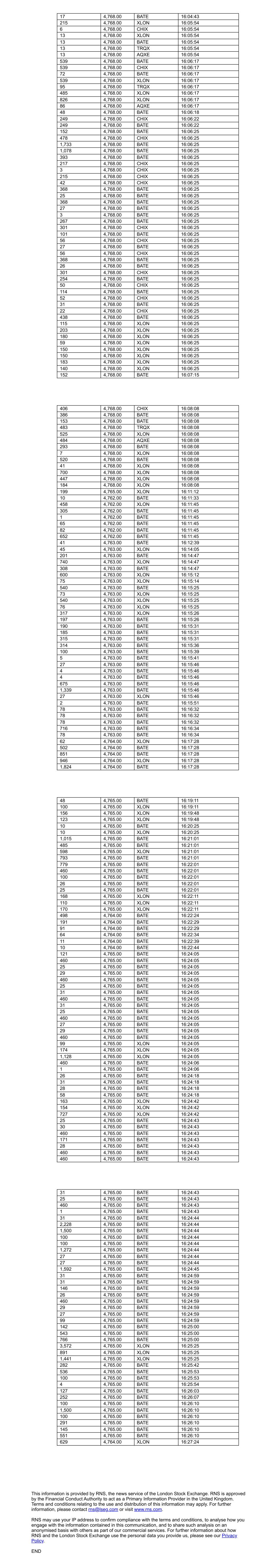17 4,768.00 BATE 16:04:43 215 4,768.00 XLON 16:05:54 6 4,768.00 CHIX 16:05:54 13 4,768.00 XLON 16:05:54 13 4,768.00 BATE 16:05:54 13 4,768.00 TRQX 16:05:54 13 4,768.00 AQXE 16:05:54 539 4,768.00 BATE 16:06:17 539 4,768.00 CHIX 16:06:17 72 4,768.00 BATE 16:06:17 539 4,768.00 XLON 16:06:17 95 4,768.00 TRQX 16:06:17 485 4,768.00 XLON 16:06:17 826 4,768.00 XLON 16:06:17 86 4,768.00 AQXE 16:06:17 48 4,768.00 BATE 16:06:18 249 4,768.00 CHIX 16:06:22 249 4,768.00 BATE 16:06:22 152 4,768.00 BATE 16:06:25 478 4,768.00 CHIX 16:06:25 1,733 4,768.00 BATE 16:06:25 1,078 4,768.00 BATE 16:06:25 393 4,768.00 BATE 16:06:25 217 4,768.00 CHIX 16:06:25 3 4,768.00 CHIX 16:06:25 215 4,768.00 CHIX 16:06:25 42 4,768.00 CHIX 16:06:25 368 4,768.00 BATE 16:06:25 25 4,768.00 BATE 16:06:25 368 4,768.00 BATE 16:06:25 27 4,768.00 BATE 16:06:25 3 4,768.00 BATE 16:06:25 267 4,768.00 BATE 16:06:25 301 4,768.00 CHIX 16:06:25 101 4,768.00 BATE 16:06:25 56 4,768.00 CHIX 16:06:25 27 4,768.00 BATE 16:06:25 56 4,768.00 CHIX 16:06:25 368 4,768.00 BATE 16:06:25 26 4,768.00 BATE 16:06:25 301 4,768.00 CHIX 16:06:25 254 4,768.00 BATE 16:06:25 50 4,768.00 CHIX 16:06:25 114 4,768.00 BATE 16:06:25 52 4,768.00 CHIX 16:06:25 31 4,768.00 BATE 16:06:25 22 4,768.00 CHIX 16:06:25 438 4,768.00 BATE 16:06:25 115 4,768.00 XLON 16:06:25 203 4,768.00 XLON 16:06:25 180 4,768.00 XLON 16:06:25 59 4,768.00 XLON 16:06:25 150 4,768.00 XLON 16:06:25 150 4,768.00 XLON 16:06:25 183 4,768.00 XLON 16:06:25 140 4,768.00 XLON 16:06:25 152 4,768.00 BATE 16:07:15 406 4,768.00 CHIX 16:08:08 386 4,768.00 BATE 16:08:08 153 4,768.00 BATE 16:08:08 483 4,768.00 TRQX 16:08:08 525 4,768.00 XLON 16:08:08 484 4,768.00 AQXE 16:08:08 293 4,768.00 BATE 16:08:08 7 4,768.00 XLON 16:08:08 520 4,768.00 BATE 16:08:08 41 4,768.00 XLON 16:08:08 700 4,768.00 XLON 16:08:08 447 4,768.00 XLON 16:08:08 184 4,768.00 XLON 16:08:08 199 4,765.00 XLON 16:11:12 10 4,762.00 BATE 16:11:33 458 4,762.00 XLON 16:11:45 305 4,762.00 BATE 16:11:45 1 4,762.00 BATE 16:11:45 65 4,762.00 BATE 16:11:45 82 4,762.00 BATE 16:11:45 652 4,762.00 BATE 16:11:45 41 4,763.00 BATE 16:12:39 45 4,763.00 XLON 16:14:05 201 4,763.00 BATE 16:14:47 740 4,763.00 XLON 16:14:47 308 4,763.00 BATE 16:14:47 600 4,763.00 XLON 16:15:12 75 4,763.00 XLON 16:15:14 540 4,763.00 BATE 16:15:25 73 4,763.00 XLON 16:15:25 540 4,763.00 XLON 16:15:25 76 4,763.00 XLON 16:15:25 317 4,763.00 XLON 16:15:26 197 4,763.00 BATE 16:15:26 190 4,763.00 BATE 16:15:31 185 4,763.00 BATE 16:15:31 315 4,763.00 BATE 16:15:31 314 4,763.00 BATE 16:15:36 100 4,763.00 BATE 16:15:39 5 4,763.00 BATE 16:15:41 27 4,763.00 BATE 16:15:46 4 4,763.00 BATE 16:15:46 4 4,763.00 BATE 16:15:46 675 4,763.00 BATE 16:15:46 1,339 4,763.00 BATE 16:15:46 27 4,763.00 XLON 16:15:46 2 4,763.00 BATE 16:15:51 78 4,763.00 BATE 16:16:32 78 4,763.00 BATE 16:16:32 78 4,763.00 BATE 16:16:32 716 4,763.00 BATE 16:16:34 78 4,763.00 BATE 16:16:34 62 4,764.00 XLON 16:17:28 502 4,764.00 BATE 16:17:28 851 4,764.00 BATE 16:17:28 946 4,764.00 XLON 16:17:28 1,824 4,764.00 BATE 16:17:28 48 4,765.00 BATE 16:19:11 100 4,765.00 XLON 16:19:11 156 4,765.00 XLON 16:19:48 123 4,765.00 XLON 16:19:48 10 4,765.00 BATE 16:20:25 10 4,765.00 XLON 16:20:25 1,015 4,765.00 BATE 16:21:01 485 4,765.00 BATE 16:21:01 598 4,765.00 XLON 16:21:01 793 4,765.00 BATE 16:21:01 779 4,765.00 BATE 16:22:01 460 4,765.00 BATE 16:22:01 100 4,765.00 BATE 16:22:01 26 4,765.00 BATE 16:22:01 25 4,765.00 BATE 16:22:01 168 4,765.00 XLON 16:22:11 110 4,765.00 XLON 16:22:11 170 4,765.00 XLON 16:22:11 498 4,764.00 BATE 16:22:24 191 4,764.00 BATE 16:22:29 91 4,764.00 BATE 16:22:29 64 4,764.00 BATE 16:22:34 11 4,764.00 BATE 16:22:39 10 4,764.00 BATE 16:22:44 121 4,765.00 BATE 16:24:05 460 4,765.00 BATE 16:24:05 25 4,765.00 BATE 16:24:05 29 4,765.00 BATE 16:24:05 460 4,765.00 BATE 16:24:05 25 4,765.00 BATE 16:24:05 31 4,765.00 BATE 16:24:05 460 4,765.00 BATE 16:24:05 31 4,765.00 BATE 16:24:05 25 4,765.00 BATE 16:24:05 460 4,765.00 BATE 16:24:05 27 4,765.00 BATE 16:24:05 29 4,765.00 BATE 16:24:05 460 4,765.00 BATE 16:24:05 99 4,765.00 XLON 16:24:05 174 4,765.00 XLON 16:24:05 1,128 4,765.00 XLON 16:24:05 460 4,765.00 BATE 16:24:06 1 4,765.00 BATE 16:24:06 26 4,765.00 BATE 16:24:18 31 4,765.00 BATE 16:24:18 28 4,765.00 BATE 16:24:18 58 4,765.00 BATE 16:24:18 163 4,765.00 XLON 16:24:42 154 4,765.00 XLON 16:24:42 727 4,765.00 XLON 16:24:42 25 4,765.00 BATE 16:24:43 30 4,765.00 BATE 16:24:43 460 4,765.00 BATE 16:24:43 171 4,765.00 BATE 16:24:43 28 4,765.00 BATE 16:24:43 460 4,765.00 BATE 16:24:43 460 4,765.00 BATE 16:24:43 31 4,765.00 BATE 16:24:43 25 4,765.00 BATE 16:24:43 460 4,765.00 BATE 16:24:43 1 4,765.00 BATE 16:24:43 31 4,765.00 BATE 16:24:44 2,228 4,765.00 BATE 16:24:44 1,500 4,765.00 BATE 16:24:44 100 4,765.00 BATE 16:24:44 100 4,765.00 BATE 16:24:44 1,272 4,765.00 BATE 16:24:44 27 4,765.00 BATE 16:24:44 27 4,765.00 BATE 16:24:44 1,592 4,765.00 BATE 16:24:45 31 4,765.00 BATE 16:24:59 31 4,765.00 BATE 16:24:59 146 4,765.00 BATE 16:24:59 26 4,765.00 BATE 16:24:59 460 4,765.00 BATE 16:24:59 29 4,765.00 BATE 16:24:59 27 4,765.00 BATE 16:24:59 99 4,765.00 BATE 16:24:59 142 4,765.00 BATE 16:25:00 543 4,765.00 BATE 16:25:00 766 4,765.00 BATE 16:25:00 3,572 4,765.00 XLON 16:25:25 891 4,765.00 XLON 16:25:25 1,441 4,765.00 XLON 16:25:25 282 4,765.00 BATE 16:25:42 536 4,765.00 BATE 16:25:53 100 4,765.00 BATE 16:25:53 4 4,765.00 BATE 16:25:54 127 4,765.00 BATE 16:26:03 252 4,765.00 BATE 16:26:07 100 4,765.00 BATE 16:26:10 1,500 4,765.00 BATE 16:26:10 100 4,765.00 BATE 16:26:10 291 4,765.00 BATE 16:26:10 145 4,765.00 BATE 16:26:10 551 4,765.00 BATE 16:26:10 629 4,764.00 XLON 16:27:24 This information is provided by RNS, the news service of the London Stock Exchange. RNS is approved by the Financial Conduct Authority to act as a Primary Information Provider in the United Kingdom. Terms and conditions relating to the use and distribution of this information may apply. For further information, please contact rns@lseg.com or visit www.rns.com. RNS may use