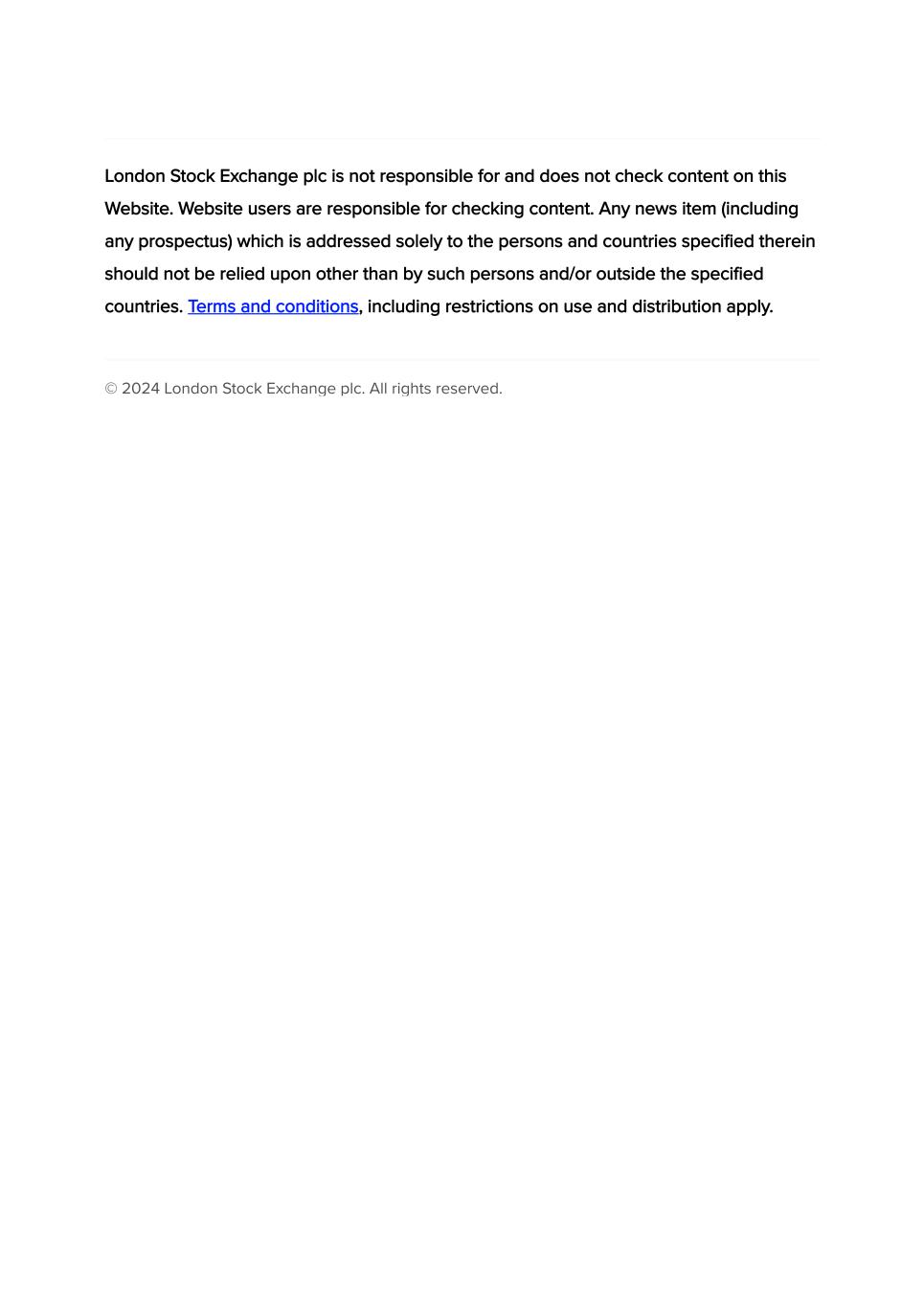 London Stock Exchange plc is not responsible for and does not check content on this Website. Website users are responsible for checking content. Any news item (including any prospectus) which is addressed solely to the persons and countries specified therein should not be relied upon other than by such persons and/or outside the specified countries. Terms and conditions, including restrictions on use and distribution apply. © 2024 London Stock Exchange plc. All rights reserved.