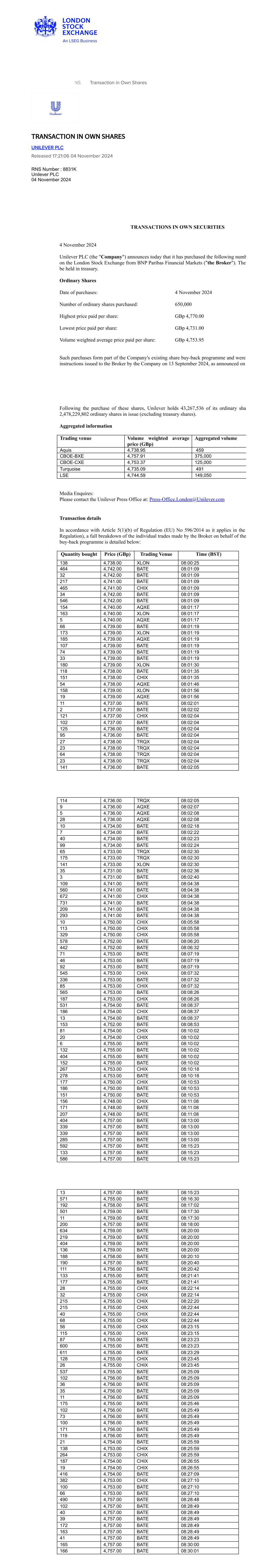 RNS Transaction in Own Shares TRANSACTION IN OWN SHARES UNILEVER PLC Released 17:21:06 04 November 2024 RNS Number : 8831K Unilever PLC 04 November 2024 TRANSACTIONS IN OWN SECURITIES 4 November 2024 Unilever PLC (the "Company") announces today that it has purchased the following numb on the London Stock Exchange from BNP Paribas Financial Markets ("the Broker"). The be held in treasury. Ordinary Shares Date of purchases: 4 November 2024 Number of ordinary shares purchased: 650,000 Highest price paid per share: GBp 4,770.00 Lowest price paid per share: GBp 4,731.00 Volume weighted average price paid per share: GBp 4,753.95 Such purchases form part of the Company's existing share buy-back programme and were instructions issued to the Broker by the Company on 13 September 2024, as announced on Following the purchase of these shares, Unilever holds 43,267,536 of its ordinary shar 2,478,229,802 ordinary shares in issue (excluding treasury shares). Aggregated information Trading venue Volume weighted average price (GBp) Aggregated volume Aquis 4,738.95 459 CBOE-BXE 4,757.91 375,000 CBOE-CXE 4,753.37 125,000 Turquoise 4,735.09 491 LSE 4,744.59 149,050 Media Enquires: Please contact the Unilever Press Office at: Press-Office.London@Unilever.com Transaction details In accordance with Article 5(1)(b) of Regulation (EU) No 596/2014 as it applies in the Regulation), a full breakdown of the individual trades made by the Broker on behalf of the buy-back programme is detailed below: Quantity bought Price (GBp) Trading Venue Time (BST) 138 4,738.00 XLON 08:00:25 464 4,742.00 BATE 08:01:09 32 4,742.00 BATE 08:01:09 217 4,741.00 BATE 08:01:09 465 4,741.00 CHIX 08:01:09 34 4,742.00 BATE 08:01:09 546 4,742.00 BATE 08:01:09 154 4,740.00 AQXE 08:01:17 163 4,740.00 XLON 08:01:17 5 4,740.00 AQXE 08:01:17 66 4,739.00 BATE 08:01:19 173 4,739.00 XLON 08:01:19 185 4,739.00 AQXE 08:01:19 107 4,739.00 BATE 08:01:19 74 4,739.00 BATE 08:01:19 33 4,739.00 BATE 08:01:19 180 4,739.00 XLON 08:01:30 118 4,738.00 BATE 08:01:35 151 4,738.00 CHIX 08:01:35 54 4,738.00 AQXE 08:01:46 158 4,739.00 XLON 08:01:56 19 4,739.00 AQXE 08:01:56 11 4,737.00 BATE 08:02:01 2 4,737.00 BATE 08:02:02 121 4,737.00 CHIX 08:02:04 102 4,737.00 BATE 08:02:04 125 4,736.00 BATE 08:02:04 95 4,736.00 BATE 08:02:04 27 4,738.00 TRQX 08:02:04 23 4,738.00 TRQX 08:02:04 64 4,738.00 TRQX 08:02:04 23 4,738.00 TRQX 08:02:04 141 4,736.00 BATE 08:02:05 114 4,736.00 TRQX 08:02:05 9 4,736.00 AQXE 08:02:07 5 4,736.00 AQXE 08:02:08 28 4,736.00 AQXE 08:02:08 10 4,734.00 BATE 08:02:18 7 4,734.00 BATE 08:02:22 40 4,734.00 BATE 08:02:23 99 4,734.00 BATE 08:02:24 65 4,733.00 TRQX 08:02:30 175 4,733.00 TRQX 08:02:30 141 4,733.00 XLON 08:02:30 35 4,731.00 BATE 08:02:36 3 4,731.00 BATE 08:02:40 109 4,741.00 BATE 08:04:38 560 4,741.00 BATE 08:04:38 672 4,741.00 CHIX 08:04:38 731 4,741.00 BATE 08:04:38 209 4,741.00 BATE 08:04:38 293 4,741.00 BATE 08:04:38 10 4,750.00 CHIX 08:05:58 113 4,750.00 CHIX 08:05:58 329 4,750.00 CHIX 08:05:58 578 4,752.00 BATE 08:06:20 442 4,752.00 BATE 08:06:32 71 4,753.00 BATE 08:07:19 46 4,753.00 BATE 08:07:19 92 4,753.00 BATE 08:07:19 545 4,753.00 CHIX 08:07:32 336 4,753.00 BATE 08:07:32 85 4,753.00 CHIX 08:07:32 565 4,753.00 BATE 08:08:26 187 4,753.00 CHIX 08:08:26 531 4,754.00 BATE 08:08:37 186 4,754.00 CHIX 08:08:37 13 4,754.00 BATE 08:08:37 153 4,752.00 BATE 08:08:53 81 4,754.00 CHIX 08:10:02 20 4,754.00 CHIX 08:10:02 6 4,755.00 BATE 08:10:02 132 4,755.00 BATE 08:10:02 404 4,755.00 BATE 08:10:02 152 4,755.00 BATE 08:10:02 267 4,753.00 CHIX 08:10:18 278 4,753.00 BATE 08:10:18 177 4,750.00 CHIX 08:10:53 186 4,750.00 BATE 08:10:53 151 4,750.00 BATE 08:10:53 156 4,748.00 CHIX 08:11:08 171 4,748.00 BATE 08:11:08 207 4,748.00 BATE 08:11:08 404 4,757.00 BATE 08:13:00 339 4,757.00 BATE 08:13:00 339 4,757.00 BATE 08:13:00 285 4,757.00 BATE 08:13:00 592 4,757.00 BATE 08:15:23 133 4,757.00 BATE 08:15:23 586 4,757.00 BATE 08:15:23 13 4,757.00 BATE 08:15:23 571 4,755.00 BATE 08:16:30 192 4,758.00 BATE 08:17:02 501 4,759.00 BATE 08:17:30 11 4,759.00 BATE 08:17:30 200 4,757.00 BATE 08:18:00 634 4,759.00 BATE 08:20:00 219 4,759.00 BATE 08:20:00 404 4,759.00 BATE 08:20:00 136 4,759.00 BATE 08:20:00 188 4,758.00 BATE 08:20:10 190 4,757.00 BATE 08:20:40 111 4,756.00 BATE 08:20:42 133 4,755.00 BATE 08:21:41 177 4,755.00 BATE 08:21:41 28 4,755.00 CHIX 08:22:14 32 4,755.00 CHIX 08:22:14 215 4,755.00 CHIX 08:22:20 215 4,755.00 CHIX 08:22:44 40 4,755.00 CHIX 08:22:44 68 4,755.00 CHIX 08:22:44 56 4,755.00 CHIX 08:23:15 115 4,755.00 CHIX 08:23:15 87 4,755.00 BATE 08:23:23 600 4,755.00 BATE 08:23:23 611 4,755.00 BATE 08:23:29 128 4,755.00 CHIX 08:23:45 26 4,755.00 CHIX 08:23:45 537 4,755.00 BATE 08:25:09 102 4,756.00 BATE 08:25:09 36 4,756.00 BATE 08:25:09 35 4,756.00 BATE 08:25:09 11 4,756.00 BATE 08:25:09 175 4,755.00 BATE 08:25:46 102 4,756.00 BATE 08:25:49 73 4,756.00 BATE 08:25:49 100 4,756.00 BATE 08:25:49 171 4,756.00 BATE 08:25:49 119 4,756.00 BATE 08:25:49 21 4,754.00 BATE 08:25:59 138 4,753.00 CHIX 08:25:59 264 4,753.00 CHIX 08:25:59 187 4,754.00 CHIX 08:26:55 19 4,754.00 CHIX 08:26:55 416 4,754.00 BATE 08:27:09 382 4,753.00 CHIX 08:27:10 100 4,753.00 BATE 08:27:10 66 4,753.00 BATE 08:27:10 490 4,757.00 BATE 08:28:48 102 4,757.00 BATE 08:28:49 40 4,757.00 BATE 08:28:49 39 4,757.00 BATE 08:28:49 172 4,757.00 BATE 08:28:49 163 4,757.00 BATE 08:28:49 41 4,757.00 BATE 08:28:49 165 4,757.00 BATE 08:30:00 166 4,757.00 BATE 08:30:01