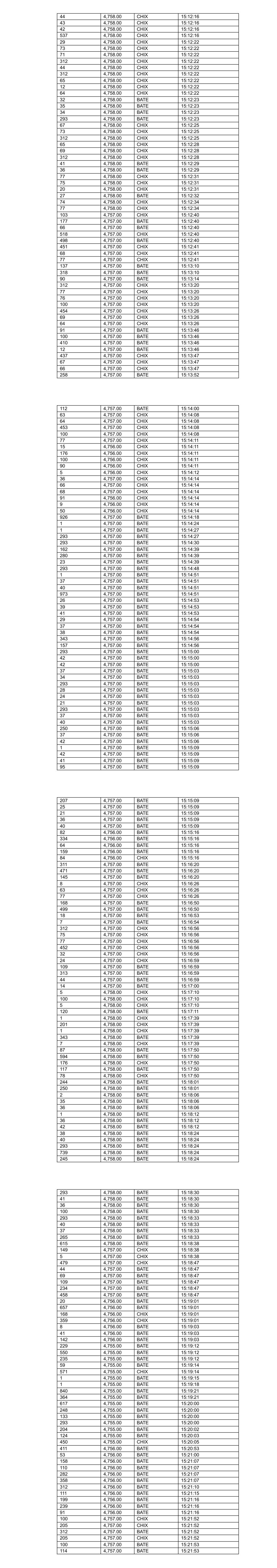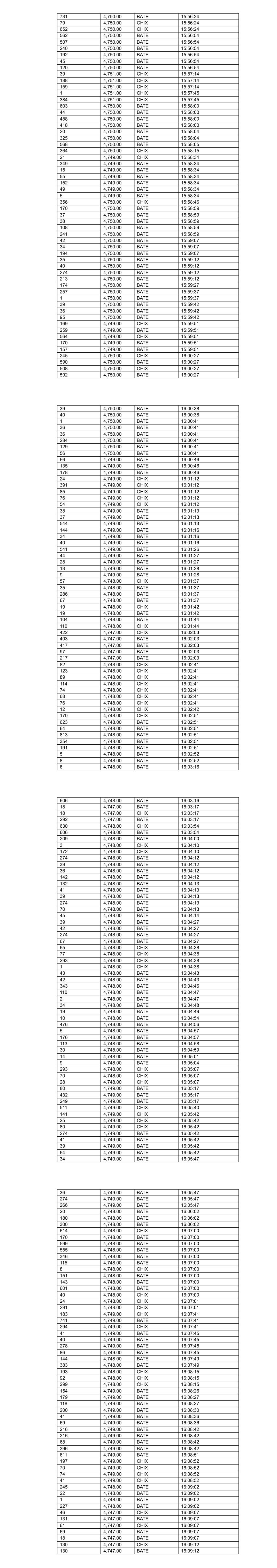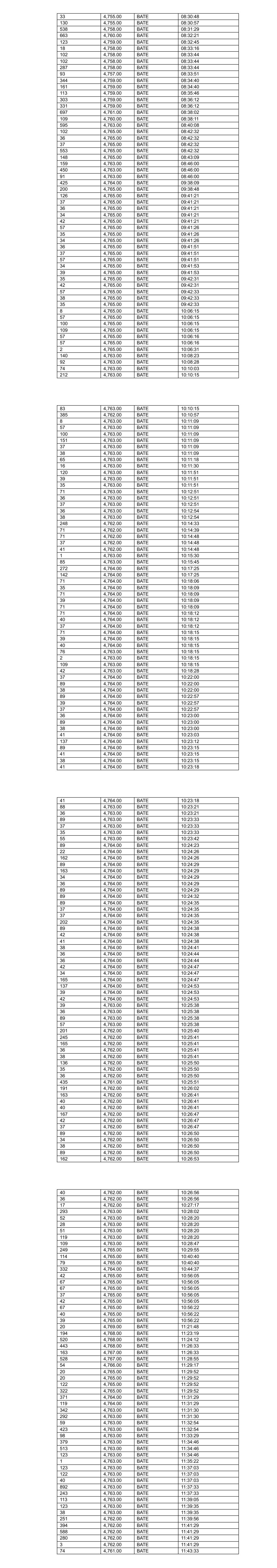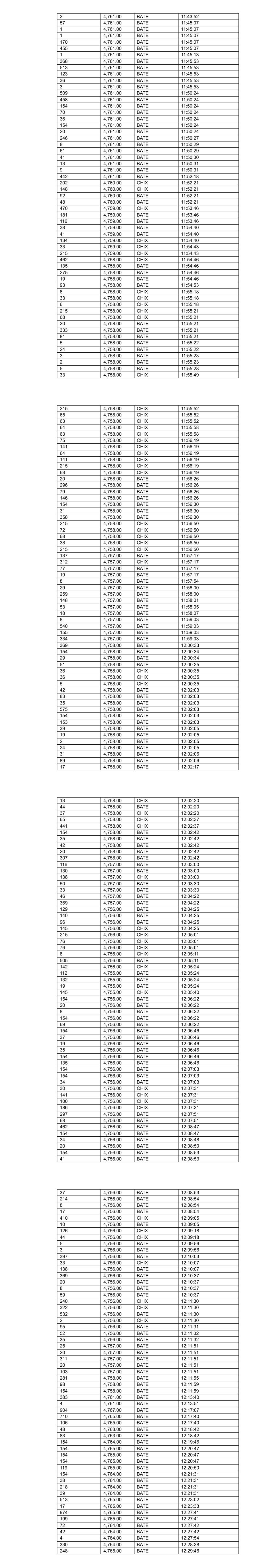 33 4,755.00 BATE 08:30:48 130 4,755.00 BATE 08:30:57 538 4,758.00 BATE 08:31:29 663 4,760.00 BATE 08:32:21 123 4,759.00 BATE 08:32:45 18 4,758.00 BATE 08:33:16 102 4,758.00 BATE 08:33:44 102 4,758.00 BATE 08:33:44 287 4,758.00 BATE 08:33:44 93 4,757.00 BATE 08:33:51 344 4,759.00 BATE 08:34:40 161 4,759.00 BATE 08:34:40 113 4,759.00 BATE 08:35:46 303 4,759.00 BATE 08:36:12 331 4,759.00 BATE 08:36:12 697 4,761.00 BATE 08:38:02 109 4,760.00 BATE 08:38:11 595 4,763.00 BATE 08:40:08 102 4,765.00 BATE 08:42:32 36 4,765.00 BATE 08:42:32 37 4,765.00 BATE 08:42:32 553 4,765.00 BATE 08:42:32 148 4,765.00 BATE 08:43:09 159 4,763.00 BATE 08:46:00 450 4,763.00 BATE 08:46:00 91 4,763.00 BATE 08:46:00 425 4,764.00 BATE 09:38:09 200 4,765.00 BATE 09:38:48 126 4,765.00 BATE 09:41:21 37 4,765.00 BATE 09:41:21 36 4,765.00 BATE 09:41:21 34 4,765.00 BATE 09:41:21 42 4,765.00 BATE 09:41:21 57 4,765.00 BATE 09:41:26 35 4,765.00 BATE 09:41:26 34 4,765.00 BATE 09:41:26 36 4,765.00 BATE 09:41:51 37 4,765.00 BATE 09:41:51 57 4,765.00 BATE 09:41:51 34 4,765.00 BATE 09:41:53 39 4,765.00 BATE 09:41:53 35 4,765.00 BATE 09:42:31 42 4,765.00 BATE 09:42:31 57 4,765.00 BATE 09:42:33 38 4,765.00 BATE 09:42:33 35 4,765.00 BATE 09:42:33 8 4,765.00 BATE 10:06:15 57 4,765.00 BATE 10:06:15 100 4,765.00 BATE 10:06:15 109 4,765.00 BATE 10:06:15 57 4,765.00 BATE 10:06:16 57 4,765.00 BATE 10:06:16 2 4,765.00 BATE 10:06:31 140 4,763.00 BATE 10:08:23 92 4,763.00 BATE 10:08:28 74 4,763.00 BATE 10:10:03 212 4,763.00 BATE 10:10:15 83 4,763.00 BATE 10:10:15 385 4,762.00 BATE 10:10:57 8 4,763.00 BATE 10:11:09 57 4,763.00 BATE 10:11:09 100 4,763.00 BATE 10:11:09 151 4,763.00 BATE 10:11:09 37 4,763.00 BATE 10:11:09 38 4,763.00 BATE 10:11:09 65 4,763.00 BATE 10:11:18 16 4,763.00 BATE 10:11:30 120 4,763.00 BATE 10:11:51 39 4,763.00 BATE 10:11:51 35 4,763.00 BATE 10:11:51 71 4,763.00 BATE 10:12:51 36 4,763.00 BATE 10:12:51 37 4,763.00 BATE 10:12:51 36 4,763.00 BATE 10:12:54 38 4,763.00 BATE 10:12:54 248 4,762.00 BATE 10:14:33 71 4,762.00 BATE 10:14:39 71 4,762.00 BATE 10:14:48 37 4,762.00 BATE 10:14:48 41 4,762.00 BATE 10:14:48 1 4,763.00 BATE 10:15:30 85 4,763.00 BATE 10:15:45 272 4,764.00 BATE 10:17:25 142 4,764.00 BATE 10:17:25 71 4,764.00 BATE 10:18:06 35 4,764.00 BATE 10:18:09 71 4,764.00 BATE 10:18:09 39 4,764.00 BATE 10:18:09 71 4,764.00 BATE 10:18:09 71 4,764.00 BATE 10:18:12 40 4,764.00 BATE 10:18:12 37 4,764.00 BATE 10:18:12 71 4,764.00 BATE 10:18:15 39 4,764.00 BATE 10:18:15 40 4,764.00 BATE 10:18:15 76 4,763.00 BATE 10:18:15 2 4,763.00 BATE 10:18:15 109 4,763.00 BATE 10:18:15 42 4,763.00 BATE 10:18:28 37 4,764.00 BATE 10:22:00 89 4,764.00 BATE 10:22:00 38 4,764.00 BATE 10:22:00 89 4,764.00 BATE 10:22:57 39 4,764.00 BATE 10:22:57 37 4,764.00 BATE 10:22:57 36 4,764.00 BATE 10:23:00 89 4,764.00 BATE 10:23:00 38 4,764.00 BATE 10:23:00 41 4,764.00 BATE 10:23:03 137 4,764.00 BATE 10:23:12 89 4,764.00 BATE 10:23:15 41 4,764.00 BATE 10:23:15 38 4,764.00 BATE 10:23:15 41 4,764.00 BATE 10:23:18 41 4,764.00 BATE 10:23:18 88 4,763.00 BATE 10:23:21 36 4,763.00 BATE 10:23:21 89 4,763.00 BATE 10:23:33 37 4,763.00 BATE 10:23:33 35 4,763.00 BATE 10:23:33 55 4,763.00 BATE 10:23:42 89 4,764.00 BATE 10:24:23 22 4,764.00 BATE 10:24:26 162 4,764.00 BATE 10:24:26 89 4,764.00 BATE 10:24:29 163 4,764.00 BATE 10:24:29 34 4,764.00 BATE 10:24:29 36 4,764.00 BATE 10:24:29 89 4,764.00 BATE 10:24:29 89 4,764.00 BATE 10:24:32 89 4,764.00 BATE 10:24:35 37 4,764.00 BATE 10:24:35 37 4,764.00 BATE 10:24:35 202 4,764.00 BATE 10:24:35 89 4,764.00 BATE 10:24:38 42 4,764.00 BATE 10:24:38 41 4,764.00 BATE 10:24:38 38 4,764.00 BATE 10:24:41 36 4,764.00 BATE 10:24:44 36 4,764.00 BATE 10:24:44 42 4,764.00 BATE 10:24:47 34 4,764.00 BATE 10:24:47 165 4,764.00 BATE 10:24:47 137 4,764.00 BATE 10:24:53 39 4,764.00 BATE 10:24:53 42 4,764.00 BATE 10:24:53 39 4,763.00 BATE 10:25:38 36 4,763.00 BATE 10:25:38 89 4,763.00 BATE 10:25:38 57 4,763.00 BATE 10:25:38 201 4,762.00 BATE 10:25:40 245 4,762.00 BATE 10:25:41 165 4,762.00 BATE 10:25:41 36 4,762.00 BATE 10:25:41 38 4,762.00 BATE 10:25:41 136 4,762.00 BATE 10:25:50 35 4,762.00 BATE 10:25:50 36 4,762.00 BATE 10:25:50 435 4,761.00 BATE 10:25:51 191 4,762.00 BATE 10:26:02 163 4,762.00 BATE 10:26:41 40 4,762.00 BATE 10:26:41 40 4,762.00 BATE 10:26:41 167 4,762.00 BATE 10:26:47 42 4,762.00 BATE 10:26:47 37 4,762.00 BATE 10:26:47 89 4,762.00 BATE 10:26:50 34 4,762.00 BATE 10:26:50 38 4,762.00 BATE 10:26:50 89 4,762.00 BATE 10:26:50 162 4,762.00 BATE 10:26:53 40 4,762.00 BATE 10:26:56 36 4,762.00 BATE 10:26:56 17 4,762.00 BATE 10:27:17 293 4,763.00 BATE 10:28:02 52 4,763.00 BATE 10:28:20 28 4,763.00 BATE 10:28:20 51 4,763.00 BATE 10:28:20 119 4,763.00 BATE 10:28:20 109 4,763.00 BATE 10:28:47 249 4,765.00 BATE 10:29:55 114 4,765.00 BATE 10:40:40 79 4,765.00 BATE 10:40:40 332 4,764.00 BATE 10:44:37 42 4,765.00 BATE 10:56:05 67 4,765.00 BATE 10:56:05 67 4,765.00 BATE 10:56:05 37 4,765.00 BATE 10:56:05 42 4,765.00 BATE 10:56:05 67 4,765.00 BATE 10:56:22 40 4,765.00 BATE 10:56:22 39 4,765.00 BATE 10:56:22 20 4,769.00 BATE 11:21:48 194 4,768.00 BATE 11:23:19 520 4,768.00 BATE 11:24:12 443 4,768.00 BATE 11:26:33 163 4,767.00 BATE 11:26:33 528 4,767.00 BATE 11:28:55 54 4,766.00 BATE 11:29:17 20 4,765.00 BATE 11:29:52 20 4,765.00 BATE 11:29:52 122 4,765.00 BATE 11:29:52 322 4,765.00 BATE 11:29:52 371 4,764.00 BATE 11:31:29 119 4,764.00 BATE 11:31:29 342 4,763.00 BATE 11:31:30 292 4,763.00 BATE 11:31:30 59 4,763.00 BATE 11:32:54 423 4,763.00 BATE 11:32:54 98 4,763.00 BATE 11:33:29 379 4,763.00 BATE 11:34:46 513 4,763.00 BATE 11:34:46 123 4,763.00 BATE 11:34:46 1 4,763.00 BATE 11:35:22 123 4,763.00 BATE 11:37:03 122 4,763.00 BATE 11:37:03 40 4,763.00 BATE 11:37:03 892 4,763.00 BATE 11:37:33 243 4,763.00 BATE 11:37:33 113 4,763.00 BATE 11:39:05 123 4,763.00 BATE 11:39:35 38 4,763.00 BATE 11:39:35 251 4,762.00 BATE 11:39:56 394 4,762.00 BATE 11:41:29 588 4,762.00 BATE 11:41:29 280 4,762.00 BATE 11:41:29 3 4,762.00 BATE 11:41:29 74 4,761.00 BATE 11:43:3