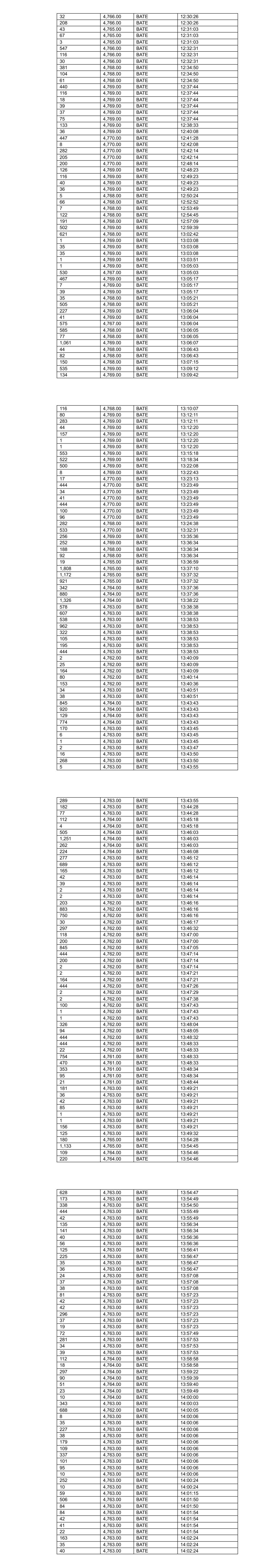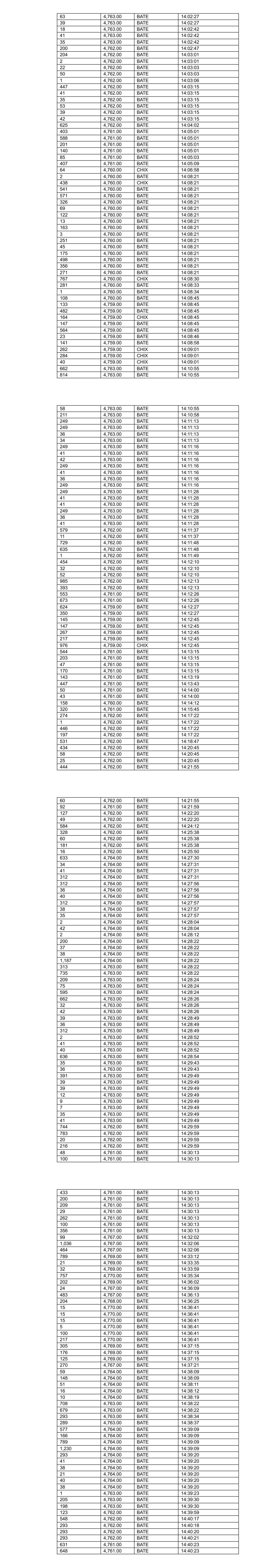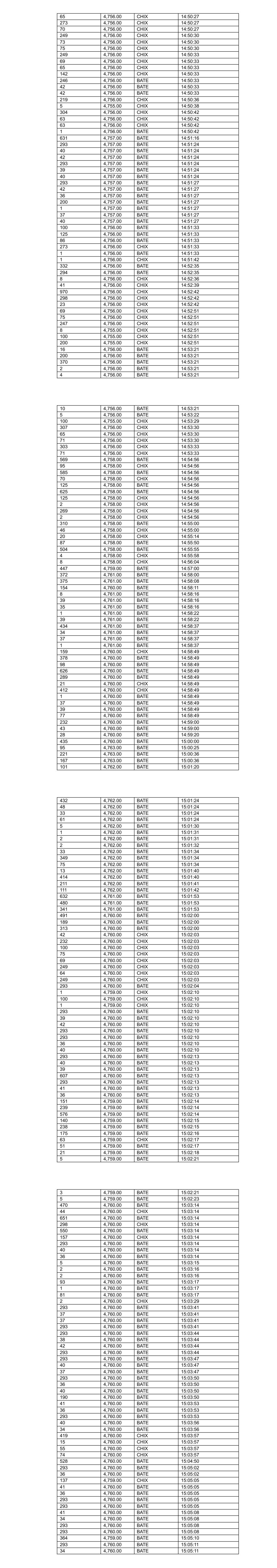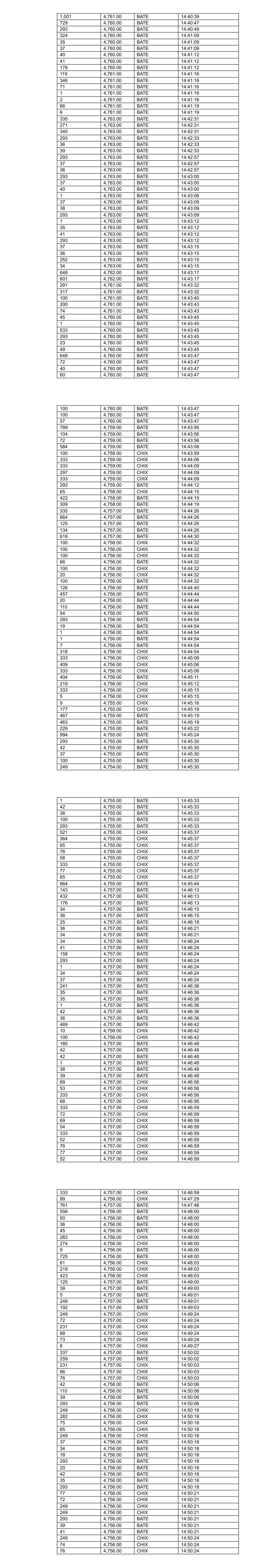 32 4,766.00 BATE 12:30:26 208 4,766.00 BATE 12:30:26 43 4,765.00 BATE 12:31:03 67 4,765.00 BATE 12:31:03 3 4,765.00 BATE 12:31:03 547 4,766.00 BATE 12:32:31 116 4,766.00 BATE 12:32:31 30 4,766.00 BATE 12:32:31 381 4,768.00 BATE 12:34:50 104 4,768.00 BATE 12:34:50 61 4,768.00 BATE 12:34:50 440 4,769.00 BATE 12:37:44 116 4,769.00 BATE 12:37:44 18 4,769.00 BATE 12:37:44 39 4,769.00 BATE 12:37:44 37 4,769.00 BATE 12:37:44 75 4,769.00 BATE 12:37:44 133 4,769.00 BATE 12:38:33 36 4,769.00 BATE 12:40:08 447 4,770.00 BATE 12:41:28 8 4,770.00 BATE 12:42:08 282 4,770.00 BATE 12:42:14 205 4,770.00 BATE 12:42:14 200 4,770.00 BATE 12:48:14 126 4,769.00 BATE 12:48:23 116 4,769.00 BATE 12:49:23 40 4,769.00 BATE 12:49:23 36 4,769.00 BATE 12:49:23 5 4,768.00 BATE 12:50:24 66 4,768.00 BATE 12:52:52 7 4,768.00 BATE 12:53:49 122 4,768.00 BATE 12:54:45 191 4,768.00 BATE 12:57:09 502 4,769.00 BATE 12:59:39 621 4,768.00 BATE 13:02:42 1 4,769.00 BATE 13:03:08 35 4,769.00 BATE 13:03:08 35 4,769.00 BATE 13:03:08 1 4,769.00 BATE 13:03:51 1 4,769.00 BATE 13:05:03 530 4,767.00 BATE 13:05:03 467 4,769.00 BATE 13:05:17 7 4,769.00 BATE 13:05:17 39 4,769.00 BATE 13:05:17 35 4,768.00 BATE 13:05:21 505 4,768.00 BATE 13:05:21 227 4,769.00 BATE 13:06:04 41 4,769.00 BATE 13:06:04 575 4,767.00 BATE 13:06:04 585 4,768.00 BATE 13:06:05 77 4,768.00 BATE 13:06:05 1,061 4,769.00 BATE 13:06:07 44 4,768.00 BATE 13:06:43 82 4,768.00 BATE 13:06:43 150 4,768.00 BATE 13:07:15 535 4,769.00 BATE 13:09:12 134 4,769.00 BATE 13:09:42 116 4,768.00 BATE 13:10:07 80 4,769.00 BATE 13:12:11 283 4,769.00 BATE 13:12:11 44 4,769.00 BATE 13:12:20 157 4,769.00 BATE 13:12:20 1 4,769.00 BATE 13:12:20 1 4,769.00 BATE 13:12:20 553 4,769.00 BATE 13:15:18 522 4,769.00 BATE 13:18:34 500 4,769.00 BATE 13:22:08 8 4,769.00 BATE 13:22:43 17 4,770.00 BATE 13:23:13 444 4,770.00 BATE 13:23:49 34 4,770.00 BATE 13:23:49 41 4,770.00 BATE 13:23:49 444 4,770.00 BATE 13:23:49 100 4,770.00 BATE 13:23:49 96 4,770.00 BATE 13:23:49 282 4,768.00 BATE 13:24:38 533 4,770.00 BATE 13:32:31 256 4,769.00 BATE 13:35:36 252 4,769.00 BATE 13:36:34 188 4,768.00 BATE 13:36:34 92 4,768.00 BATE 13:36:34 19 4,765.00 BATE 13:36:59 1,808 4,765.00 BATE 13:37:10 1,172 4,765.00 BATE 13:37:32 921 4,765.00 BATE 13:37:32 342 4,764.00 BATE 13:37:36 880 4,764.00 BATE 13:37:36 1,326 4,764.00 BATE 13:38:22 578 4,763.00 BATE 13:38:38 607 4,763.00 BATE 13:38:38 538 4,763.00 BATE 13:38:53 962 4,763.00 BATE 13:38:53 322 4,763.00 BATE 13:38:53 105 4,763.00 BATE 13:38:53 195 4,763.00 BATE 13:38:53 444 4,763.00 BATE 13:38:53 2 4,762.00 BATE 13:40:09 25 4,762.00 BATE 13:40:09 164 4,762.00 BATE 13:40:09 80 4,762.00 BATE 13:40:14 153 4,762.00 BATE 13:40:36 34 4,763.00 BATE 13:40:51 38 4,763.00 BATE 13:40:51 845 4,764.00 BATE 13:43:43 920 4,764.00 BATE 13:43:43 129 4,764.00 BATE 13:43:43 774 4,764.00 BATE 13:43:43 170 4,763.00 BATE 13:43:45 6 4,763.00 BATE 13:43:45 1 4,763.00 BATE 13:43:45 2 4,763.00 BATE 13:43:47 16 4,763.00 BATE 13:43:50 268 4,763.00 BATE 13:43:50 5 4,763.00 BATE 13:43:55 289 4,763.00 BATE 13:43:55 182 4,763.00 BATE 13:44:28 77 4,763.00 BATE 13:44:28 112 4,764.00 BATE 13:45:18 4 4,764.00 BATE 13:45:18 505 4,764.00 BATE 13:46:03 1,251 4,764.00 BATE 13:46:03 262 4,764.00 BATE 13:46:03 224 4,764.00 BATE 13:46:08 277 4,763.00 BATE 13:46:12 689 4,763.00 BATE 13:46:12 165 4,763.00 BATE 13:46:12 42 4,763.00 BATE 13:46:14 39 4,763.00 BATE 13:46:14 2 4,763.00 BATE 13:46:14 2 4,763.00 BATE 13:46:14 203 4,762.00 BATE 13:46:16 883 4,762.00 BATE 13:46:16 750 4,762.00 BATE 13:46:16 30 4,762.00 BATE 13:46:17 297 4,762.00 BATE 13:46:32 118 4,762.00 BATE 13:47:00 200 4,762.00 BATE 13:47:00 845 4,762.00 BATE 13:47:05 444 4,762.00 BATE 13:47:14 200 4,762.00 BATE 13:47:14 2 4,762.00 BATE 13:47:14 2 4,762.00 BATE 13:47:21 164 4,762.00 BATE 13:47:21 444 4,762.00 BATE 13:47:26 2 4,762.00 BATE 13:47:29 2 4,762.00 BATE 13:47:38 100 4,762.00 BATE 13:47:43 1 4,762.00 BATE 13:47:43 1 4,762.00 BATE 13:47:43 326 4,762.00 BATE 13:48:04 94 4,762.00 BATE 13:48:05 444 4,762.00 BATE 13:48:32 444 4,762.00 BATE 13:48:33 22 4,762.00 BATE 13:48:33 754 4,761.00 BATE 13:48:33 470 4,761.00 BATE 13:48:33 353 4,761.00 BATE 13:48:34 95 4,761.00 BATE 13:48:34 21 4,761.00 BATE 13:48:44 181 4,763.00 BATE 13:49:21 36 4,763.00 BATE 13:49:21 42 4,763.00 BATE 13:49:21 85 4,763.00 BATE 13:49:21 1 4,763.00 BATE 13:49:21 1 4,763.00 BATE 13:49:21 156 4,763.00 BATE 13:49:21 125 4,763.00 BATE 13:49:32 180 4,765.00 BATE 13:54:28 1,133 4,765.00 BATE 13:54:45 109 4,764.00 BATE 13:54:46 220 4,764.00 BATE 13:54:46 628 4,763.00 BATE 13:54:47 173 4,763.00 BATE 13:54:49 338 4,763.00 BATE 13:54:50 444 4,763.00 BATE 13:55:49 42 4,763.00 BATE 13:55:49 135 4,763.00 BATE 13:56:34 141 4,763.00 BATE 13:56:34 40 4,763.00 BATE 13:56:36 56 4,763.00 BATE 13:56:36 125 4,763.00 BATE 13:56:41 225 4,763.00 BATE 13:56:47 35 4,763.00 BATE 13:56:47 36 4,763.00 BATE 13:56:47 24 4,763.00 BATE 13:57:08 37 4,763.00 BATE 13:57:08 38 4,763.00 BATE 13:57:08 81 4,763.00 BATE 13:57:23 42 4,763.00 BATE 13:57:23 42 4,763.00 BATE 13:57:23 296 4,763.00 BATE 13:57:23 37 4,763.00 BATE 13:57:23 19 4,763.00 BATE 13:57:23 72 4,763.00 BATE 13:57:49 281 4,763.00 BATE 13:57:53 34 4,763.00 BATE 13:57:53 39 4,763.00 BATE 13:57:53 112 4,764.00 BATE 13:58:58 18 4,764.00 BATE 13:58:58 297 4,764.00 BATE 13:59:22 90 4,764.00 BATE 13:59:39 51 4,764.00 BATE 13:59:40 23 4,764.00 BATE 13:59:49 10 4,764.00 BATE 14:00:00 343 4,763.00 BATE 14:00:03 688 4,762.00 BATE 14:00:05 8 4,763.00 BATE 14:00:06 35 4,763.00 BATE 14:00:06 227 4,763.00 BATE 14:00:06 38 4,763.00 BATE 14:00:06 179 4,763.00 BATE 14:00:06 109 4,763.00 BATE 14:00:06 337 4,763.00 BATE 14:00:06 101 4,763.00 BATE 14:00:06 95 4,763.00 BATE 14:00:06 10 4,763.00 BATE 14:00:06 252 4,763.00 BATE 14:00:24 10 4,763.00 BATE 14:00:24 59 4,763.00 BATE 14:01:15 506 4,763.00 BATE 14:01:50 84 4,763.00 BATE 14:01:50 84 4,763.00 BATE 14:01:54 42 4,763.00 BATE 14:01:54 41 4,763.00 BATE 14:01:54 22 4,763.00 BATE 14:01:54 163 4,763.00 BATE 14:02:24 35 4,763.00 BATE 14