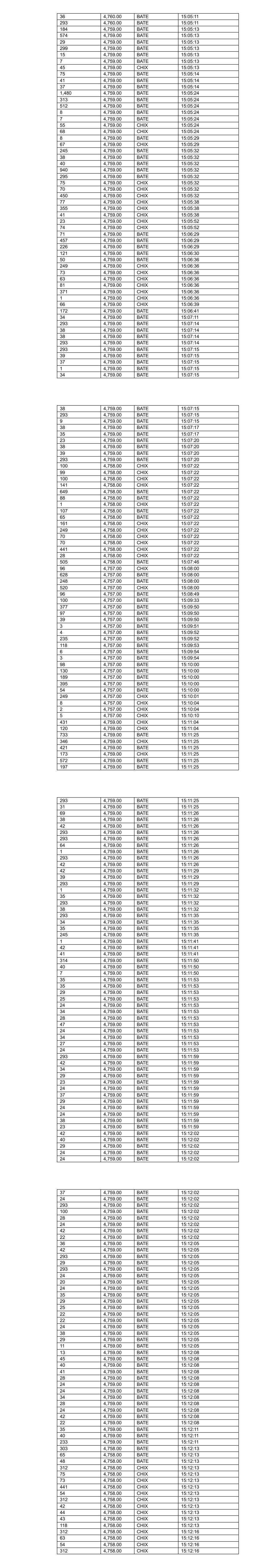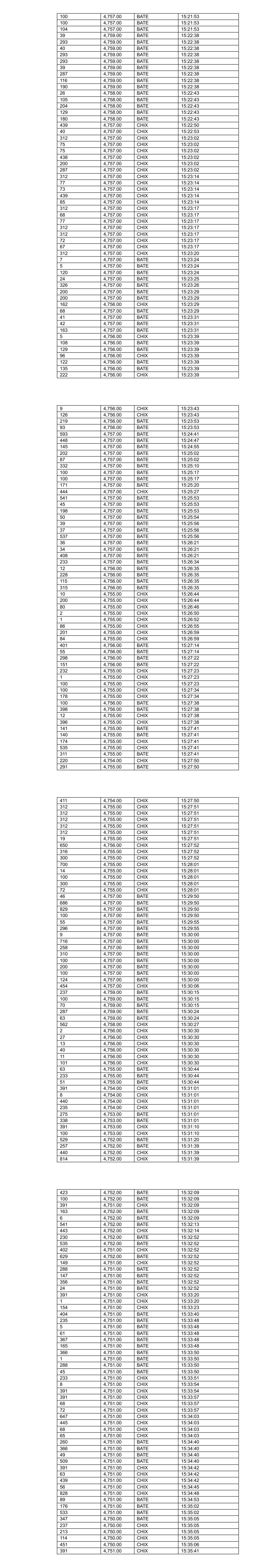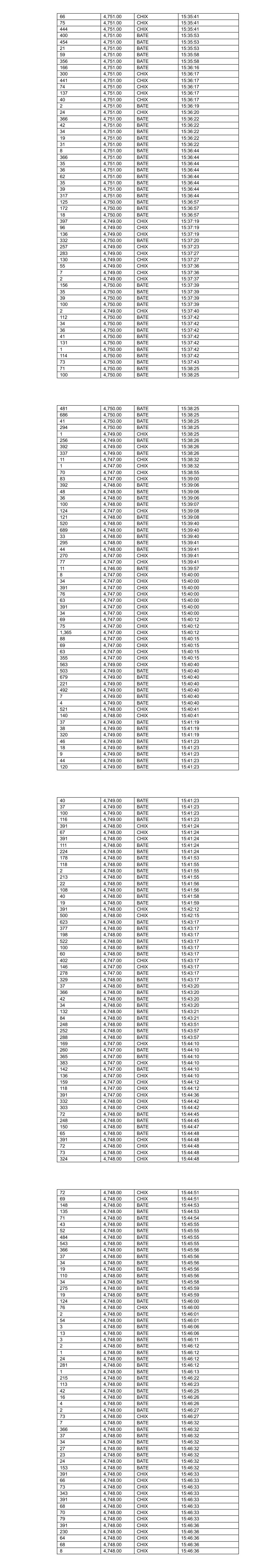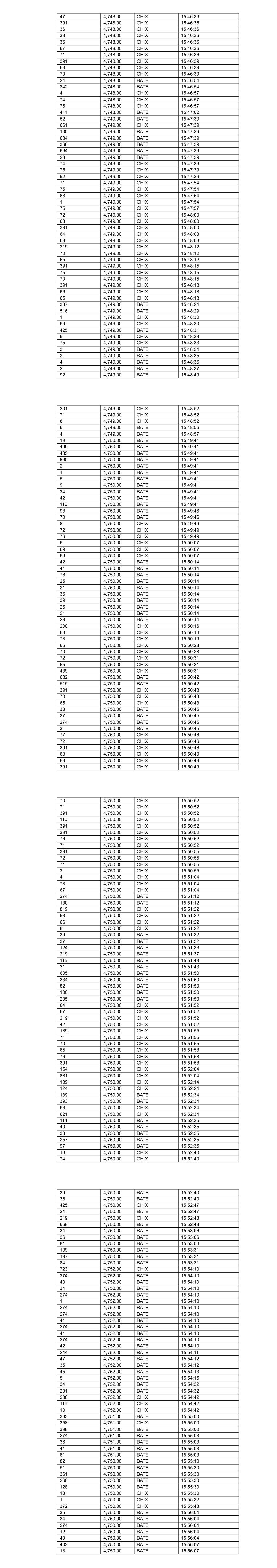 32 4,766.00 BATE 12:30:26 208 4,766.00 BATE 12:30:26 43 4,765.00 BATE 12:31:03 67 4,765.00 BATE 12:31:03 3 4,765.00 BATE 12:31:03 547 4,766.00 BATE 12:32:31 116 4,766.00 BATE 12:32:31 30 4,766.00 BATE 12:32:31 381 4,768.00 BATE 12:34:50 104 4,768.00 BATE 12:34:50 61 4,768.00 BATE 12:34:50 440 4,769.00 BATE 12:37:44 116 4,769.00 BATE 12:37:44 18 4,769.00 BATE 12:37:44 39 4,769.00 BATE 12:37:44 37 4,769.00 BATE 12:37:44 75 4,769.00 BATE 12:37:44 133 4,769.00 BATE 12:38:33 36 4,769.00 BATE 12:40:08 447 4,770.00 BATE 12:41:28 8 4,770.00 BATE 12:42:08 282 4,770.00 BATE 12:42:14 205 4,770.00 BATE 12:42:14 200 4,770.00 BATE 12:48:14 126 4,769.00 BATE 12:48:23 116 4,769.00 BATE 12:49:23 40 4,769.00 BATE 12:49:23 36 4,769.00 BATE 12:49:23 5 4,768.00 BATE 12:50:24 66 4,768.00 BATE 12:52:52 7 4,768.00 BATE 12:53:49 122 4,768.00 BATE 12:54:45 191 4,768.00 BATE 12:57:09 502 4,769.00 BATE 12:59:39 621 4,768.00 BATE 13:02:42 1 4,769.00 BATE 13:03:08 35 4,769.00 BATE 13:03:08 35 4,769.00 BATE 13:03:08 1 4,769.00 BATE 13:03:51 1 4,769.00 BATE 13:05:03 530 4,767.00 BATE 13:05:03 467 4,769.00 BATE 13:05:17 7 4,769.00 BATE 13:05:17 39 4,769.00 BATE 13:05:17 35 4,768.00 BATE 13:05:21 505 4,768.00 BATE 13:05:21 227 4,769.00 BATE 13:06:04 41 4,769.00 BATE 13:06:04 575 4,767.00 BATE 13:06:04 585 4,768.00 BATE 13:06:05 77 4,768.00 BATE 13:06:05 1,061 4,769.00 BATE 13:06:07 44 4,768.00 BATE 13:06:43 82 4,768.00 BATE 13:06:43 150 4,768.00 BATE 13:07:15 535 4,769.00 BATE 13:09:12 134 4,769.00 BATE 13:09:42 116 4,768.00 BATE 13:10:07 80 4,769.00 BATE 13:12:11 283 4,769.00 BATE 13:12:11 44 4,769.00 BATE 13:12:20 157 4,769.00 BATE 13:12:20 1 4,769.00 BATE 13:12:20 1 4,769.00 BATE 13:12:20 553 4,769.00 BATE 13:15:18 522 4,769.00 BATE 13:18:34 500 4,769.00 BATE 13:22:08 8 4,769.00 BATE 13:22:43 17 4,770.00 BATE 13:23:13 444 4,770.00 BATE 13:23:49 34 4,770.00 BATE 13:23:49 41 4,770.00 BATE 13:23:49 444 4,770.00 BATE 13:23:49 100 4,770.00 BATE 13:23:49 96 4,770.00 BATE 13:23:49 282 4,768.00 BATE 13:24:38 533 4,770.00 BATE 13:32:31 256 4,769.00 BATE 13:35:36 252 4,769.00 BATE 13:36:34 188 4,768.00 BATE 13:36:34 92 4,768.00 BATE 13:36:34 19 4,765.00 BATE 13:36:59 1,808 4,765.00 BATE 13:37:10 1,172 4,765.00 BATE 13:37:32 921 4,765.00 BATE 13:37:32 342 4,764.00 BATE 13:37:36 880 4,764.00 BATE 13:37:36 1,326 4,764.00 BATE 13:38:22 578 4,763.00 BATE 13:38:38 607 4,763.00 BATE 13:38:38 538 4,763.00 BATE 13:38:53 962 4,763.00 BATE 13:38:53 322 4,763.00 BATE 13:38:53 105 4,763.00 BATE 13:38:53 195 4,763.00 BATE 13:38:53 444 4,763.00 BATE 13:38:53 2 4,762.00 BATE 13:40:09 25 4,762.00 BATE 13:40:09 164 4,762.00 BATE 13:40:09 80 4,762.00 BATE 13:40:14 153 4,762.00 BATE 13:40:36 34 4,763.00 BATE 13:40:51 38 4,763.00 BATE 13:40:51 845 4,764.00 BATE 13:43:43 920 4,764.00 BATE 13:43:43 129 4,764.00 BATE 13:43:43 774 4,764.00 BATE 13:43:43 170 4,763.00 BATE 13:43:45 6 4,763.00 BATE 13:43:45 1 4,763.00 BATE 13:43:45 2 4,763.00 BATE 13:43:47 16 4,763.00 BATE 13:43:50 268 4,763.00 BATE 13:43:50 5 4,763.00 BATE 13:43:55 289 4,763.00 BATE 13:43:55 182 4,763.00 BATE 13:44:28 77 4,763.00 BATE 13:44:28 112 4,764.00 BATE 13:45:18 4 4,764.00 BATE 13:45:18 505 4,764.00 BATE 13:46:03 1,251 4,764.00 BATE 13:46:03 262 4,764.00 BATE 13:46:03 224 4,764.00 BATE 13:46:08 277 4,763.00 BATE 13:46:12 689 4,763.00 BATE 13:46:12 165 4,763.00 BATE 13:46:12 42 4,763.00 BATE 13:46:14 39 4,763.00 BATE 13:46:14 2 4,763.00 BATE 13:46:14 2 4,763.00 BATE 13:46:14 203 4,762.00 BATE 13:46:16 883 4,762.00 BATE 13:46:16 750 4,762.00 BATE 13:46:16 30 4,762.00 BATE 13:46:17 297 4,762.00 BATE 13:46:32 118 4,762.00 BATE 13:47:00 200 4,762.00 BATE 13:47:00 845 4,762.00 BATE 13:47:05 444 4,762.00 BATE 13:47:14 200 4,762.00 BATE 13:47:14 2 4,762.00 BATE 13:47:14 2 4,762.00 BATE 13:47:21 164 4,762.00 BATE 13:47:21 444 4,762.00 BATE 13:47:26 2 4,762.00 BATE 13:47:29 2 4,762.00 BATE 13:47:38 100 4,762.00 BATE 13:47:43 1 4,762.00 BATE 13:47:43 1 4,762.00 BATE 13:47:43 326 4,762.00 BATE 13:48:04 94 4,762.00 BATE 13:48:05 444 4,762.00 BATE 13:48:32 444 4,762.00 BATE 13:48:33 22 4,762.00 BATE 13:48:33 754 4,761.00 BATE 13:48:33 470 4,761.00 BATE 13:48:33 353 4,761.00 BATE 13:48:34 95 4,761.00 BATE 13:48:34 21 4,761.00 BATE 13:48:44 181 4,763.00 BATE 13:49:21 36 4,763.00 BATE 13:49:21 42 4,763.00 BATE 13:49:21 85 4,763.00 BATE 13:49:21 1 4,763.00 BATE 13:49:21 1 4,763.00 BATE 13:49:21 156 4,763.00 BATE 13:49:21 125 4,763.00 BATE 13:49:32 180 4,765.00 BATE 13:54:28 1,133 4,765.00 BATE 13:54:45 109 4,764.00 BATE 13:54:46 220 4,764.00 BATE 13:54:46 628 4,763.00 BATE 13:54:47 173 4,763.00 BATE 13:54:49 338 4,763.00 BATE 13:54:50 444 4,763.00 BATE 13:55:49 42 4,763.00 BATE 13:55:49 135 4,763.00 BATE 13:56:34 141 4,763.00 BATE 13:56:34 40 4,763.00 BATE 13:56:36 56 4,763.00 BATE 13:56:36 125 4,763.00 BATE 13:56:41 225 4,763.00 BATE 13:56:47 35 4,763.00 BATE 13:56:47 36 4,763.00 BATE 13:56:47 24 4,763.00 BATE 13:57:08 37 4,763.00 BATE 13:57:08 38 4,763.00 BATE 13:57:08 81 4,763.00 BATE 13:57:23 42 4,763.00 BATE 13:57:23 42 4,763.00 BATE 13:57:23 296 4,763.00 BATE 13:57:23 37 4,763.00 BATE 13:57:23 19 4,763.00 BATE 13:57:23 72 4,763.00 BATE 13:57:49 281 4,763.00 BATE 13:57:53 34 4,763.00 BATE 13:57:53 39 4,763.00 BATE 13:57:53 112 4,764.00 BATE 13:58:58 18 4,764.00 BATE 13:58:58 297 4,764.00 BATE 13:59:22 90 4,764.00 BATE 13:59:39 51 4,764.00 BATE 13:59:40 23 4,764.00 BATE 13:59:49 10 4,764.00 BATE 14:00:00 343 4,763.00 BATE 14:00:03 688 4,762.00 BATE 14:00:05 8 4,763.00 BATE 14:00:06 35 4,763.00 BATE 14:00:06 227 4,763.00 BATE 14:00:06 38 4,763.00 BATE 14:00:06 179 4,763.00 BATE 14:00:06 109 4,763.00 BATE 14:00:06 337 4,763.00 BATE 14:00:06 101 4,763.00 BATE 14:00:06 95 4,763.00 BATE 14:00:06 10 4,763.00 BATE 14:00:06 252 4,763.00 BATE 14:00:24 10 4,763.00 BATE 14:00:24 59 4,763.00 BATE 14:01:15 506 4,763.00 BATE 14:01:50 84 4,763.00 BATE 14:01:50 84 4,763.00 BATE 14:01:54 42 4,763.00 BATE 14:01:54 41 4,763.00 BATE 14:01:54 22 4,763.00 BATE 14:01:54 163 4,763.00 BATE 14:02:24 35 4,763.00 BATE 14