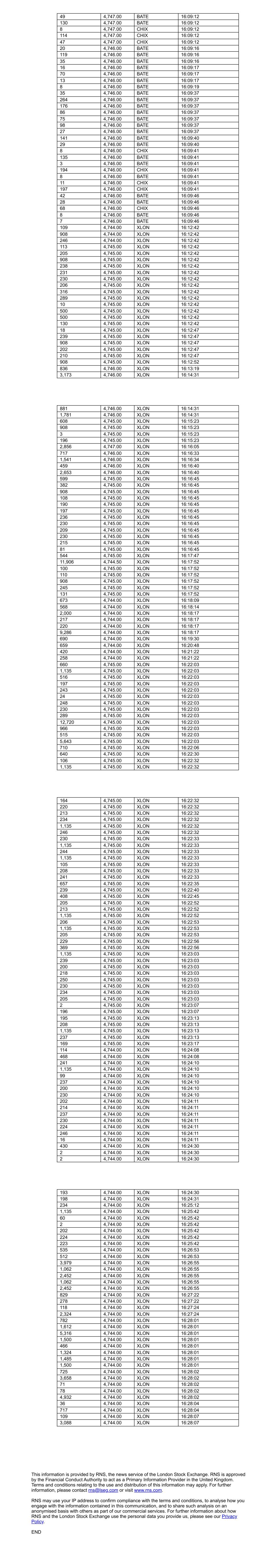 49 4,747.00 BATE 16:09:12 130 4,747.00 BATE 16:09:12 8 4,747.00 CHIX 16:09:12 114 4,747.00 CHIX 16:09:12 47 4,747.00 CHIX 16:09:12 20 4,746.00 BATE 16:09:16 119 4,746.00 BATE 16:09:16 35 4,746.00 BATE 16:09:16 16 4,746.00 BATE 16:09:17 70 4,746.00 BATE 16:09:17 13 4,746.00 BATE 16:09:17 8 4,746.00 BATE 16:09:19 35 4,746.00 BATE 16:09:37 264 4,746.00 BATE 16:09:37 176 4,746.00 BATE 16:09:37 86 4,746.00 BATE 16:09:37 75 4,746.00 BATE 16:09:37 98 4,746.00 BATE 16:09:37 27 4,746.00 BATE 16:09:37 141 4,746.00 BATE 16:09:40 29 4,746.00 BATE 16:09:40 8 4,746.00 CHIX 16:09:41 135 4,746.00 BATE 16:09:41 3 4,746.00 BATE 16:09:41 194 4,746.00 CHIX 16:09:41 8 4,746.00 BATE 16:09:41 11 4,746.00 CHIX 16:09:41 197 4,746.00 CHIX 16:09:41 42 4,746.00 BATE 16:09:46 28 4,746.00 BATE 16:09:46 68 4,746.00 CHIX 16:09:46 8 4,746.00 BATE 16:09:46 7 4,746.00 BATE 16:09:46 109 4,744.00 XLON 16:12:42 908 4,744.00 XLON 16:12:42 246 4,744.00 XLON 16:12:42 113 4,745.00 XLON 16:12:42 205 4,745.00 XLON 16:12:42 908 4,745.00 XLON 16:12:42 238 4,745.00 XLON 16:12:42 231 4,745.00 XLON 16:12:42 230 4,745.00 XLON 16:12:42 206 4,745.00 XLON 16:12:42 316 4,745.00 XLON 16:12:42 289 4,745.00 XLON 16:12:42 10 4,745.00 XLON 16:12:42 500 4,745.00 XLON 16:12:42 500 4,745.00 XLON 16:12:42 130 4,745.00 XLON 16:12:42 18 4,745.00 XLON 16:12:47 239 4,745.00 XLON 16:12:47 908 4,745.00 XLON 16:12:47 202 4,745.00 XLON 16:12:47 210 4,745.00 XLON 16:12:47 908 4,745.00 XLON 16:12:52 836 4,746.00 XLON 16:13:19 3,173 4,746.00 XLON 16:14:31 881 4,746.00 XLON 16:14:31 1,781 4,746.00 XLON 16:14:31 608 4,745.00 XLON 16:15:23 908 4,745.00 XLON 16:15:23 3 4,745.00 XLON 16:15:23 196 4,745.00 XLON 16:15:23 2,856 4,747.00 XLON 16:16:05 717 4,746.00 XLON 16:16:33 1,541 4,746.00 XLON 16:16:34 459 4,746.00 XLON 16:16:40 2,653 4,746.00 XLON 16:16:40 599 4,745.00 XLON 16:16:45 382 4,745.00 XLON 16:16:45 908 4,745.00 XLON 16:16:45 108 4,745.00 XLON 16:16:45 190 4,745.00 XLON 16:16:45 197 4,745.00 XLON 16:16:45 236 4,745.00 XLON 16:16:45 230 4,745.00 XLON 16:16:45 209 4,745.00 XLON 16:16:45 230 4,745.00 XLON 16:16:45 215 4,745.00 XLON 16:16:45 81 4,745.00 XLON 16:16:45 544 4,745.00 XLON 16:17:47 11,906 4,744.50 XLON 16:17:52 100 4,745.00 XLON 16:17:52 110 4,745.00 XLON 16:17:52 908 4,745.00 XLON 16:17:52 245 4,745.00 XLON 16:17:52 131 4,745.00 XLON 16:17:52 673 4,744.00 XLON 16:18:09 568 4,744.00 XLON 16:18:14 2,000 4,744.00 XLON 16:18:17 217 4,744.00 XLON 16:18:17 220 4,744.00 XLON 16:18:17 9,286 4,744.00 XLON 16:18:17 690 4,744.00 XLON 16:19:30 659 4,744.00 XLON 16:20:48 420 4,744.00 XLON 16:21:22 258 4,744.00 XLON 16:21:22 660 4,745.00 XLON 16:22:03 1,135 4,745.00 XLON 16:22:03 516 4,745.00 XLON 16:22:03 197 4,745.00 XLON 16:22:03 243 4,745.00 XLON 16:22:03 24 4,745.00 XLON 16:22:03 248 4,745.00 XLON 16:22:03 230 4,745.00 XLON 16:22:03 289 4,745.00 XLON 16:22:03 12,720 4,745.00 XLON 16:22:03 966 4,745.00 XLON 16:22:03 515 4,745.00 XLON 16:22:03 5,643 4,745.00 XLON 16:22:03 710 4,745.00 XLON 16:22:06 640 4,745.00 XLON 16:22:30 106 4,745.00 XLON 16:22:32 1,135 4,745.00 XLON 16:22:32 164 4,745.00 XLON 16:22:32 220 4,745.00 XLON 16:22:32 213 4,745.00 XLON 16:22:32 234 4,745.00 XLON 16:22:32 1,135 4,745.00 XLON 16:22:32 246 4,745.00 XLON 16:22:32 230 4,745.00 XLON 16:22:33 1,135 4,745.00 XLON 16:22:33 244 4,745.00 XLON 16:22:33 1,135 4,745.00 XLON 16:22:33 105 4,745.00 XLON 16:22:33 208 4,745.00 XLON 16:22:33 241 4,745.00 XLON 16:22:33 657 4,745.00 XLON 16:22:35 239 4,745.00 XLON 16:22:40 408 4,745.00 XLON 16:22:45 205 4,745.00 XLON 16:22:52 213 4,745.00 XLON 16:22:52 1,135 4,745.00 XLON 16:22:52 206 4,745.00 XLON 16:22:53 1,135 4,745.00 XLON 16:22:53 205 4,745.00 XLON 16:22:53 229 4,745.00 XLON 16:22:56 369 4,745.00 XLON 16:22:56 1,135 4,745.00 XLON 16:23:03 239 4,745.00 XLON 16:23:03 200 4,745.00 XLON 16:23:03 218 4,745.00 XLON 16:23:03 250 4,745.00 XLON 16:23:03 230 4,745.00 XLON 16:23:03 234 4,745.00 XLON 16:23:03 205 4,745.00 XLON 16:23:03 2 4,745.00 XLON 16:23:07 196 4,745.00 XLON 16:23:07 195 4,745.00 XLON 16:23:13 208 4,745.00 XLON 16:23:13 1,135 4,745.00 XLON 16:23:13 237 4,745.00 XLON 16:23:13 169 4,745.00 XLON 16:23:17 114 4,744.00 XLON 16:24:08 468 4,744.00 XLON 16:24:08 241 4,744.00 XLON 16:24:10 1,135 4,744.00 XLON 16:24:10 99 4,744.00 XLON 16:24:10 237 4,744.00 XLON 16:24:10 200 4,744.00 XLON 16:24:10 230 4,744.00 XLON 16:24:10 202 4,744.00 XLON 16:24:11 214 4,744.00 XLON 16:24:11 237 4,744.00 XLON 16:24:11 230 4,744.00 XLON 16:24:11 224 4,744.00 XLON 16:24:11 246 4,744.00 XLON 16:24:11 16 4,744.00 XLON 16:24:11 430 4,744.00 XLON 16:24:30 2 4,744.00 XLON 16:24:30 2 4,744.00 XLON 16:24:30 193 4,744.00 XLON 16:24:30 198 4,744.00 XLON 16:24:31 234 4,744.00 XLON 16:25:12 1,135 4,744.00 XLON 16:25:42 60 4,744.00 XLON 16:25:42 2 4,744.00 XLON 16:25:42 202 4,744.00 XLON 16:25:42 224 4,744.00 XLON 16:25:42 223 4,744.00 XLON 16:25:42 535 4,744.00 XLON 16:26:53 512 4,744.00 XLON 16:26:53 3,979 4,744.00 XLON 16:26:55 1,062 4,744.00 XLON 16:26:55 2,452 4,744.00 XLON 16:26:55 1,062 4,744.00 XLON 16:26:55 2,452 4,744.00 XLON 16:26:55 829 4,744.00 XLON 16:27:22 278 4,744.00 XLON 16:27:22 118 4,744.00 XLON 16:27:24 2,324 4,744.00 XLON 16:27:24 782 4,744.00 XLON 16:28:01 1,612 4,744.00 XLON 16:28:01 5,316 4,744.00 XLON 16:28:01 1,500 4,744.00 XLON 16:28:01 466 4,744.00 XLON 16:28:01 1,324 4,744.00 XLON 16:28:01 1,485 4,744.00 XLON 16:28:01 1,500 4,744.00 XLON 16:28:01 725 4,744.00 XLON 16:28:02 3,658 4,744.00 XLON 16:28:02 71 4,744.00 XLON 16:28:02 78 4,744.00 XLON 16:28:02 4,932 4,744.00 XLON 16:28:02 36 4,744.00 XLON 16:28:04 717 4,744.00 XLON 16:28:04 109 4,744.00 XLON 16:28:07 3,088 4,744.00 XLON 16:28:07 This information is provided by RNS, the news service of the London Stock Exchange. RNS is approved by the Financial Conduct Authority to act as a Primary Information Provider in the United Kingdom. Terms and conditions relating to the use and distribution of this information may apply. For further information, please contact rns@lseg.com or visit www.rns.com