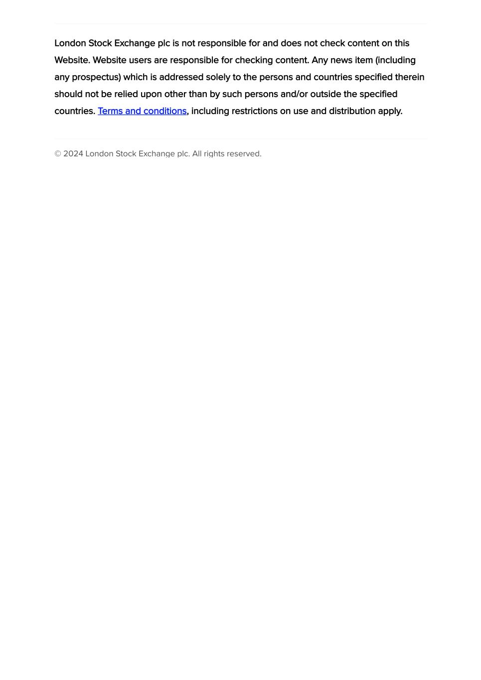 London Stock Exchange plc is not responsible for and does not check content on this Website. Website users are responsible for checking content. Any news item (including any prospectus) which is addressed solely to the persons and countries specified therein should not be relied upon other than by such persons and/or outside the specified countries. Terms and conditions, including restrictions on use and distribution apply. © 2024 London Stock Exchange plc. All rights reserved.