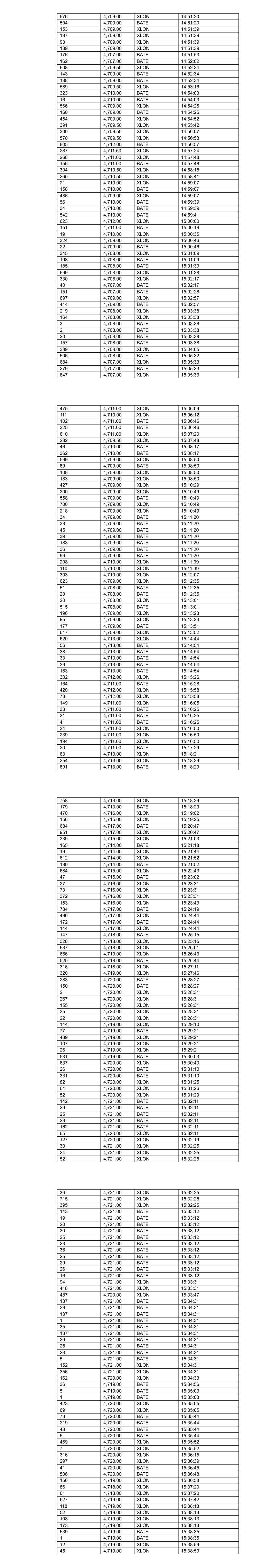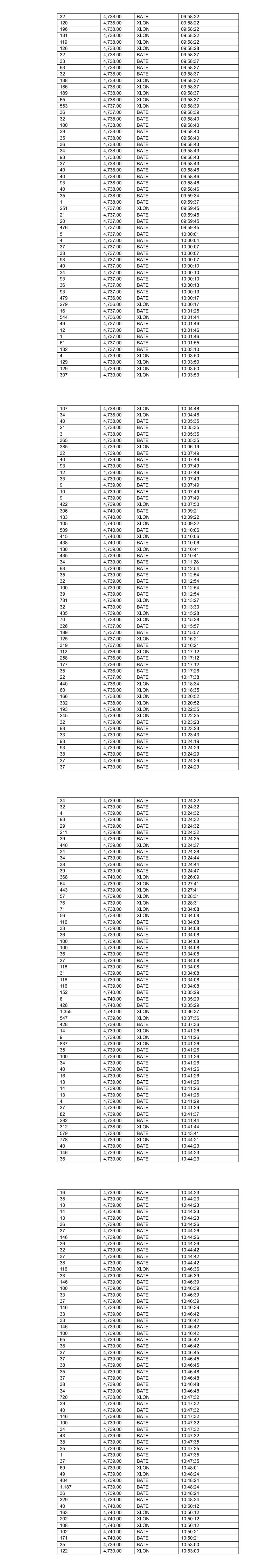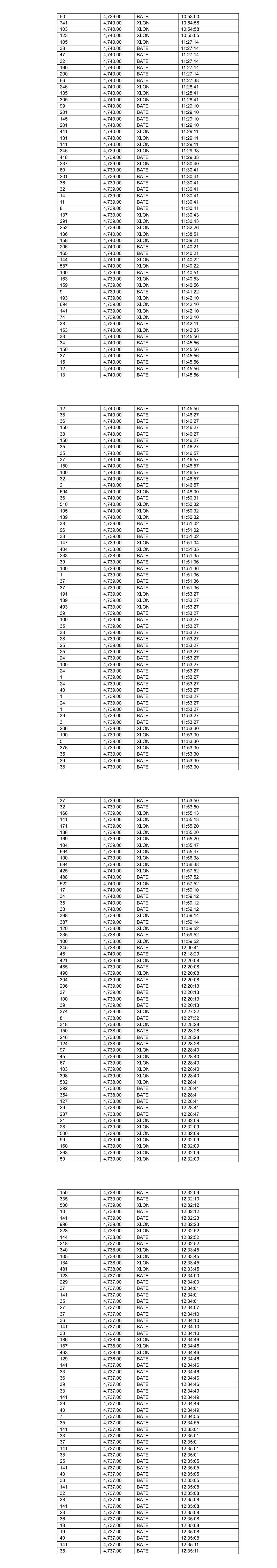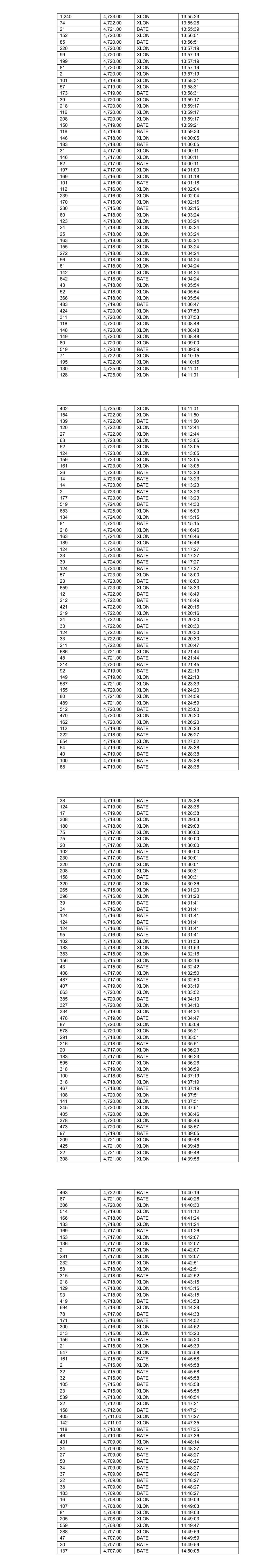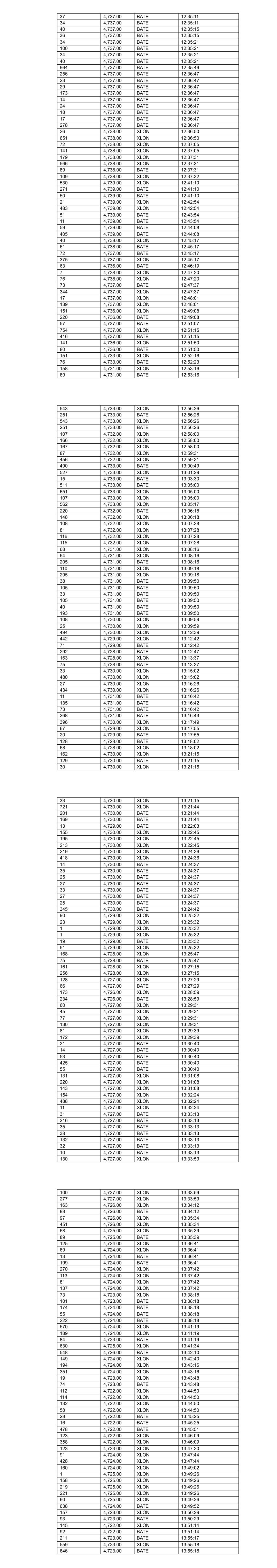 37 4,737.00 BATE 12:35:11 34 4,737.00 BATE 12:35:11 40 4,737.00 BATE 12:35:15 36 4,737.00 BATE 12:35:15 34 4,737.00 BATE 12:35:21 100 4,737.00 BATE 12:35:21 34 4,737.00 BATE 12:35:21 40 4,737.00 BATE 12:35:21 964 4,737.00 BATE 12:35:46 256 4,737.00 BATE 12:36:47 23 4,737.00 BATE 12:36:47 29 4,737.00 BATE 12:36:47 173 4,737.00 BATE 12:36:47 14 4,737.00 BATE 12:36:47 24 4,737.00 BATE 12:36:47 18 4,737.00 BATE 12:36:47 17 4,737.00 BATE 12:36:47 278 4,737.00 BATE 12:36:47 26 4,738.00 XLON 12:36:50 651 4,738.00 XLON 12:36:50 72 4,738.00 XLON 12:37:05 141 4,738.00 XLON 12:37:05 179 4,738.00 XLON 12:37:31 566 4,738.00 XLON 12:37:31 89 4,738.00 BATE 12:37:31 109 4,738.00 XLON 12:37:32 530 4,739.00 XLON 12:41:10 271 4,739.00 BATE 12:41:10 50 4,739.00 BATE 12:41:10 21 4,739.00 XLON 12:42:54 483 4,739.00 XLON 12:42:54 51 4,739.00 BATE 12:43:54 11 4,739.00 BATE 12:43:54 59 4,739.00 BATE 12:44:08 405 4,739.00 BATE 12:44:08 40 4,738.00 XLON 12:45:17 61 4,738.00 BATE 12:45:17 72 4,737.00 BATE 12:45:17 375 4,737.00 XLON 12:45:17 63 4,736.00 BATE 12:46:19 7 4,738.00 XLON 12:47:20 76 4,738.00 XLON 12:47:20 73 4,737.00 BATE 12:47:37 344 4,737.00 XLON 12:47:37 17 4,737.00 XLON 12:48:01 139 4,737.00 XLON 12:48:01 151 4,736.00 XLON 12:49:08 220 4,736.00 BATE 12:49:08 57 4,737.00 BATE 12:51:07 754 4,737.00 XLON 12:51:15 416 4,737.00 BATE 12:51:15 141 4,736.00 XLON 12:51:50 80 4,736.00 BATE 12:51:50 151 4,733.00 XLON 12:52:16 76 4,733.00 BATE 12:52:23 158 4,731.00 XLON 12:53:16 69 4,731.00 BATE 12:53:16 543 4,733.00 XLON 12:56:26 251 4,733.00 BATE 12:56:26 543 4,733.00 XLON 12:56:26 251 4,733.00 BATE 12:56:26 107 4,732.00 XLON 12:58:00 166 4,732.00 XLON 12:58:00 167 4,732.00 XLON 12:58:00 87 4,732.00 XLON 12:59:31 456 4,732.00 XLON 12:59:31 490 4,733.00 BATE 13:00:49 527 4,733.00 XLON 13:01:29 15 4,733.00 BATE 13:03:30 511 4,733.00 BATE 13:05:00 651 4,733.00 XLON 13:05:00 107 4,733.00 XLON 13:05:00 562 4,733.00 XLON 13:05:17 220 4,732.00 BATE 13:06:18 148 4,732.00 XLON 13:06:18 108 4,732.00 XLON 13:07:28 81 4,732.00 XLON 13:07:28 116 4,732.00 XLON 13:07:28 115 4,732.00 XLON 13:07:28 68 4,731.00 XLON 13:08:16 64 4,731.00 XLON 13:08:16 205 4,731.00 BATE 13:08:16 110 4,731.00 XLON 13:09:18 295 4,731.00 XLON 13:09:18 38 4,731.00 BATE 13:09:50 105 4,731.00 BATE 13:09:50 33 4,731.00 BATE 13:09:50 105 4,731.00 BATE 13:09:50 40 4,731.00 BATE 13:09:50 193 4,731.00 BATE 13:09:50 108 4,730.00 XLON 13:09:59 25 4,730.00 XLON 13:09:59 494 4,730.00 XLON 13:12:39 442 4,729.00 XLON 13:12:42 71 4,729.00 BATE 13:12:42 292 4,728.00 BATE 13:12:47 163 4,728.00 XLON 13:13:37 75 4,728.00 BATE 13:13:37 33 4,730.00 XLON 13:15:02 480 4,730.00 XLON 13:15:02 27 4,730.00 XLON 13:16:26 434 4,730.00 XLON 13:16:26 11 4,731.00 BATE 13:16:42 135 4,731.00 BATE 13:16:42 73 4,731.00 BATE 13:16:42 268 4,731.00 BATE 13:16:43 396 4,730.00 XLON 13:17:49 67 4,729.00 XLON 13:17:55 20 4,729.00 BATE 13:17:55 128 4,728.00 BATE 13:18:02 68 4,728.00 XLON 13:18:02 162 4,730.00 XLON 13:21:15 129 4,730.00 BATE 13:21:15 30 4,730.00 XLON 13:21:15 33 4,730.00 XLON 13:21:15 721 4,730.00 XLON 13:21:44 201 4,730.00 BATE 13:21:44 169 4,730.00 BATE 13:21:44 13 4,729.00 BATE 13:22:03 155 4,730.00 XLON 13:22:45 195 4,730.00 XLON 13:22:45 213 4,730.00 XLON 13:22:45 219 4,730.00 XLON 13:24:36 418 4,730.00 XLON 13:24:36 14 4,730.00 BATE 13:24:37 35 4,730.00 BATE 13:24:37 25 4,730.00 BATE 13:24:37 27 4,730.00 BATE 13:24:37 33 4,730.00 BATE 13:24:37 27 4,730.00 BATE 13:24:37 25 4,730.00 BATE 13:24:37 345 4,730.00 BATE 13:24:42 90 4,729.00 XLON 13:25:32 23 4,729.00 XLON 13:25:32 1 4,729.00 XLON 13:25:32 1 4,729.00 XLON 13:25:32 19 4,729.00 BATE 13:25:32 51 4,729.00 XLON 13:25:32 168 4,728.00 XLON 13:25:47 75 4,728.00 BATE 13:25:47 161 4,728.00 XLON 13:27:15 256 4,728.00 XLON 13:27:15 128 4,727.00 XLON 13:27:29 66 4,727.00 BATE 13:27:29 173 4,726.00 XLON 13:28:59 234 4,726.00 BATE 13:28:59 60 4,727.00 XLON 13:29:31 45 4,727.00 XLON 13:29:31 77 4,727.00 XLON 13:29:31 130 4,727.00 XLON 13:29:31 81 4,727.00 XLON 13:29:39 172 4,727.00 XLON 13:29:39 21 4,727.00 BATE 13:30:40 14 4,727.00 BATE 13:30:40 53 4,727.00 BATE 13:30:40 425 4,727.00 BATE 13:30:40 55 4,727.00 BATE 13:30:40 131 4,727.00 XLON 13:31:08 220 4,727.00 XLON 13:31:08 143 4,727.00 XLON 13:31:08 154 4,727.00 XLON 13:32:24 488 4,727.00 XLON 13:32:24 11 4,727.00 XLON 13:32:24 31 4,727.00 BATE 13:33:13 216 4,727.00 BATE 13:33:13 35 4,727.00 BATE 13:33:13 38 4,727.00 BATE 13:33:13 132 4,727.00 BATE 13:33:13 32 4,727.00 BATE 13:33:13 10 4,727.00 BATE 13:33:13 130 4,727.00 XLON 13:33:59 100 4,727.00 XLON 13:33:59 277 4,727.00 XLON 13:33:59 163 4,726.00 XLON 13:34:12 88 4,726.00 BATE 13:34:12 97 4,726.00 XLON 13:35:34 451 4,726.00 XLON 13:35:34 68 4,725.00 XLON 13:35:39 89 4,725.00 BATE 13:35:39 125 4,724.00 XLON 13:36:41 69 4,724.00 XLON 13:36:41 13 4,724.00 BATE 13:36:41 199 4,724.00 BATE 13:36:41 270 4,724.00 XLON 13:37:42 113 4,724.00 XLON 13:37:42 81 4,724.00 XLON 13:37:42 137 4,724.00 XLON 13:37:42 73 4,723.00 XLON 13:38:18 101 4,723.00 BATE 13:38:18 174 4,724.00 BATE 13:38:18 55 4,724.00 BATE 13:38:18 222 4,724.00 BATE 13:38:18 570 4,724.00 XLON 13:41:19 189 4,724.00 XLON 13:41:19 84 4,723.00 BATE 13:41:19 630 4,725.00 XLON 13:41:34 548 4,726.00 BATE 13:42:10 149 4,724.00 XLON 13:42:40 194 4,724.00 XLON 13:43:16 351 4,724.00 XLON 13:43:16 19 4,723.00 XLON 13:43:48 74 4,723.00 BATE 13:43:48 112 4,722.00 XLON 13:44:50 114 4,722.00 XLON 13:44:50 132 4,722.00 XLON 13:44:50 58 4,722.00 XLON 13:44:50 28 4,722.00 BATE 13:45:25 16 4,722.00 BATE 13:45:25 478 4,722.00 BATE 13:45:51 123 4,722.00 XLON 13:46:09 358 4,722.00 XLON 13:46:09 123 4,723.00 XLON 13:47:20 91 4,724.00 XLON 13:47:44 428 4,724.00 XLON 13:47:44 160 4,724.00 XLON 13:49:02 1 4,725.00 XLON 13:49:26 158 4,725.00 XLON 13:49:26 219 4,725.00 XLON 13:49:26 221 4,725.00 XLON 13:49:26 60 4,725.00 XLON 13:49:26 638 4,724.00 BATE 13:49:52 157 4,723.00 XLON 13:50:29 93 4,723.00 BATE 13:50:29 145 4,722.00 XLON 13:51:14 92 4,722.00 BATE 13:51:14 211 4,723.00 BATE 13:55:17 559 4