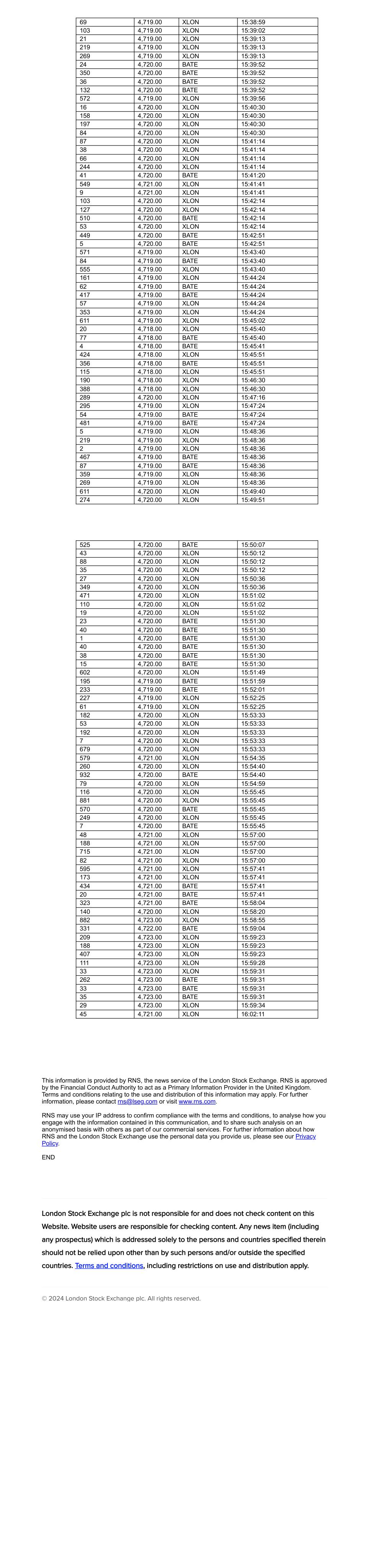 69 4,719.00 XLON 15:38:59 103 4,719.00 XLON 15:39:02 21 4,719.00 XLON 15:39:13 219 4,719.00 XLON 15:39:13 269 4,719.00 XLON 15:39:13 24 4,720.00 BATE 15:39:52 350 4,720.00 BATE 15:39:52 36 4,720.00 BATE 15:39:52 132 4,720.00 BATE 15:39:52 572 4,719.00 XLON 15:39:56 16 4,720.00 XLON 15:40:30 158 4,720.00 XLON 15:40:30 197 4,720.00 XLON 15:40:30 84 4,720.00 XLON 15:40:30 87 4,720.00 XLON 15:41:14 38 4,720.00 XLON 15:41:14 66 4,720.00 XLON 15:41:14 244 4,720.00 XLON 15:41:14 41 4,720.00 BATE 15:41:20 549 4,721.00 XLON 15:41:41 9 4,721.00 XLON 15:41:41 103 4,720.00 XLON 15:42:14 127 4,720.00 XLON 15:42:14 510 4,720.00 BATE 15:42:14 53 4,720.00 XLON 15:42:14 449 4,720.00 BATE 15:42:51 5 4,720.00 BATE 15:42:51 571 4,719.00 XLON 15:43:40 84 4,719.00 BATE 15:43:40 555 4,719.00 XLON 15:43:40 161 4,719.00 XLON 15:44:24 62 4,719.00 BATE 15:44:24 417 4,719.00 BATE 15:44:24 57 4,719.00 XLON 15:44:24 353 4,719.00 XLON 15:44:24 611 4,719.00 XLON 15:45:02 20 4,718.00 XLON 15:45:40 77 4,718.00 BATE 15:45:40 4 4,718.00 BATE 15:45:41 424 4,718.00 XLON 15:45:51 356 4,718.00 BATE 15:45:51 115 4,718.00 XLON 15:45:51 190 4,718.00 XLON 15:46:30 388 4,718.00 XLON 15:46:30 289 4,720.00 XLON 15:47:16 295 4,719.00 XLON 15:47:24 54 4,719.00 BATE 15:47:24 481 4,719.00 BATE 15:47:24 5 4,719.00 XLON 15:48:36 219 4,719.00 XLON 15:48:36 2 4,719.00 XLON 15:48:36 467 4,719.00 BATE 15:48:36 87 4,719.00 BATE 15:48:36 359 4,719.00 XLON 15:48:36 269 4,719.00 XLON 15:48:36 611 4,720.00 XLON 15:49:40 274 4,720.00 XLON 15:49:51 525 4,720.00 BATE 15:50:07 43 4,720.00 XLON 15:50:12 88 4,720.00 XLON 15:50:12 35 4,720.00 XLON 15:50:12 27 4,720.00 XLON 15:50:36 349 4,720.00 XLON 15:50:36 471 4,720.00 XLON 15:51:02 110 4,720.00 XLON 15:51:02 19 4,720.00 XLON 15:51:02 23 4,720.00 BATE 15:51:30 40 4,720.00 BATE 15:51:30 1 4,720.00 BATE 15:51:30 40 4,720.00 BATE 15:51:30 38 4,720.00 BATE 15:51:30 15 4,720.00 BATE 15:51:30 602 4,720.00 XLON 15:51:49 195 4,719.00 BATE 15:51:59 233 4,719.00 BATE 15:52:01 227 4,719.00 XLON 15:52:25 61 4,719.00 XLON 15:52:25 182 4,720.00 XLON 15:53:33 53 4,720.00 XLON 15:53:33 192 4,720.00 XLON 15:53:33 7 4,720.00 XLON 15:53:33 679 4,720.00 XLON 15:53:33 579 4,721.00 XLON 15:54:35 260 4,720.00 XLON 15:54:40 932 4,720.00 BATE 15:54:40 79 4,720.00 XLON 15:54:59 116 4,720.00 XLON 15:55:45 881 4,720.00 XLON 15:55:45 570 4,720.00 BATE 15:55:45 249 4,720.00 XLON 15:55:45 7 4,720.00 BATE 15:55:45 48 4,721.00 XLON 15:57:00 188 4,721.00 XLON 15:57:00 715 4,721.00 XLON 15:57:00 82 4,721.00 XLON 15:57:00 595 4,721.00 XLON 15:57:41 173 4,721.00 XLON 15:57:41 434 4,721.00 BATE 15:57:41 20 4,721.00 BATE 15:57:41 323 4,721.00 BATE 15:58:04 140 4,720.00 XLON 15:58:20 882 4,723.00 XLON 15:58:55 331 4,722.00 BATE 15:59:04 209 4,723.00 XLON 15:59:23 188 4,723.00 XLON 15:59:23 407 4,723.00 XLON 15:59:23 111 4,723.00 XLON 15:59:28 33 4,723.00 XLON 15:59:31 262 4,723.00 BATE 15:59:31 33 4,723.00 BATE 15:59:31 35 4,723.00 BATE 15:59:31 29 4,723.00 XLON 15:59:34 45 4,721.00 XLON 16:02:11 This information is provided by RNS, the news service of the London Stock Exchange. RNS is approved by the Financial Conduct Authority to act as a Primary Information Provider in the United Kingdom. Terms and conditions relating to the use and distribution of this information may apply. For further information, please contact rns@lseg.com or visit www.rns.com. RNS may use your IP address to confirm compliance with the terms and conditions, to analyse how you engage with the information contained in this communication, and to share such analysis on an anonymised basis with others as part of our commercial services. For further information about how RNS and the London Stock Exchange use the personal data you provide us, please see our Privacy Policy. END London Stock Exchange plc is not responsible for and does not check content on this Website. Website users are responsible for checking content. Any news item (including any prospectus) which is addressed solely to the persons and countries specified therein should not be relied upon other than by such persons and/or outside the specified countries. Terms and conditions, including restrictions on use and distribution apply. © 2024 London Stock Exchange plc. All rights reserved.